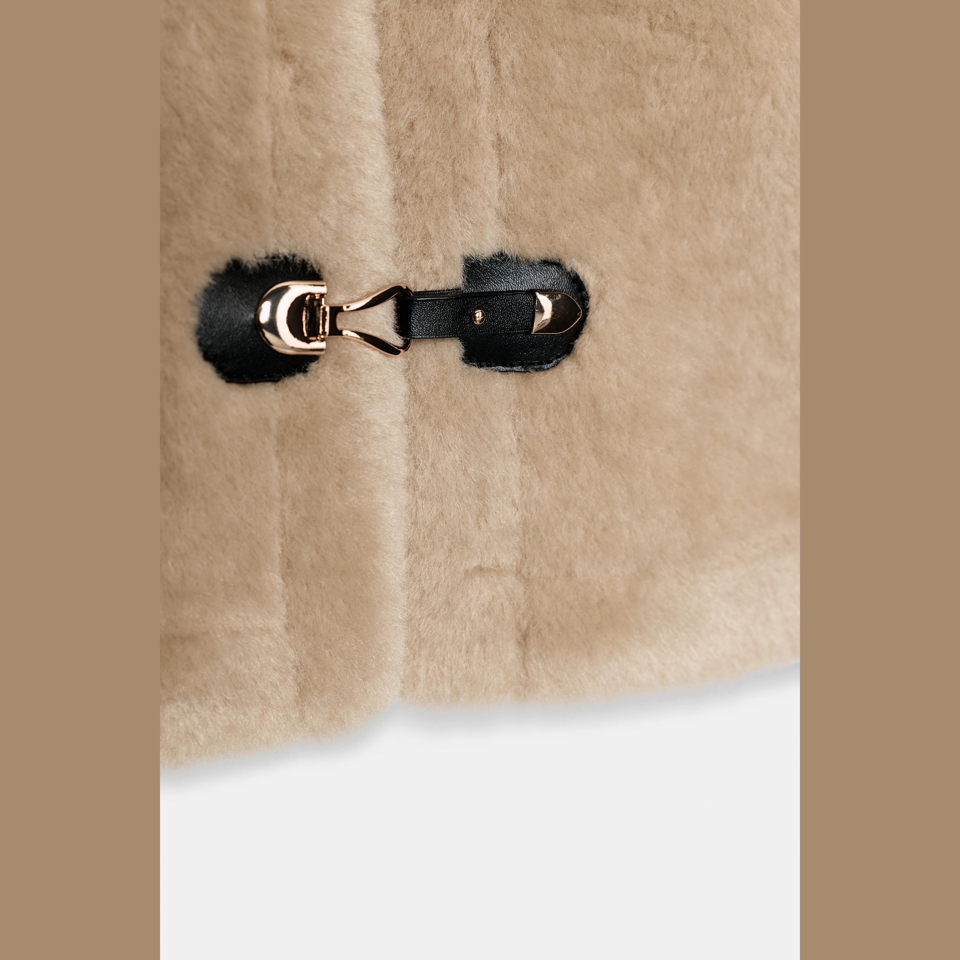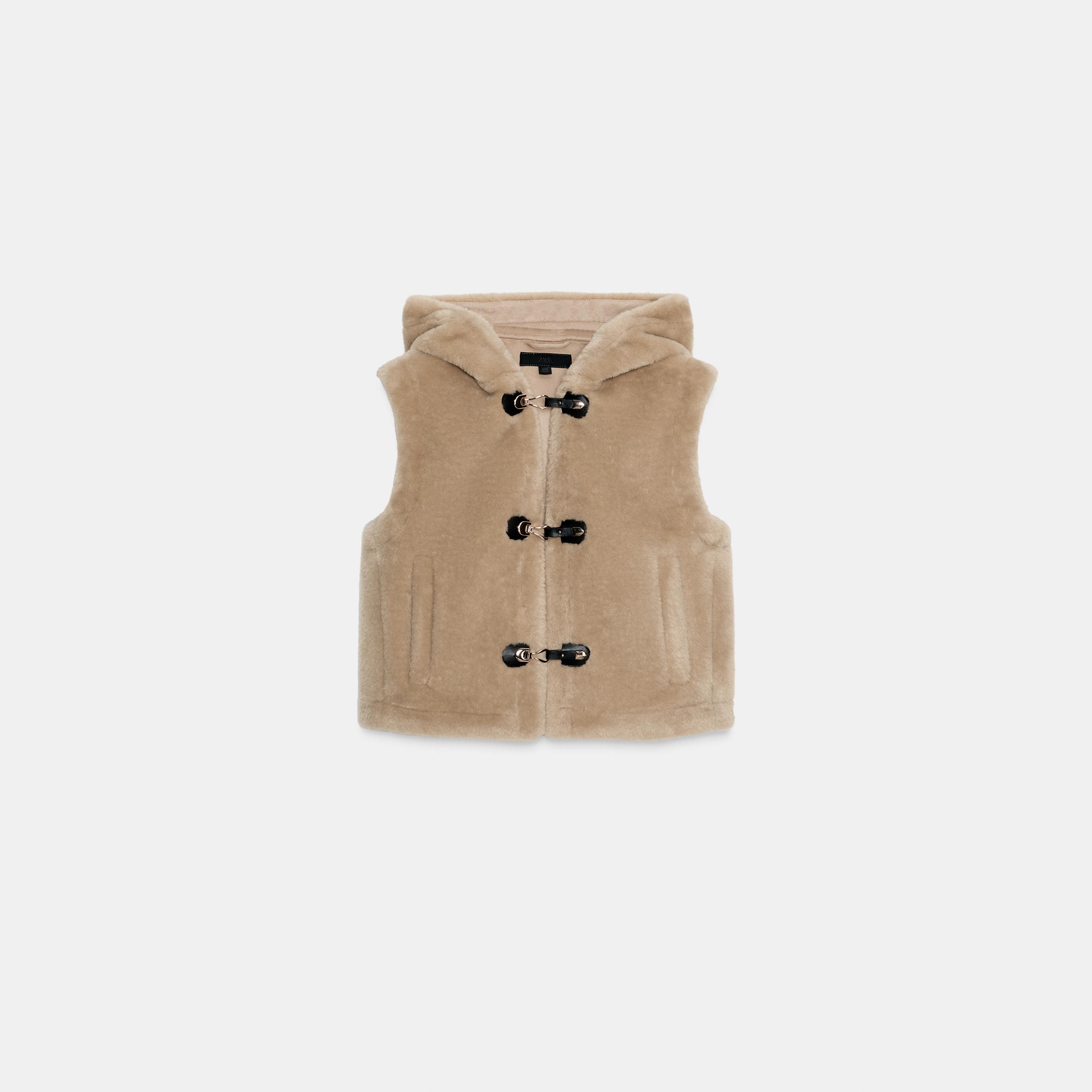 جيليه نسائي – لون حيادي دافئ (كاميل) – Camel، من الفرو الصناعي مع قبعة وتوغلز أمامية (Faux Shearling Gilet with Toggles)