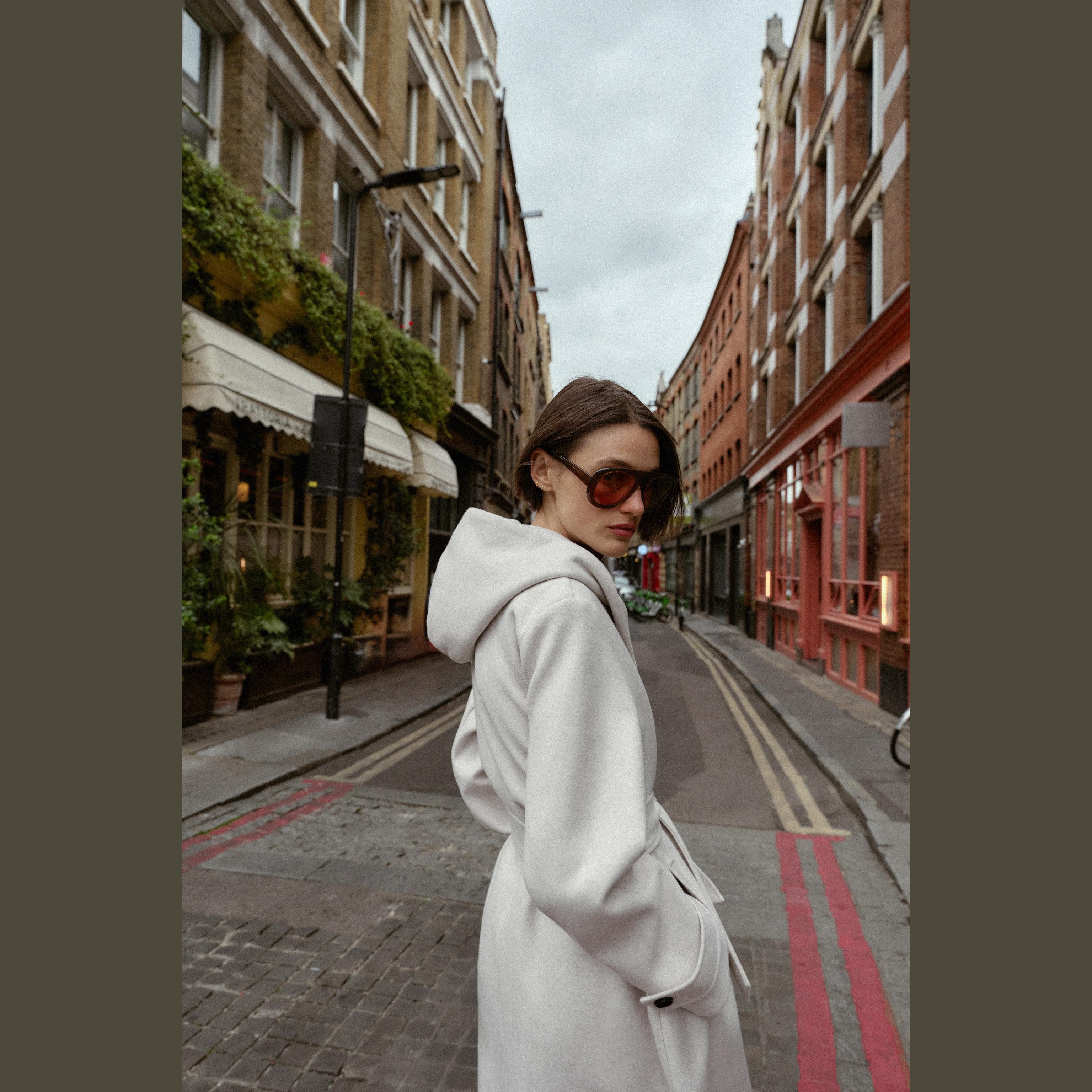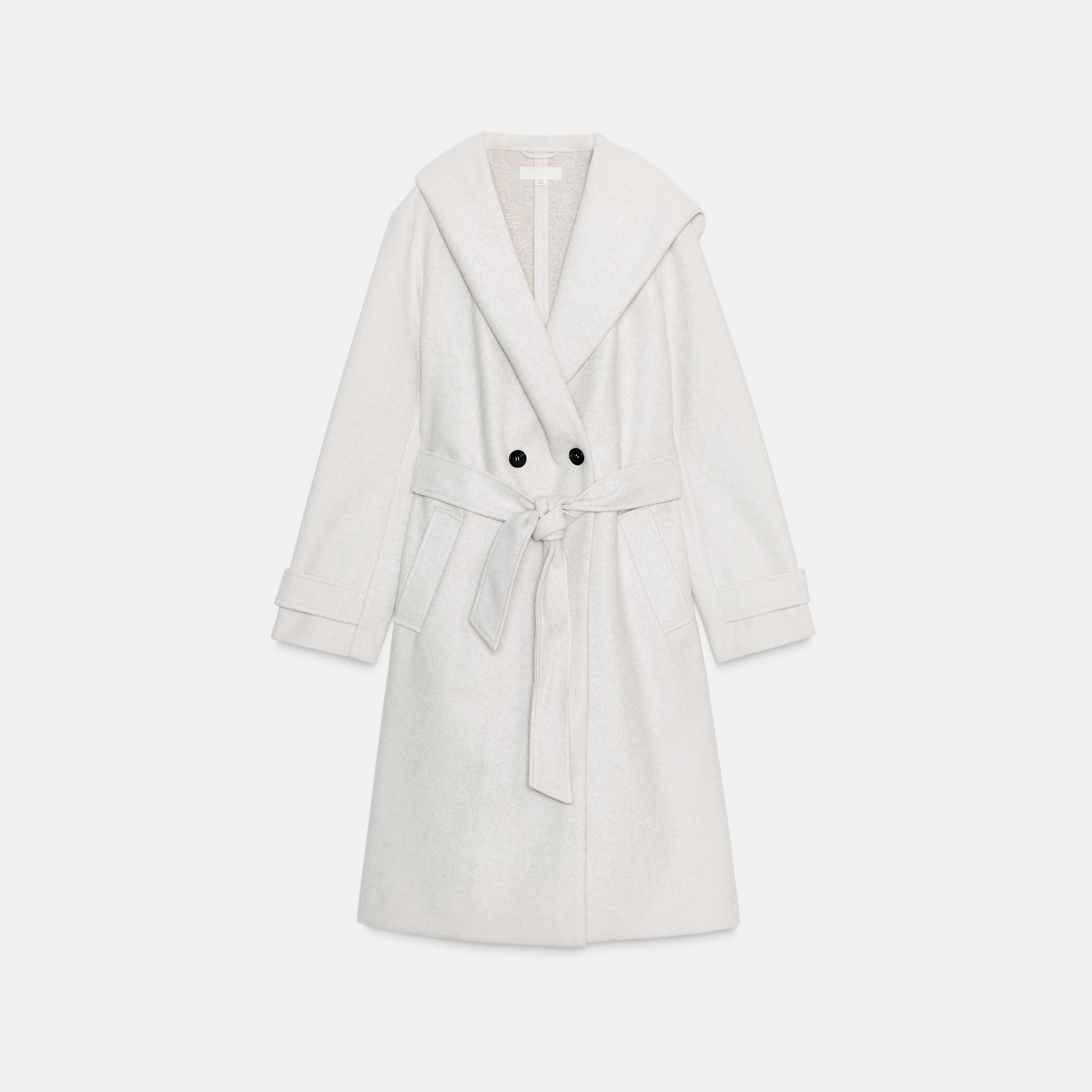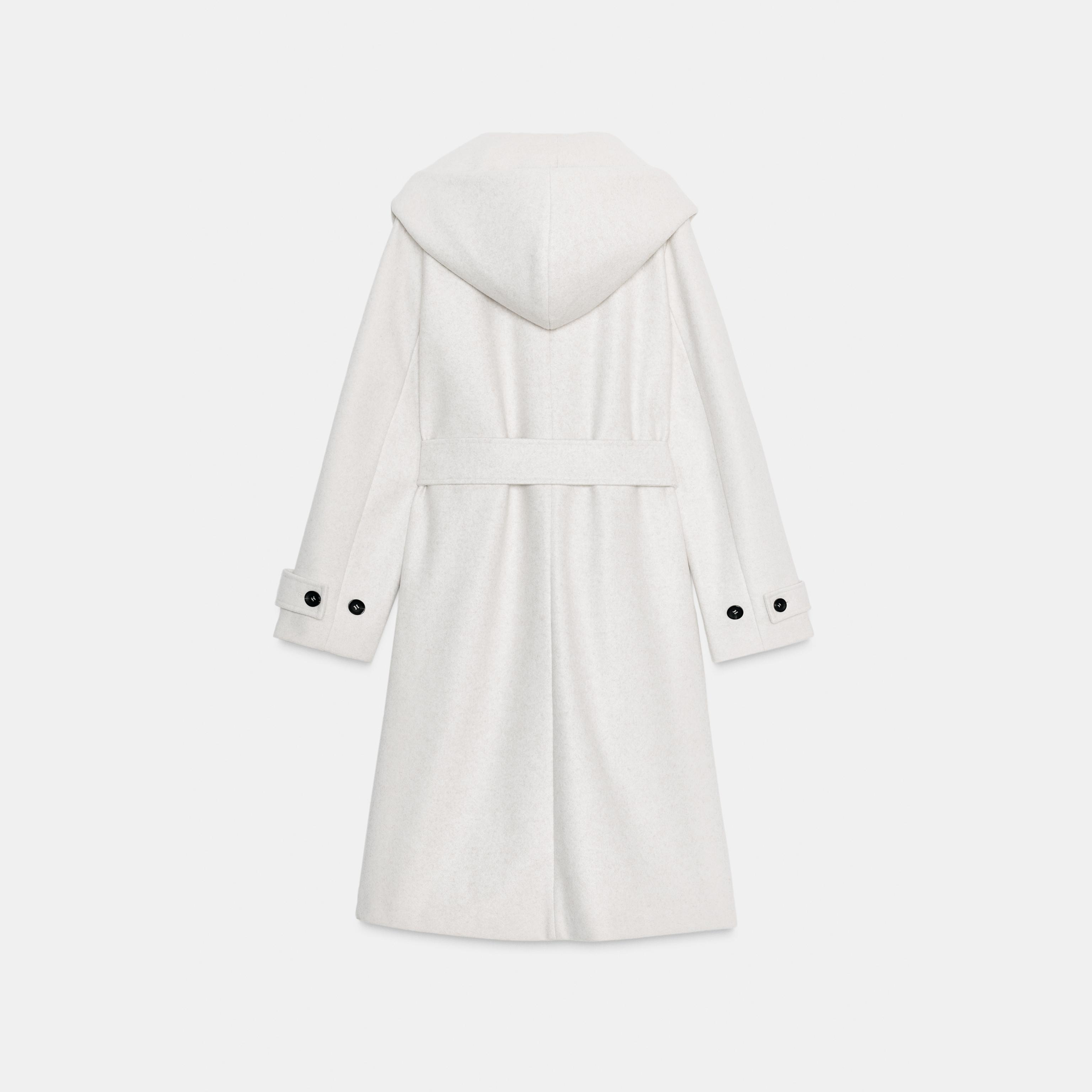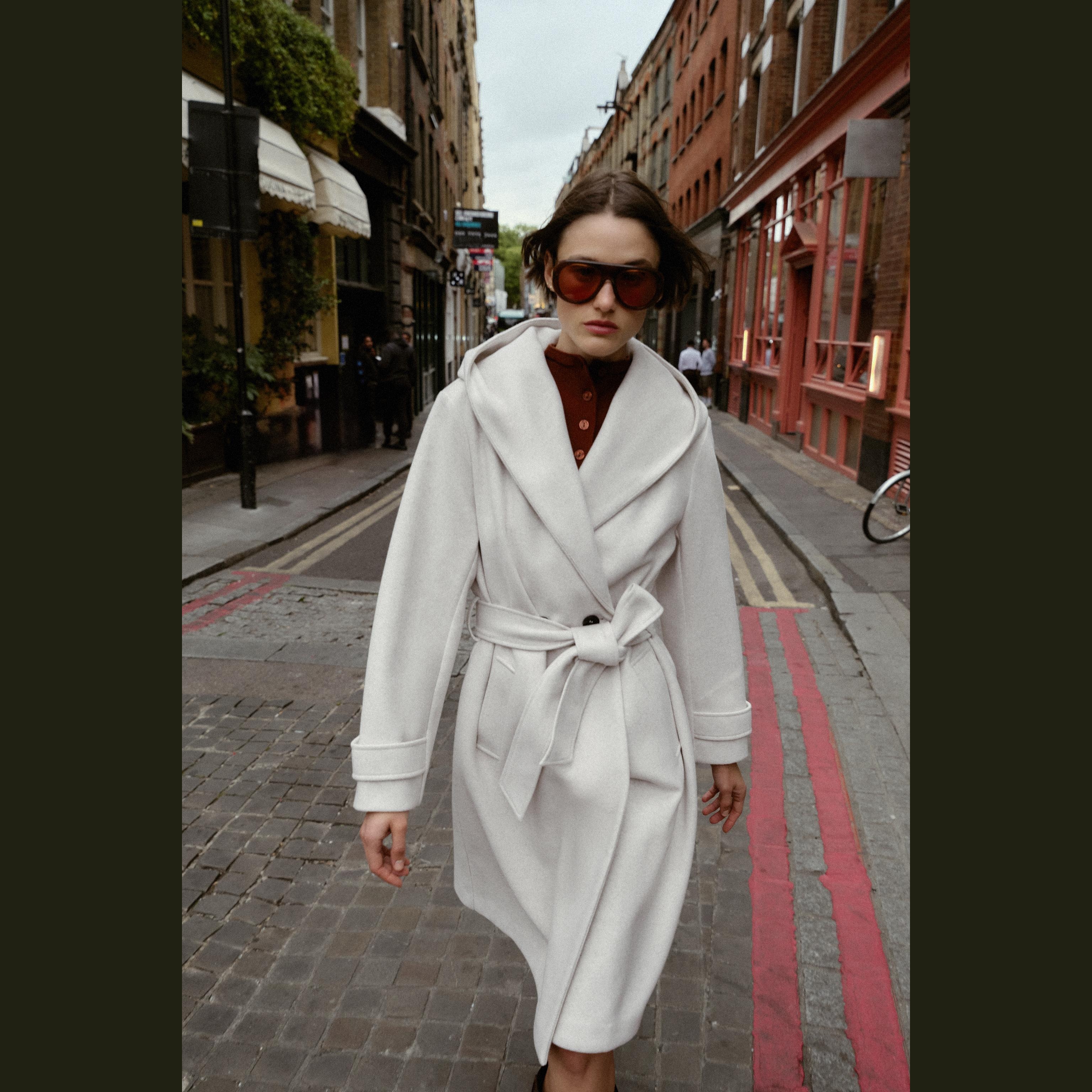 معطف نسائي – لون حيادي فاتح (إكرو) – Ecru، بغطاء رأس وحزام بنفس الخامة (Soft Hooded Coat)