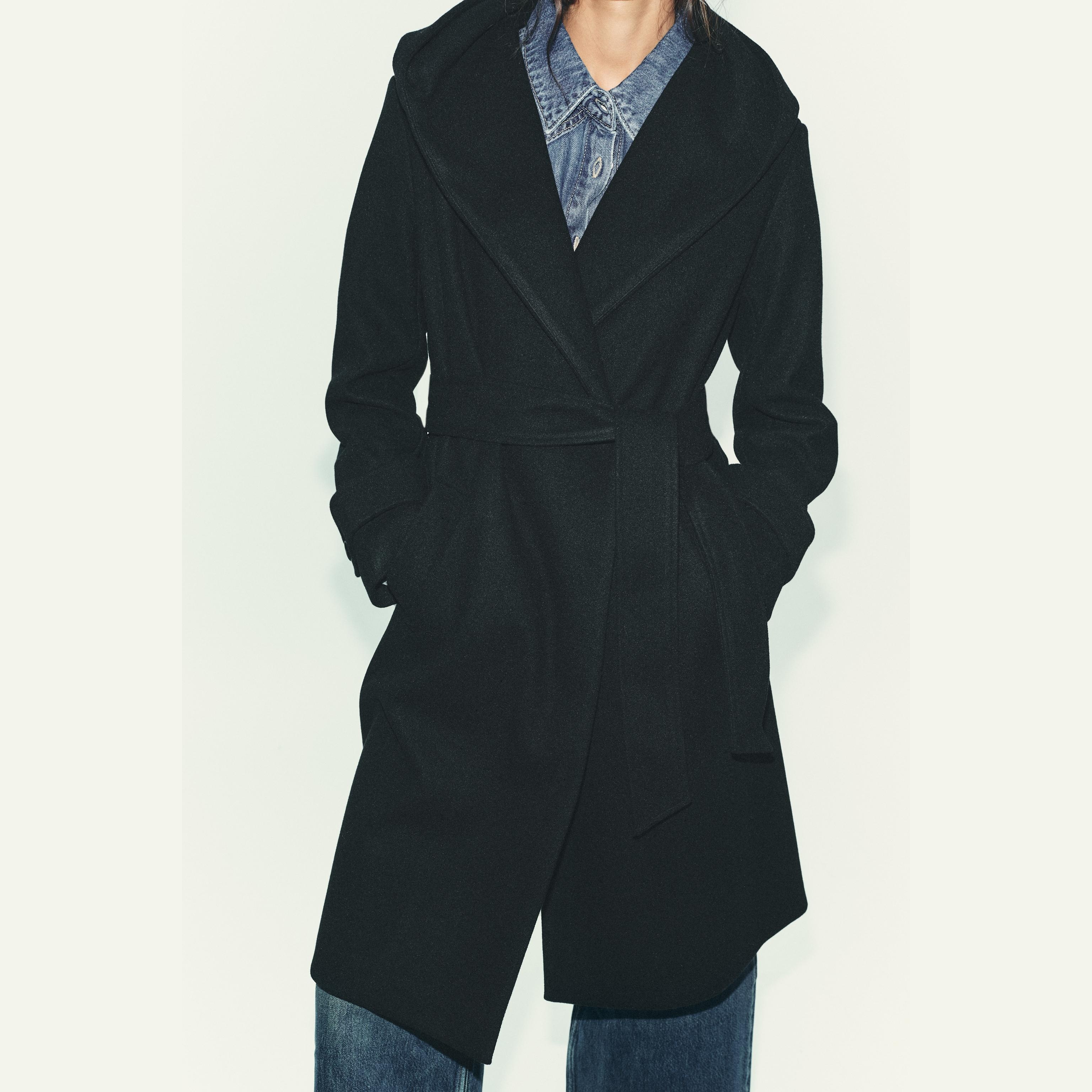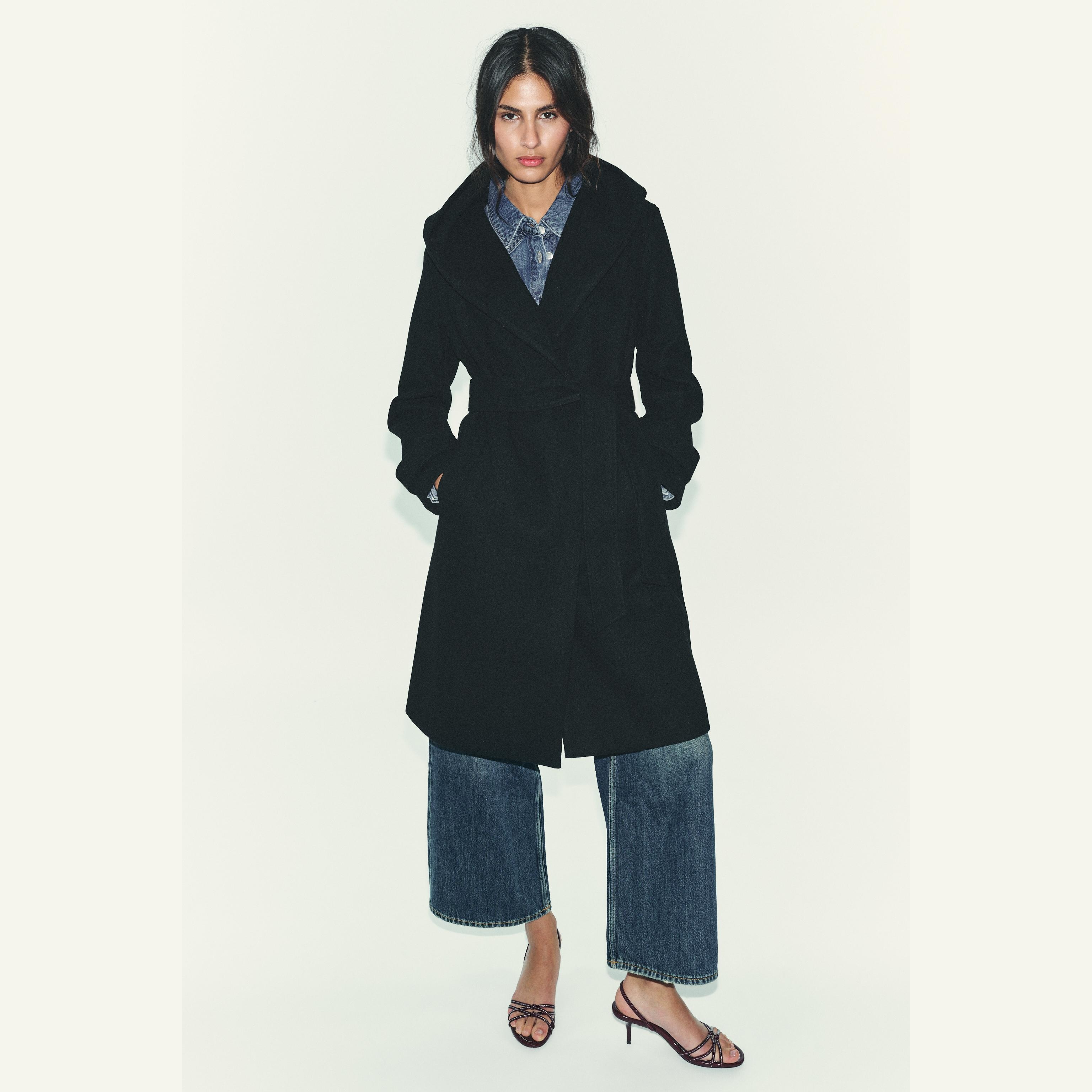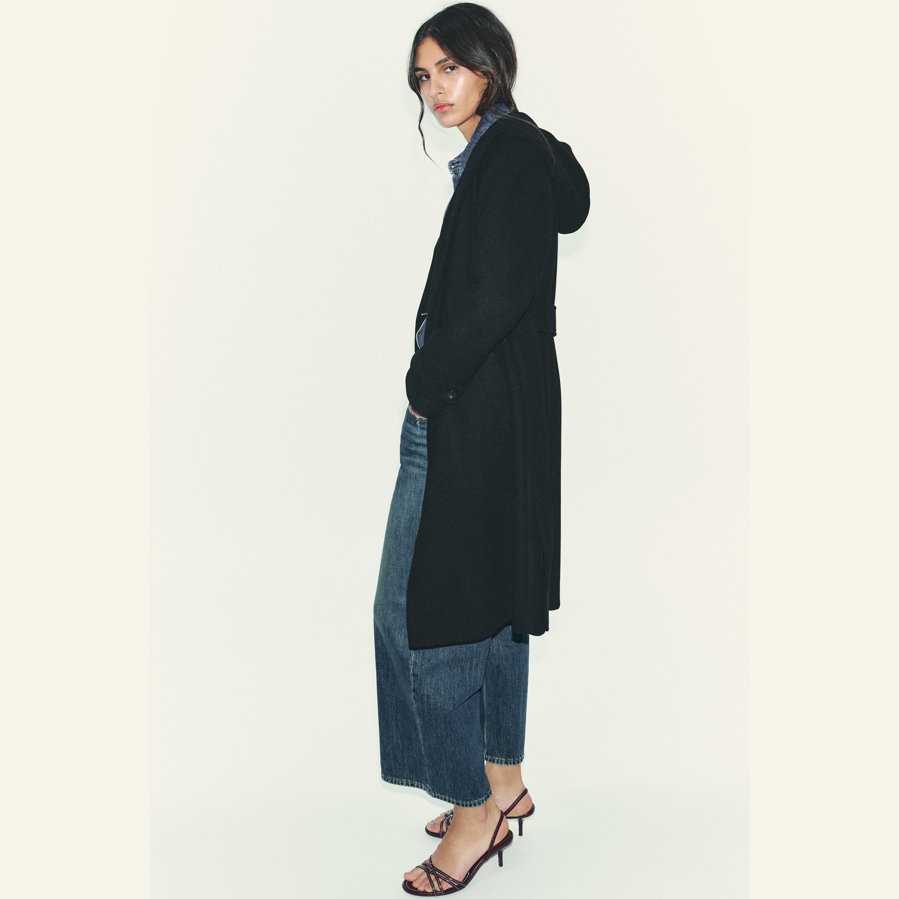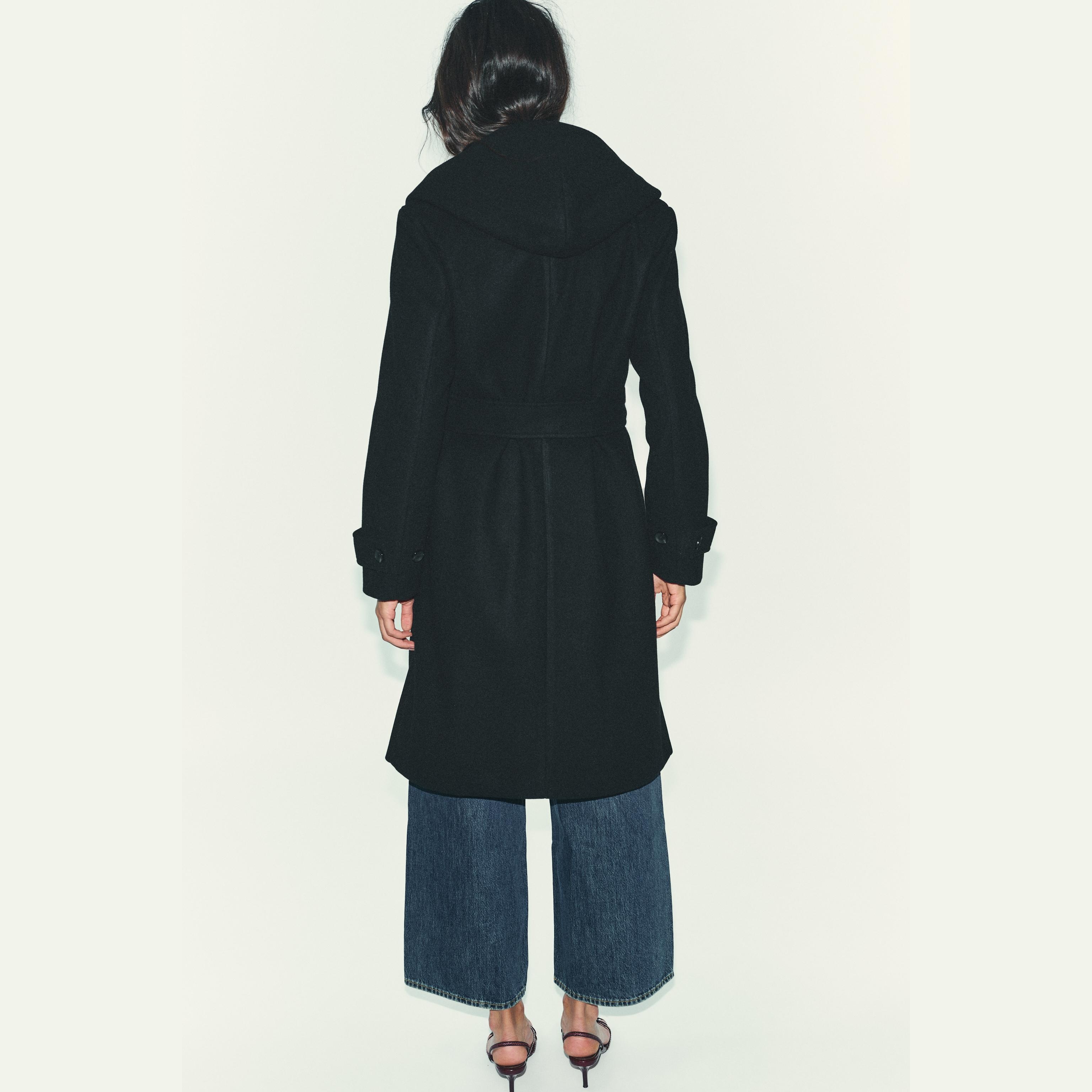 معطف نسائي – أسود كلاسيكي – Black، بغطاء رأس وحزام بنفس الخامة (Soft Hooded Coat)