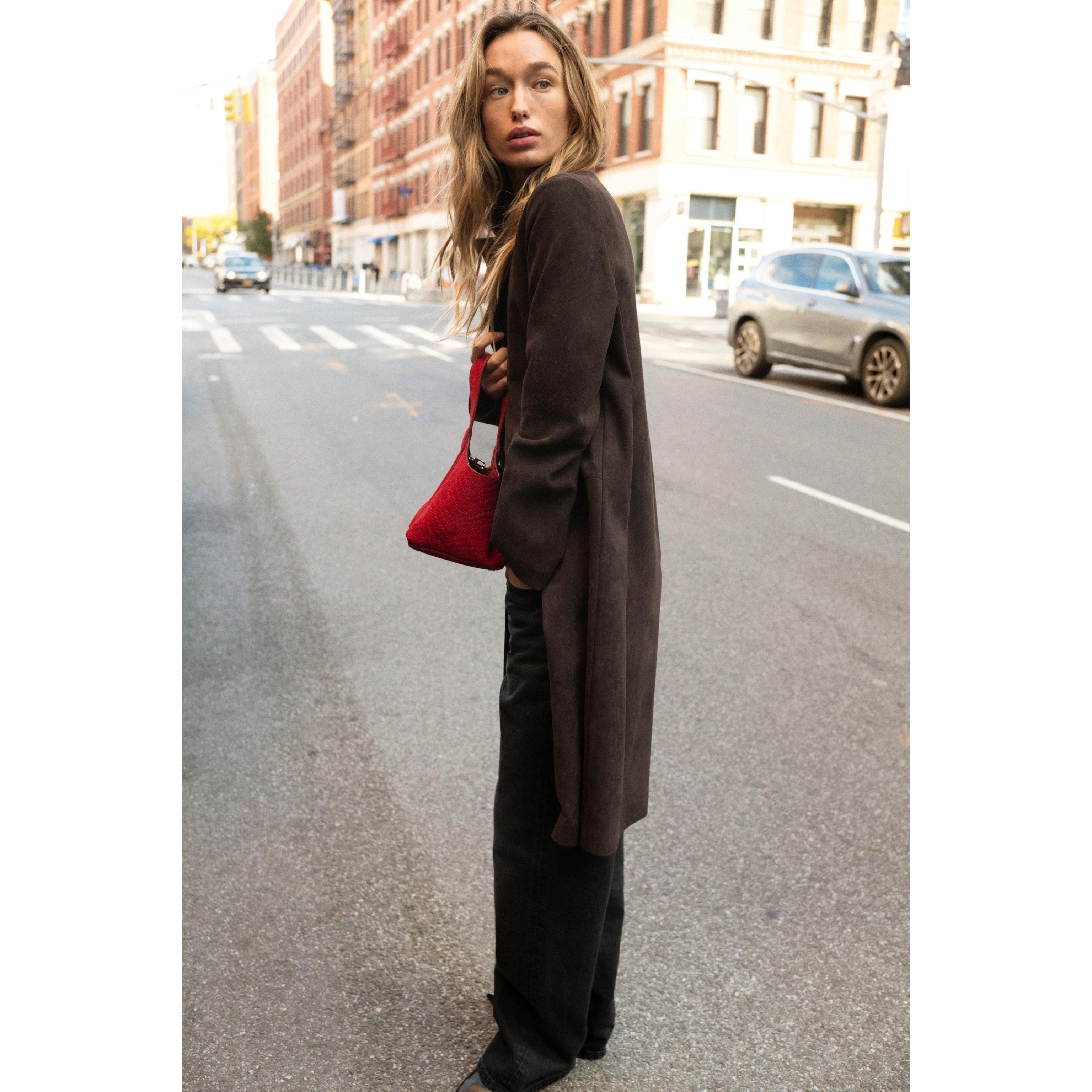 معطف نسائي – لون حيادي دافئ (شوكولا) – Chocolate، من السويد الصناعي (Faux Suede Frock Coat)