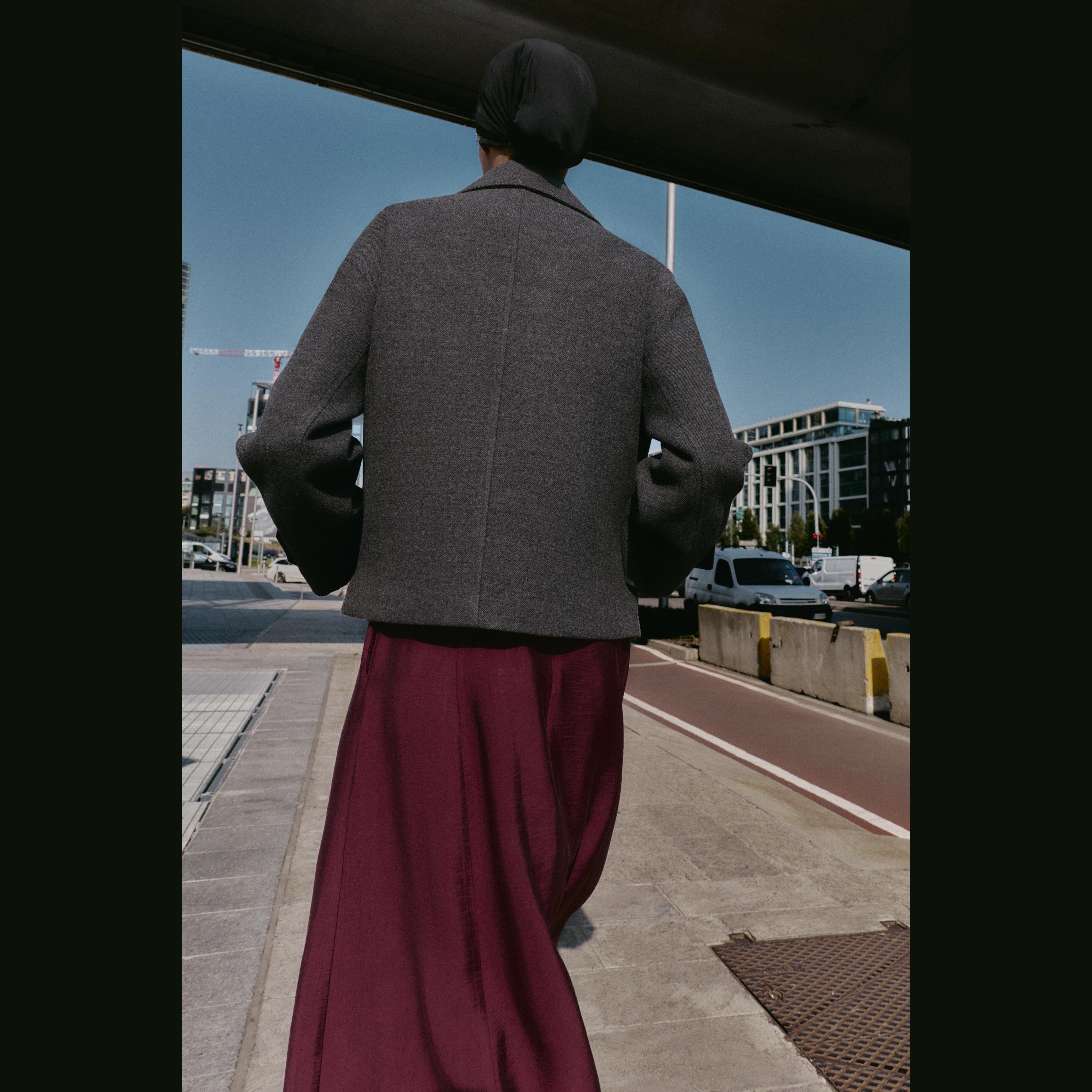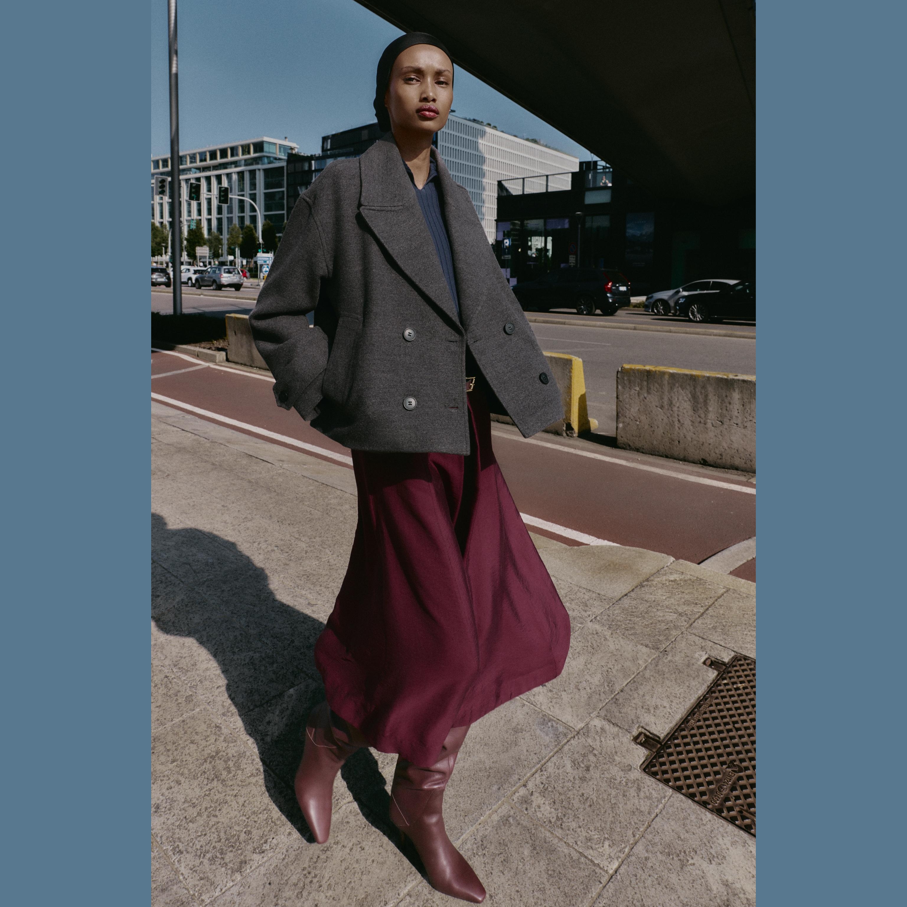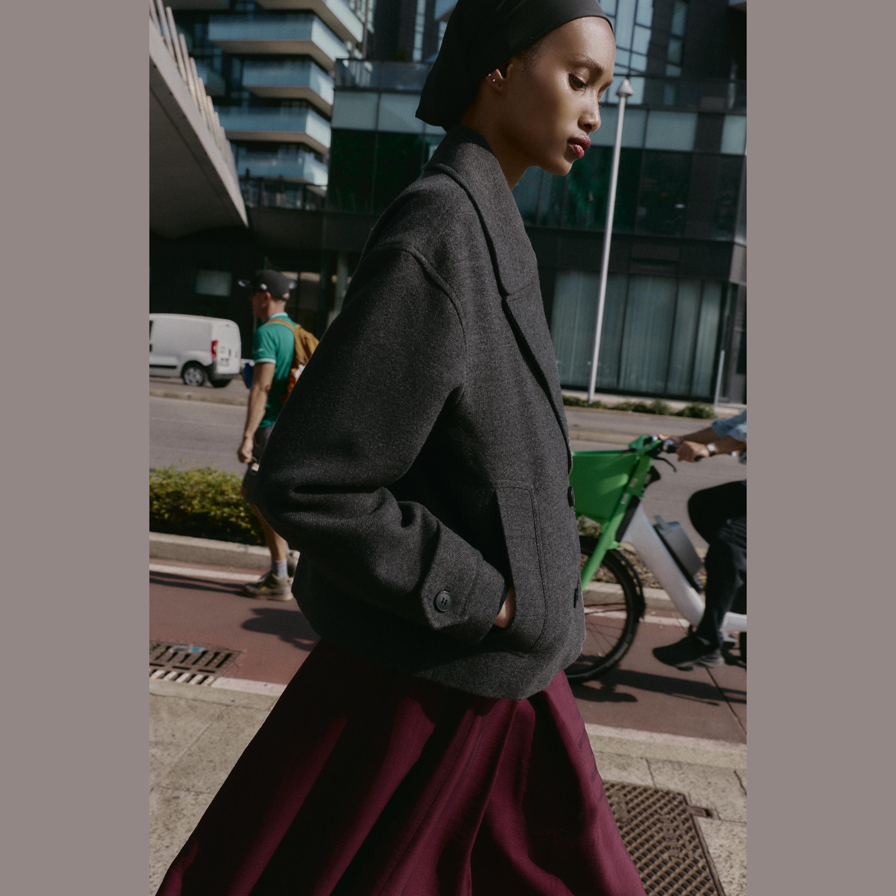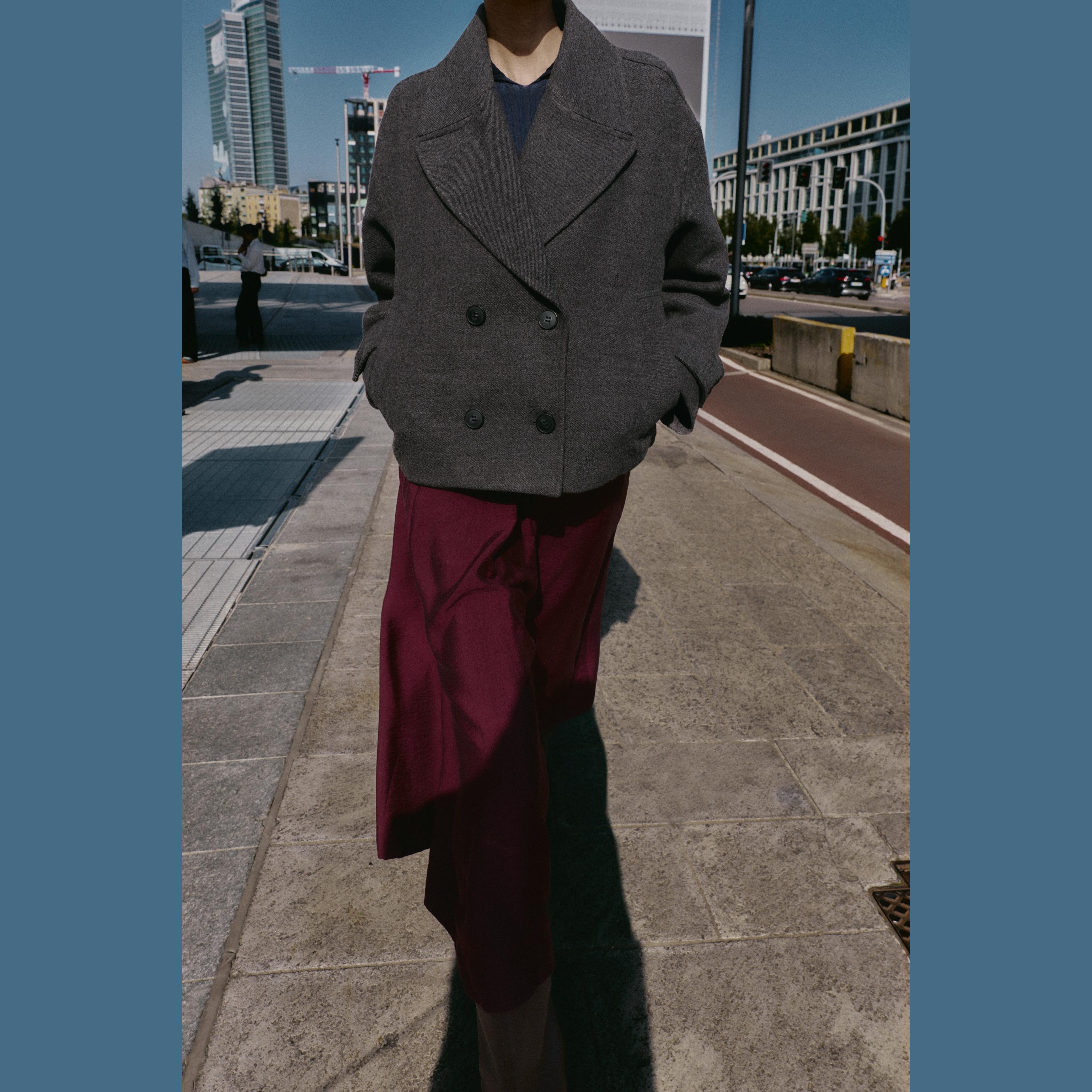 - التصميم: معطف قصير مزدوج الصدر (Soft Double-Breasted Short Coat)