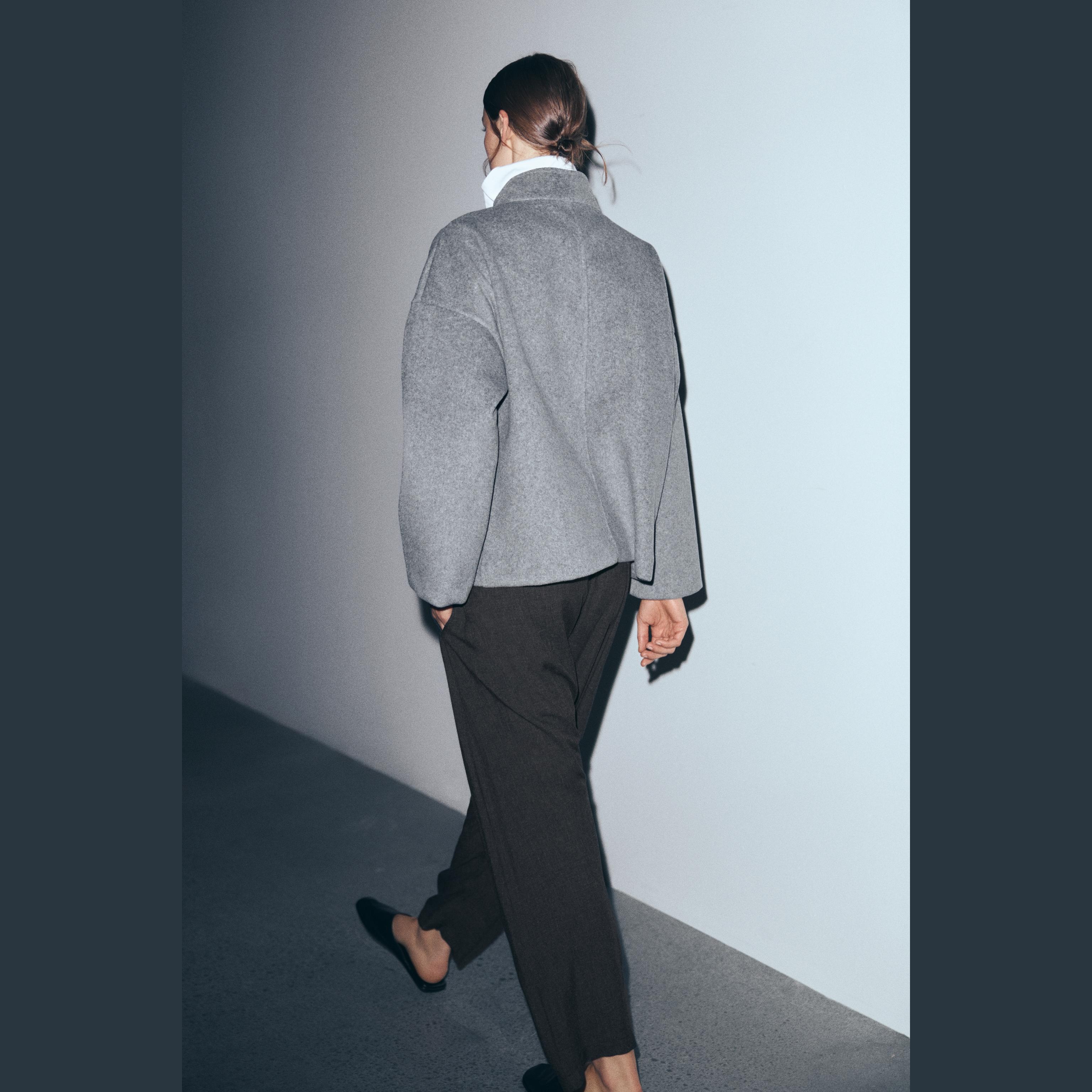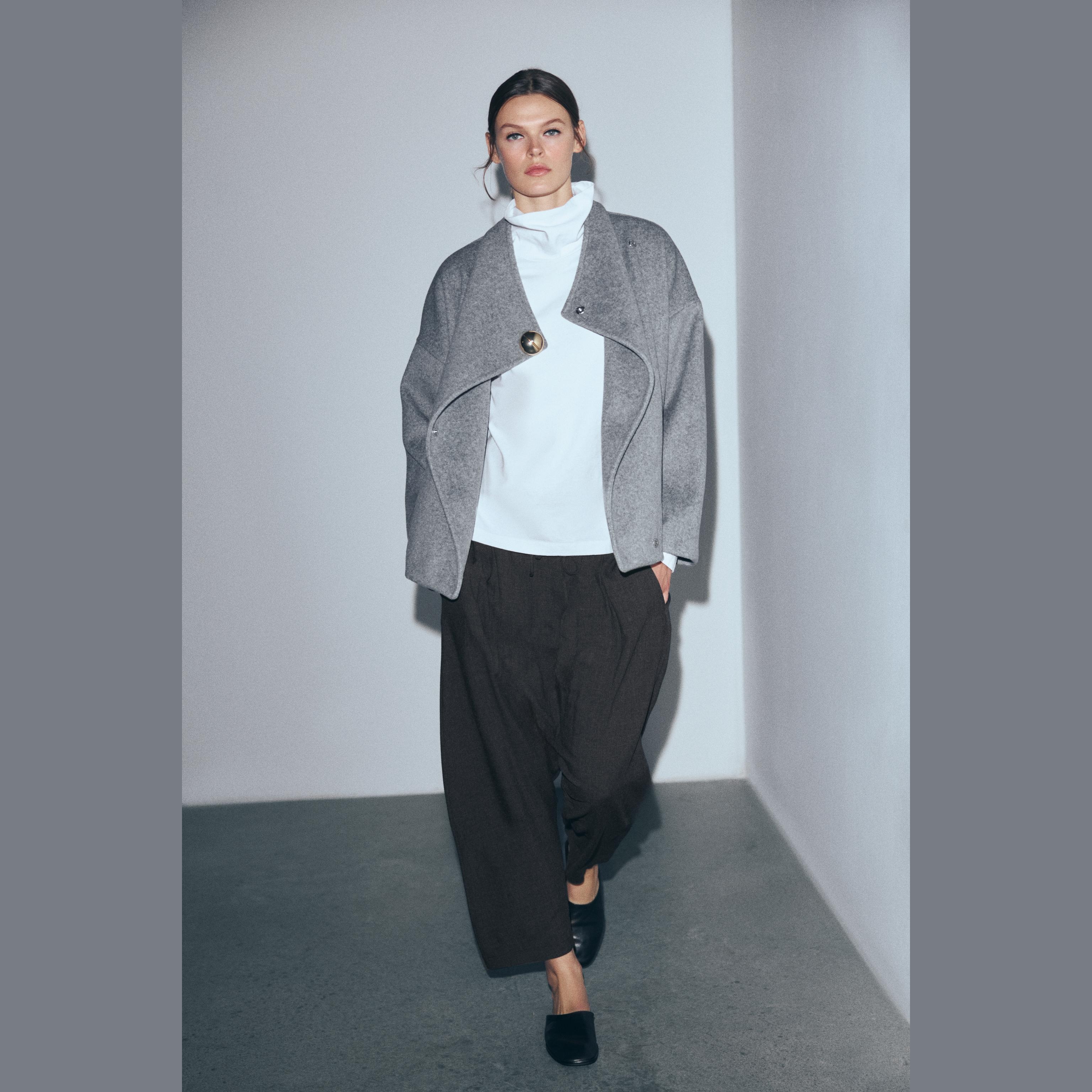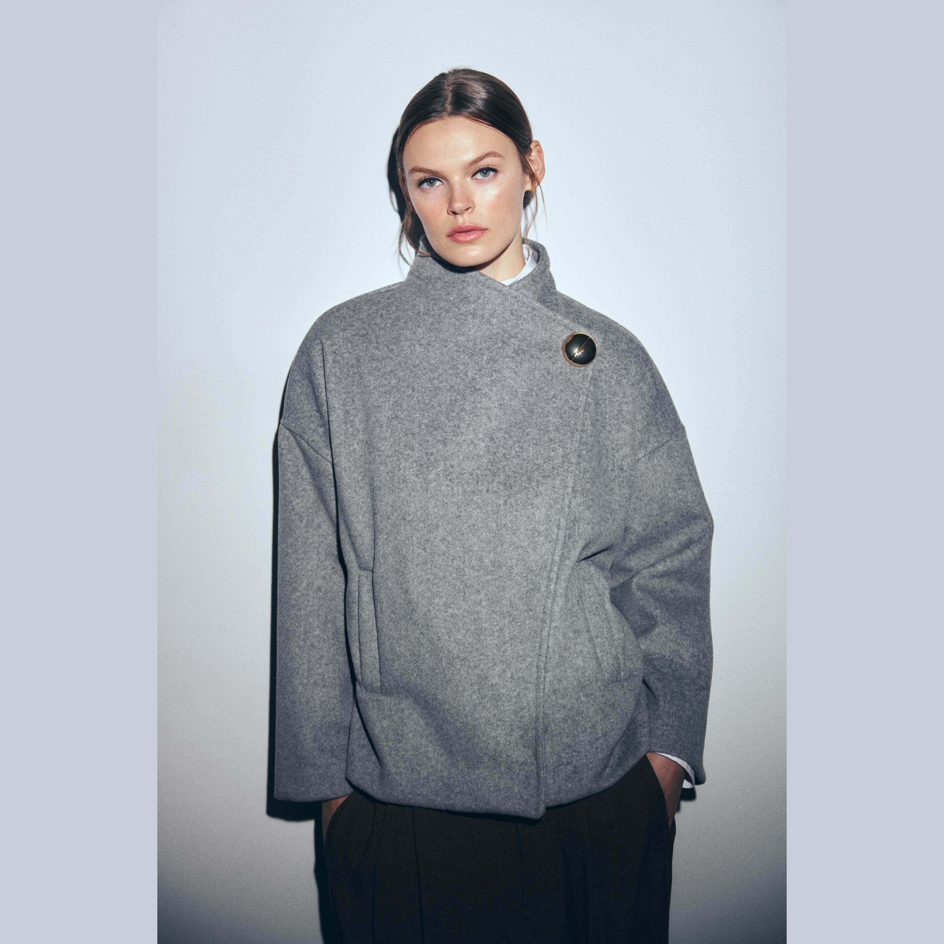 - التصميم: معطف قصير بأزرار أمامية (Soft Button Coat)