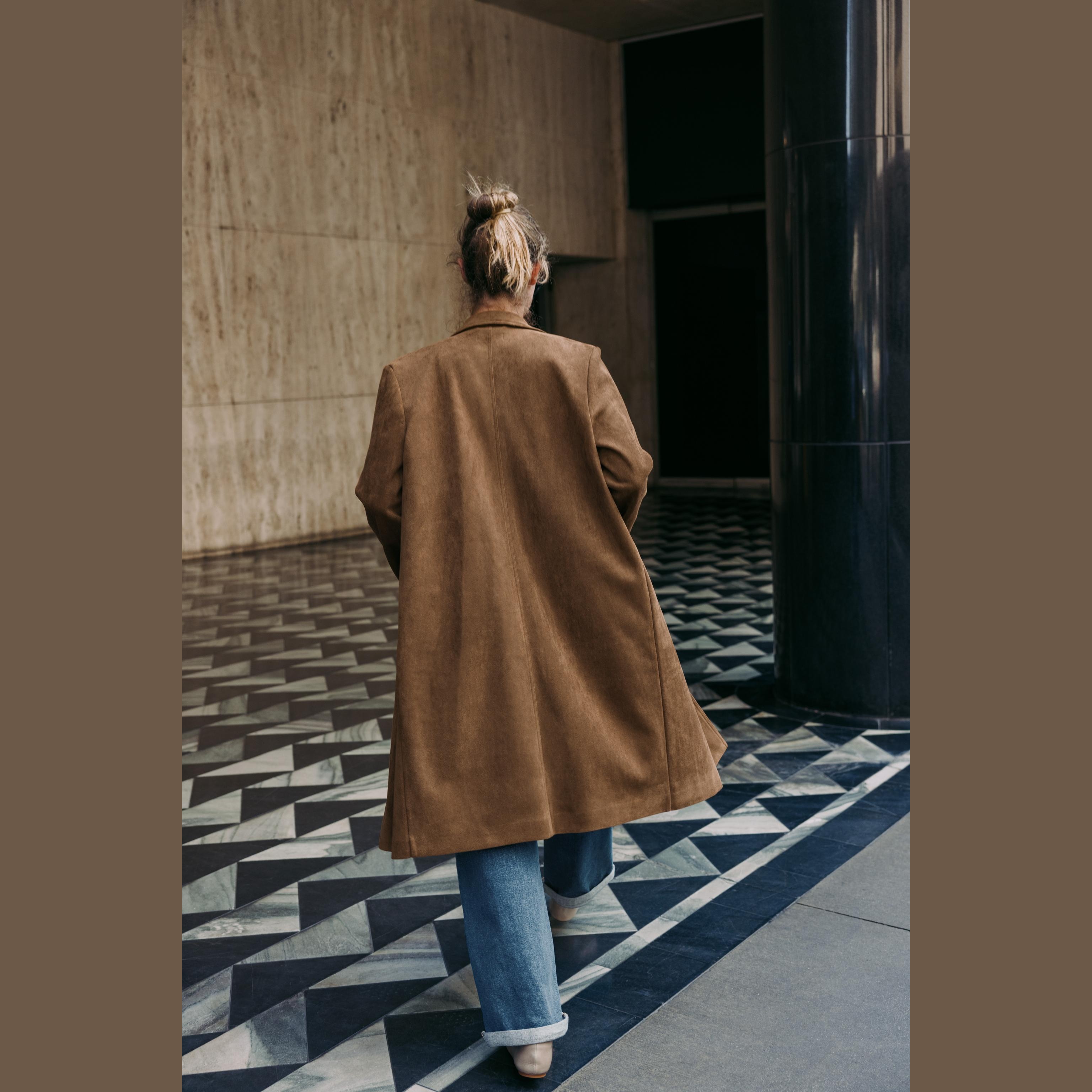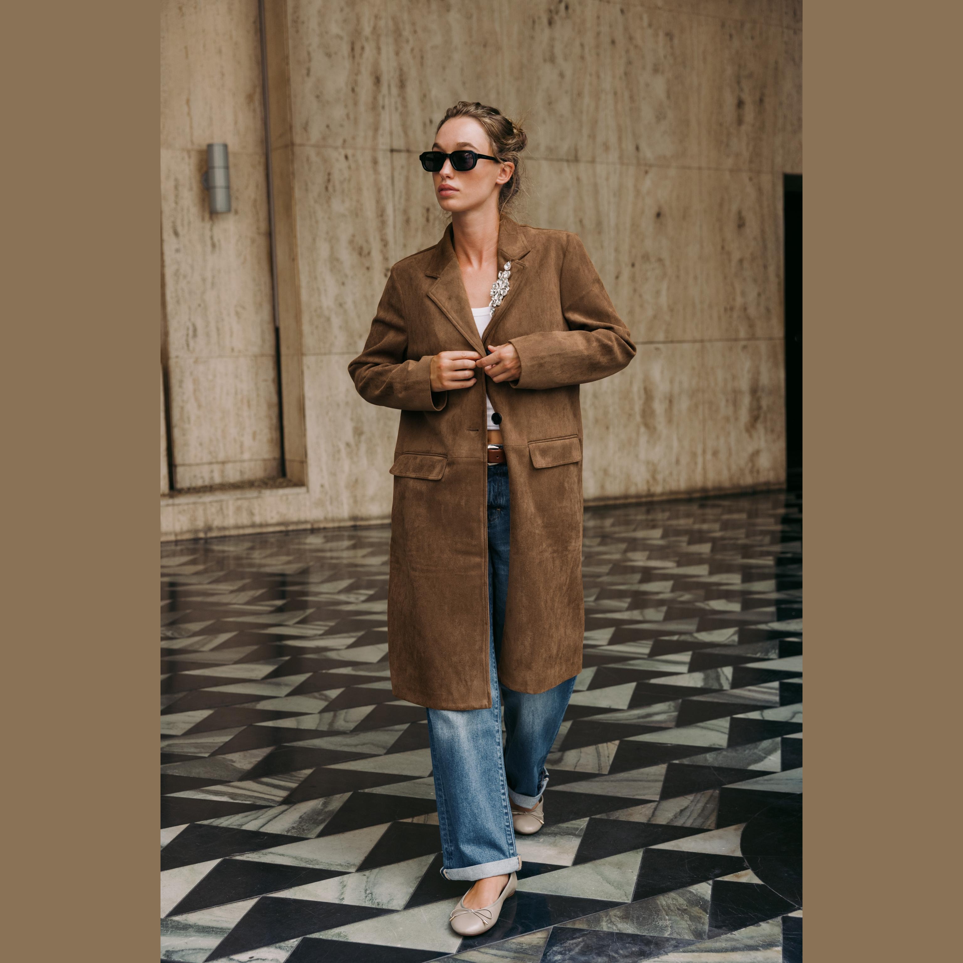 معطف أنيق بلون بني تبغ دافئ، مصنوع من خامة السويد الصناعي الناعم يمنح مظهرًا عصريًا وراحة في الارتداء. يتميز بياقة نوتش كلاسيكية وأكمام طويلة، مع جيوب أمامية بغطاء، وإغلاق أمامي بالأزرار. يزينه بروش زخرفي أنيق يمنح لمسة فاخرة ومميزة. تصميم مثالي للإطلالات اليومية أو الرسمية في المواسم الباردة.