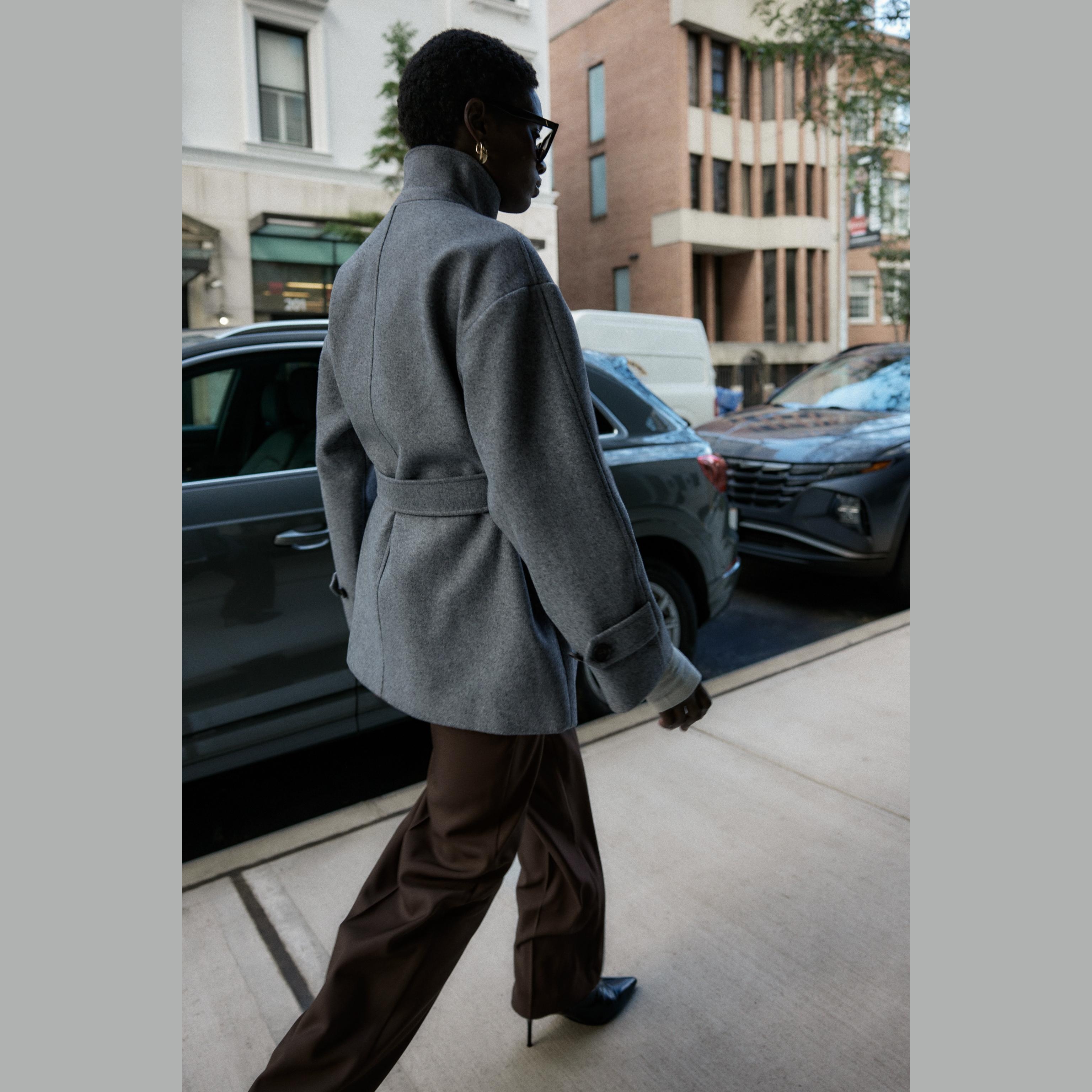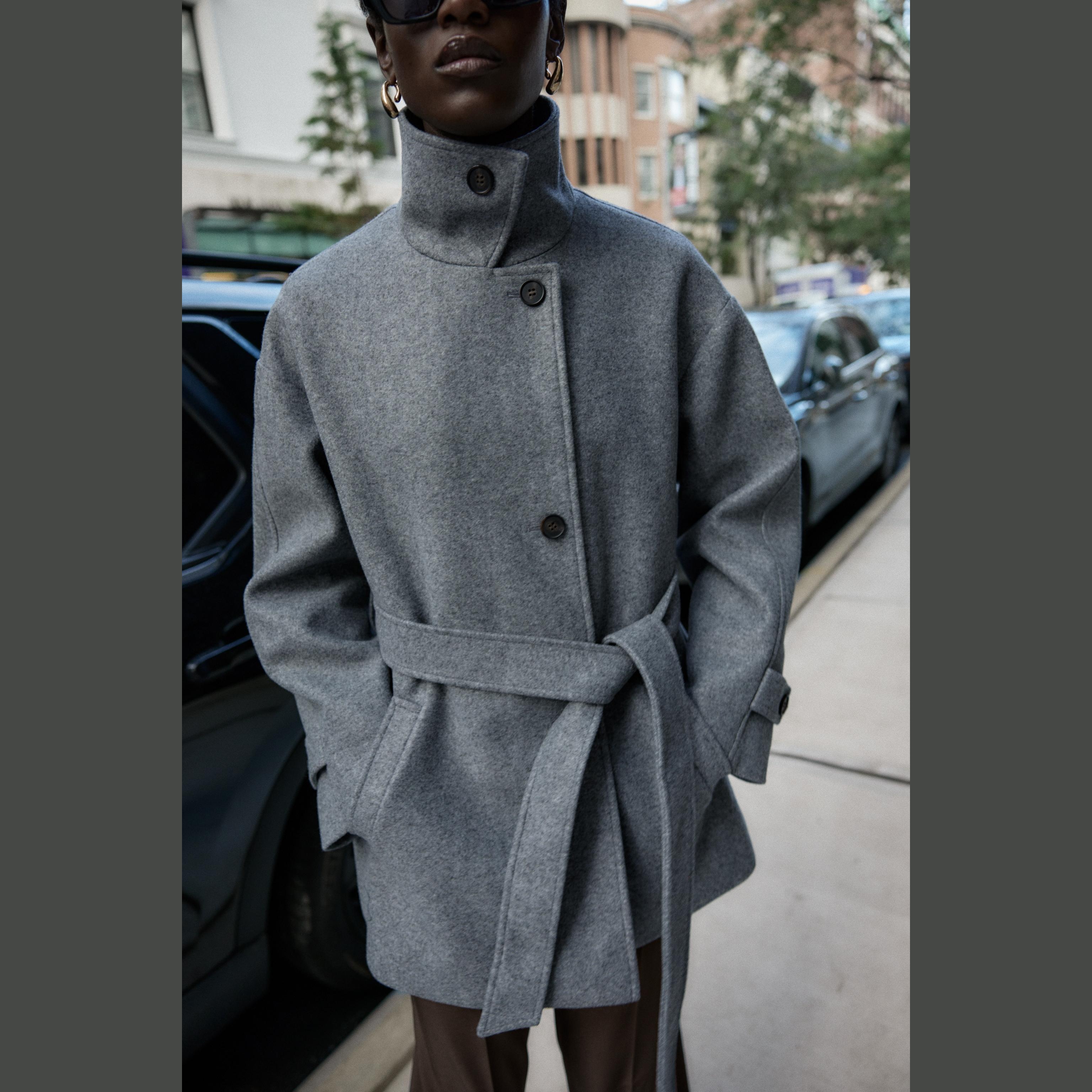 - التصميم: معطف بياقة مزدوجة الوضع (Soft Double-Position Collar Coat)