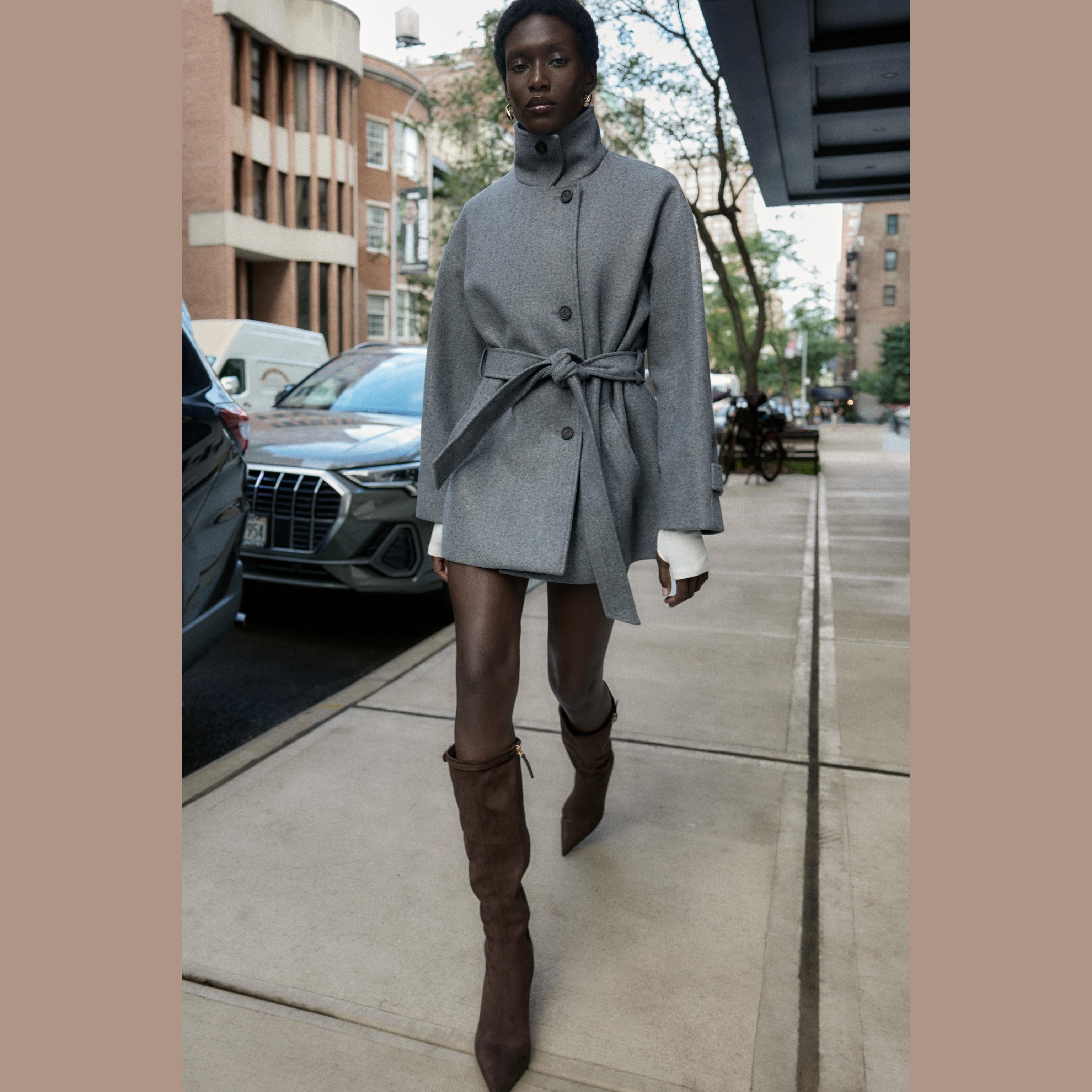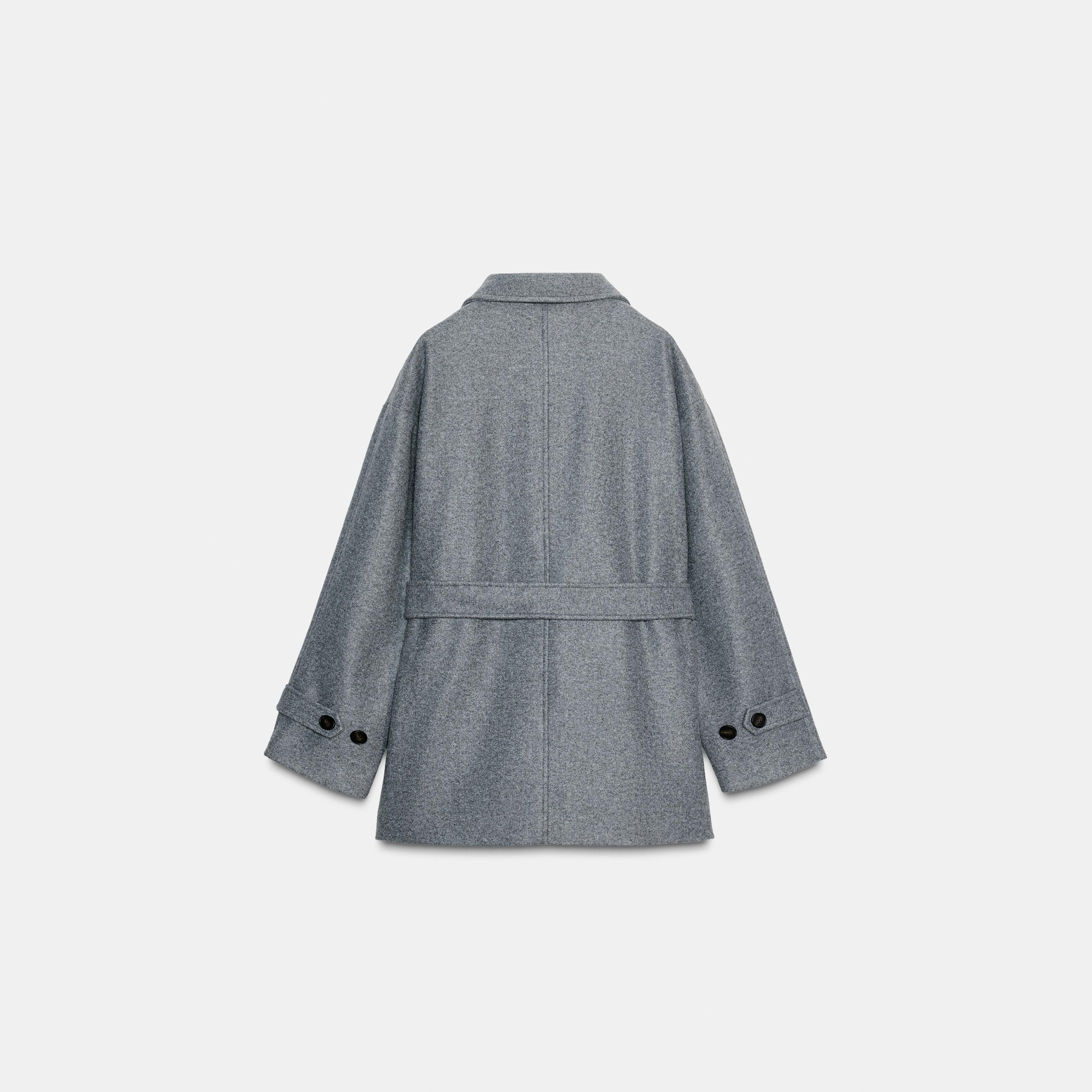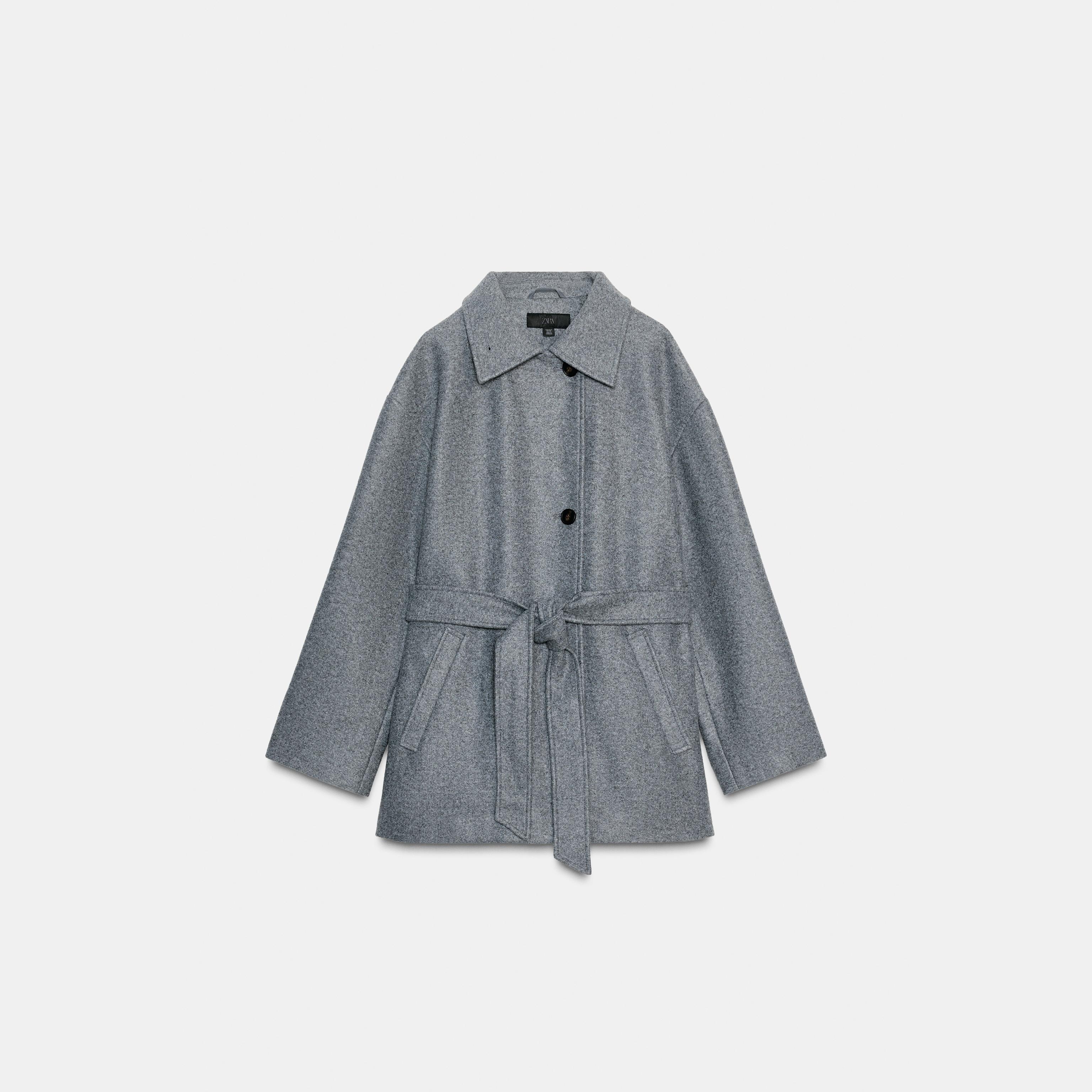 معطف أنيق بلون رمادي بيج حيادي ممزوج، مصنوع من خامة صناعية ناعمة تمنح مظهرًا عمليًا وراحة في الارتداء. يتميز بياقة مزدوجة الوضع يمكن ارتداؤها بشكل كلاسيكي أو مرفوعة للحماية من البرد، مع أكمام طويلة وحزام بنفس الخامة لإبراز الخصر. إغلاق أمامي مزدوج بالأزرار مع جيوب أمامية عملية. مثالي للإطلالات اليومية أو الرسمية في المواسم الباردة.