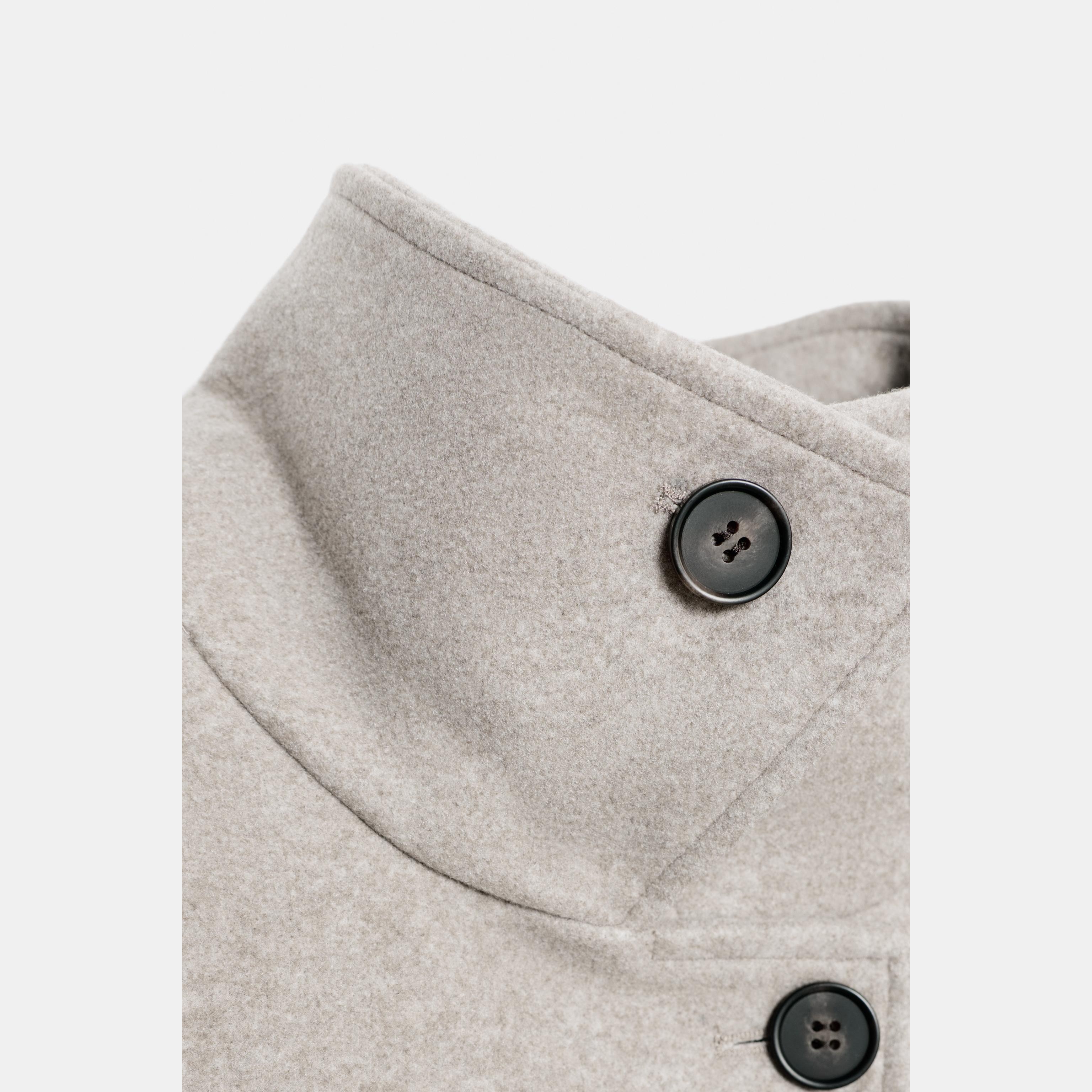 معطف أنيق بلون بيج حيادي دافئ، مصنوع من خامة صناعية ناعمة تمنح مظهرًا عمليًا وراحة في الارتداء. يتميز بياقة مزدوجة الوضع يمكن ارتداؤها بشكل كلاسيكي أو مرفوعة للحماية من البرد، مع أكمام طويلة وحزام بنفس الخامة لإبراز الخصر. إغلاق أمامي مزدوج بالأزرار مع جيوب أمامية عملية. مثالي للإطلالات اليومية أو الرسمية في المواسم الباردة.
