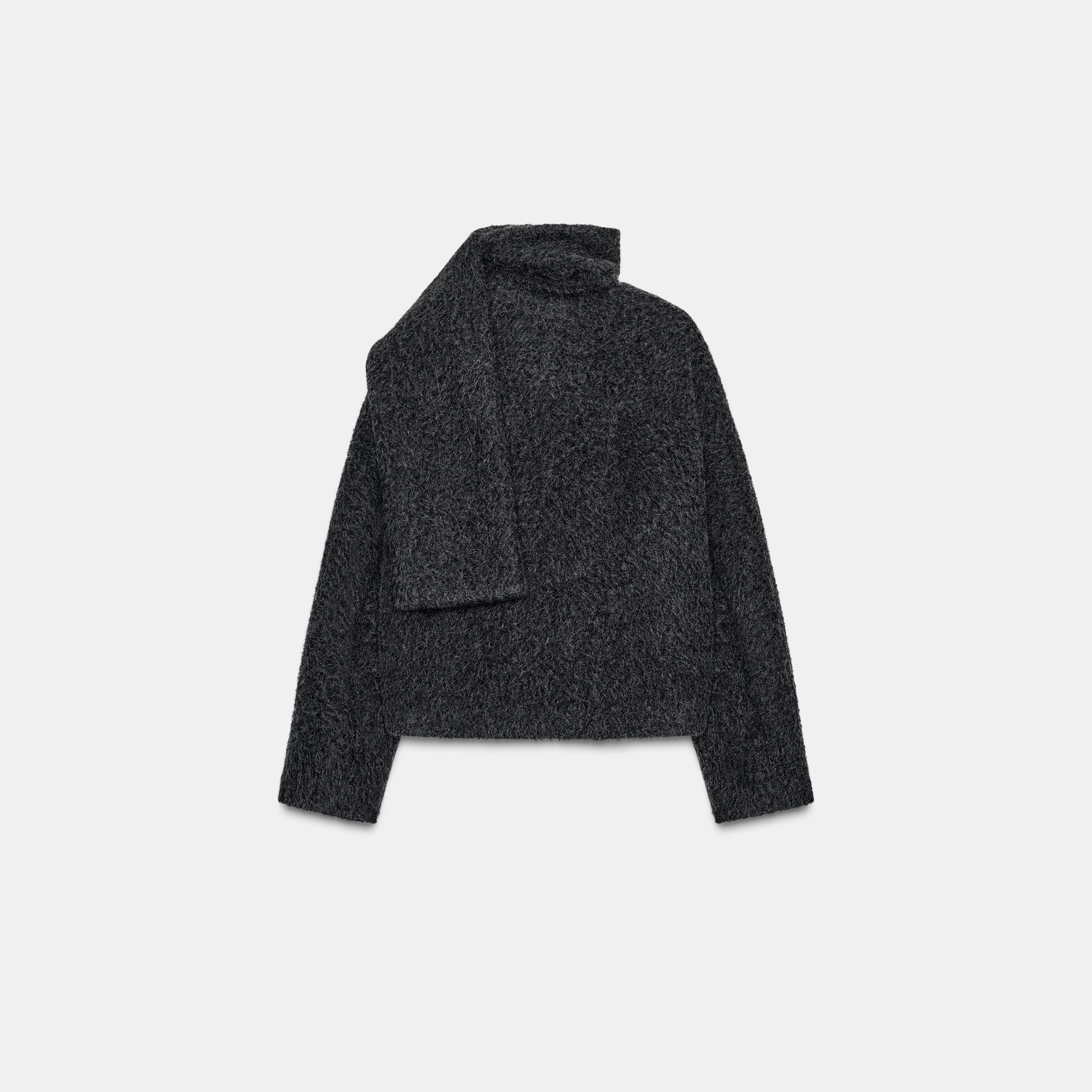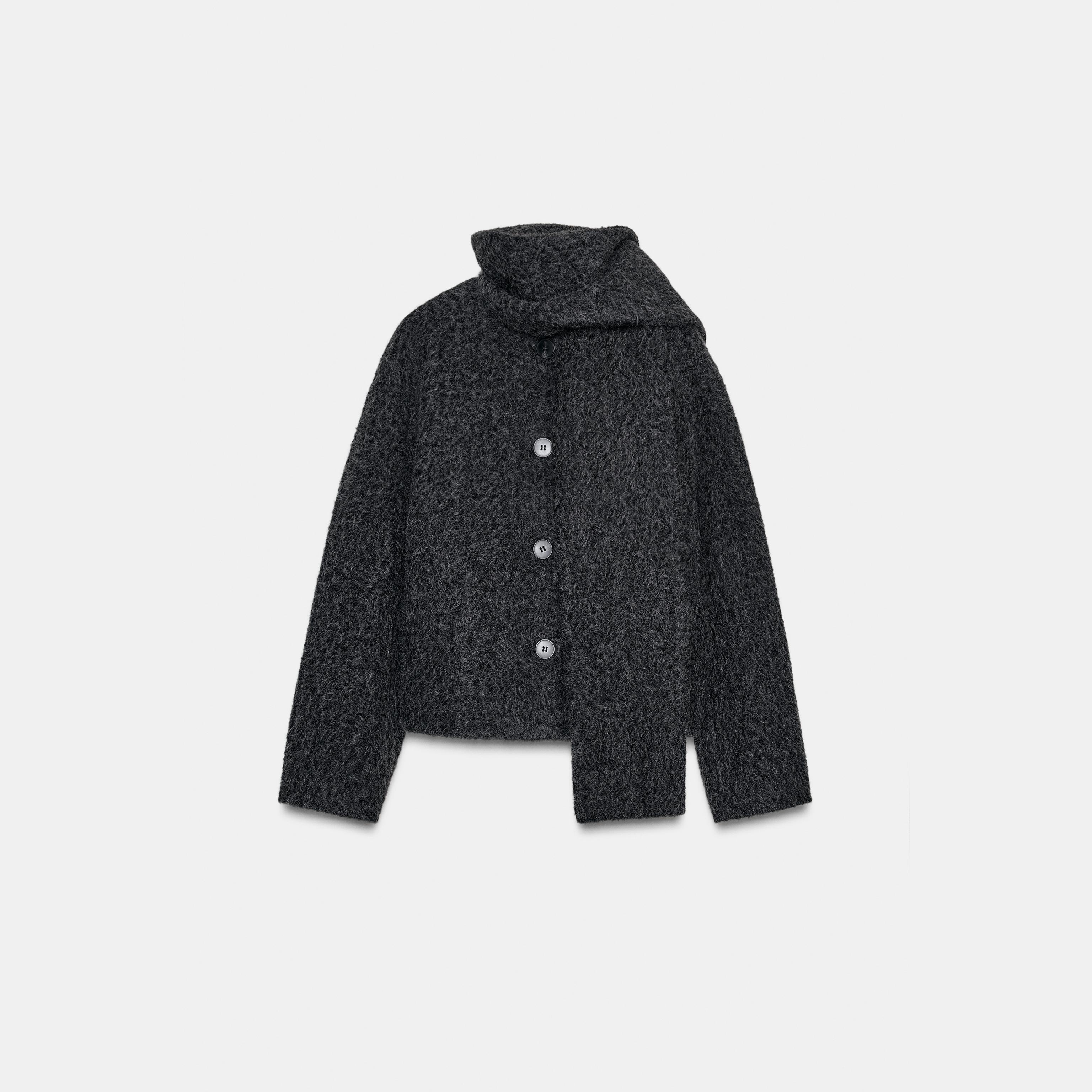 معطف نسائي قصير – لون حيادي داكن (رمادي داكن) – Dark Grey، مع وشاح قابل للفصل (Short Bouclé Coat with Scarf)