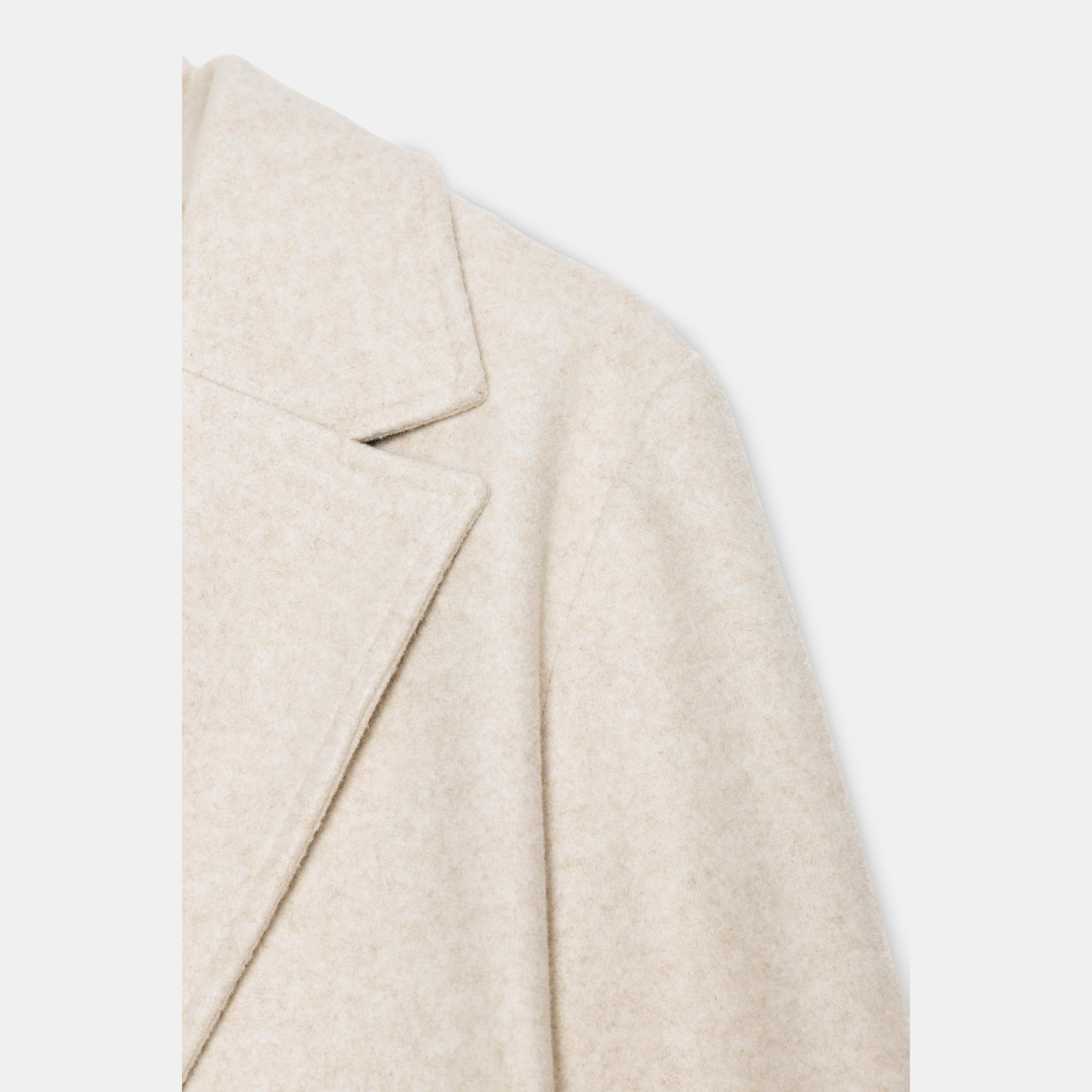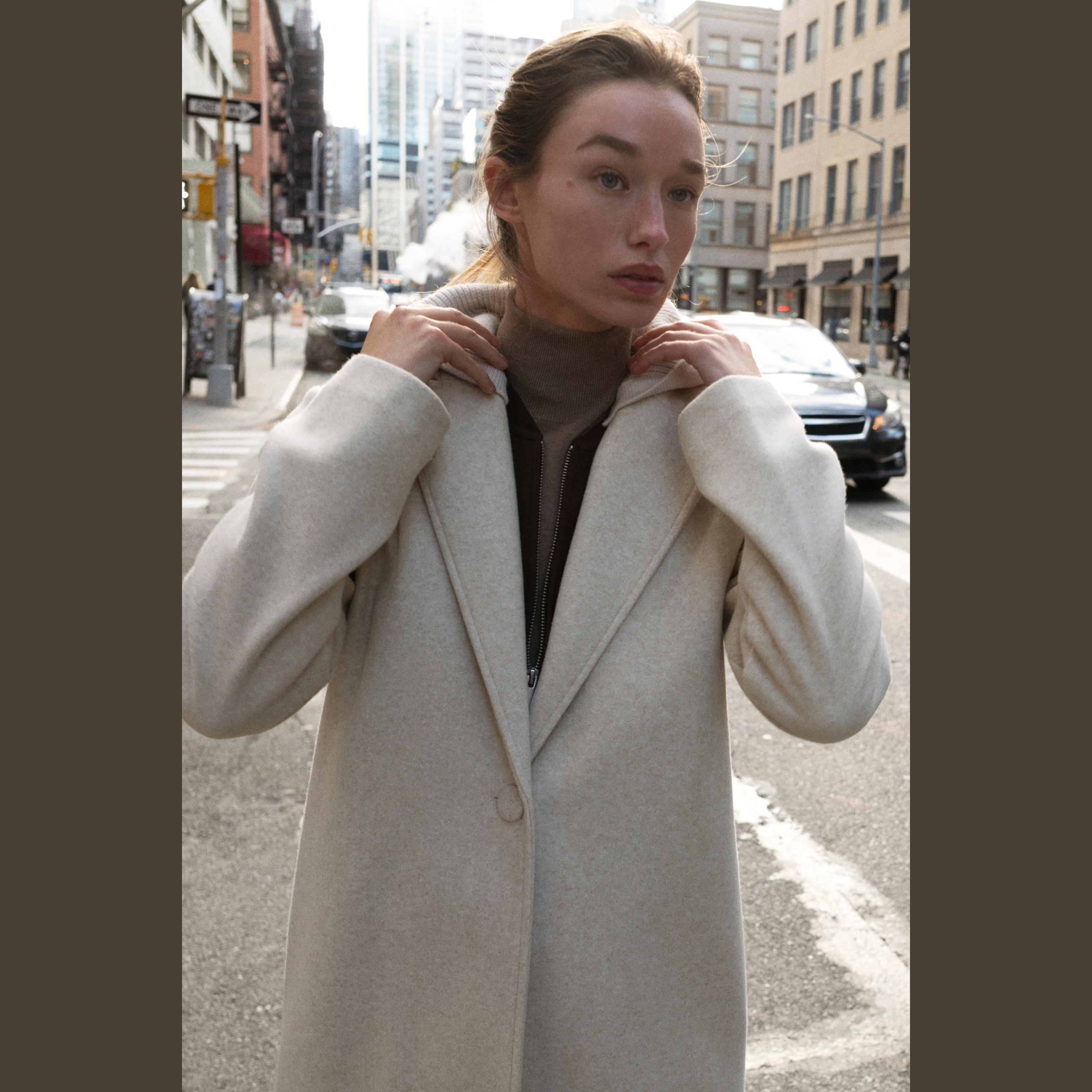 معطف أنيق بلون رملي فاتح حيادي، مصنوع من خامة صناعية ناعمة تمنح مظهرًا عمليًا وراحة في الارتداء. يتميز بياقة كلاسيكية مع غطاء رأس عملي، وأكمام طويلة، مع إغلاق أمامي مزدوج بالأزرار. تصميم مستقيم مع جيوب أمامية عملية، مثالي للإطلالات اليومية أو الرسمية في المواسم الباردة.