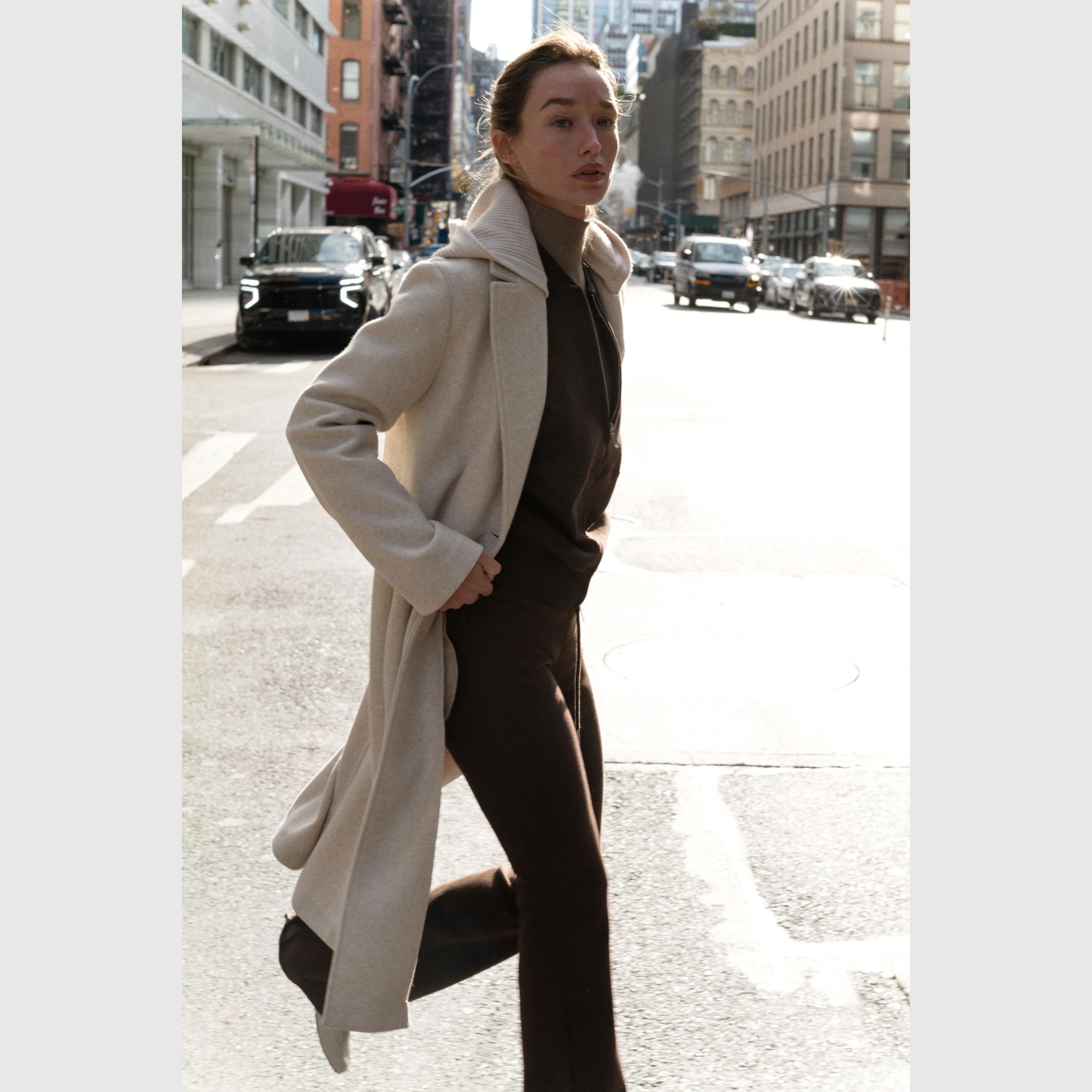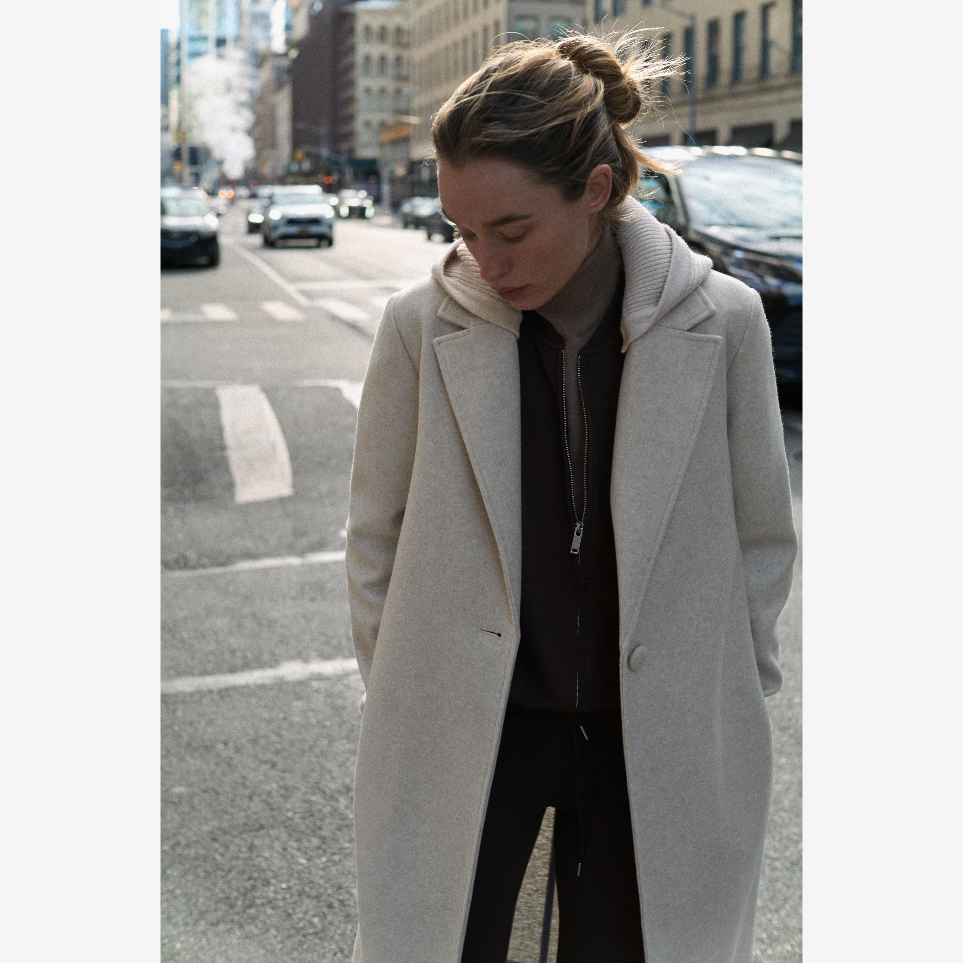 معطف نسائي – لون حيادي فاتح (رملي فاتح) – Light Sand، مع غطاء رأس (Soft Coat with Hood)