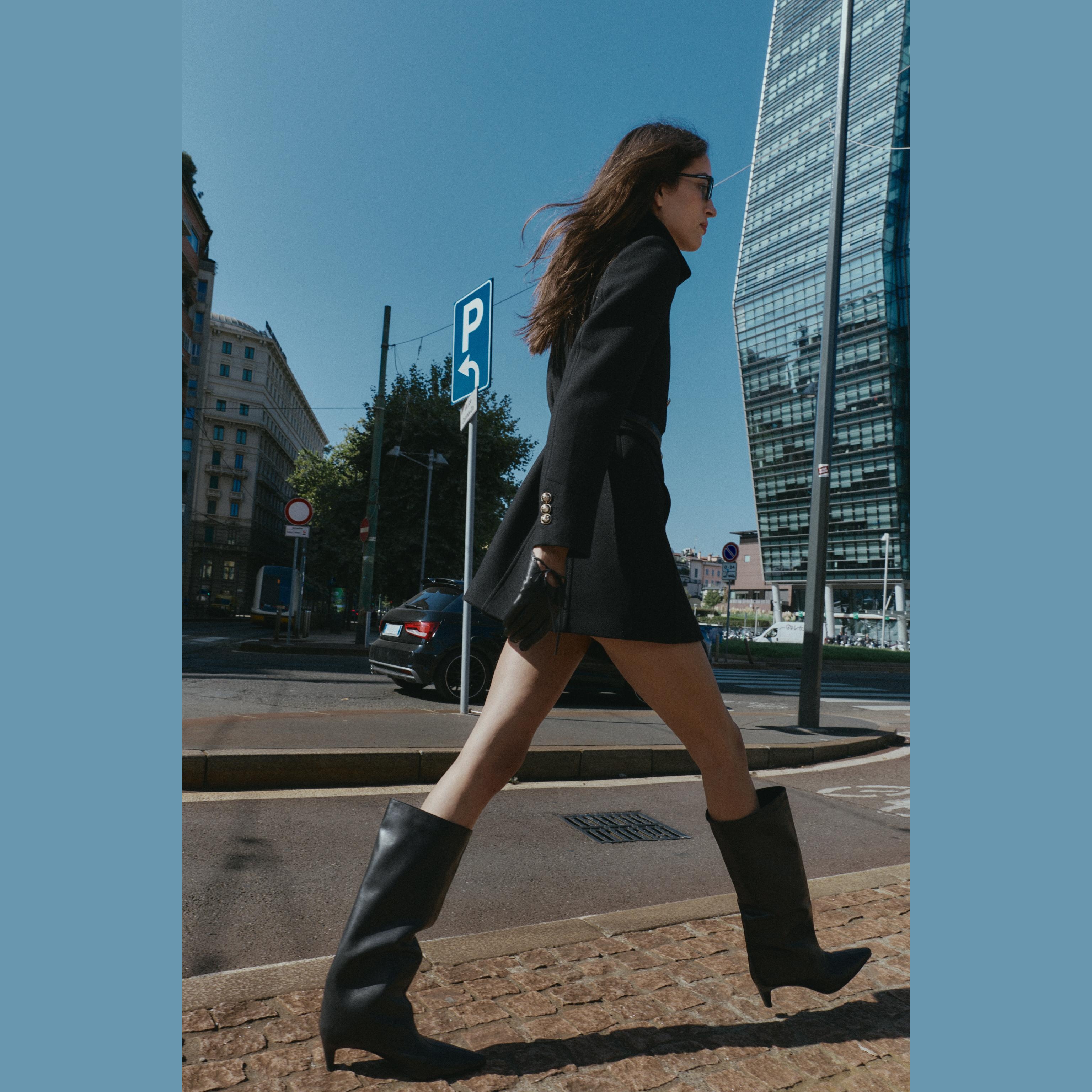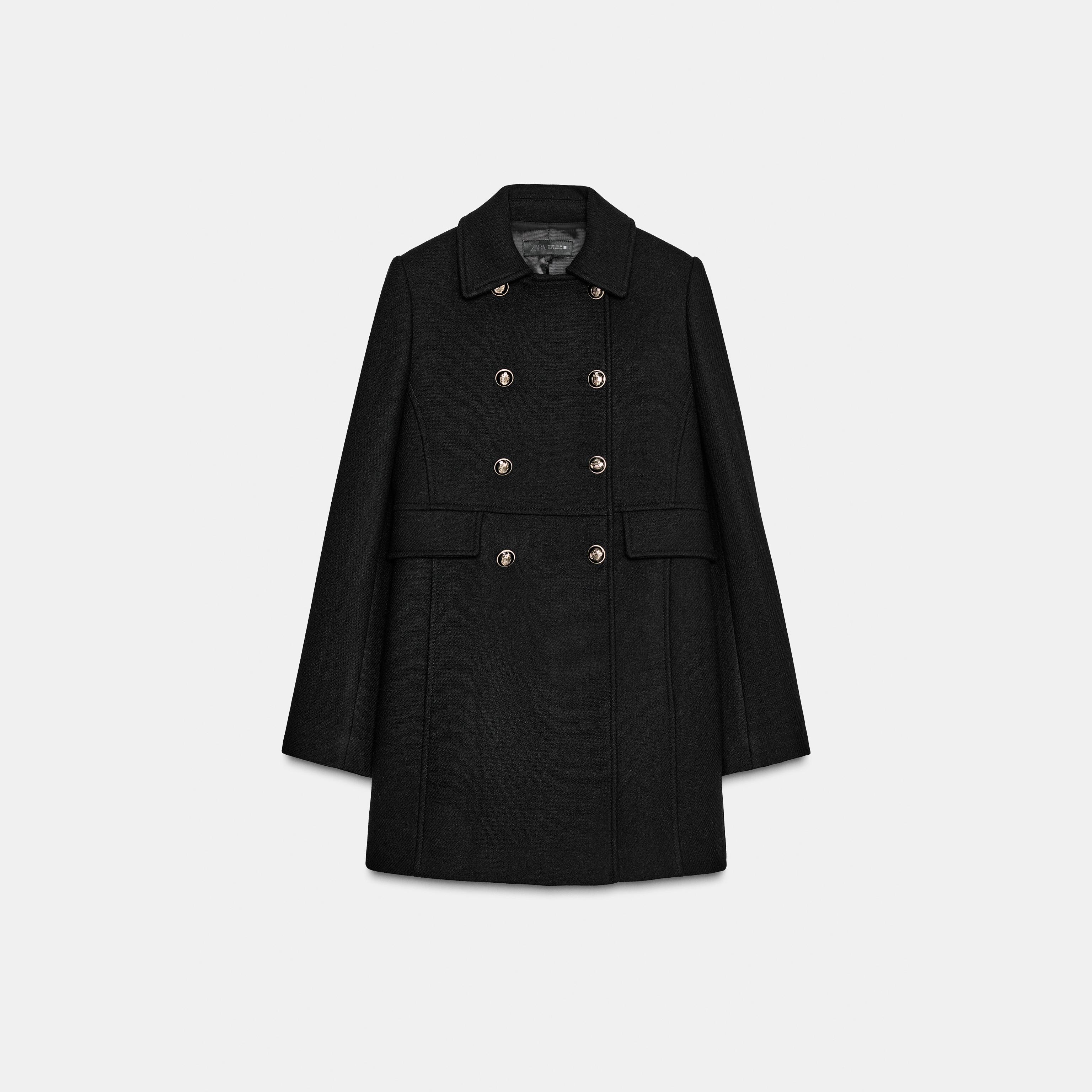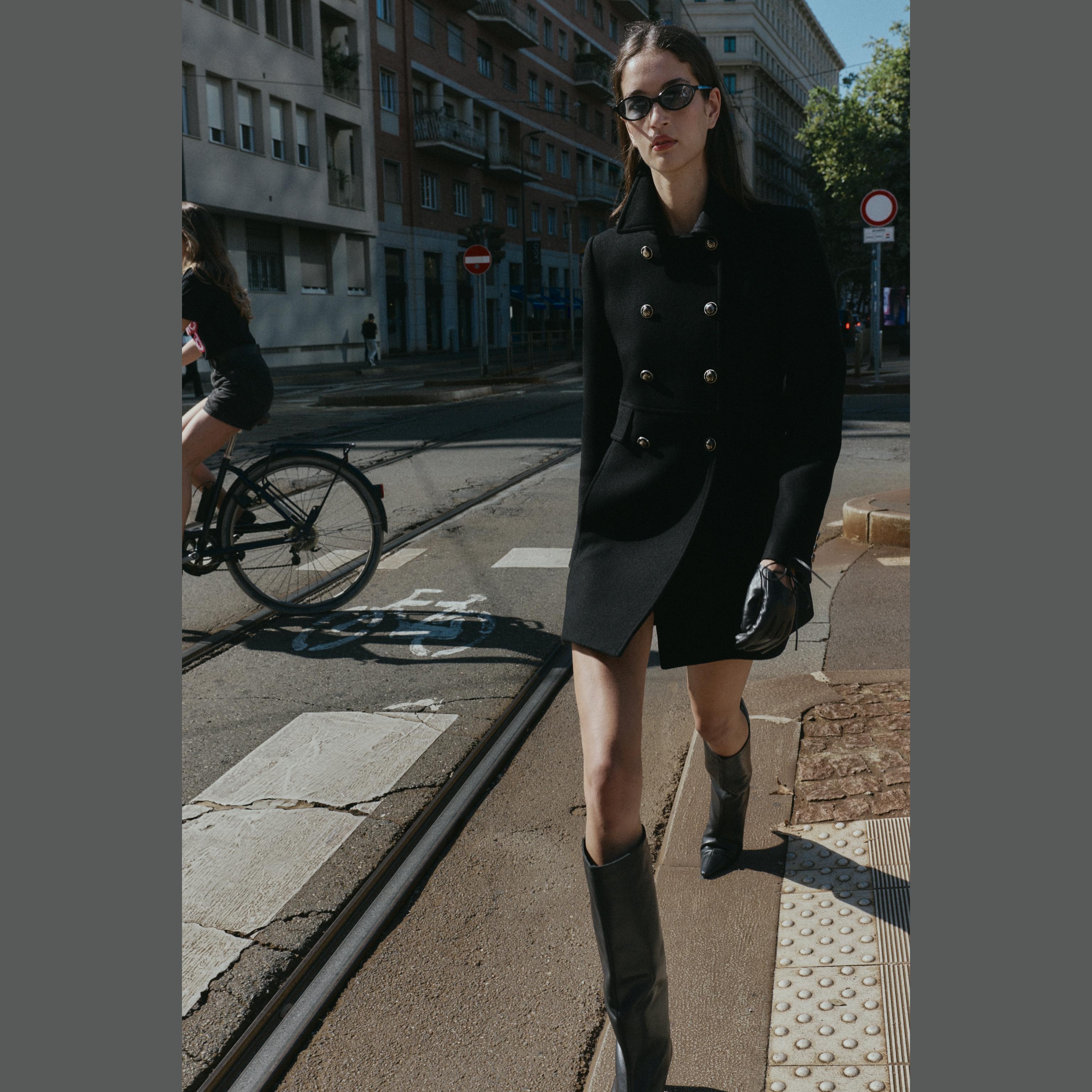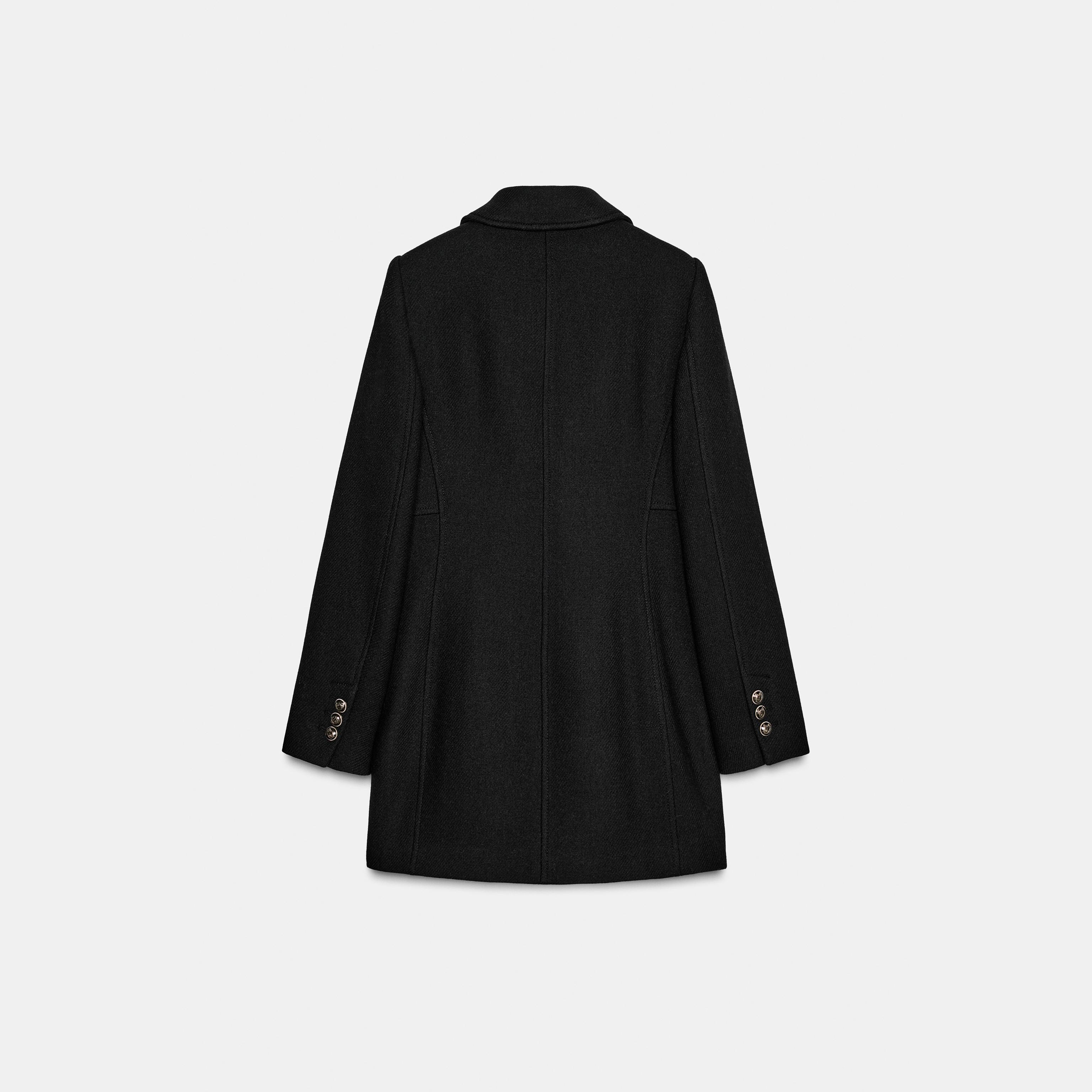 - التصميم: معطف قصير مزدوج الصدر من الصوف (Short Double-Breasted Wool Coat)