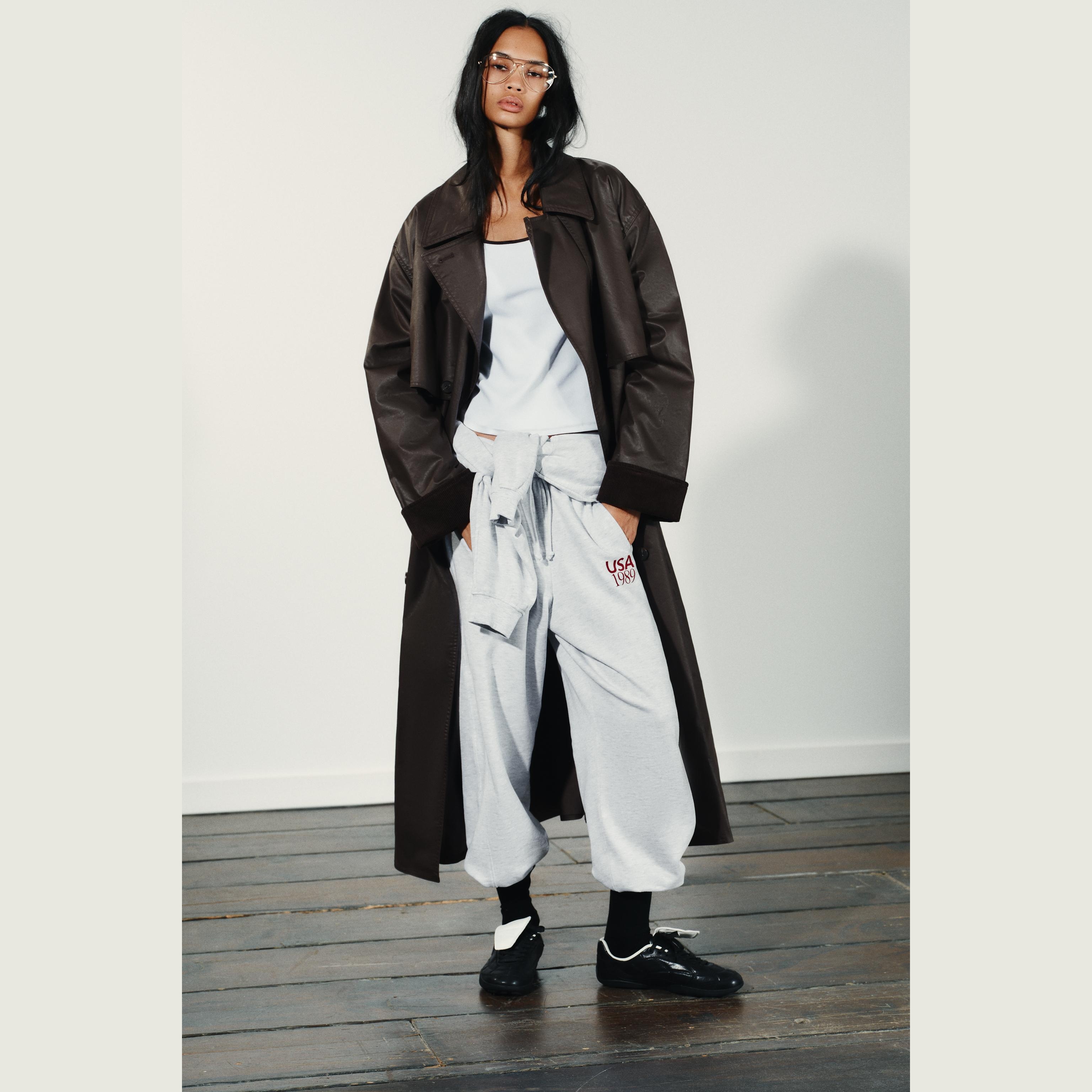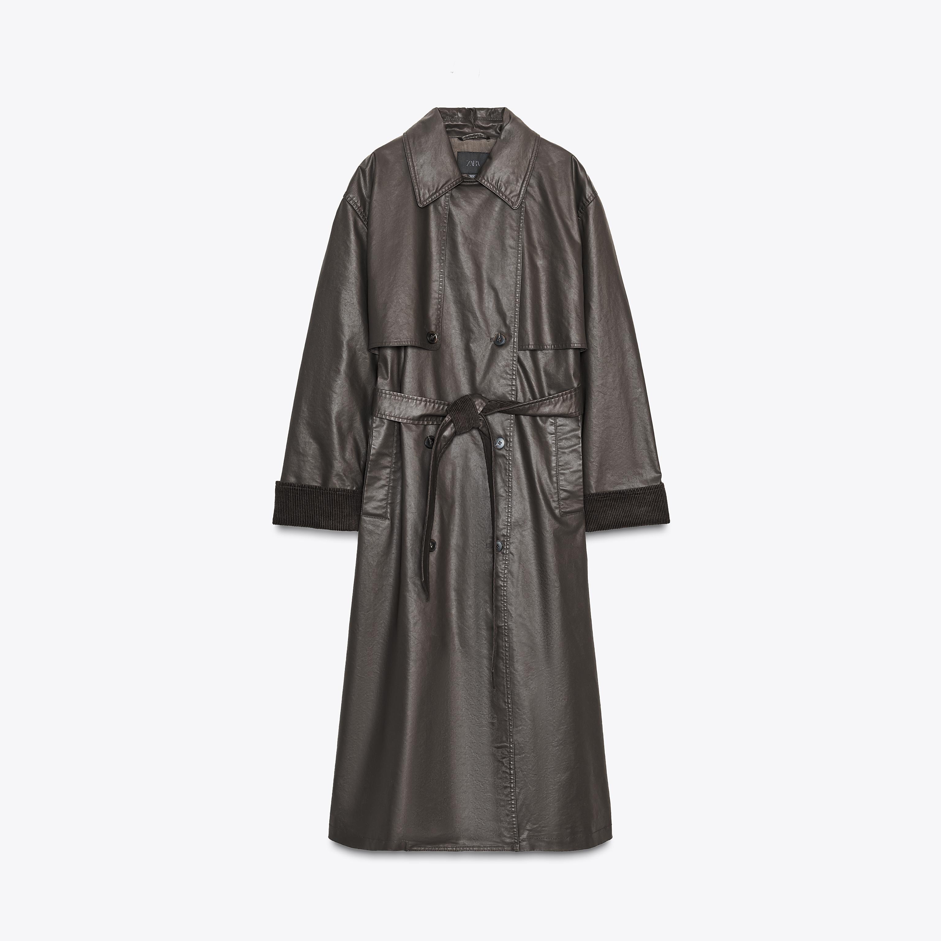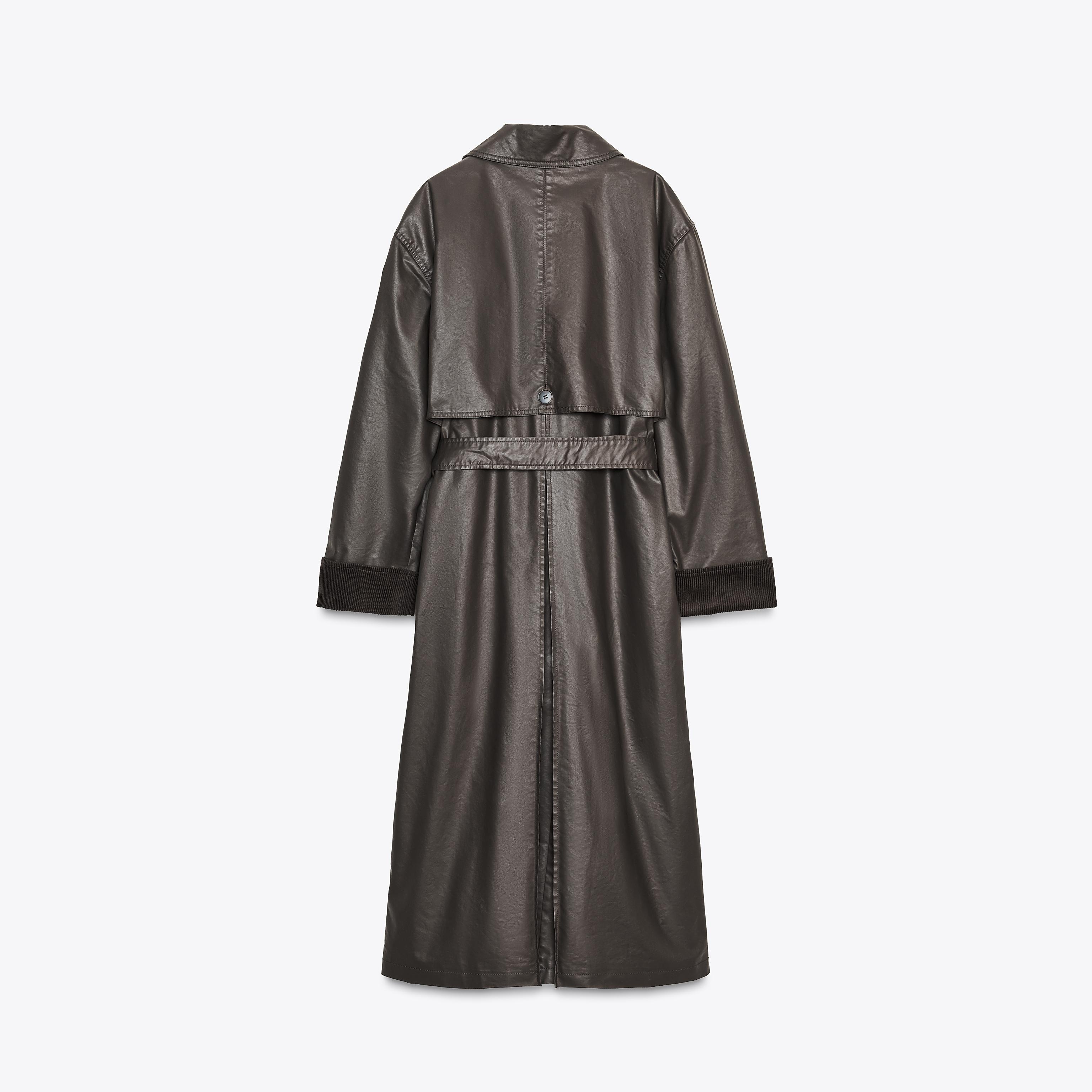 - التصميم: معطف طويل بلمسة شمعية مع تفاصيل كوردروي (Waxed Trench Coat with Corduroy Cuffs)