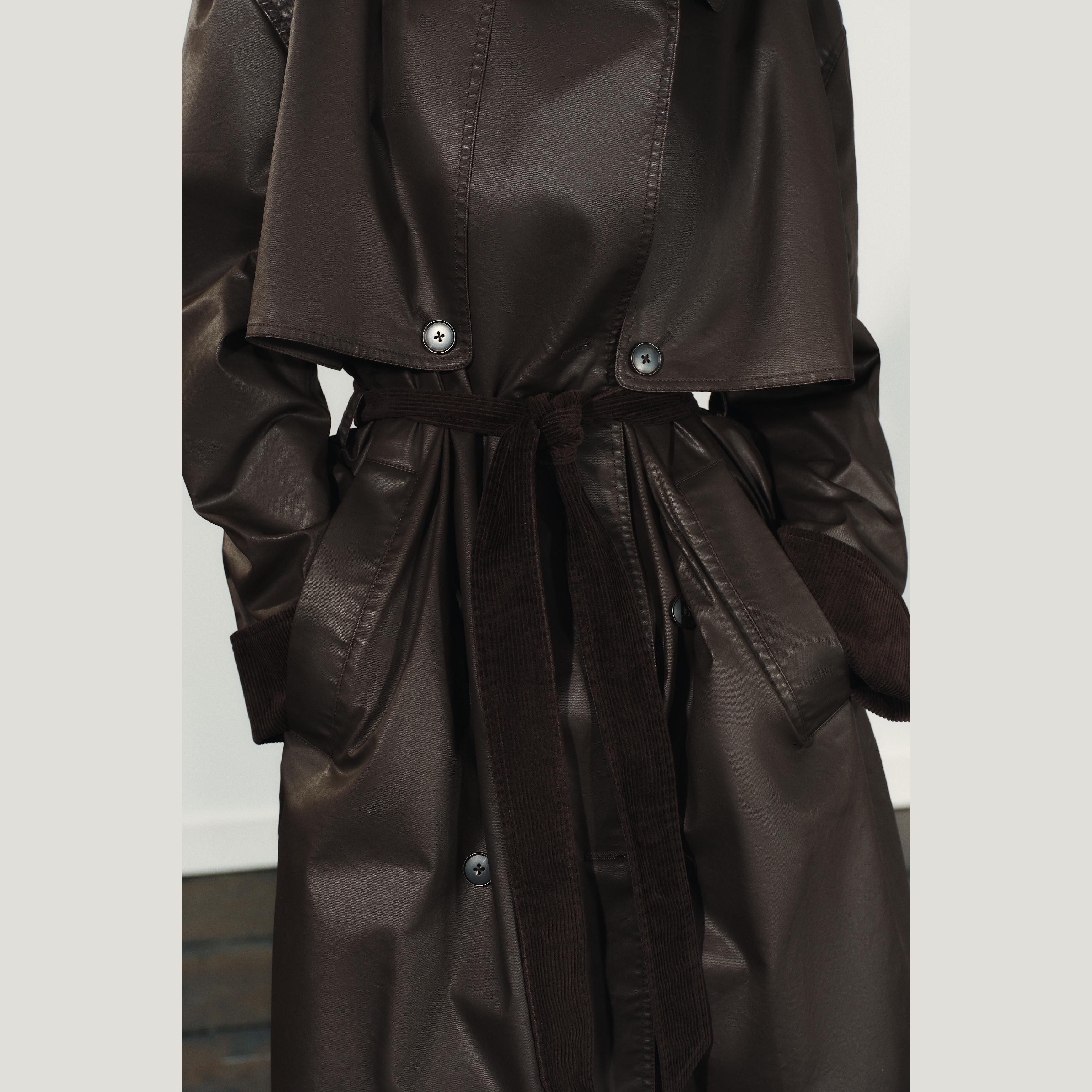 معطف نسائي طويل – لون غني (بني داكن) – Dark Brown، بتفاصيل كوردروي (Waxed Trench Coat with Corduroy Cuffs)