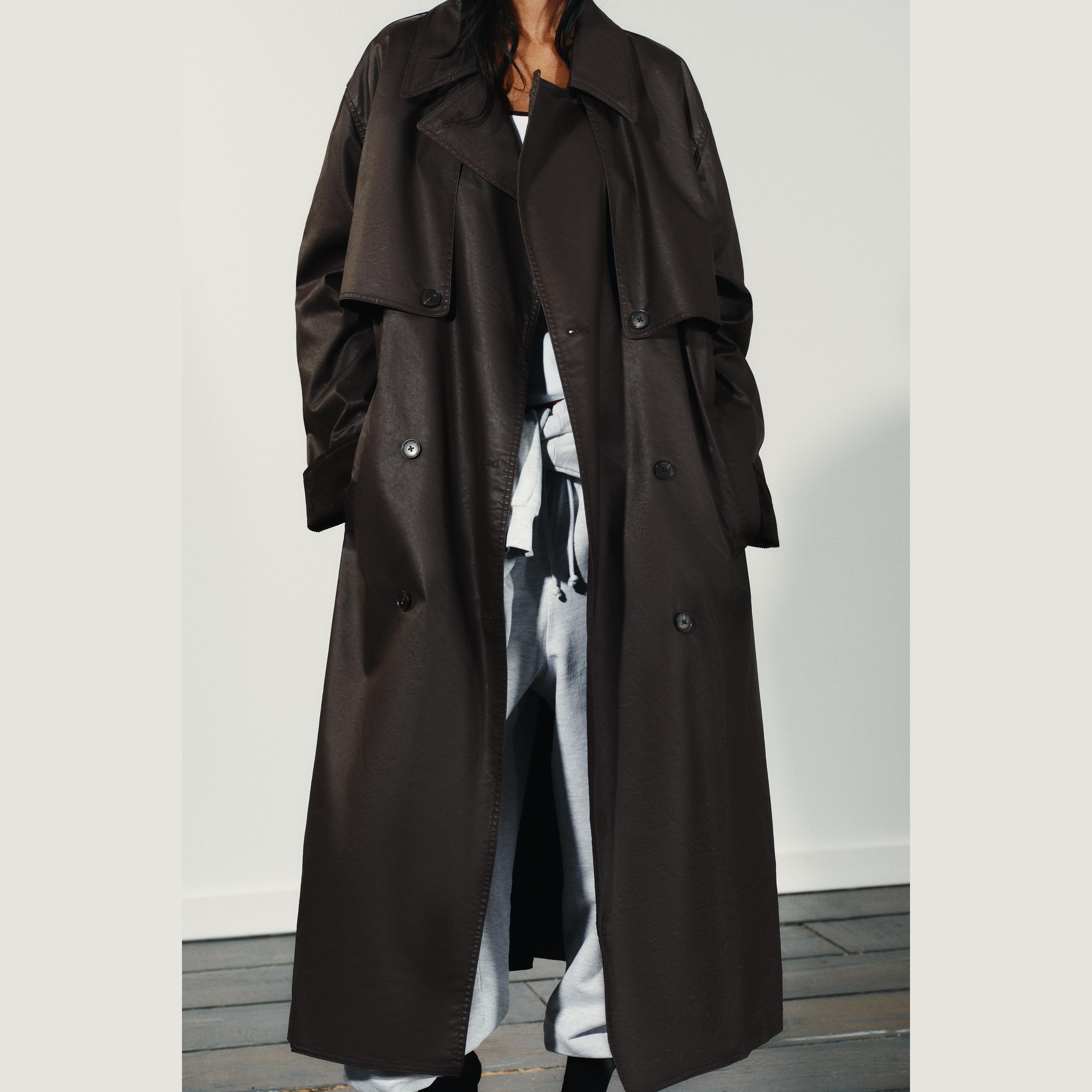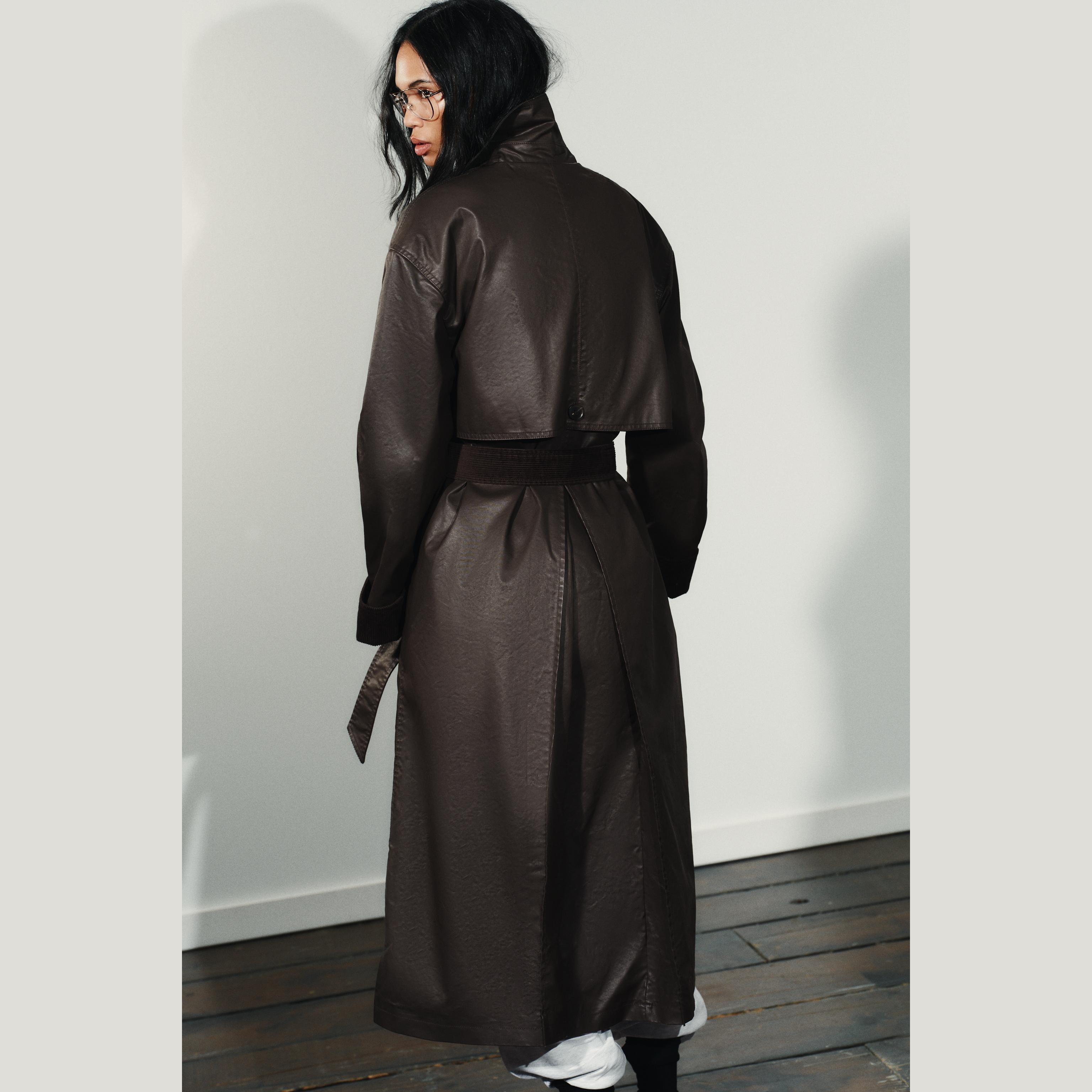 معطف طويل أنيق بلون بني داكن غني، مصنوع من خامة ممزوجة بلمسة شمعية تمنح مظهرًا عصريًا وعمليًا. يتميز بياقة لابيل كلاسيكية وأكمام طويلة مع أساور كوردروي قابلة للطي، وحزام كوردروي بنفس القماش لإبراز الخصر، مع جيوب جانبية عملية وإغلاق أمامي مزدوج بالأزرار. تصميم مثالي للإطلالات اليومية والعملية في المواسم الانتقالية والباردة.