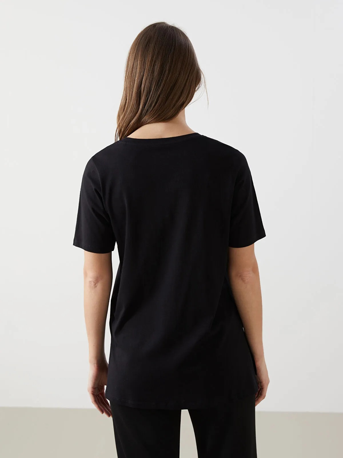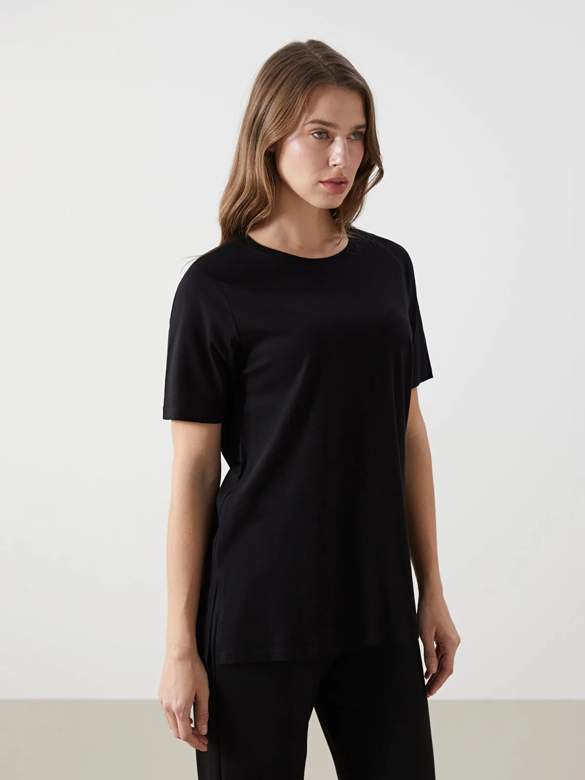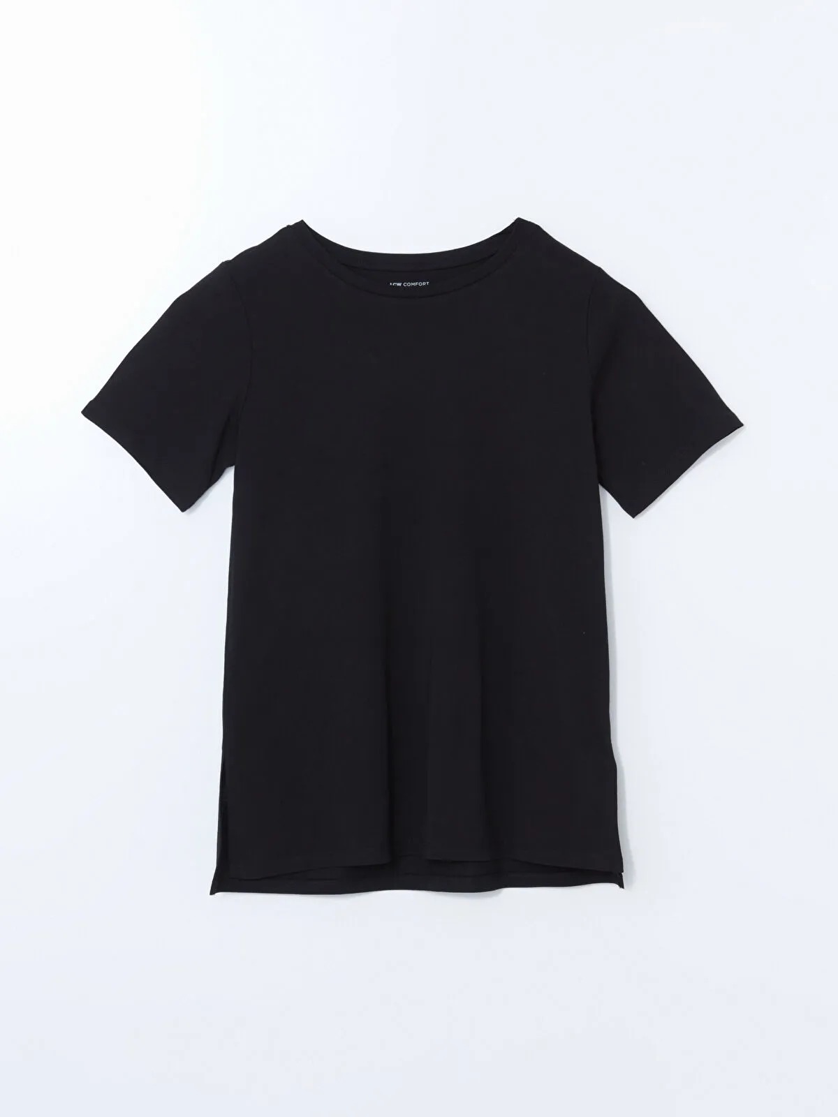 تيشيرت نسائي بياقة دائرية قصيرة وأكمام قصيرة، بتصميم بسيط وأنيق يعطي مظهرًا راقياً وهادئاً يليق بالإطلالة الكاجوال اليومية.