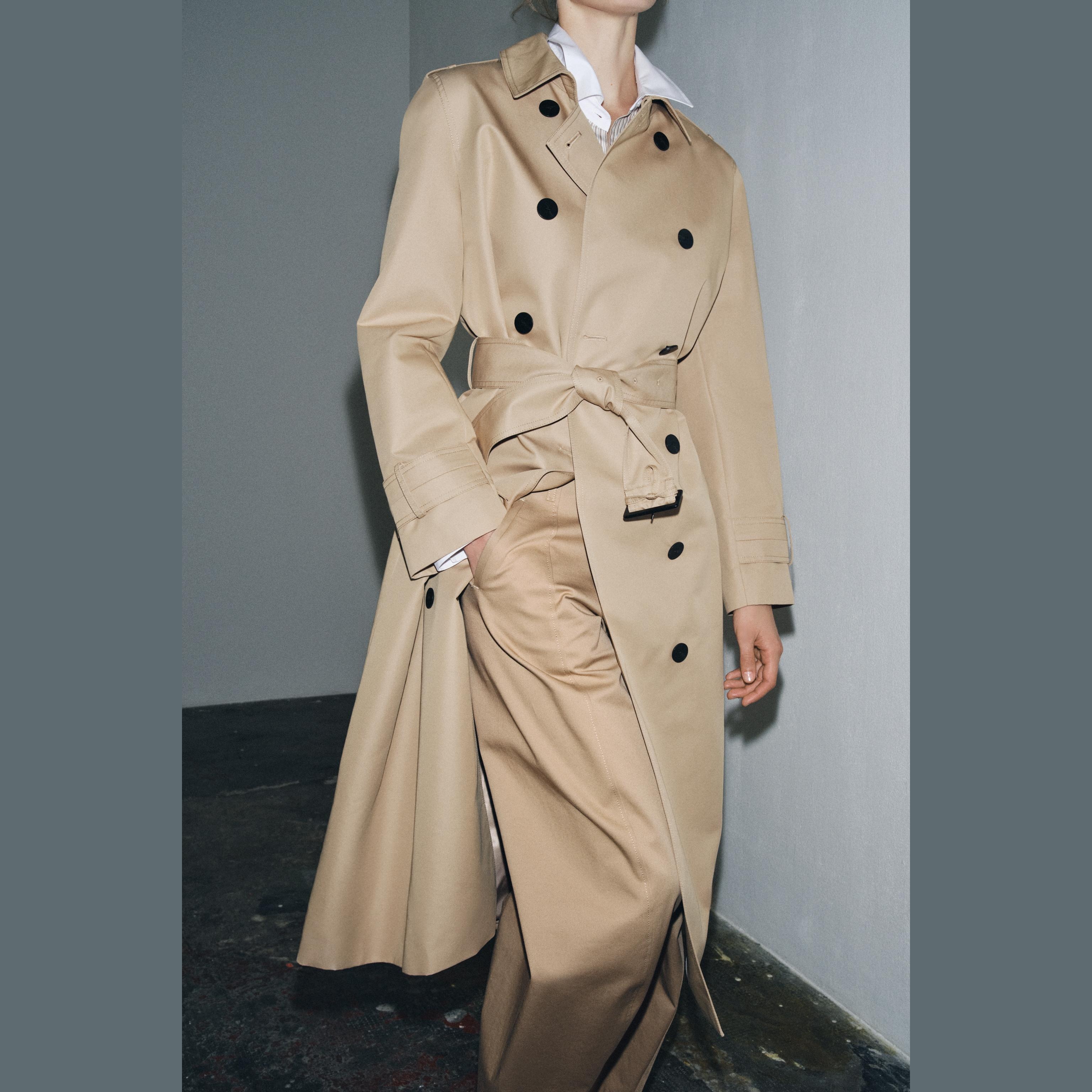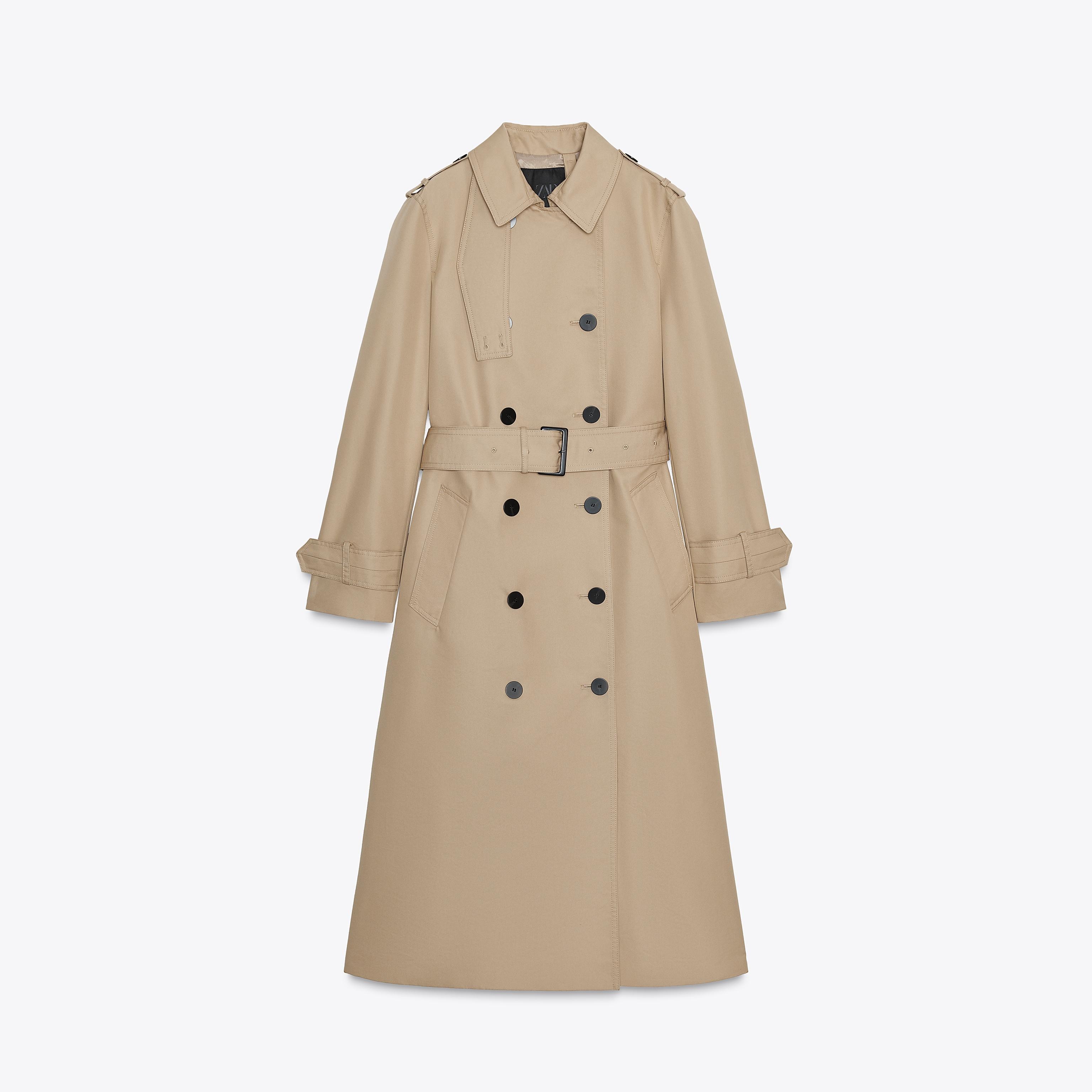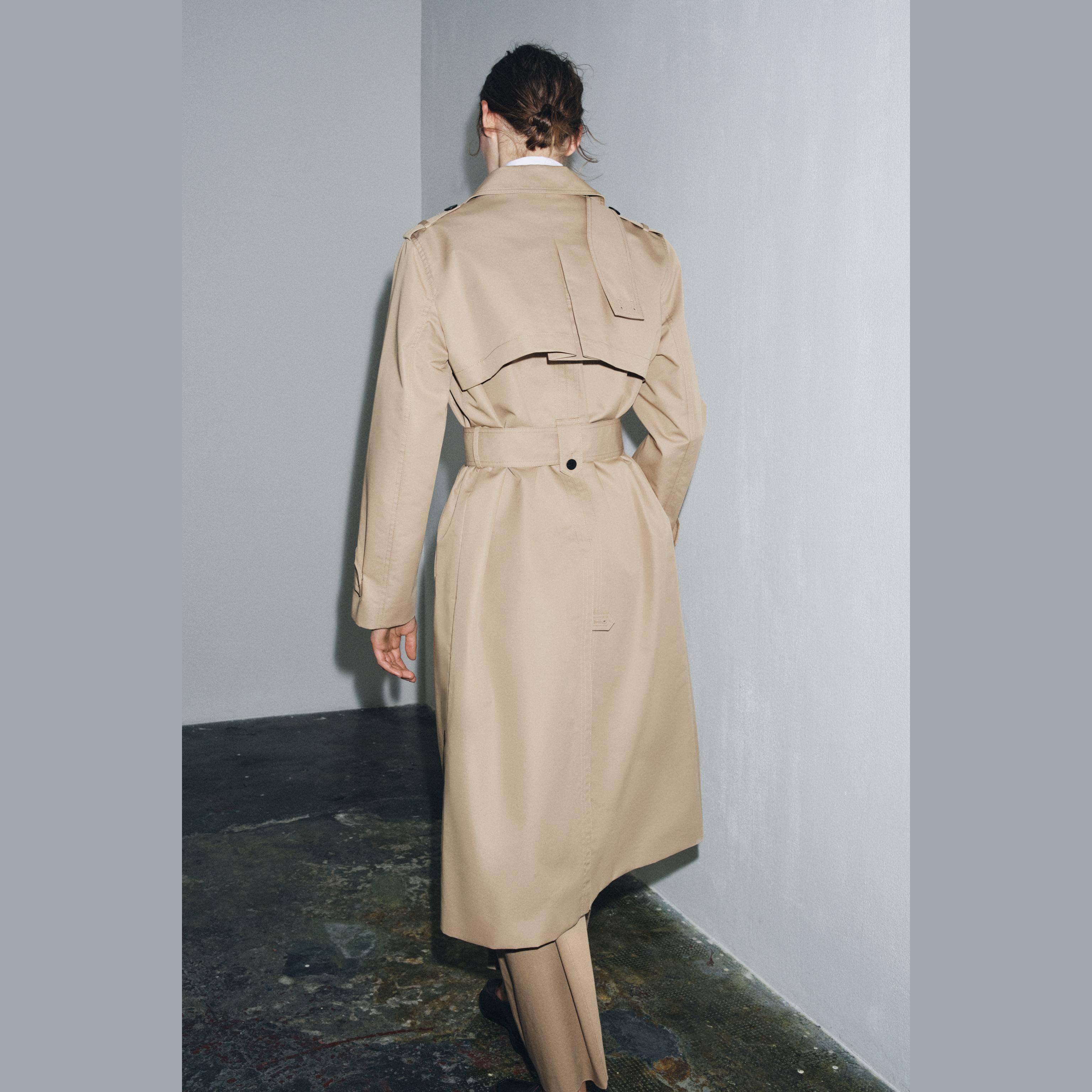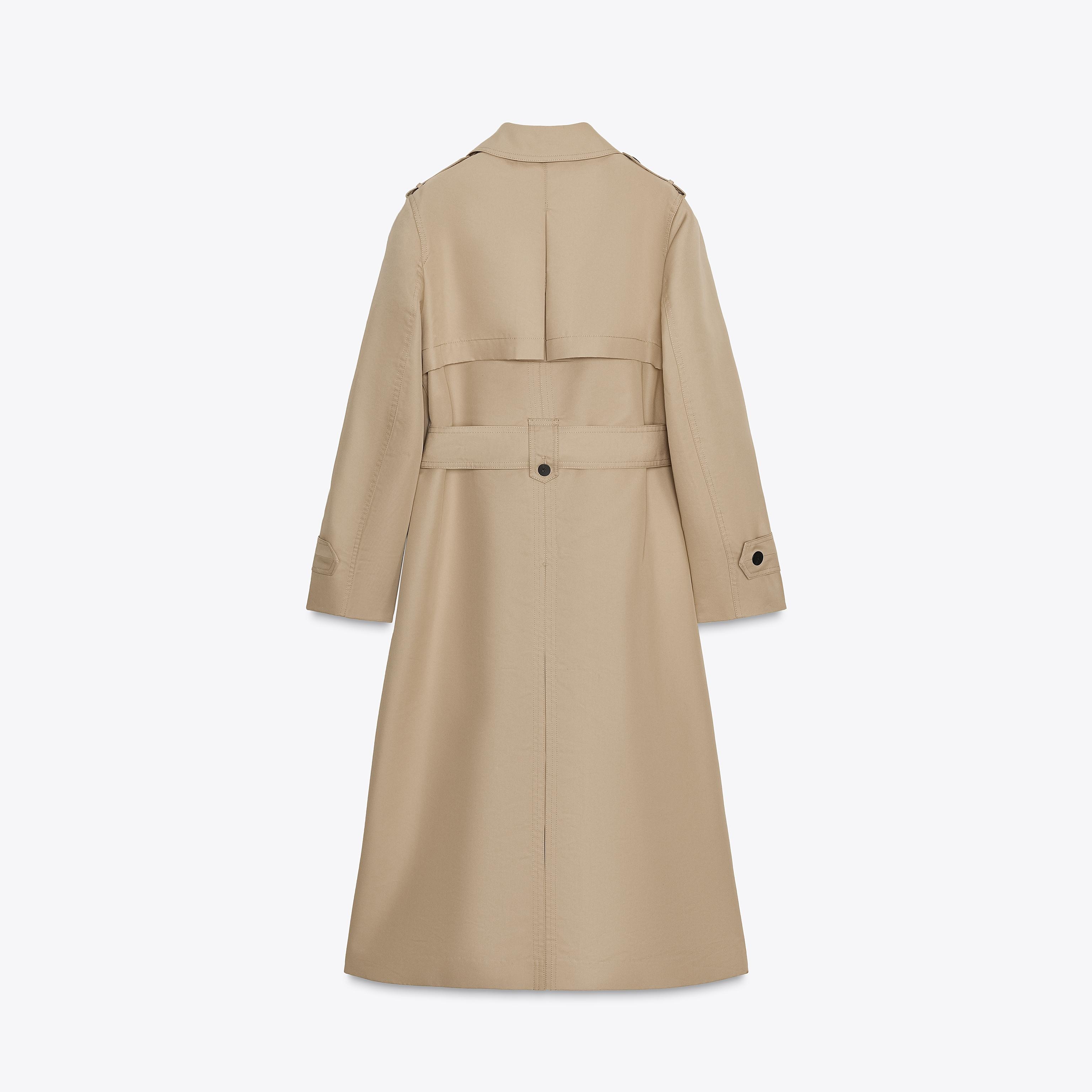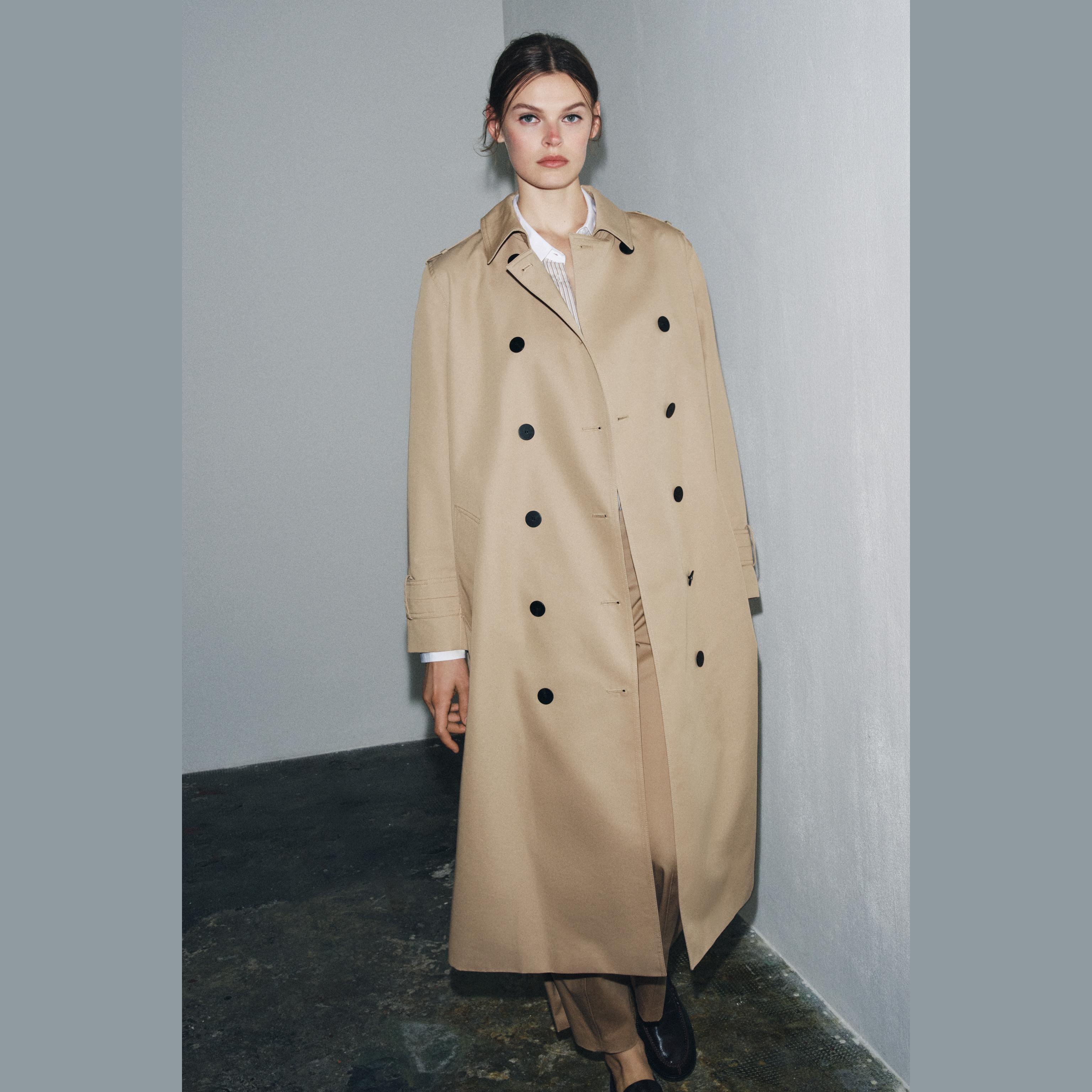 - التصميم: معطف طويل مزدوج الصدر مقاوم للماء (Water-Repellent Double-Breasted Trench Coat – ZW Collection)