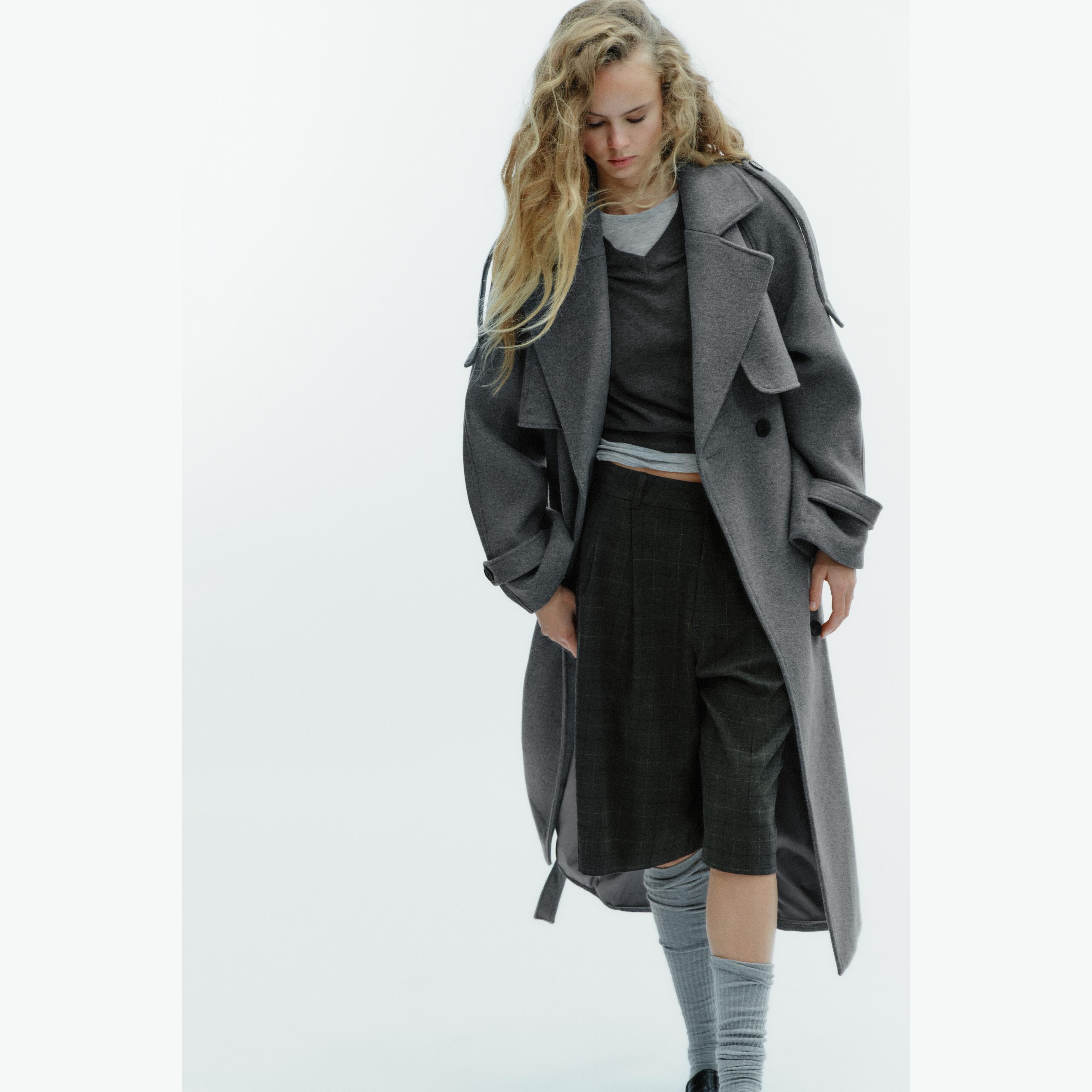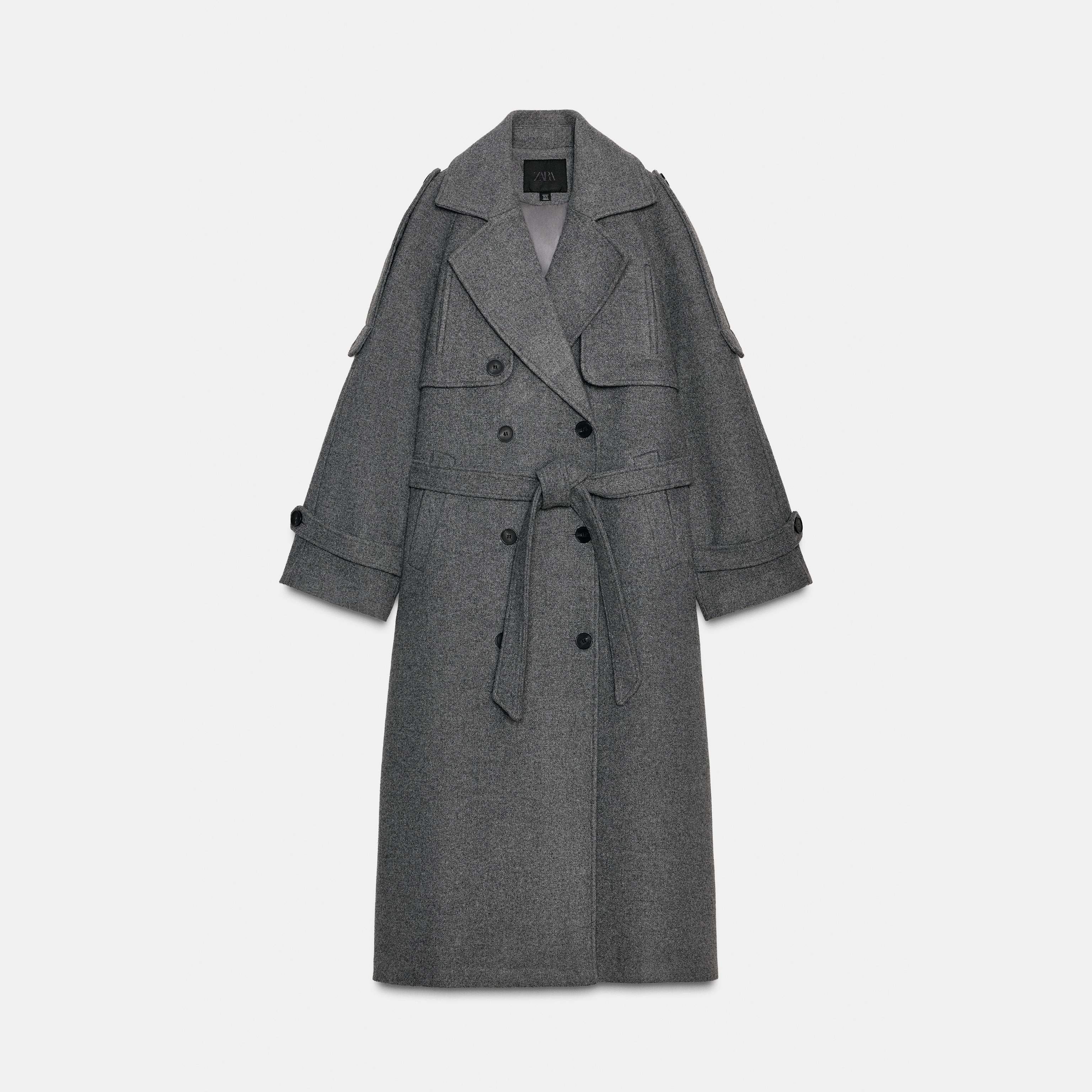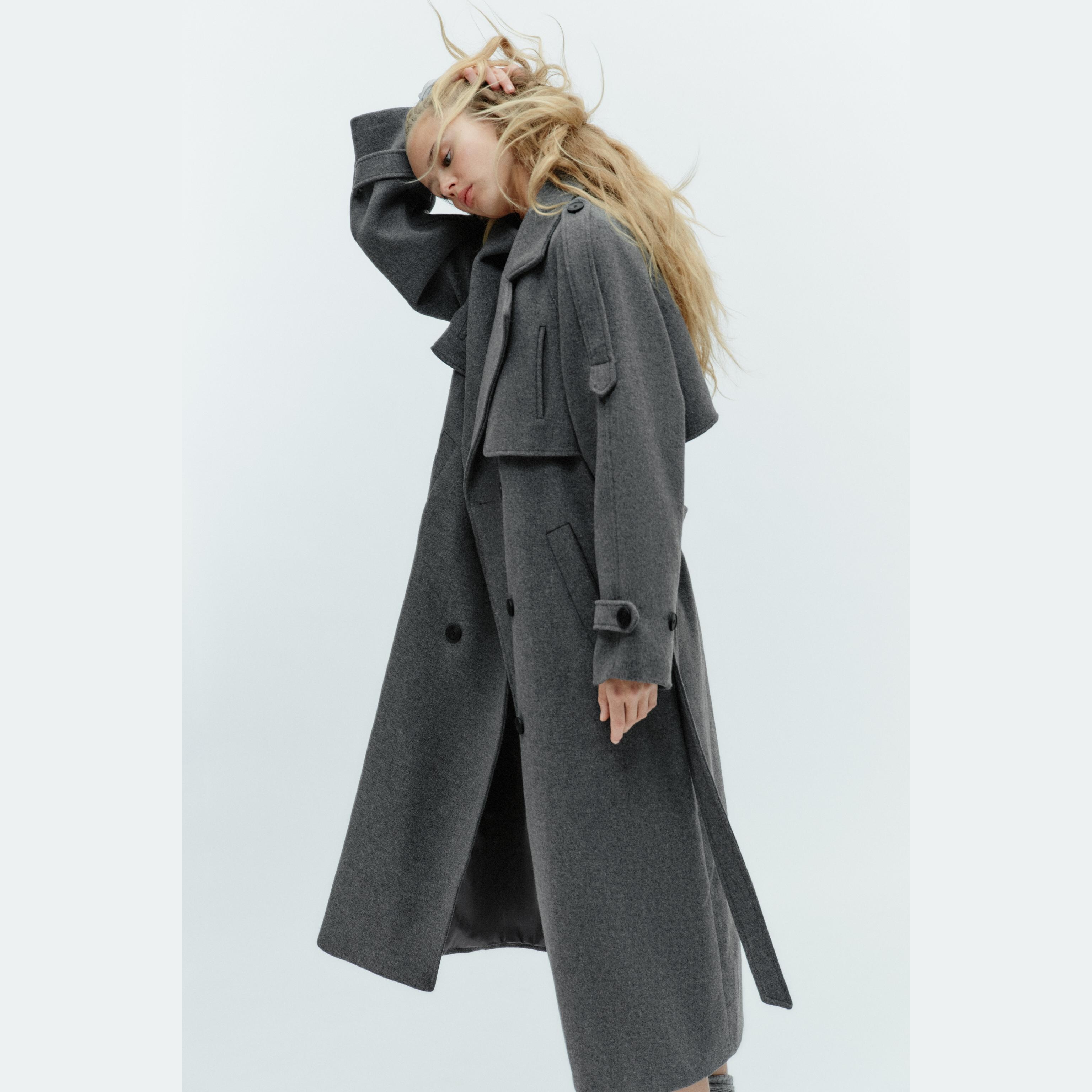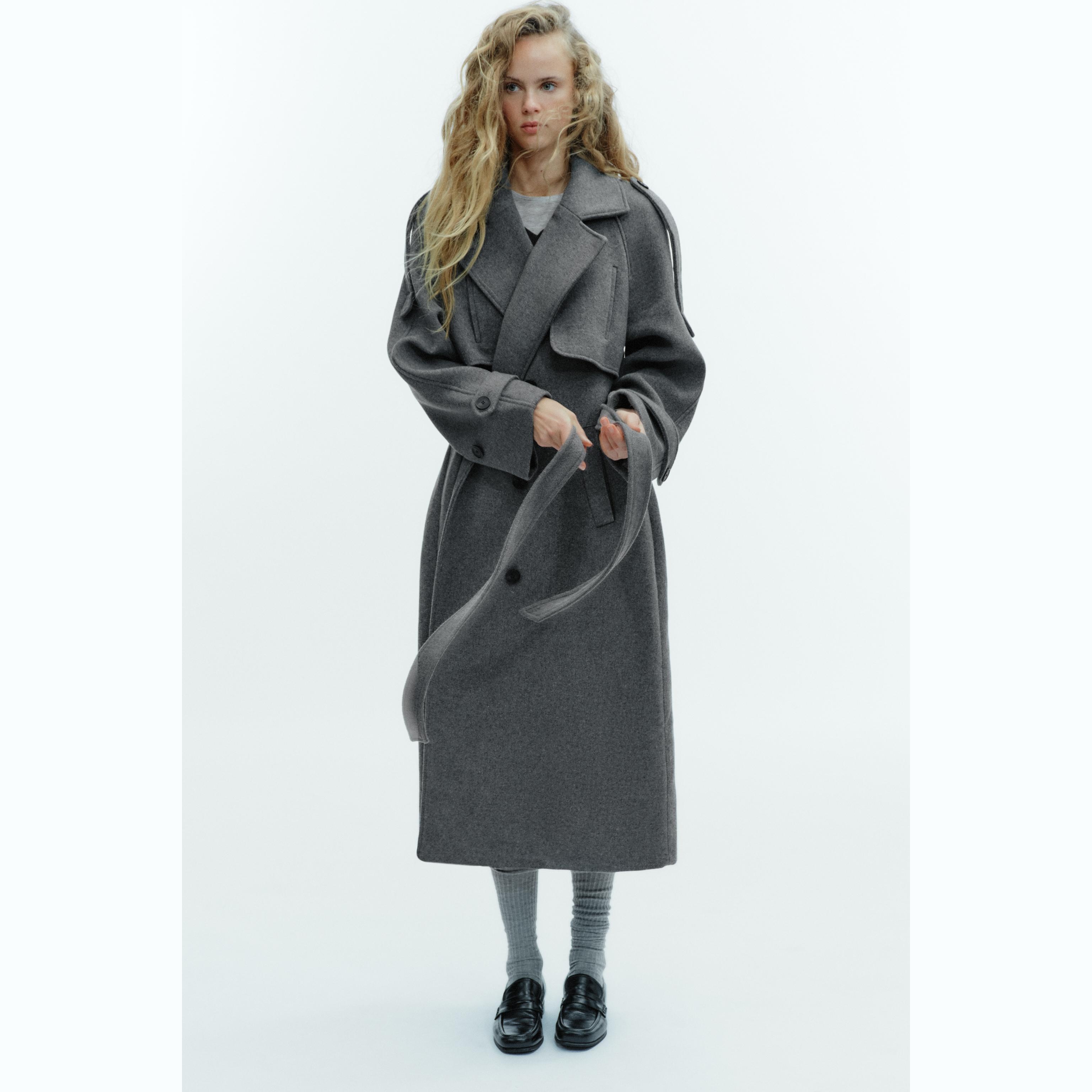 معطف طويل أنيق بلون رمادي مارل حيادي، مصنوع من خامة ممزوجة تمنح مظهرًا فاخرًا وراحة في الارتداء. يتميز بياقة نوتش كلاسيكية وأكمام طويلة مع حلقات جانبية، مع جيوب أمامية عملية، وإغلاق أمامي مزدوج بالأزرار، بالإضافة إلى حزام بنفس القماش لإبراز الخصر. تصميم مثالي للإطلالات الرسمية أو العملية في المواسم الباردة.