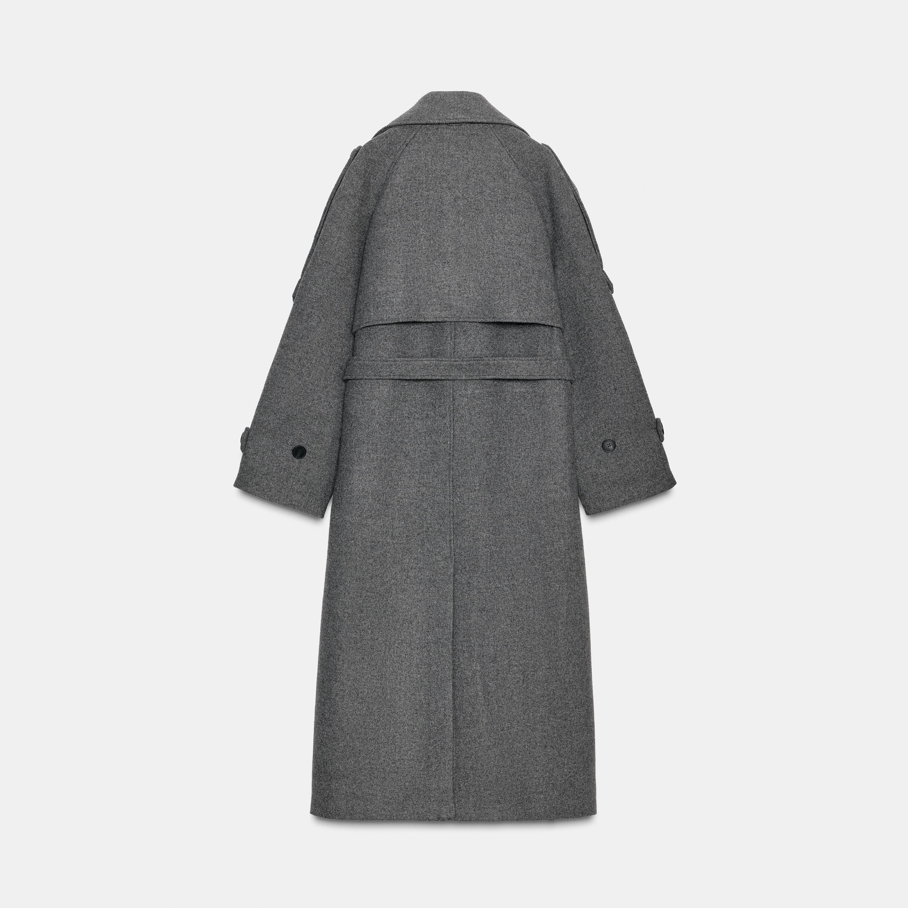- التصميم: معطف طويل مزدوج الصدر مع حزام (Double-Breasted Coat with Belt Loops)