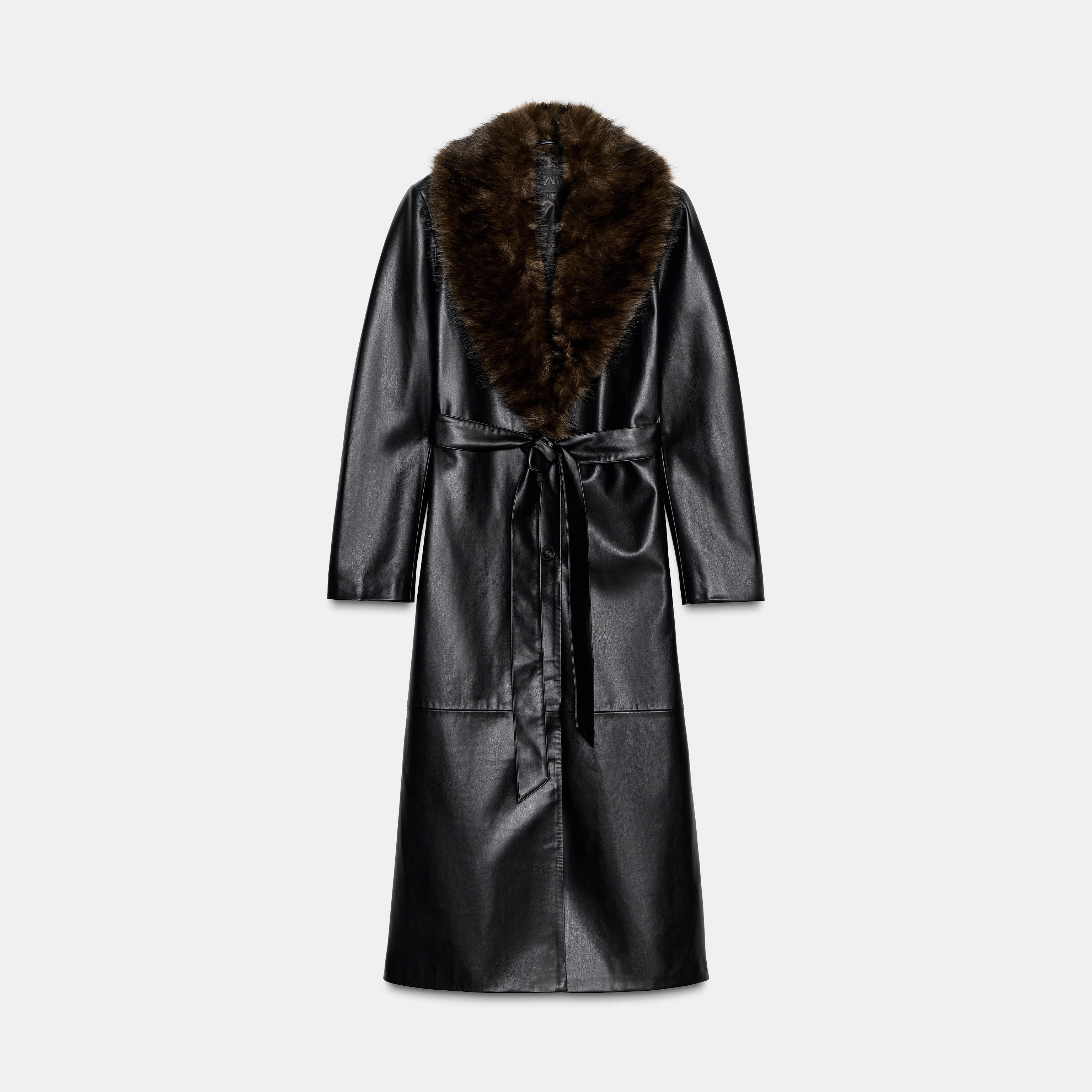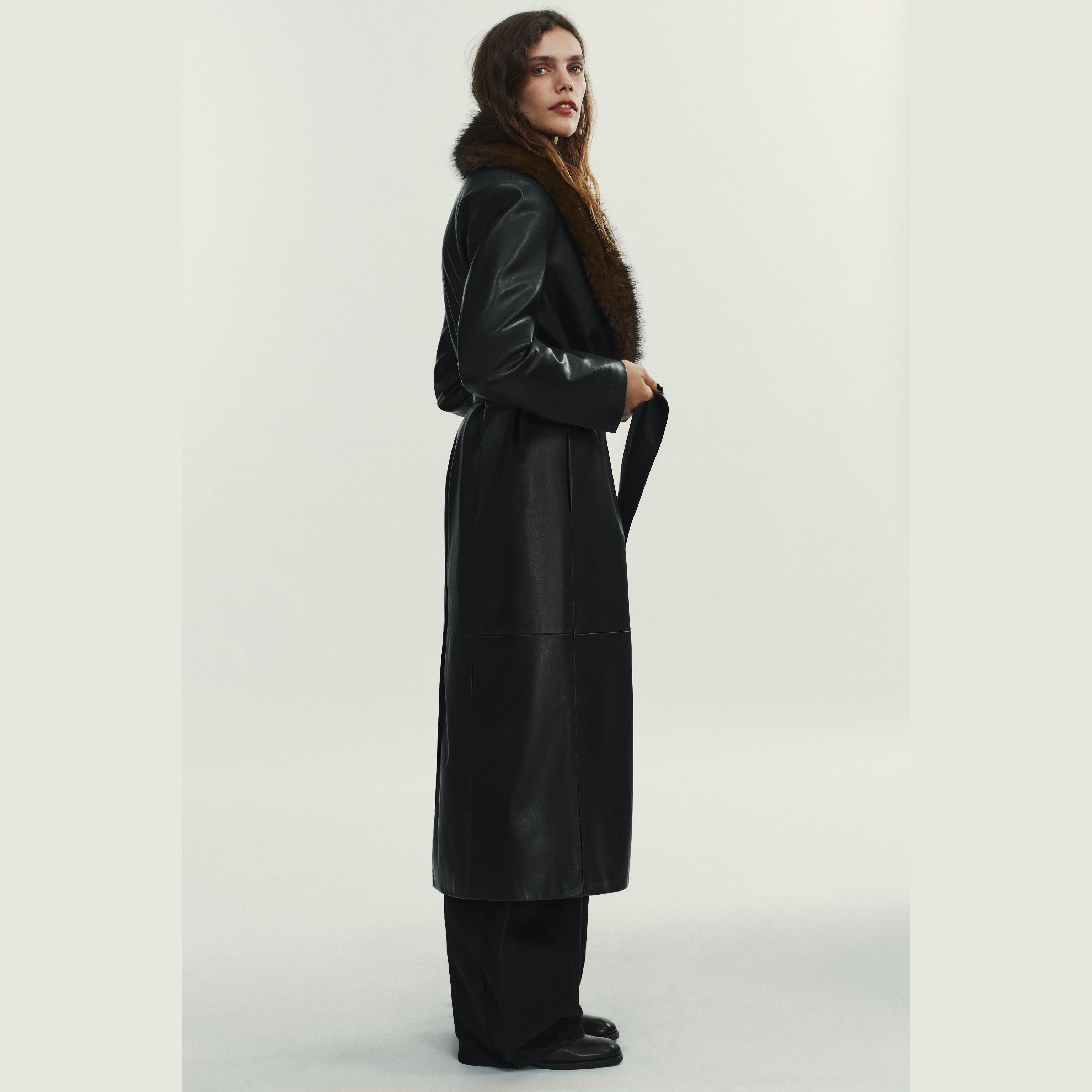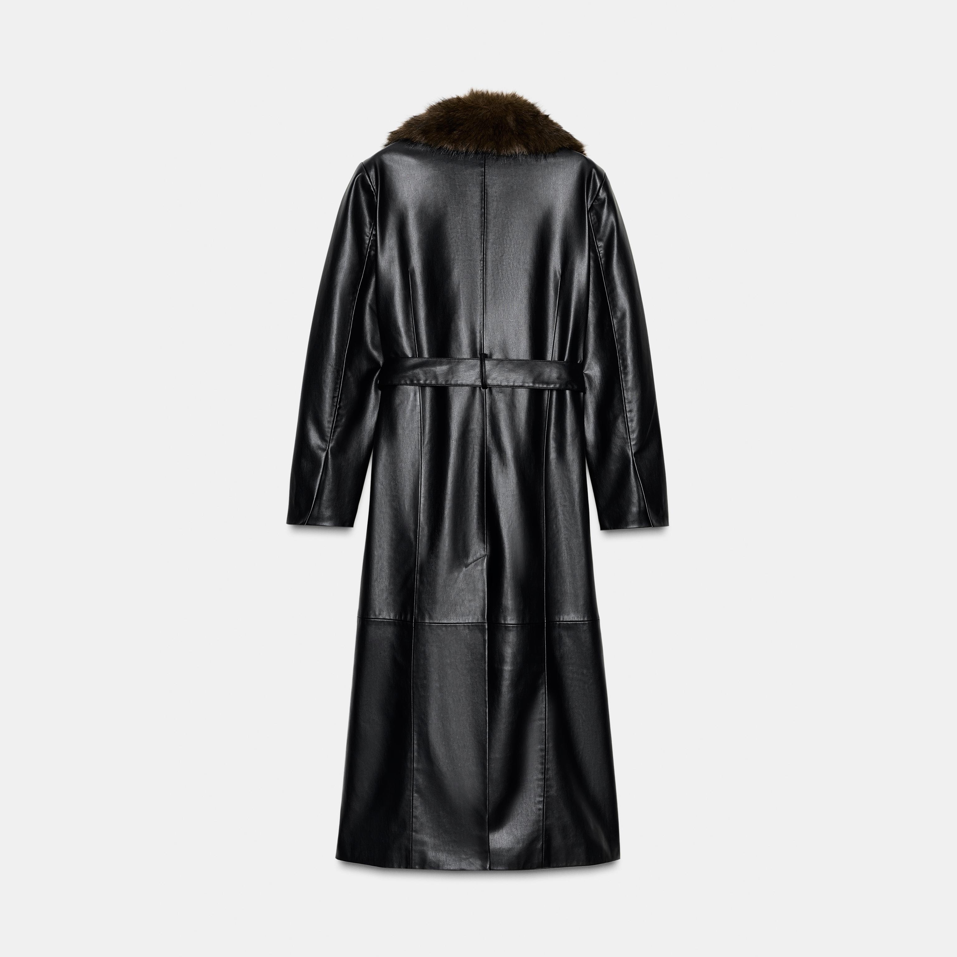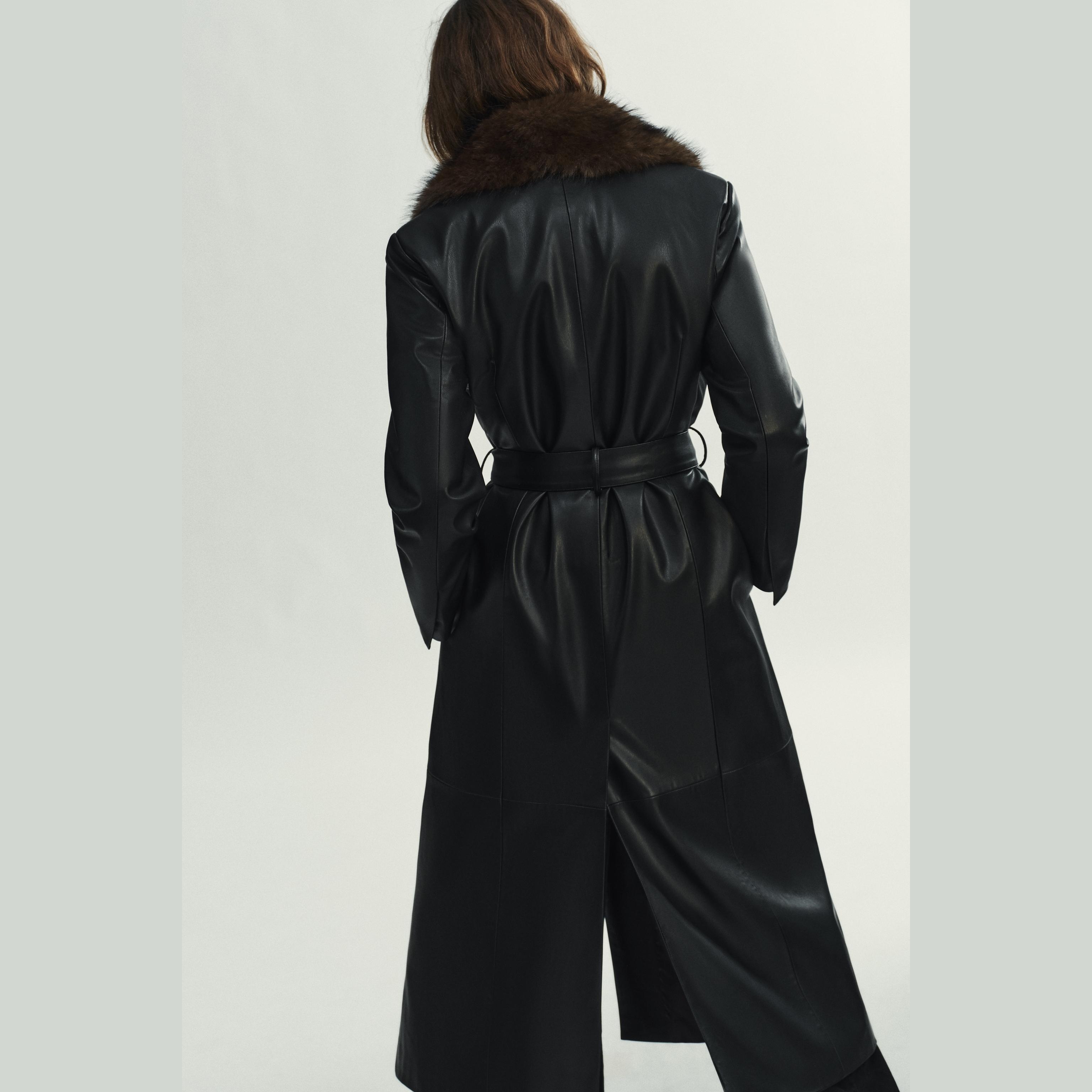 - التصميم: معطف طويل من الجلد الصناعي مع ياقة قابلة للفك (Faux Leather Coat with Detachable Collar)
