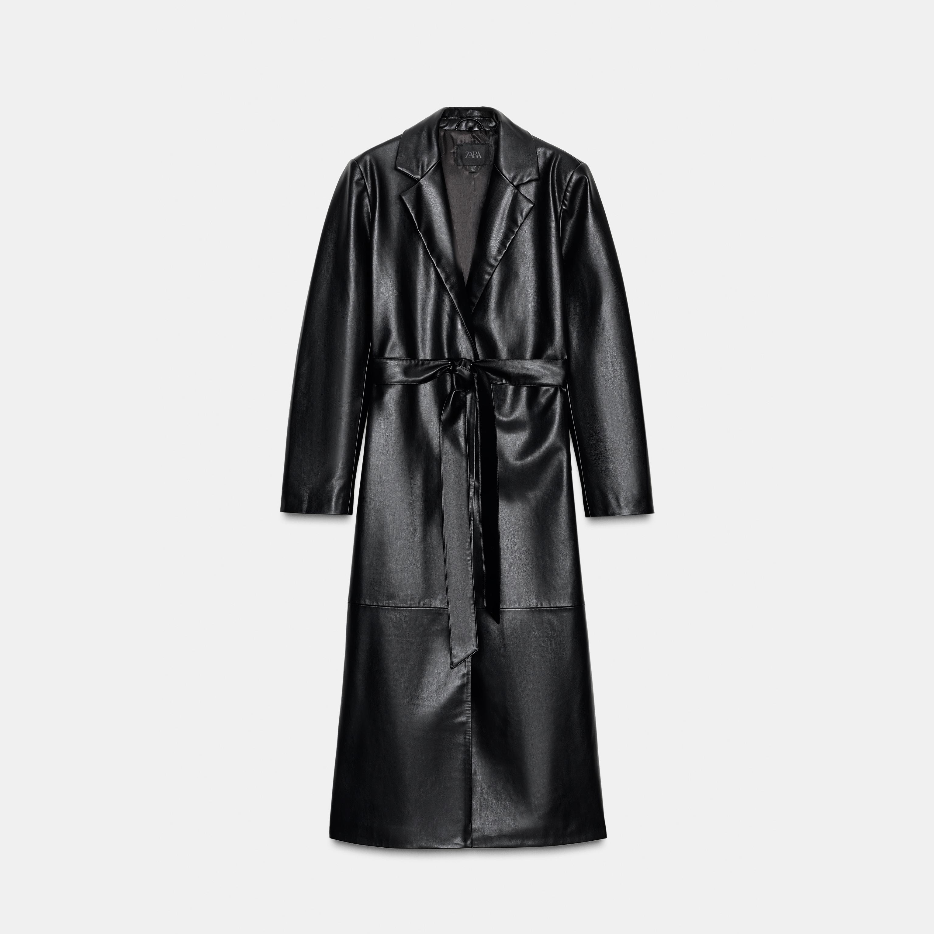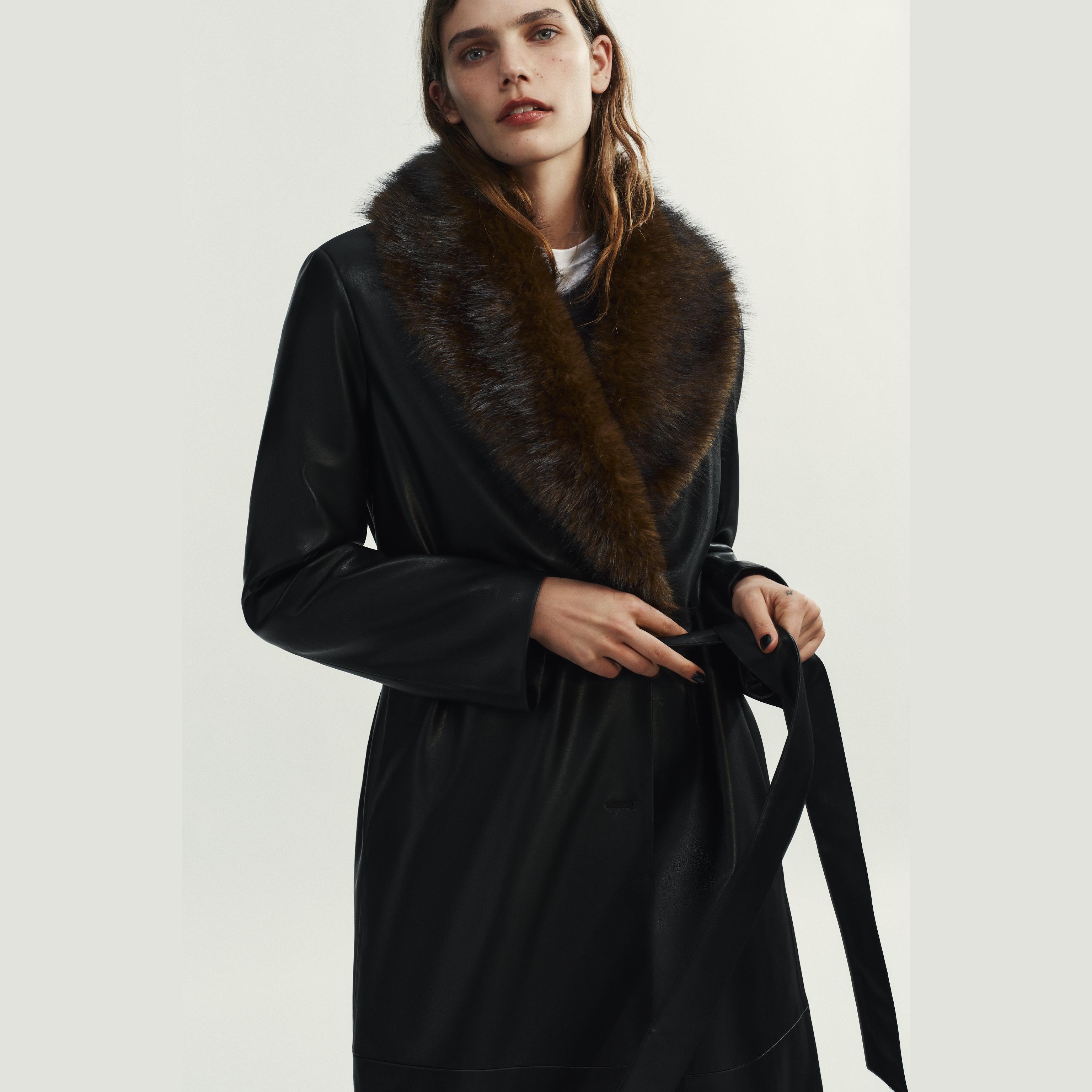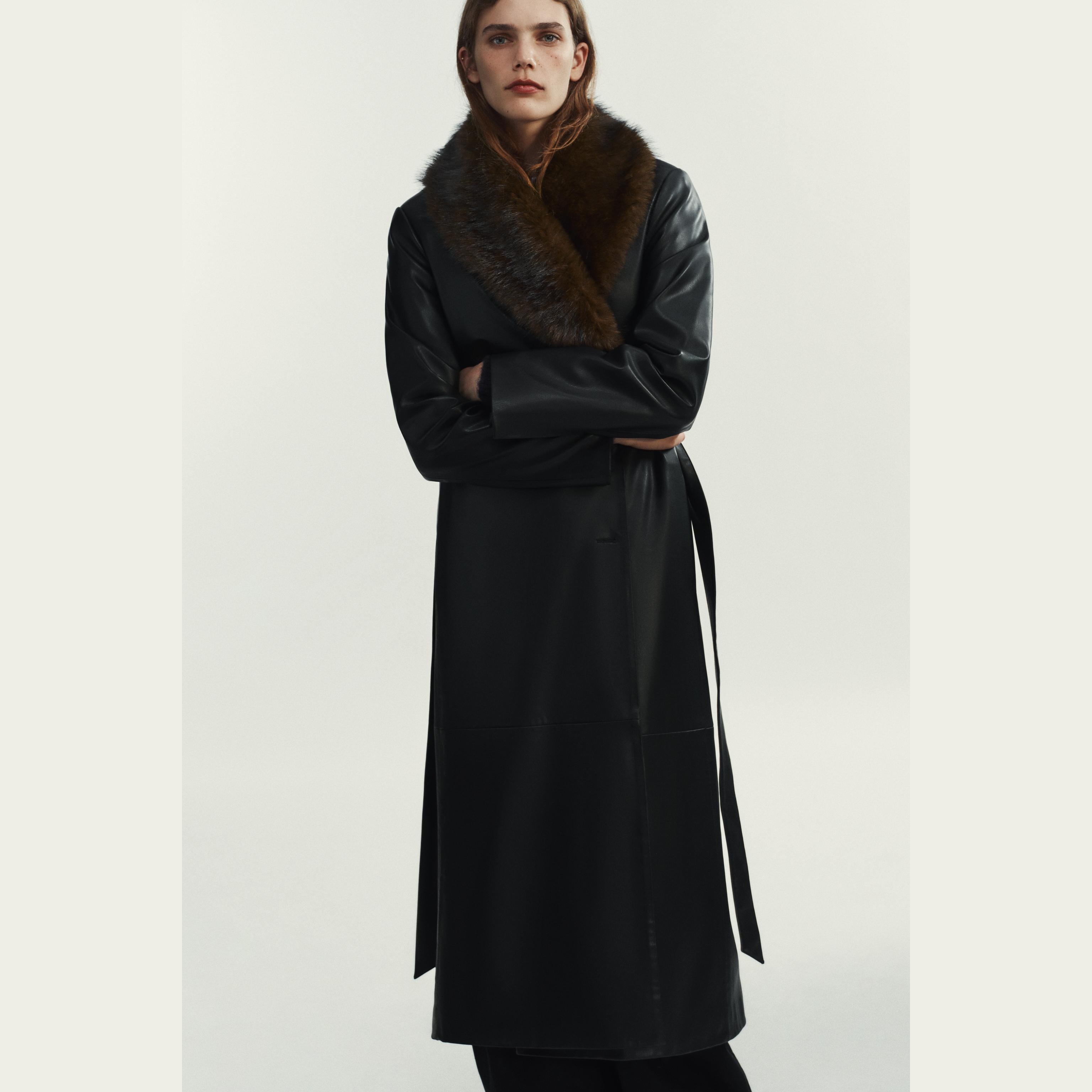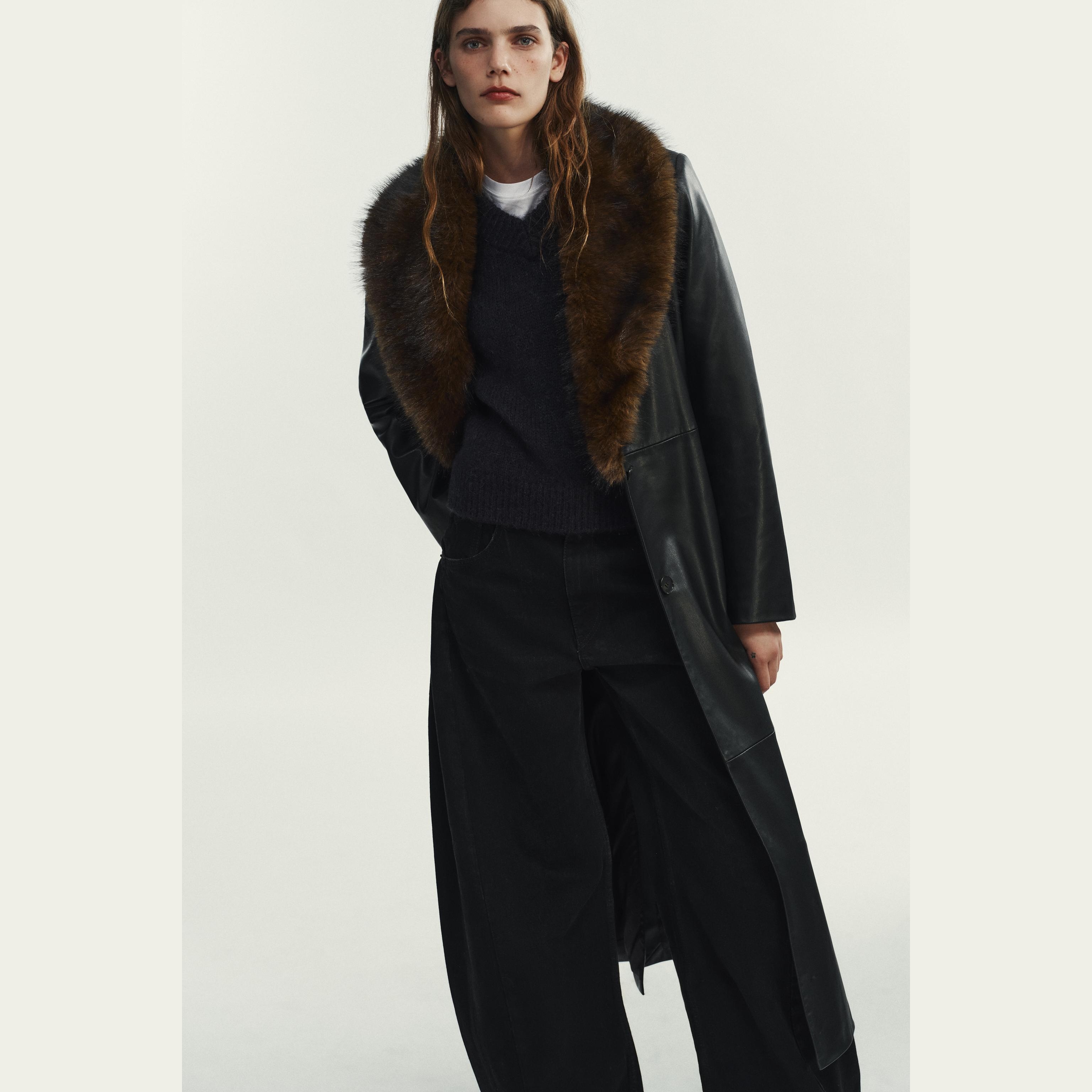 - التصميم: معطف طويل من الجلد الصناعي مع ياقة قابلة للفك (Faux Leather Coat with Detachable Collar)