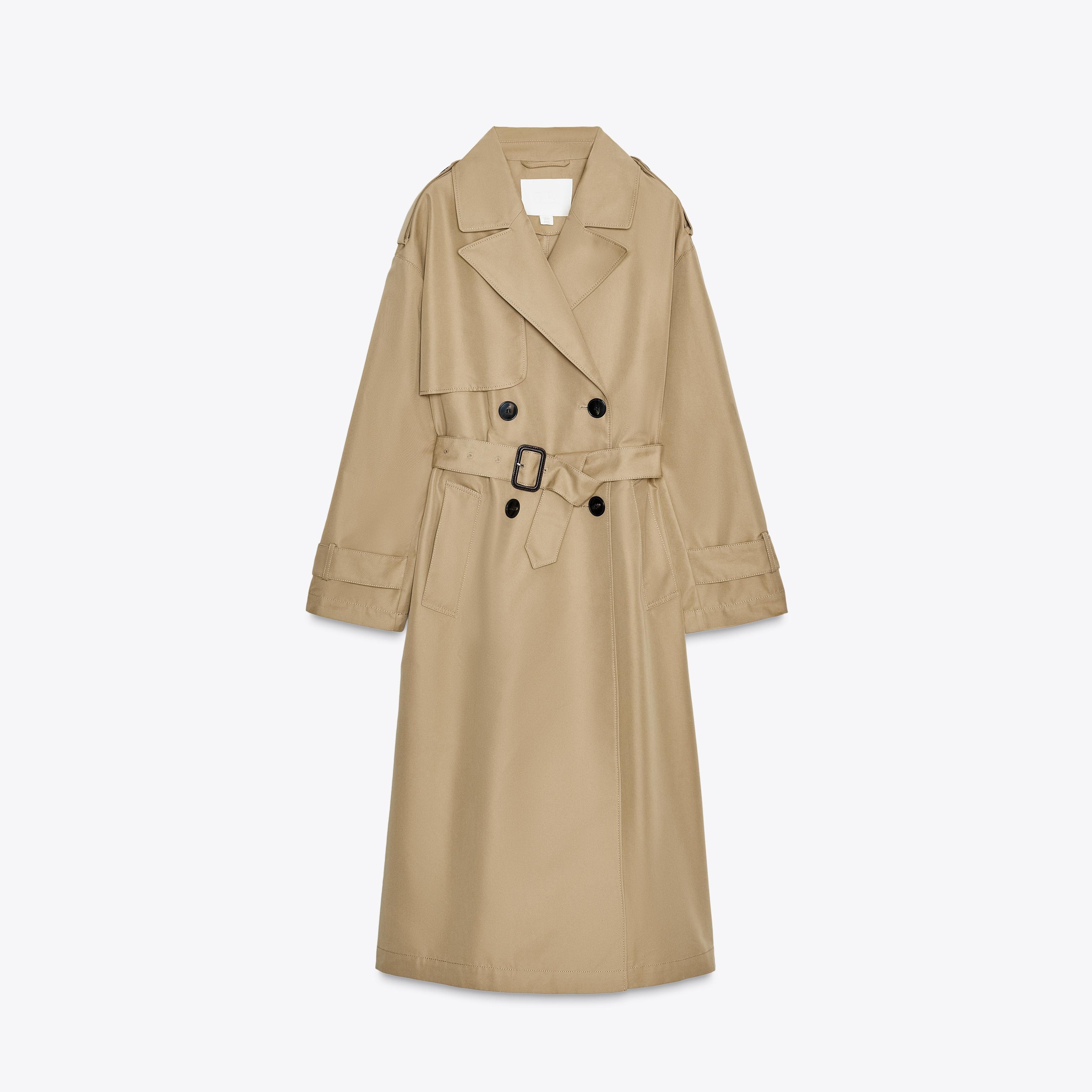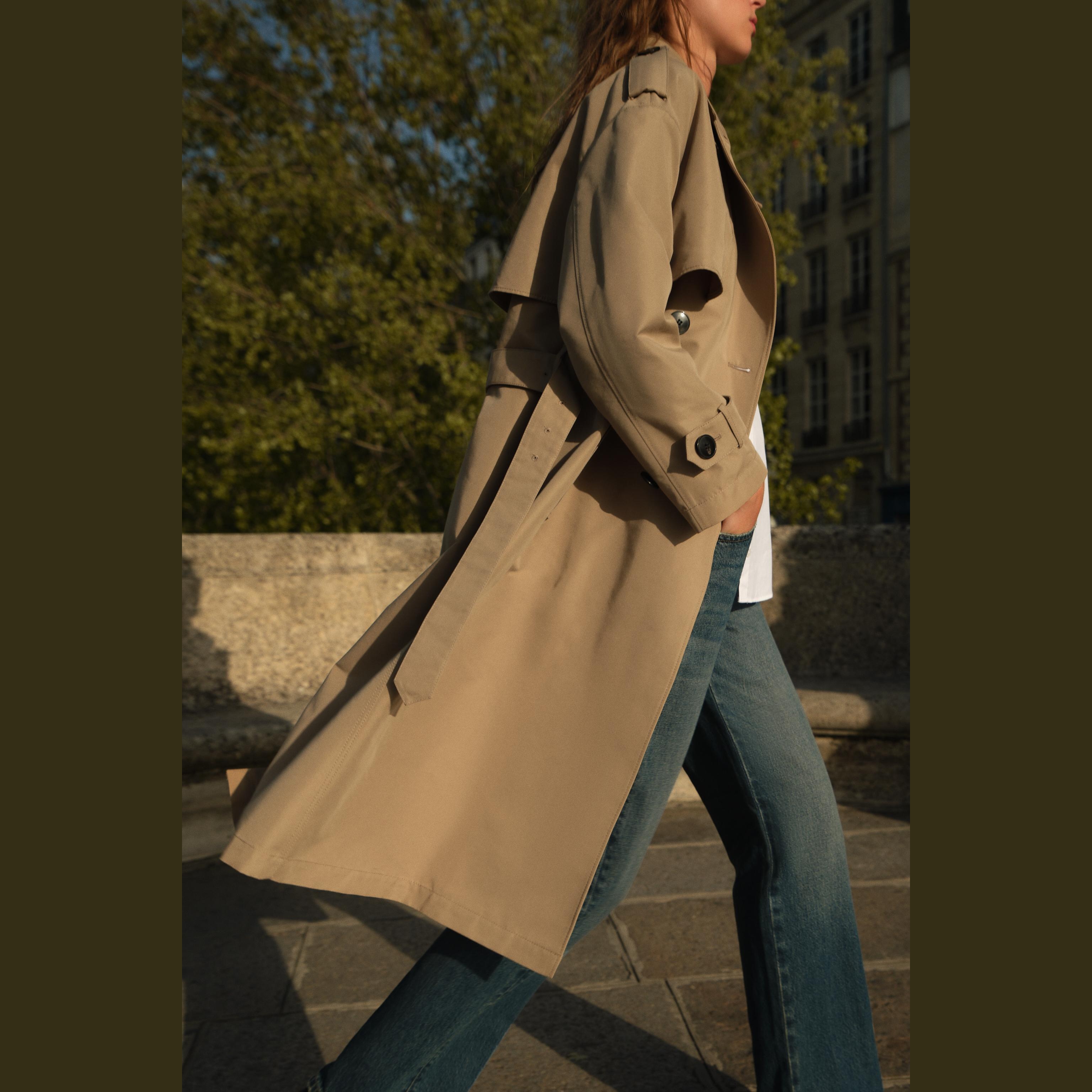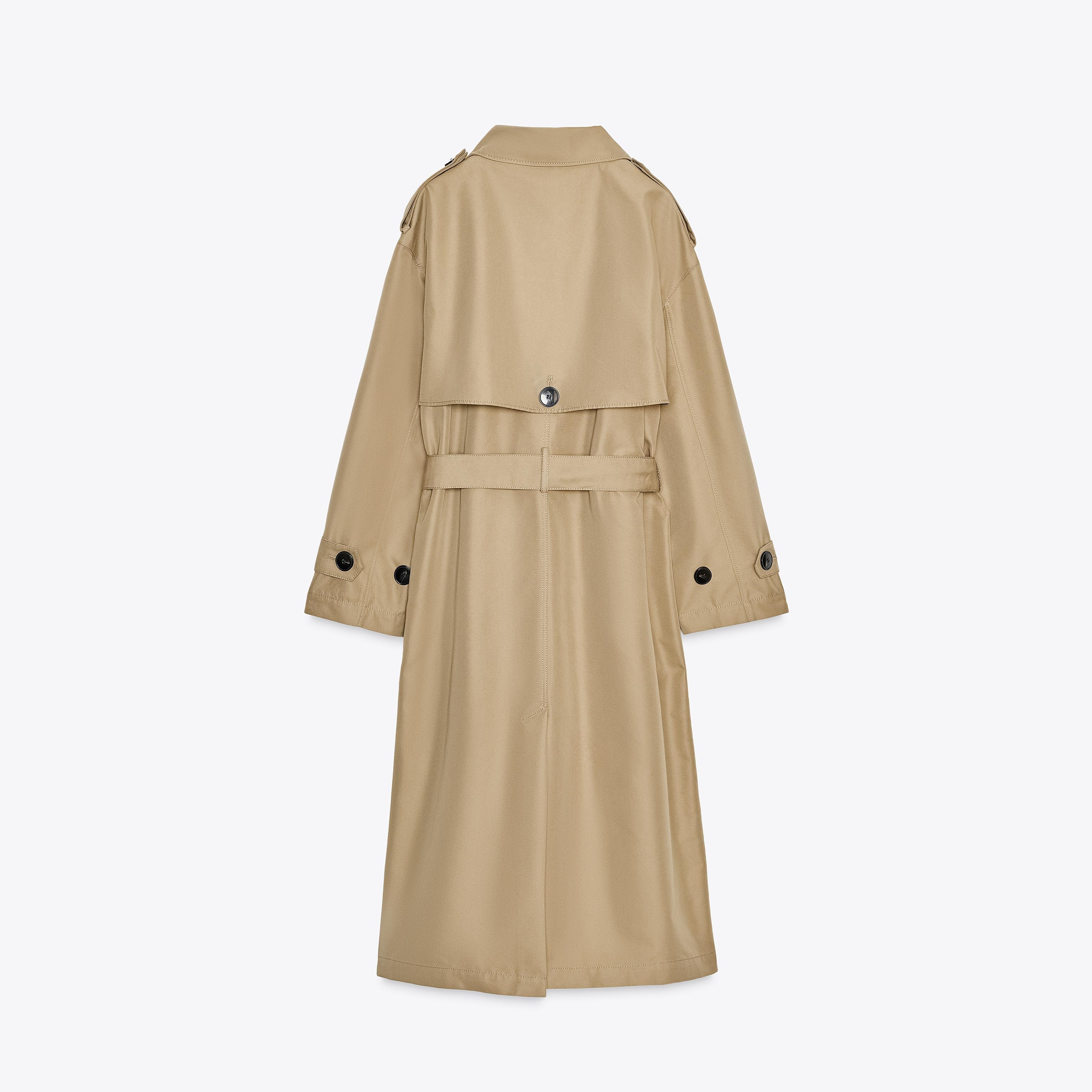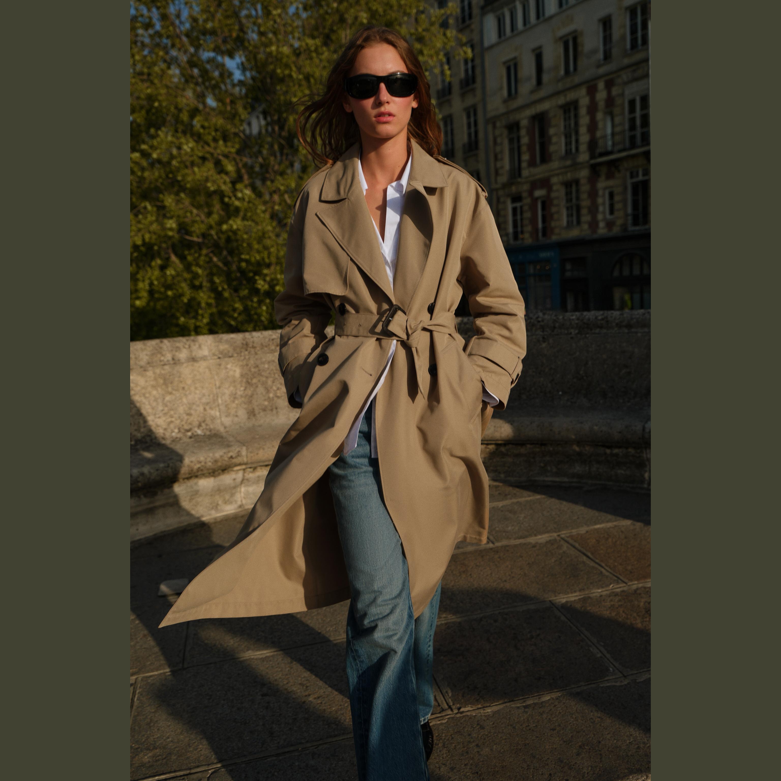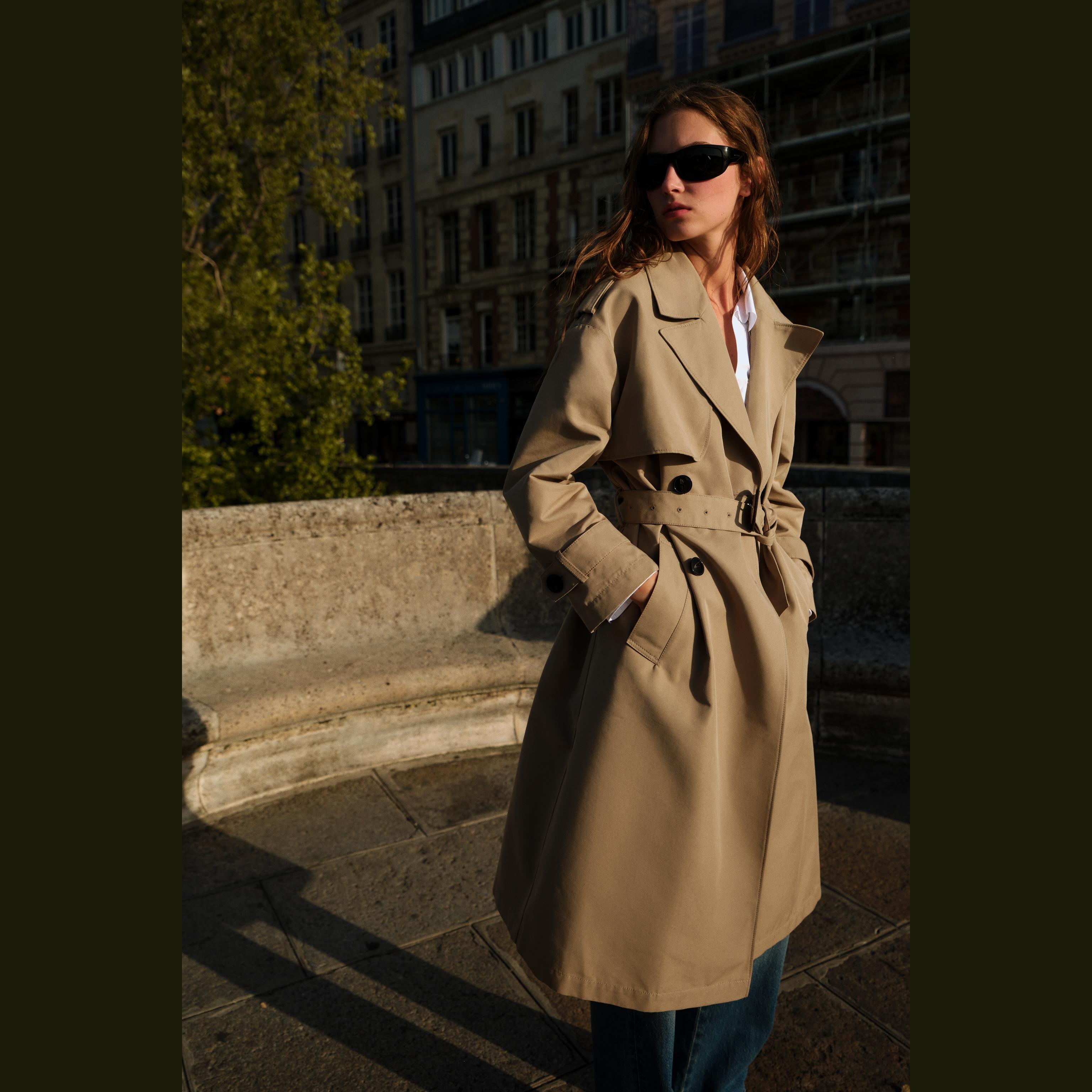 - التصميم: معطف طويل مزدوج الصدر مع حزام (Long Double-Breasted Trench Coat with Belt)