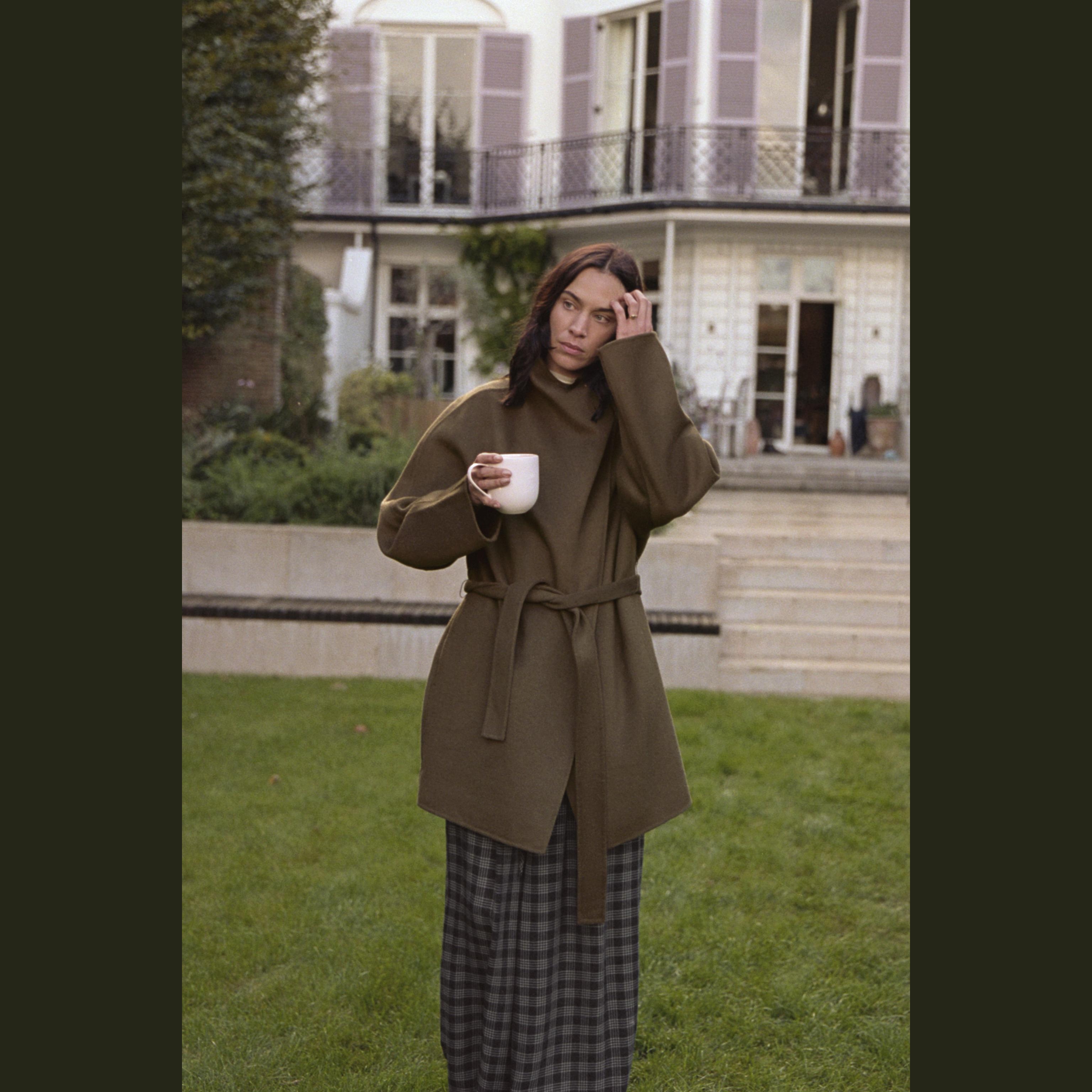 معطف طويل أنيق بلون كاكي حيادي، مصنوع من خامة ممزوجة تحتوي على نسبة عالية من الصوف تمنح دفئًا ومظهرًا فاخرًا. يتميز بياقة عالية وأكمام طويلة، مع جيوب أمامية عملية، وإغلاق أمامي بالأزرار. تصميم مثالي للإطلالات الرسمية أو العملية في المواسم الباردة.