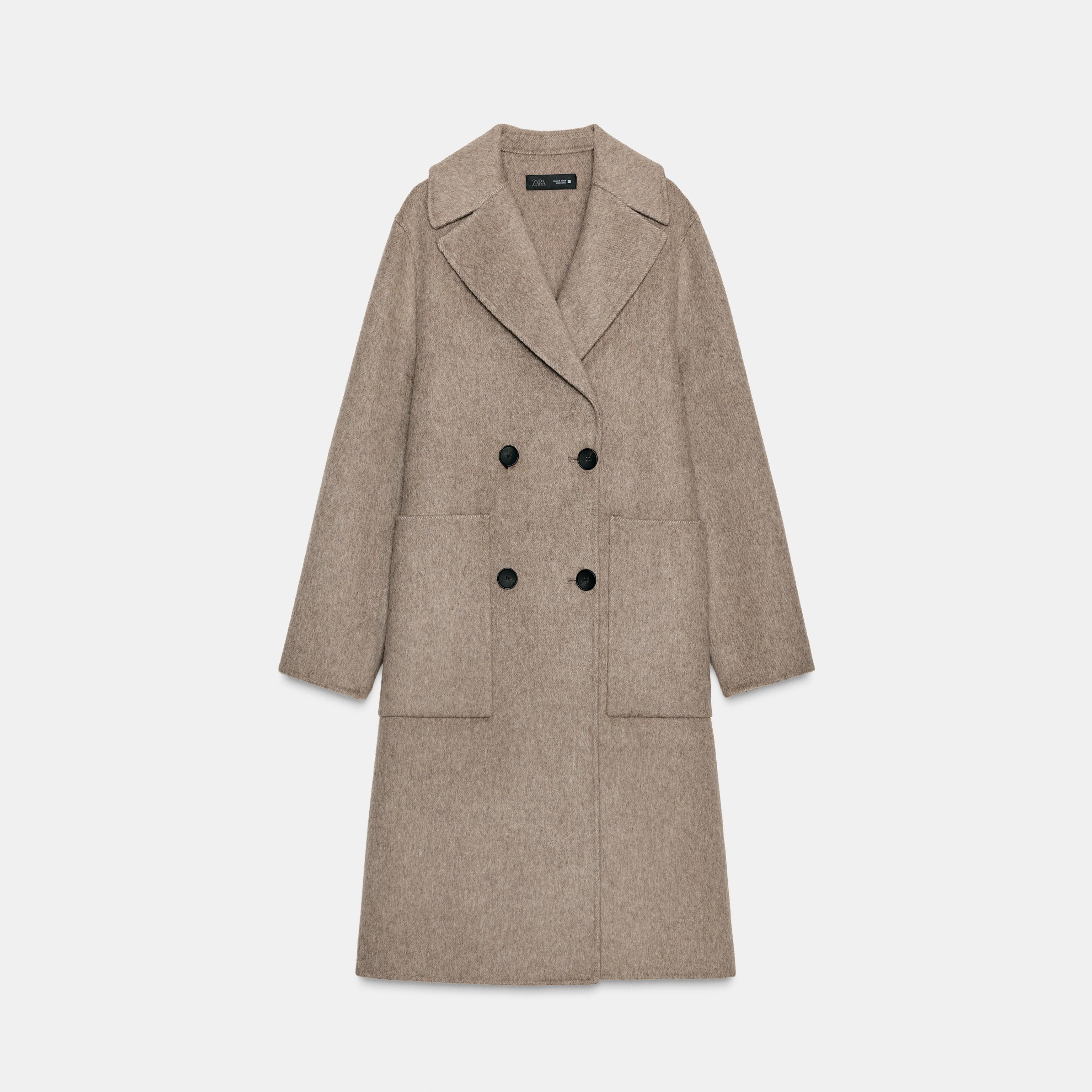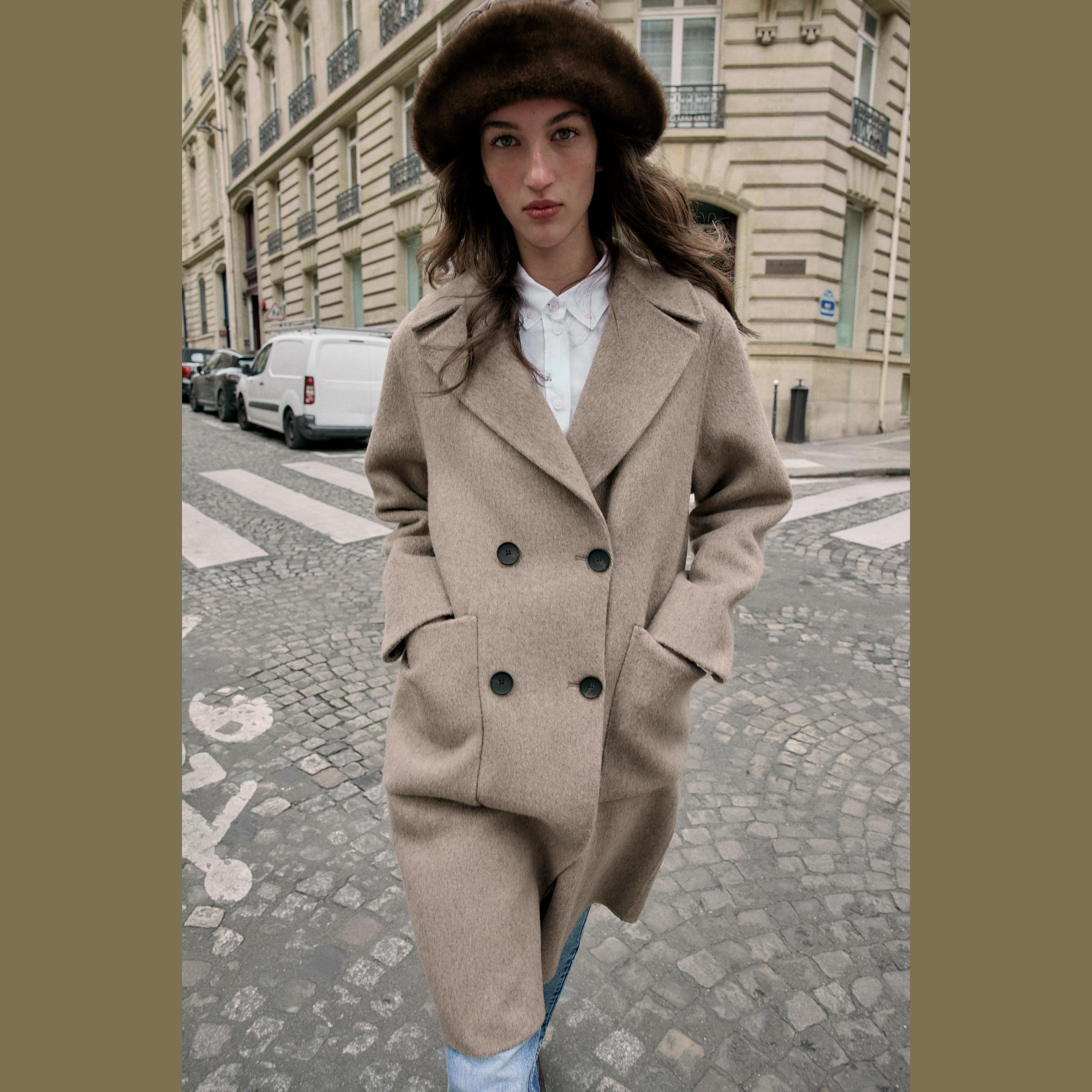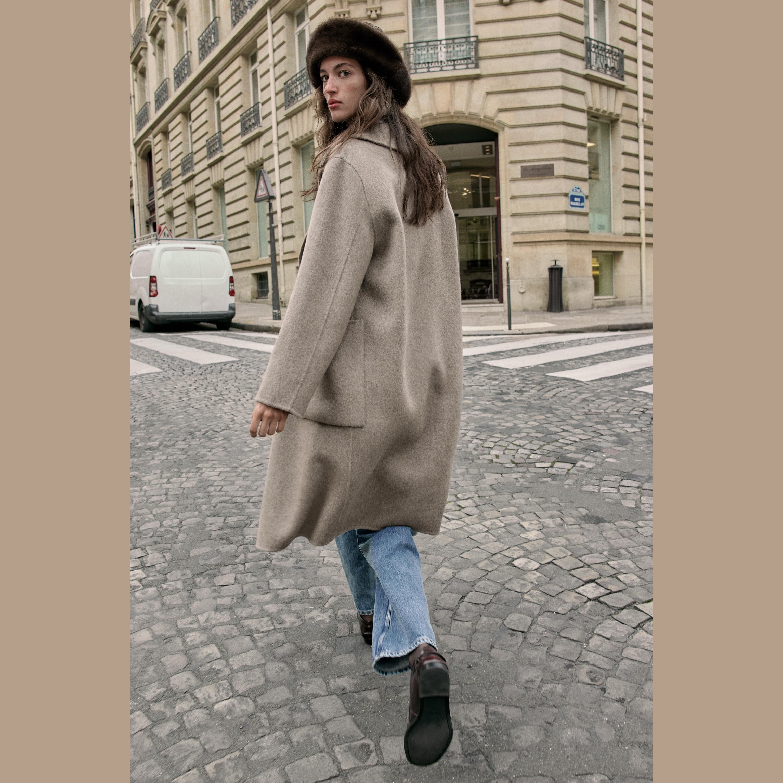 - التصميم: معطف طويل مزدوج الصدر من الصوف (Long Double-Breasted Wool Coat)