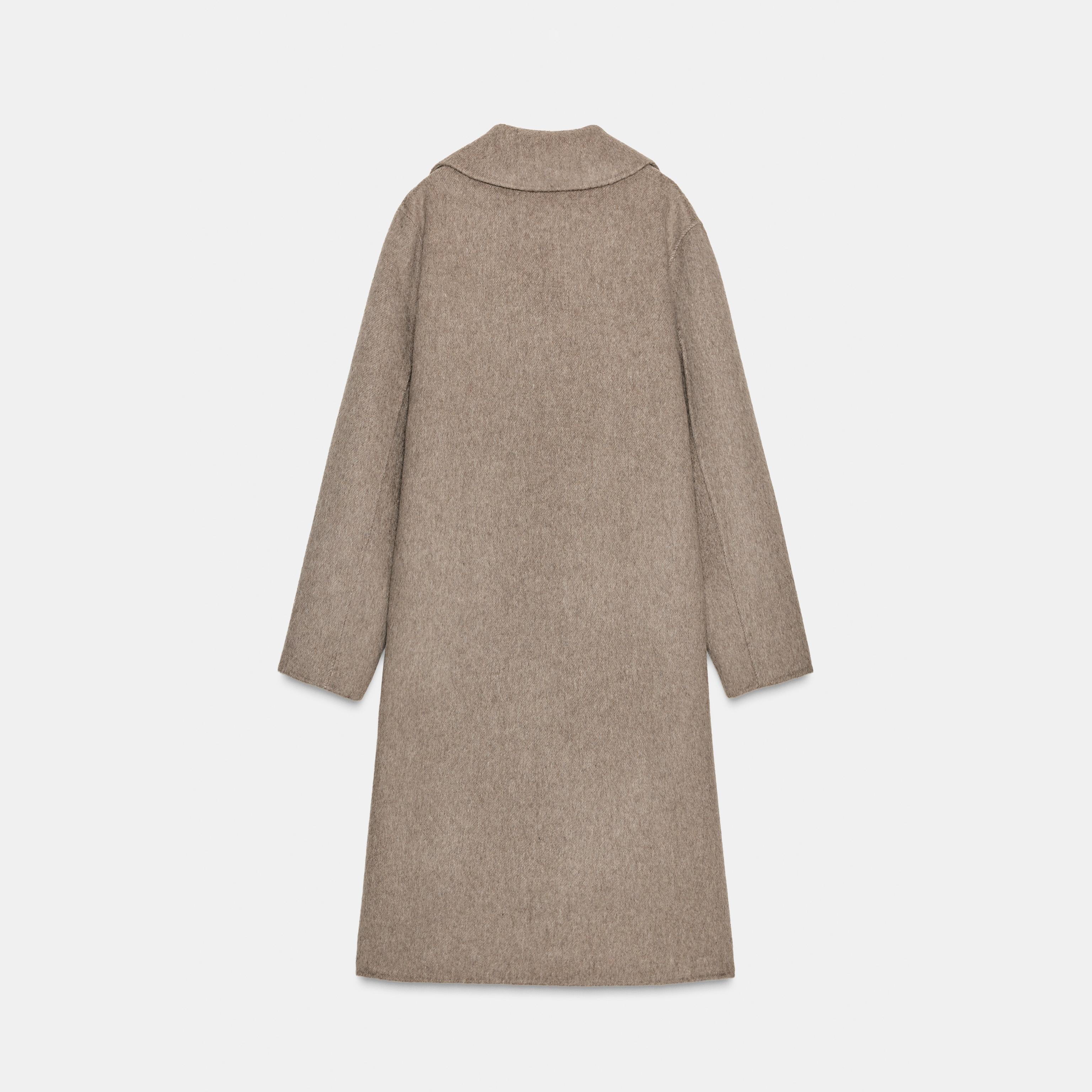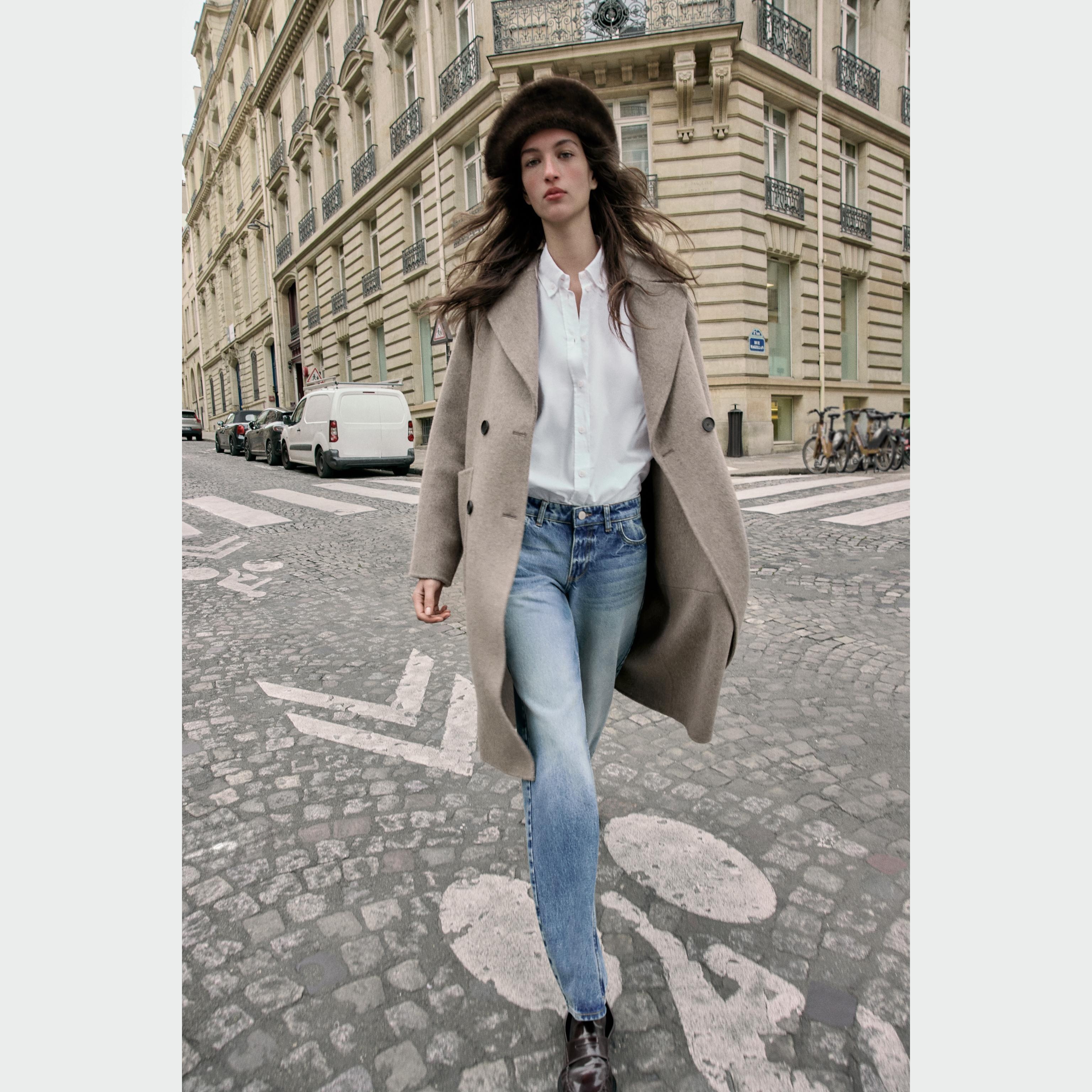 معطف طويل أنيق بلون بني مينك غني، مصنوع من خامة ممزوجة تحتوي على نسبة عالية من الصوف تمنح دفئًا ومظهرًا فاخرًا. يتميز بياقة لابيل كلاسيكية وأكمام طويلة، مع جيوب أمامية عملية، وإغلاق أمامي مزدوج بالأزرار. تصميم مثالي للإطلالات الرسمية أو العملية في المواسم الباردة.
