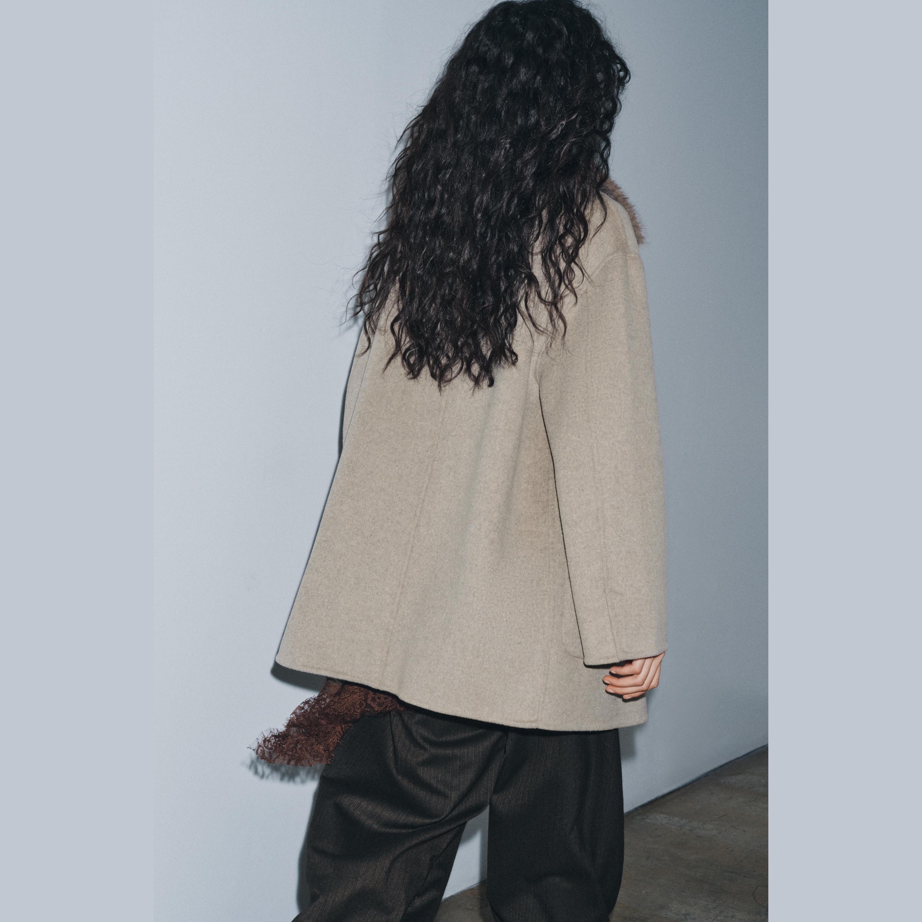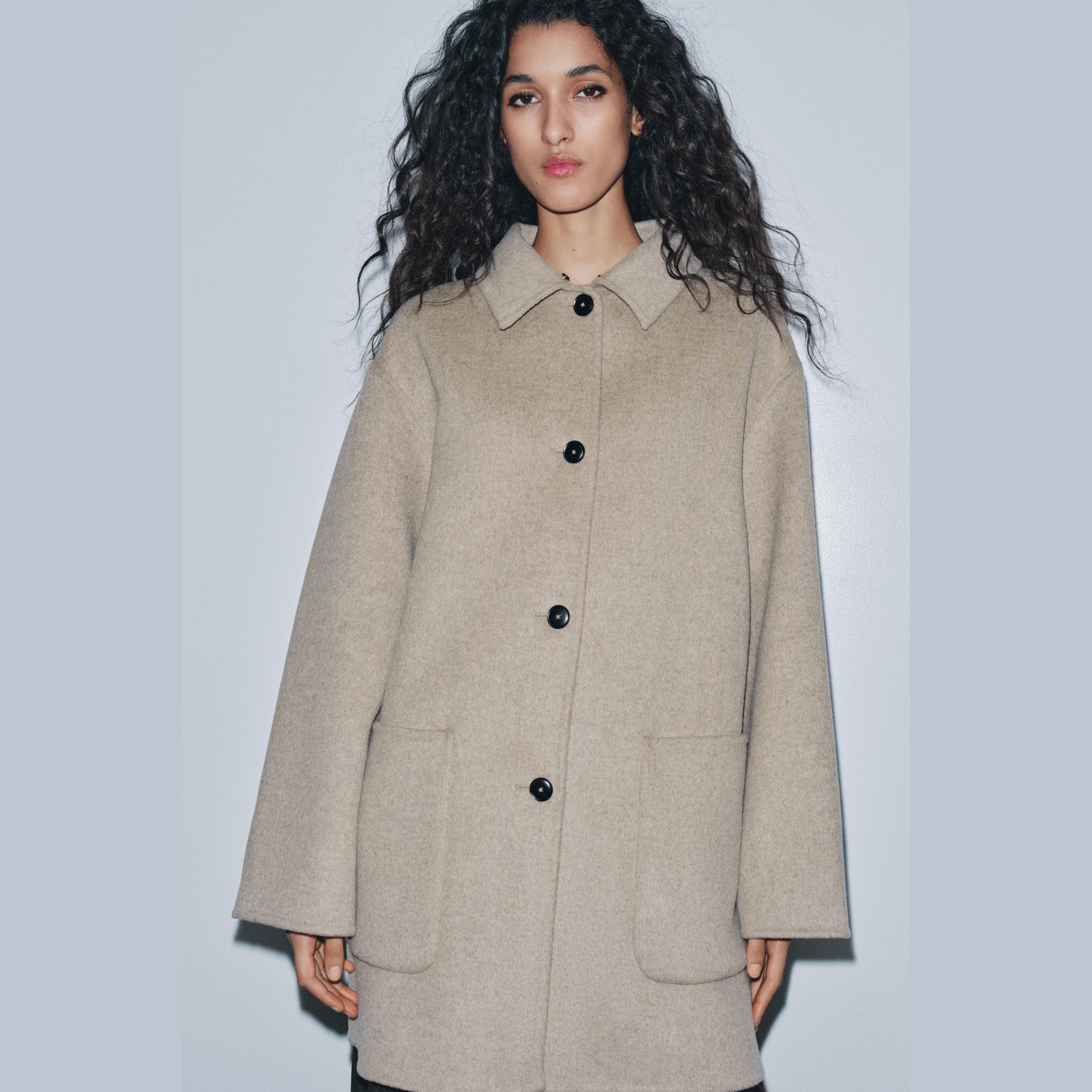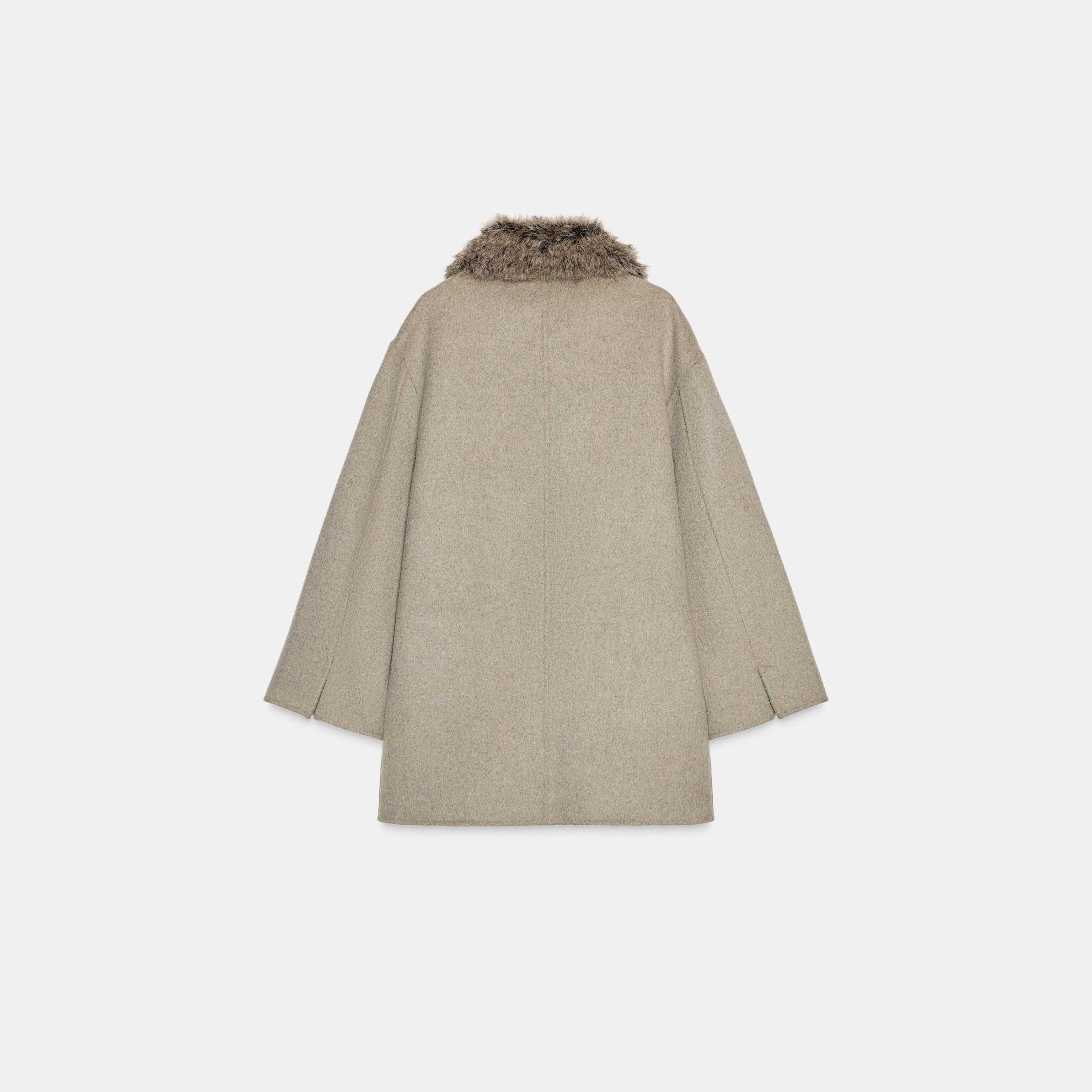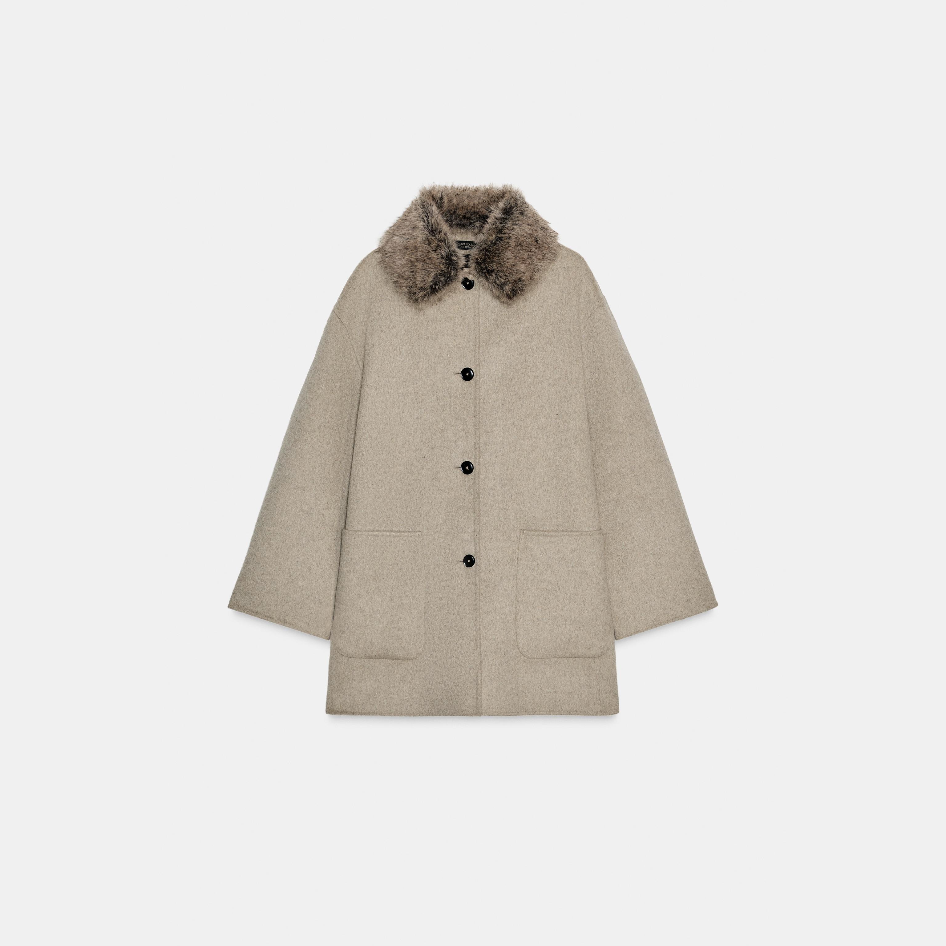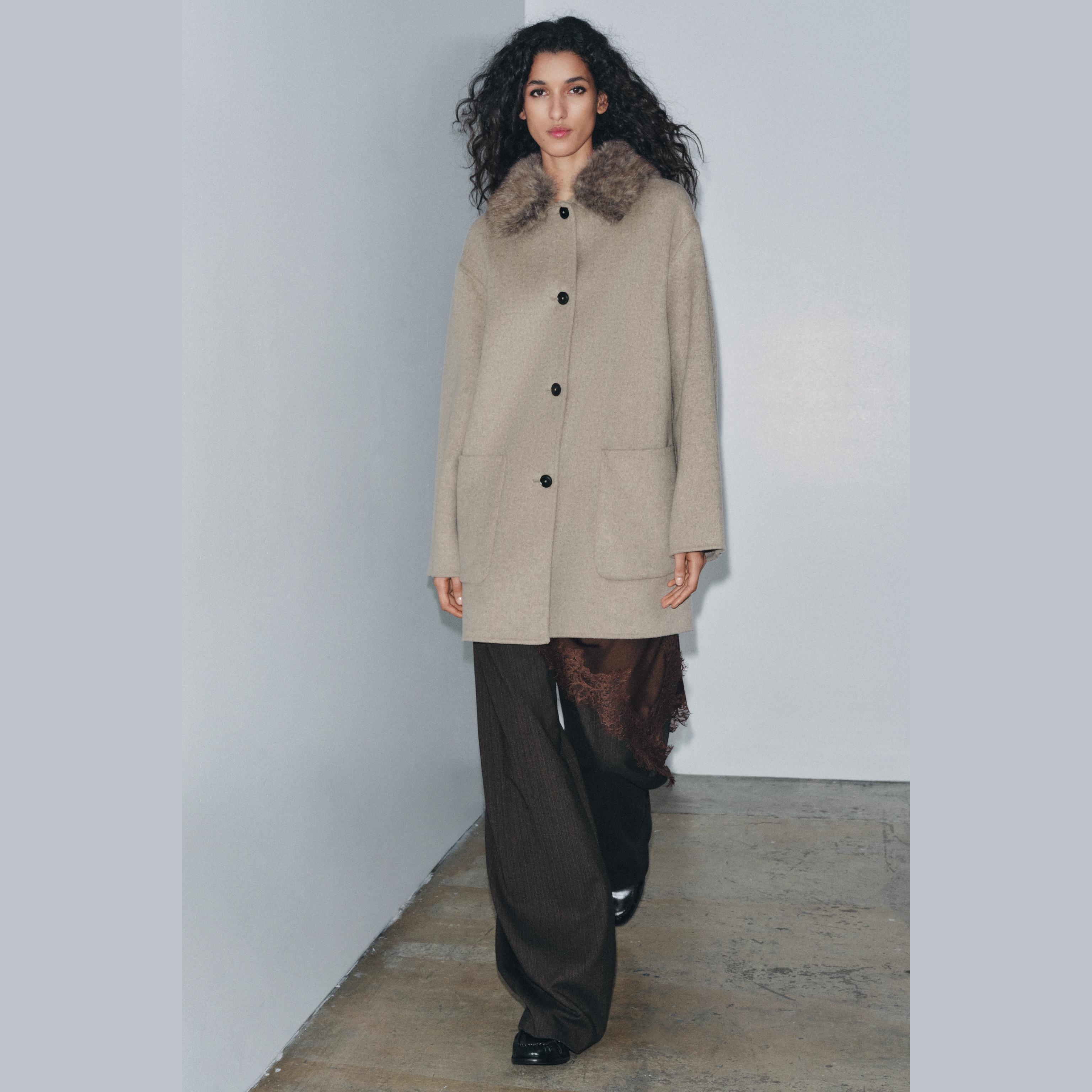 - التصميم: معطف طويل من الصوف مع ياقة فرو صناعي قابلة للفك (Wool Coat with Faux Fur Collar – ZW Collection)