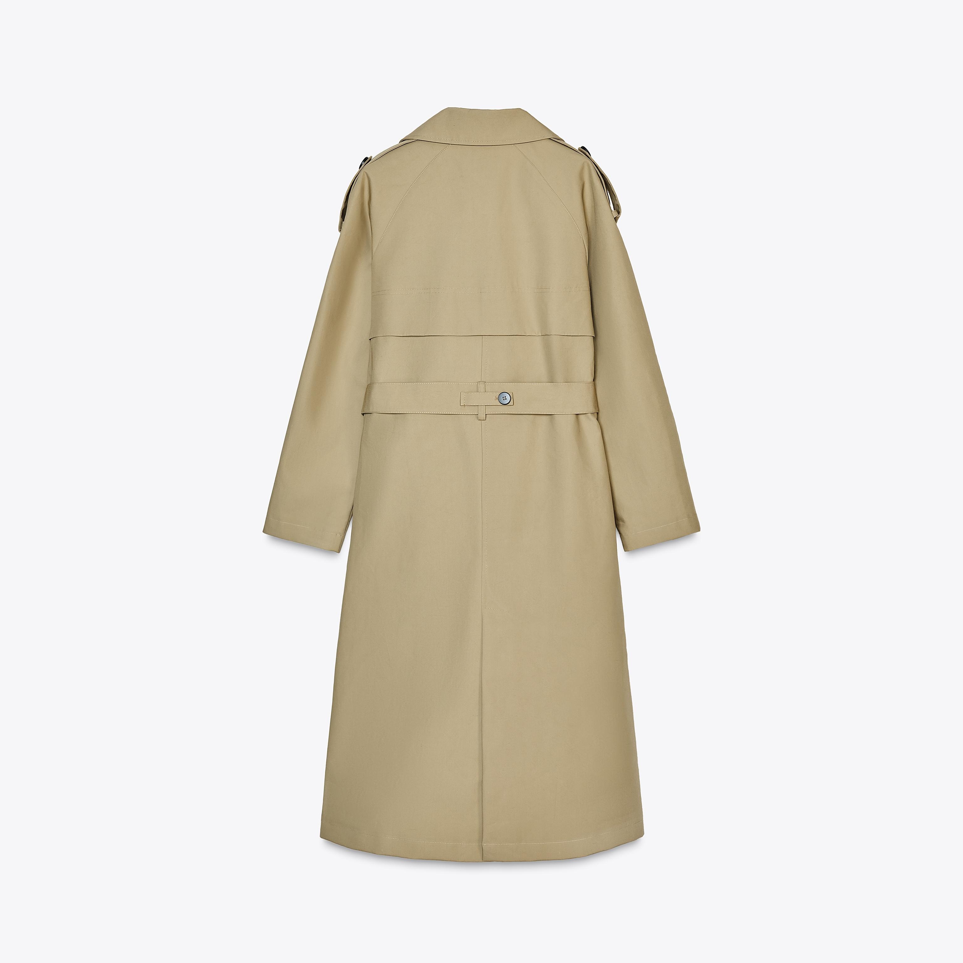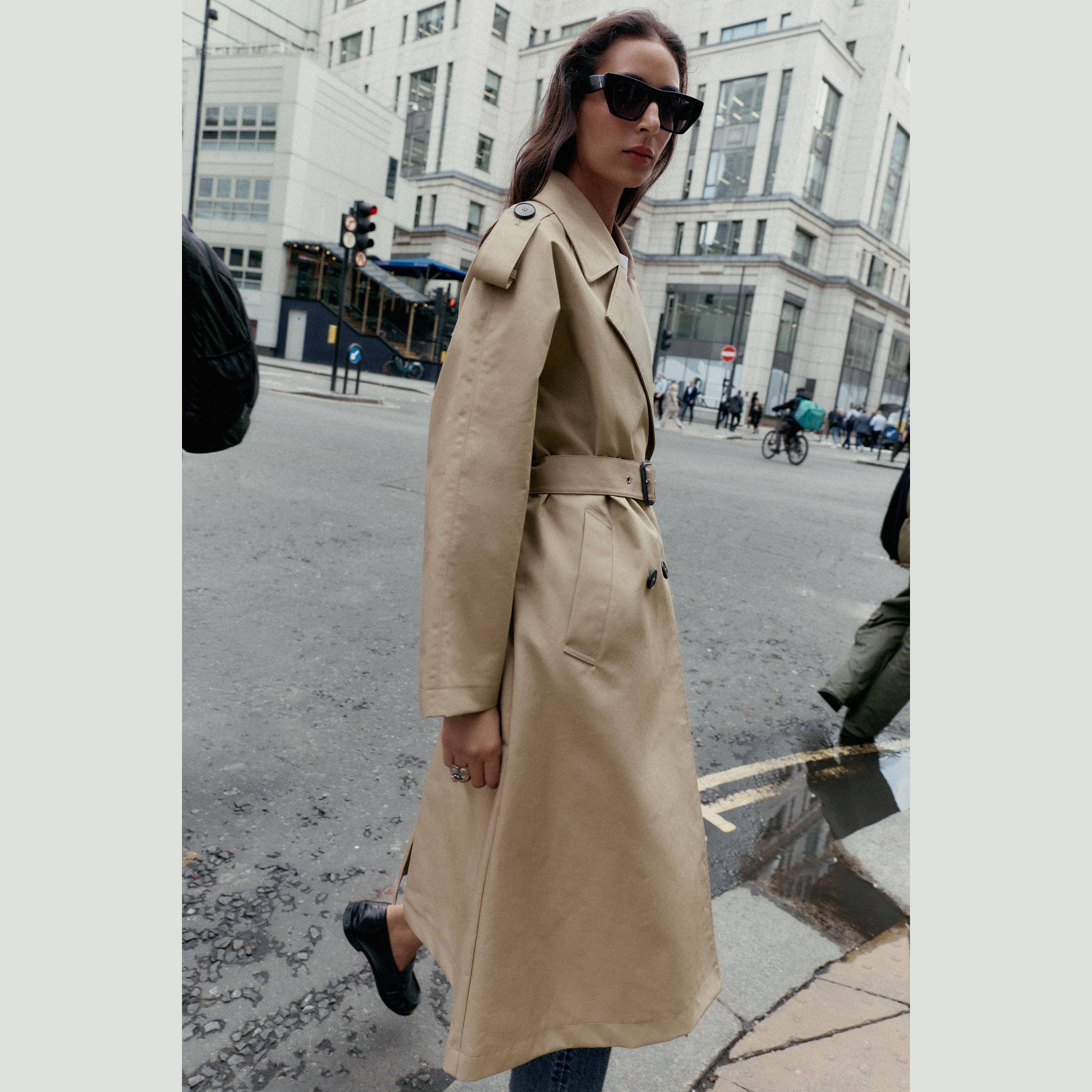 معطف ترنش أنيق بلون بيج حيادي، مصنوع من خامة قطنية تمنح مظهرًا كلاسيكيًا وراحة في الارتداء. يتميز بياقة لابيل كلاسيكية وأكمام طويلة مع أزرار على الأكتاف، مع جيوب أمامية عملية، وفتحة خلفية عند الحاشية، وإغلاق أمامي مزدوج بالأزرار، بالإضافة إلى حزام بنفس القماش لإبراز الخصر. تصميم مثالي للإطلالات الرسمية أو العملية في المواسم الانتقالية.