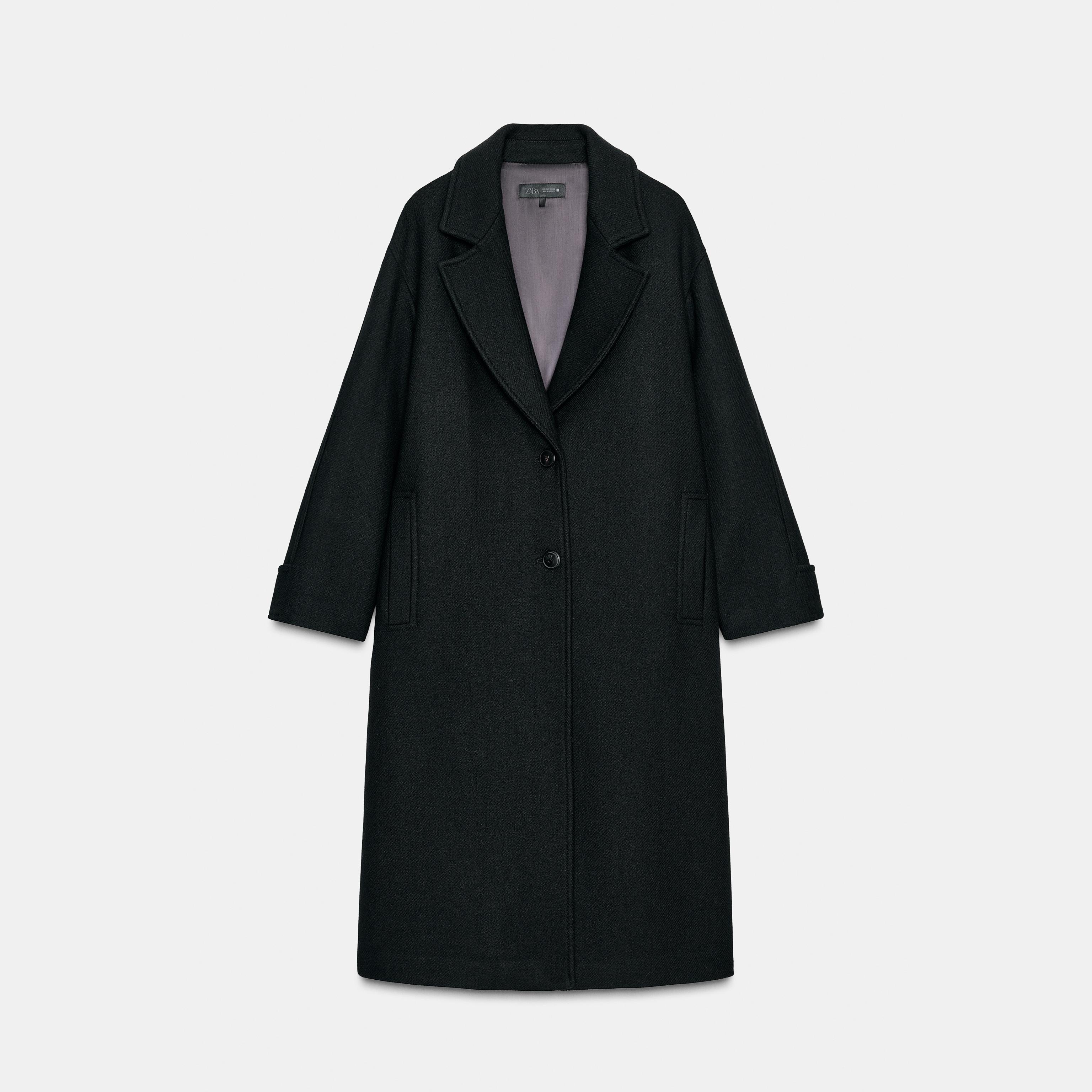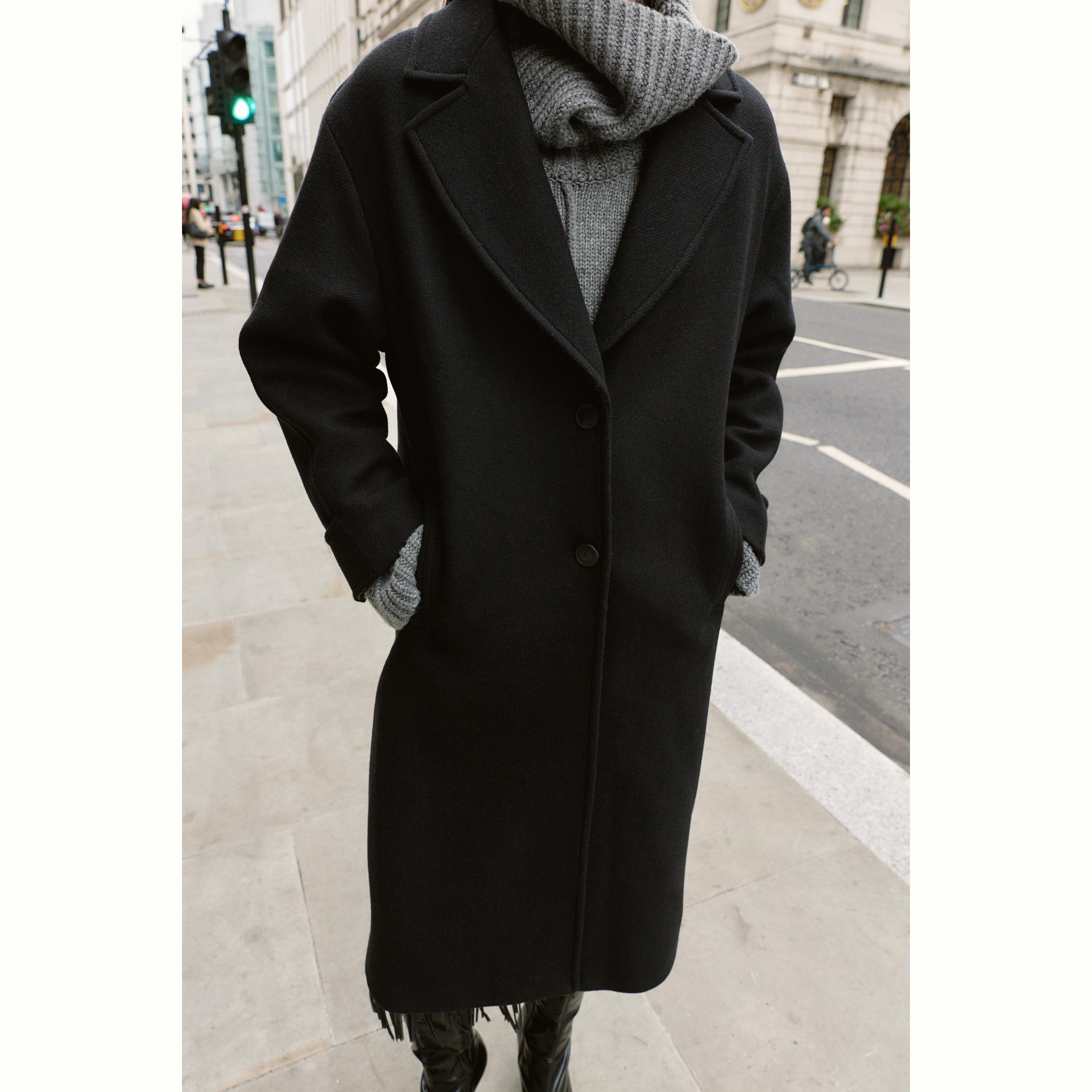 معطف نسائي واسع – لون كلاسيكي (أسود) – Black، من الصوف مع أكمام متباينة (Oversized Wool Coat with Contrast Cuffs)