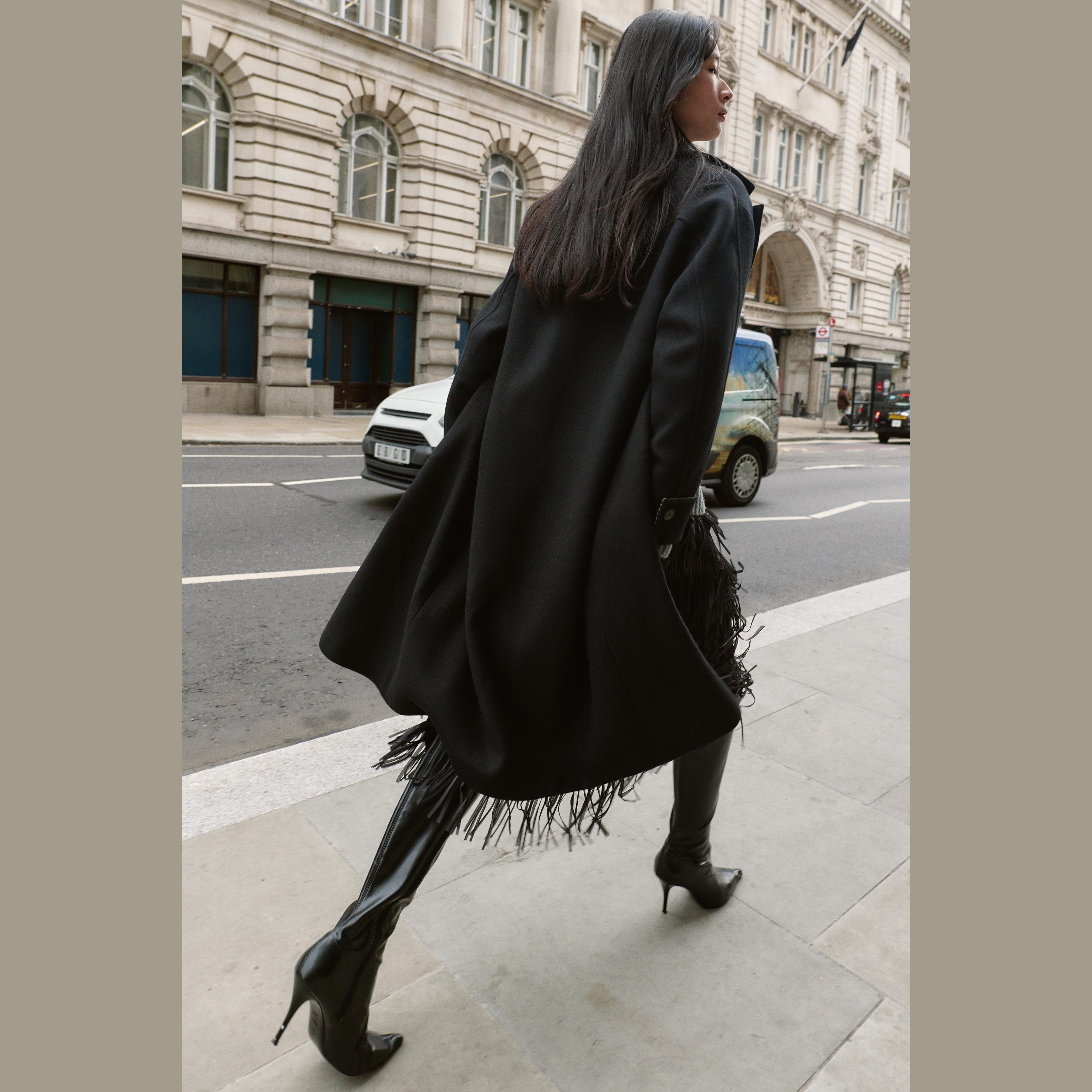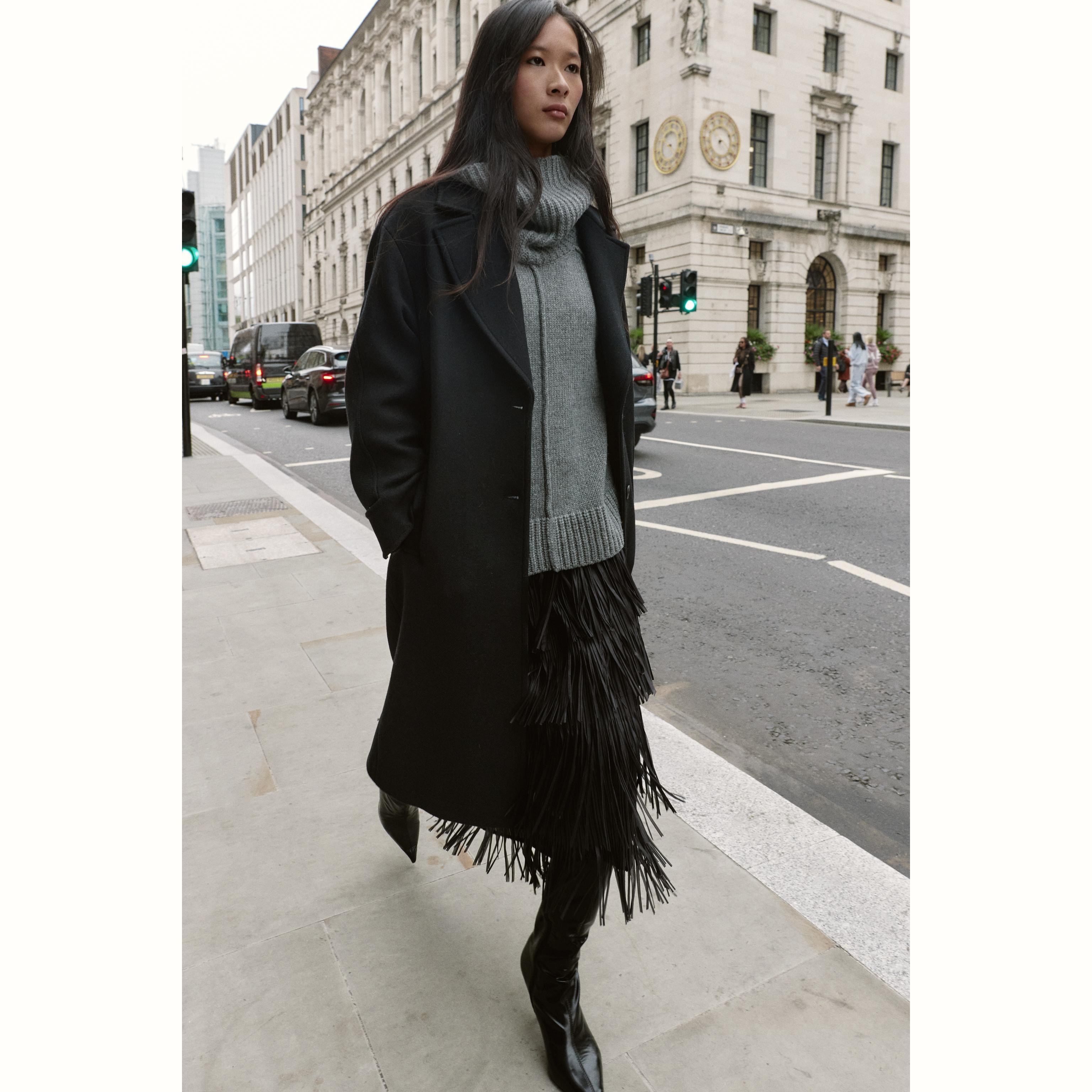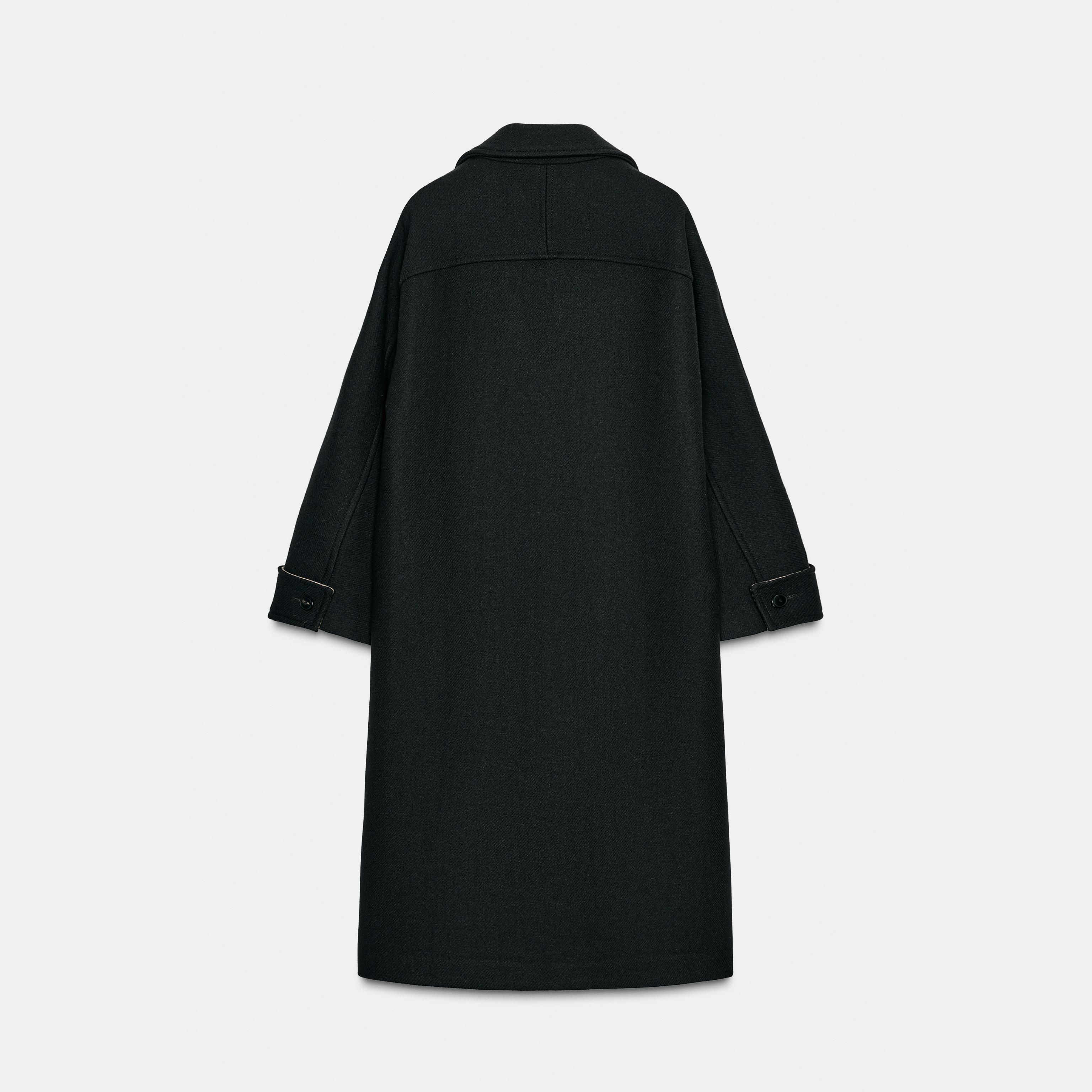 - التصميم: معطف واسع من الصوف مع أكمام متباينة (Oversized Wool Coat with Contrast Cuffs)