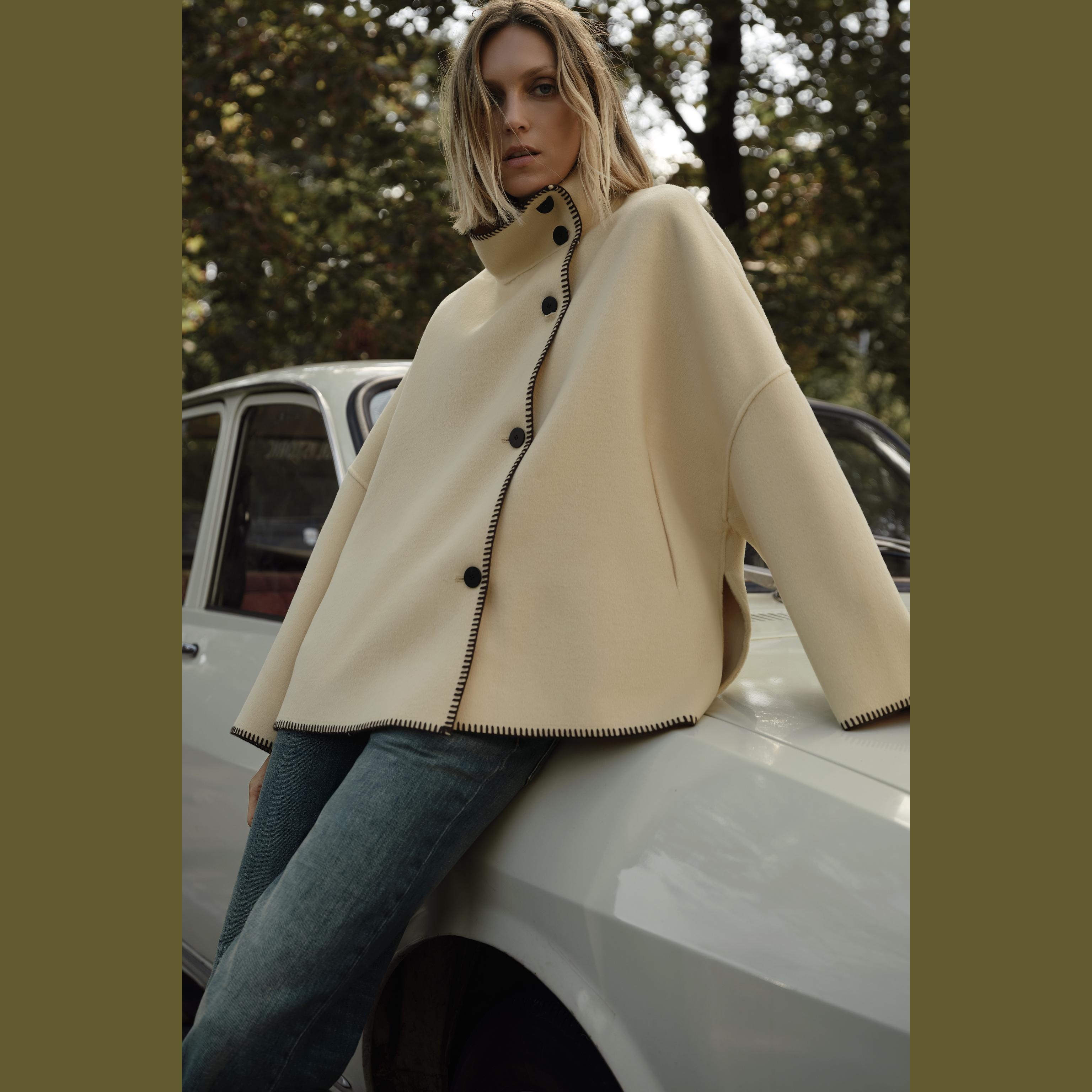 معطف قصير أنيق بلون كريمي حيادي، مصنوع من خامة ممزوجة تحتوي على نسبة عالية من الصوف تمنح دفئًا ومظهرًا فاخرًا. يتميز بياقة عالية وأكمام طويلة، مع جيوب أمامية عملية، وتفاصيل خياطة متباينة، وحاشية غير متناظرة مع فتحات جانبية، وإغلاق أمامي بالأزرار. تصميم مثالي لإطلالات عصرية في المواسم الباردة.
