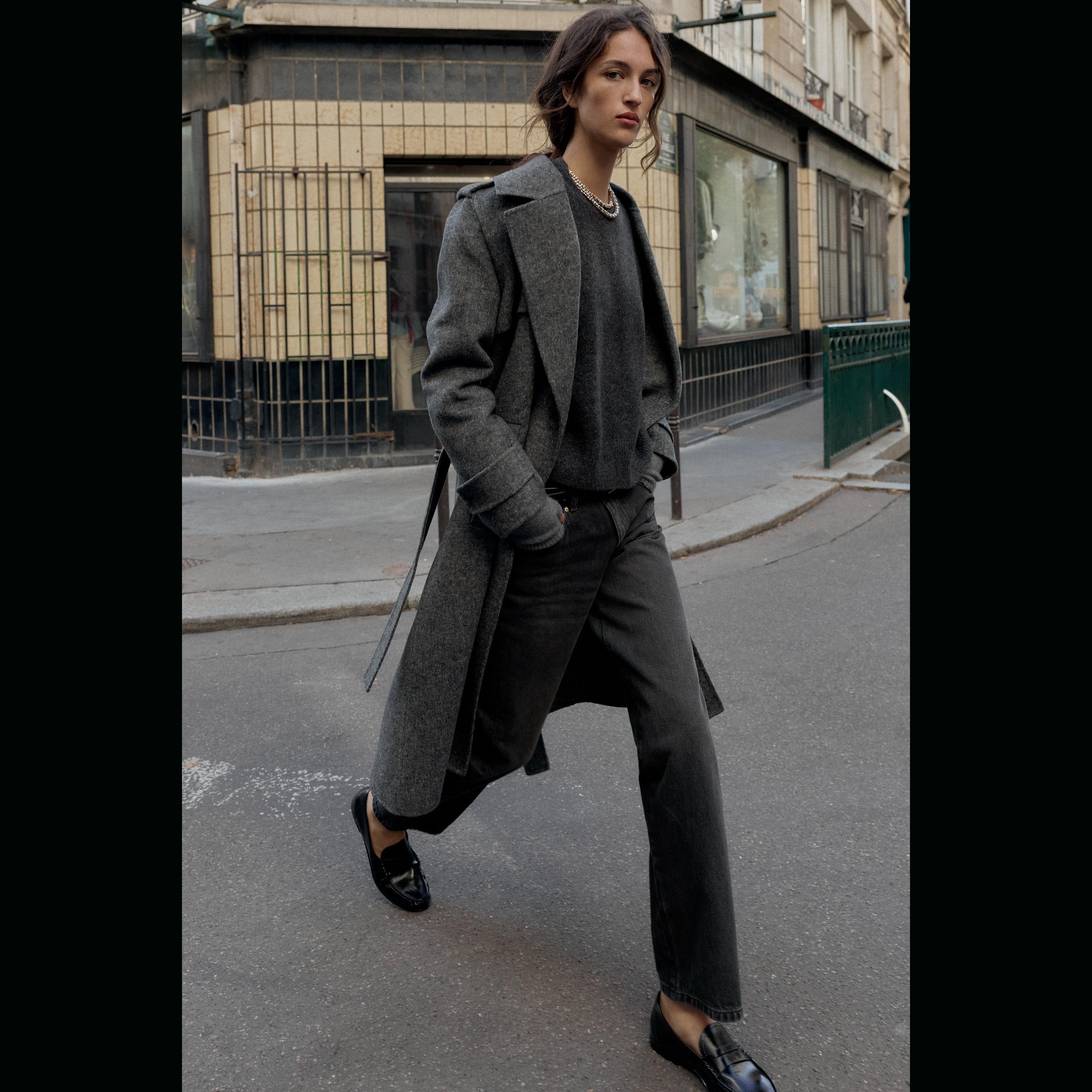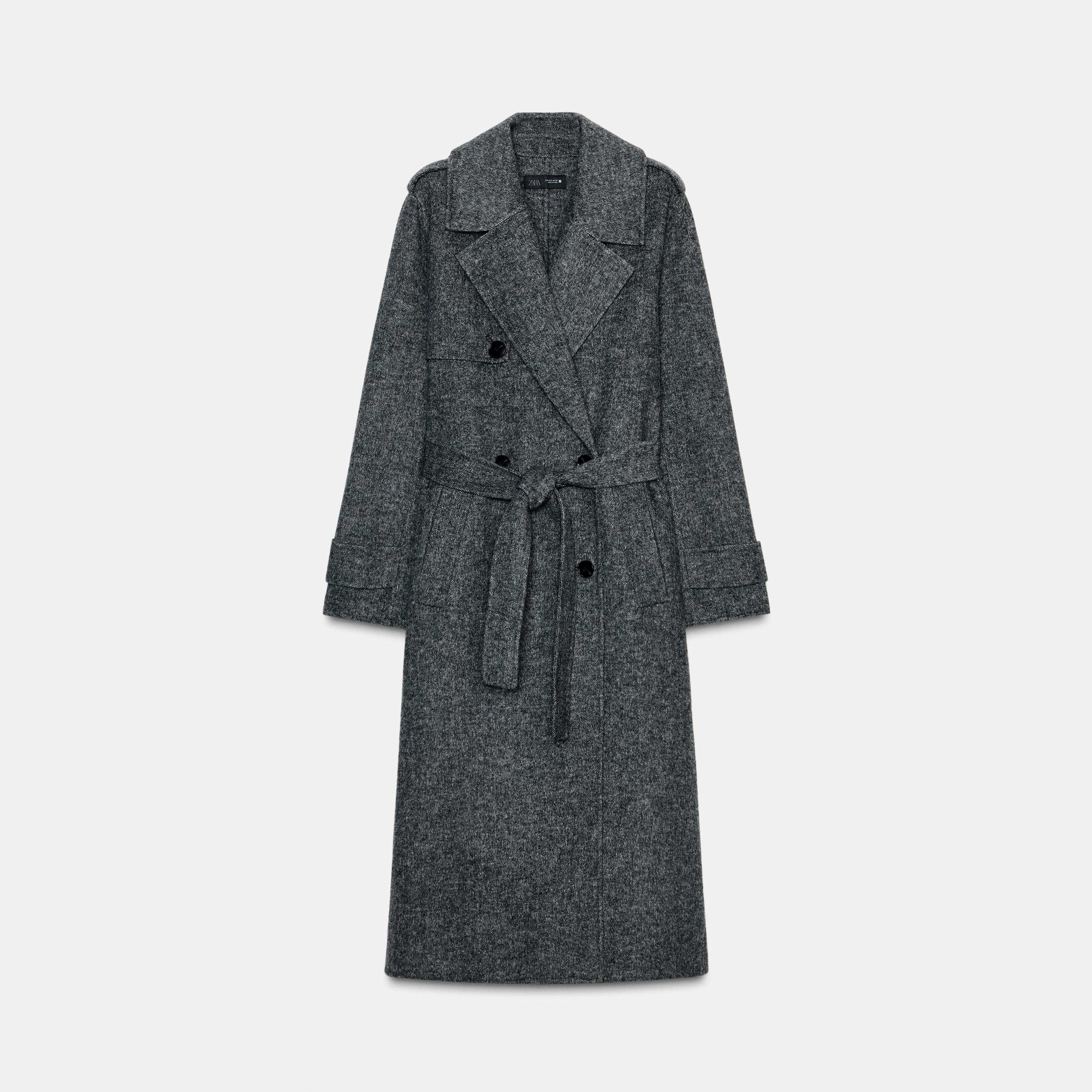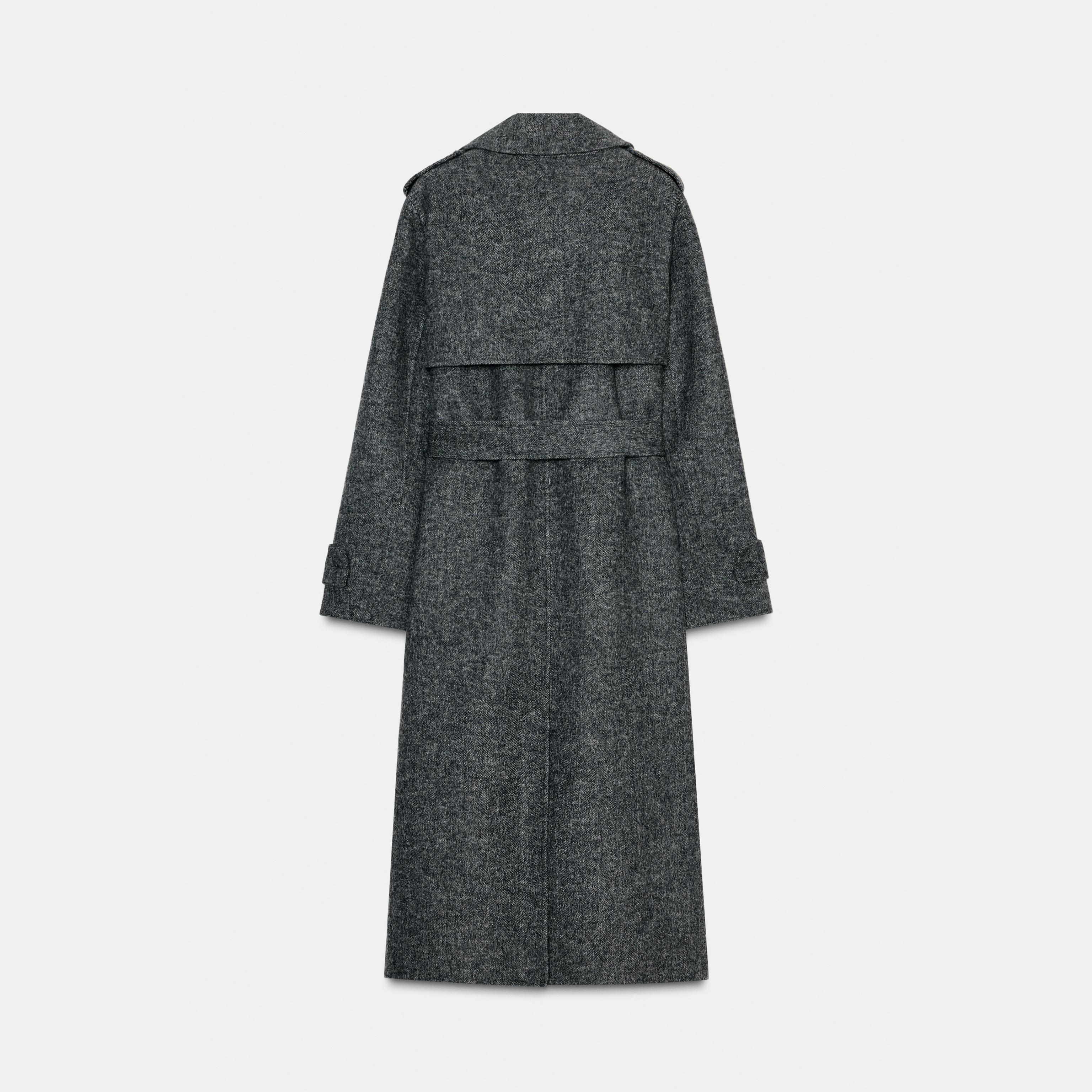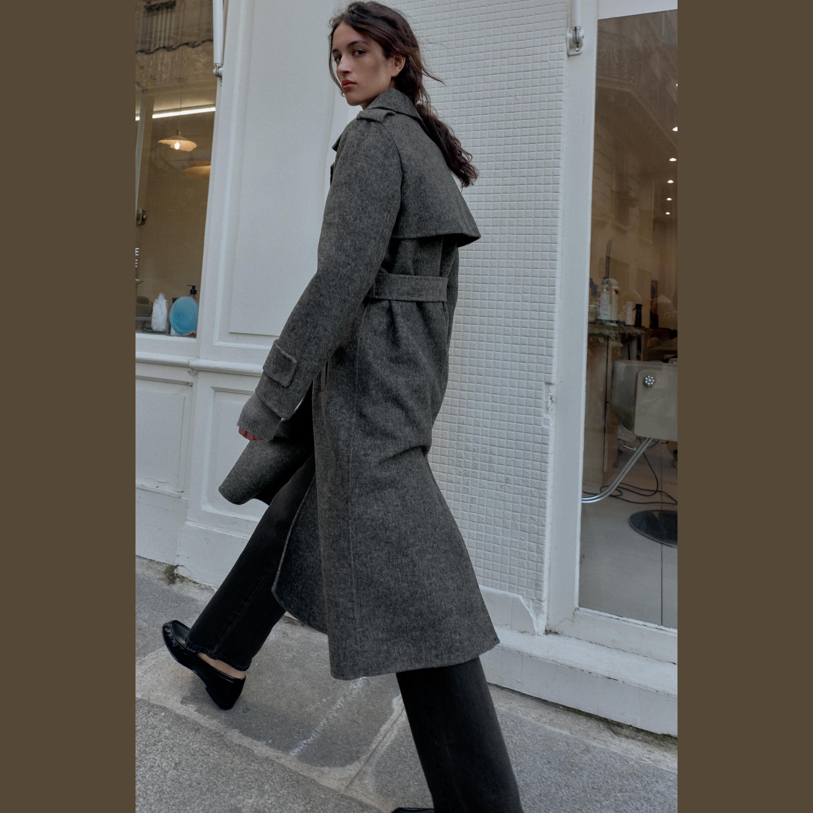 - التصميم: معطف طويل من الصوف مع حزام (Wool Coat with Belt)