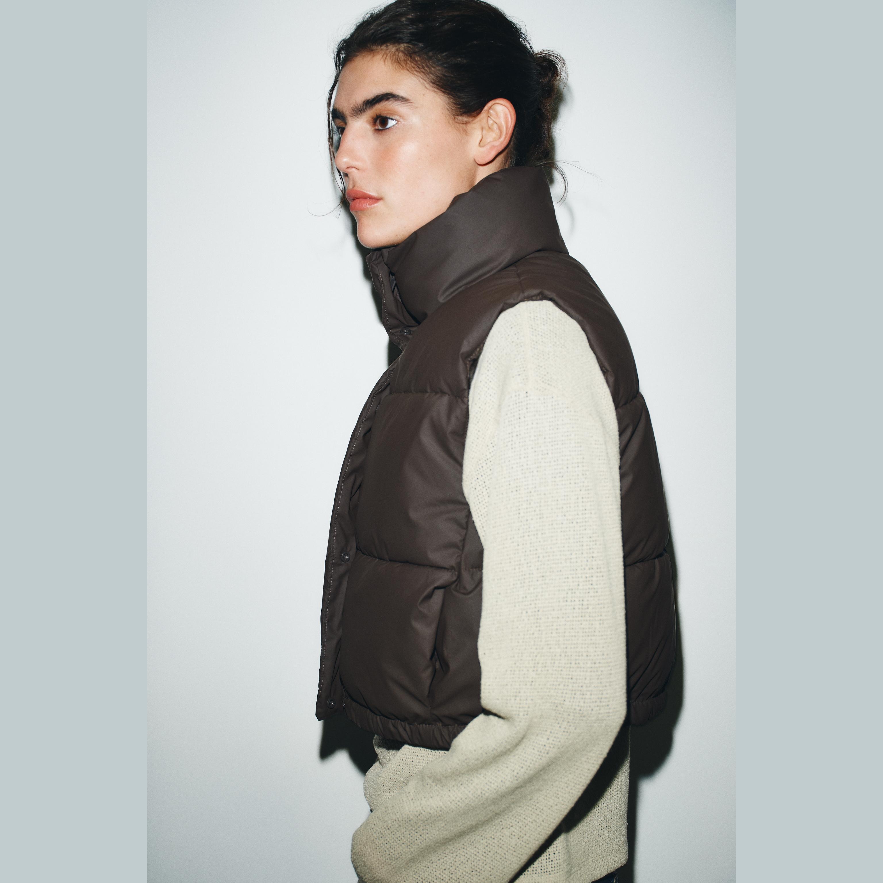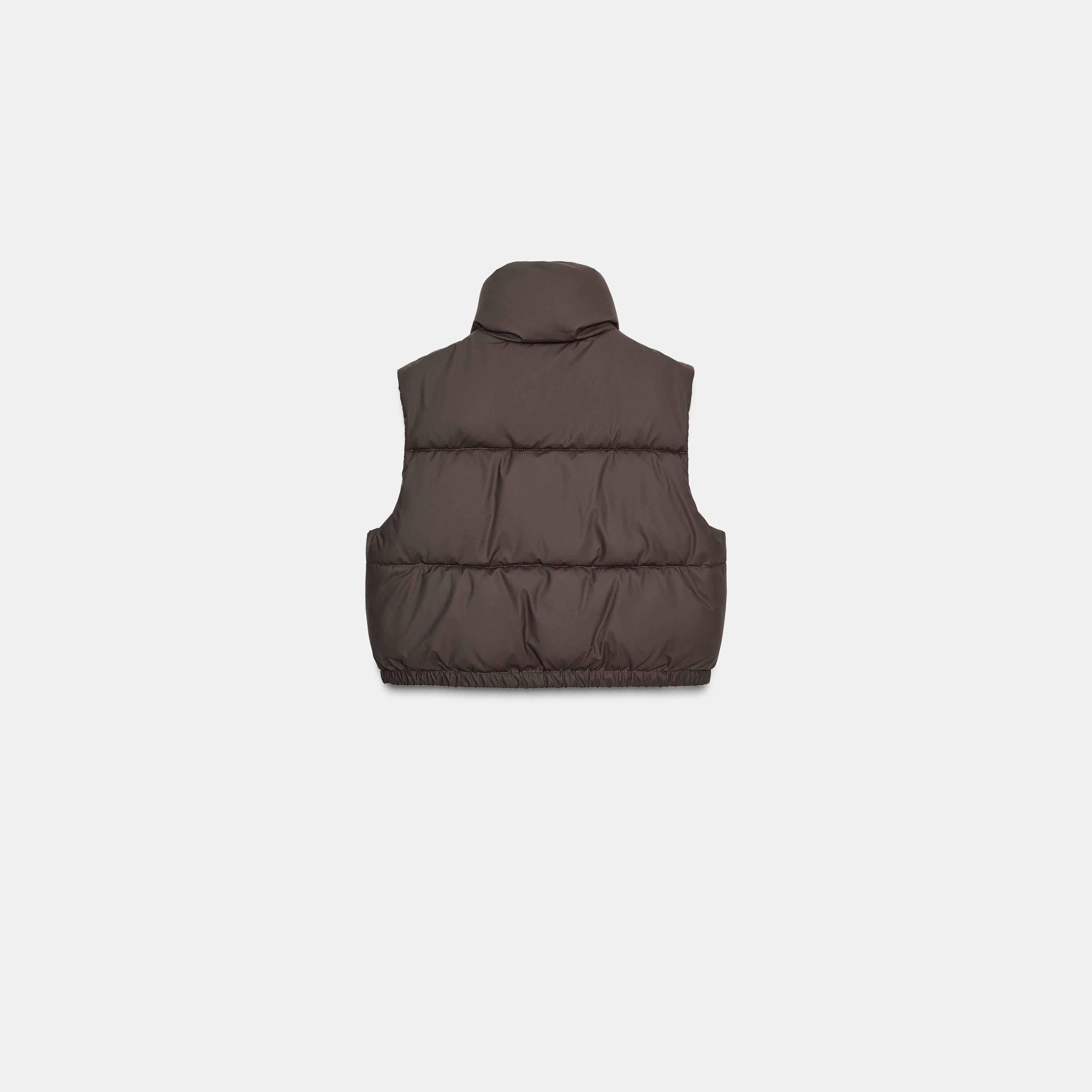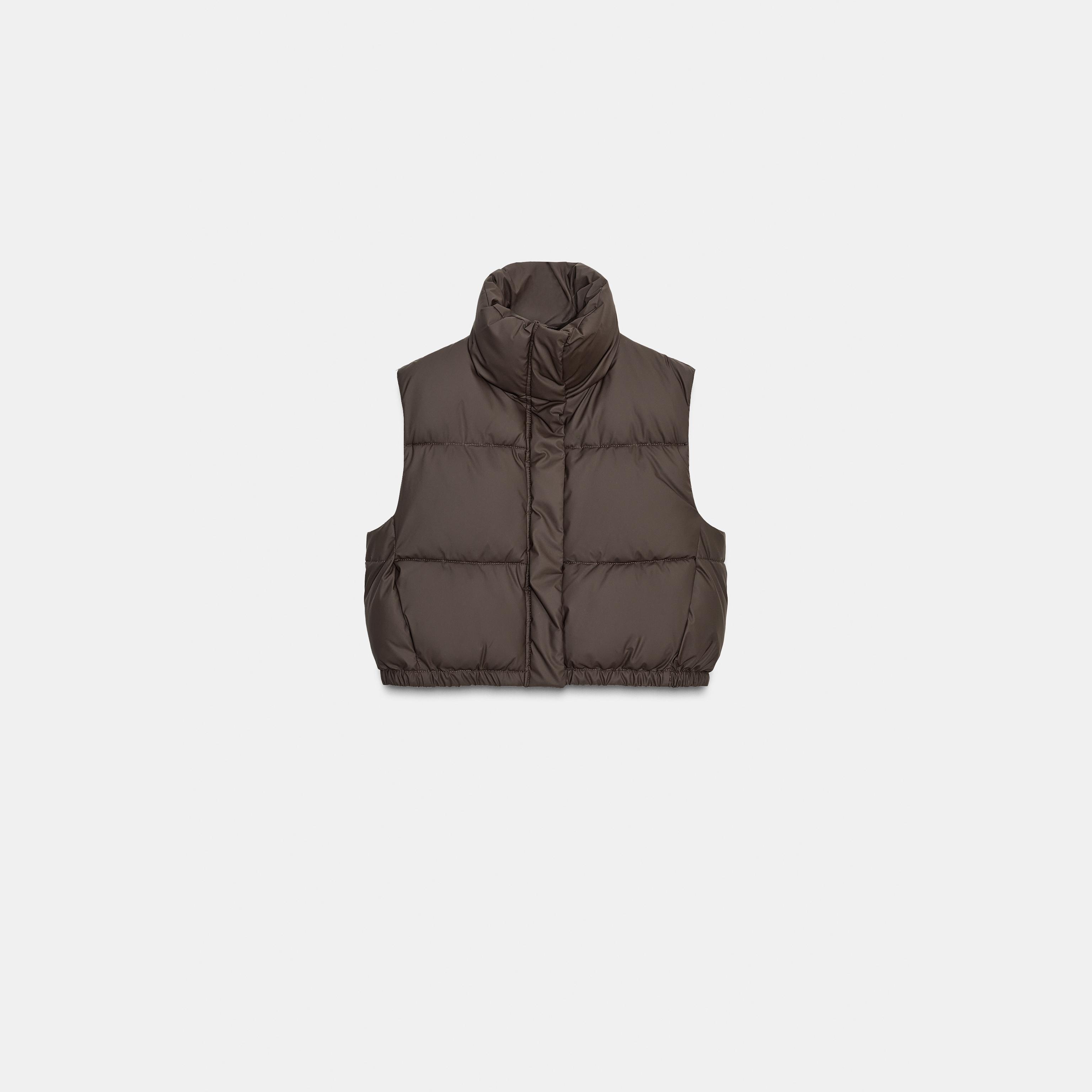 جيليه مبطن أنيق بلون بني داكن غني، مصنوع من خامة بوليستر مع طبقة مطاطية تمنح مظهرًا عصريًا وحماية إضافية. يتميز بياقة عالية بدون أكمام، مع جيوب جانبية عملية، وحاشية قابلة للتعديل بواسطة أربطة مطاطية مع سدادات، وإغلاق أمامي بسحاب وأزرار كبس. تصميم مثالي للإطلالات العملية والرياضية في المواسم الانتقالية.