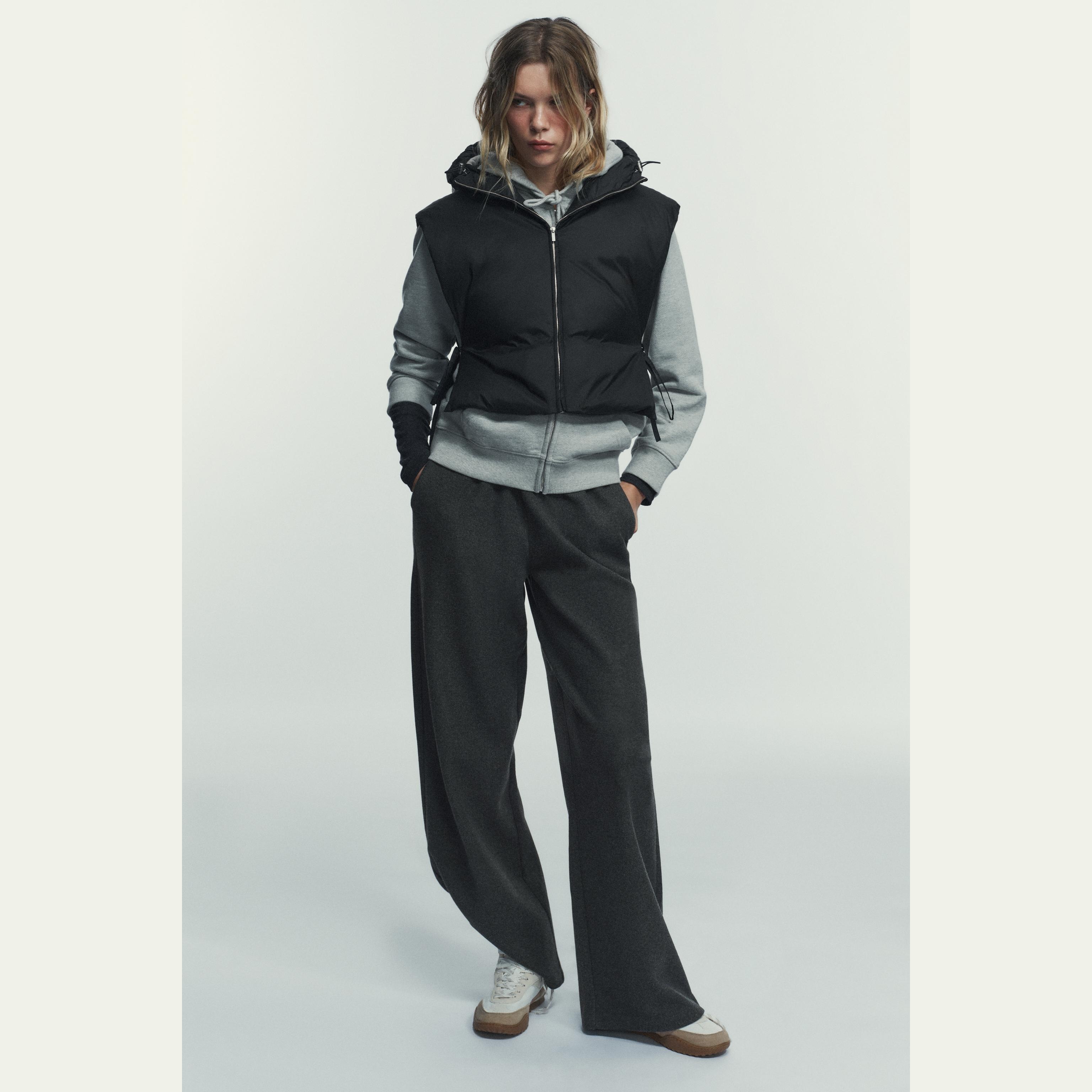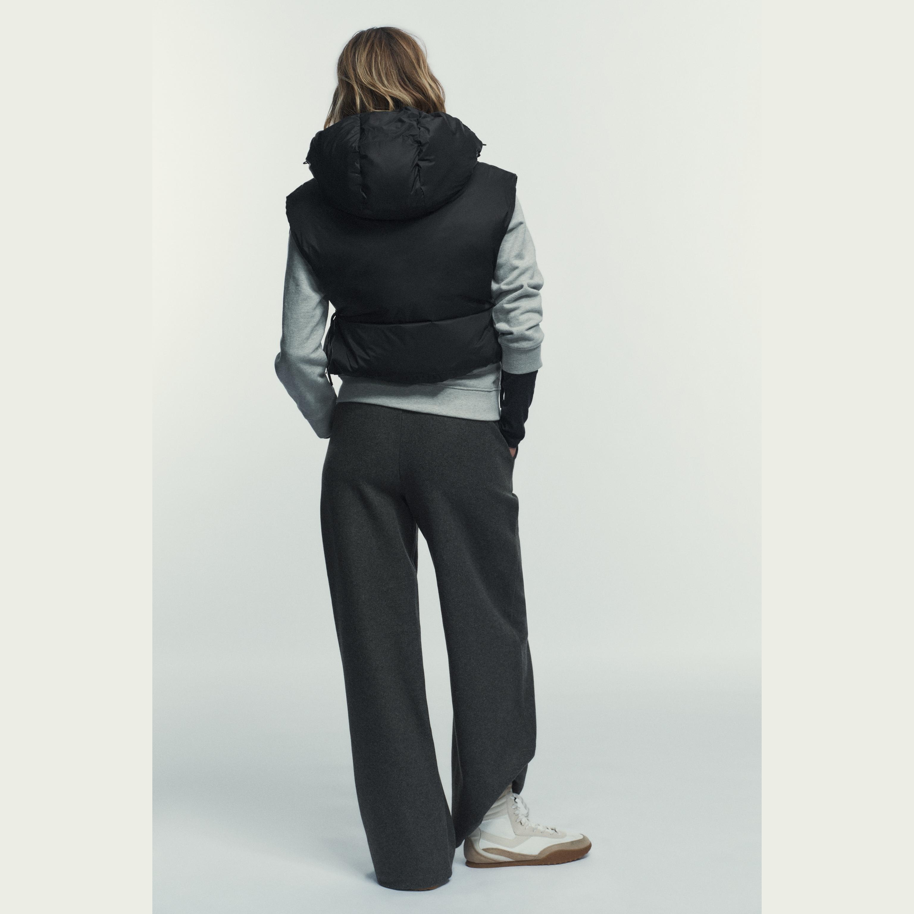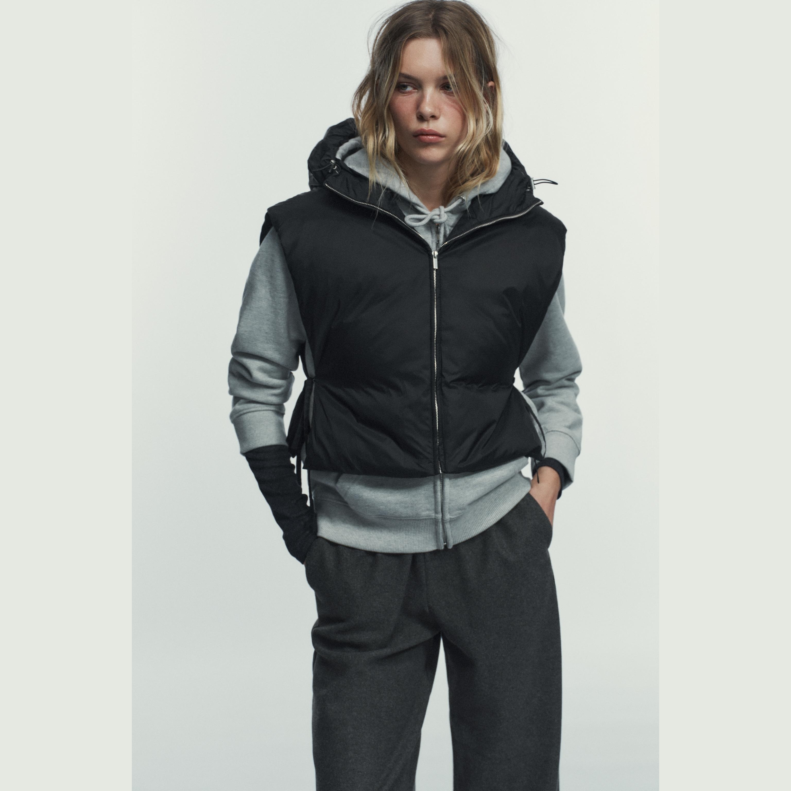 جيليه مبطن أنيق بلون أسود كلاسيكي، مصنوع من خامة بولي أميد مع حشوة طبيعية من ريش البط الرمادي (70% داون، 30% ريش). يتميز بياقة عالية مع غطاء رأس قابل للتعديل، تصميم بدون أكمام، مع أربطة جانبية قابلة للتعديل، وإغلاق أمامي بسحاب. قطعة مثالية للإطلالات العملية والعصرية في المواسم الباردة.