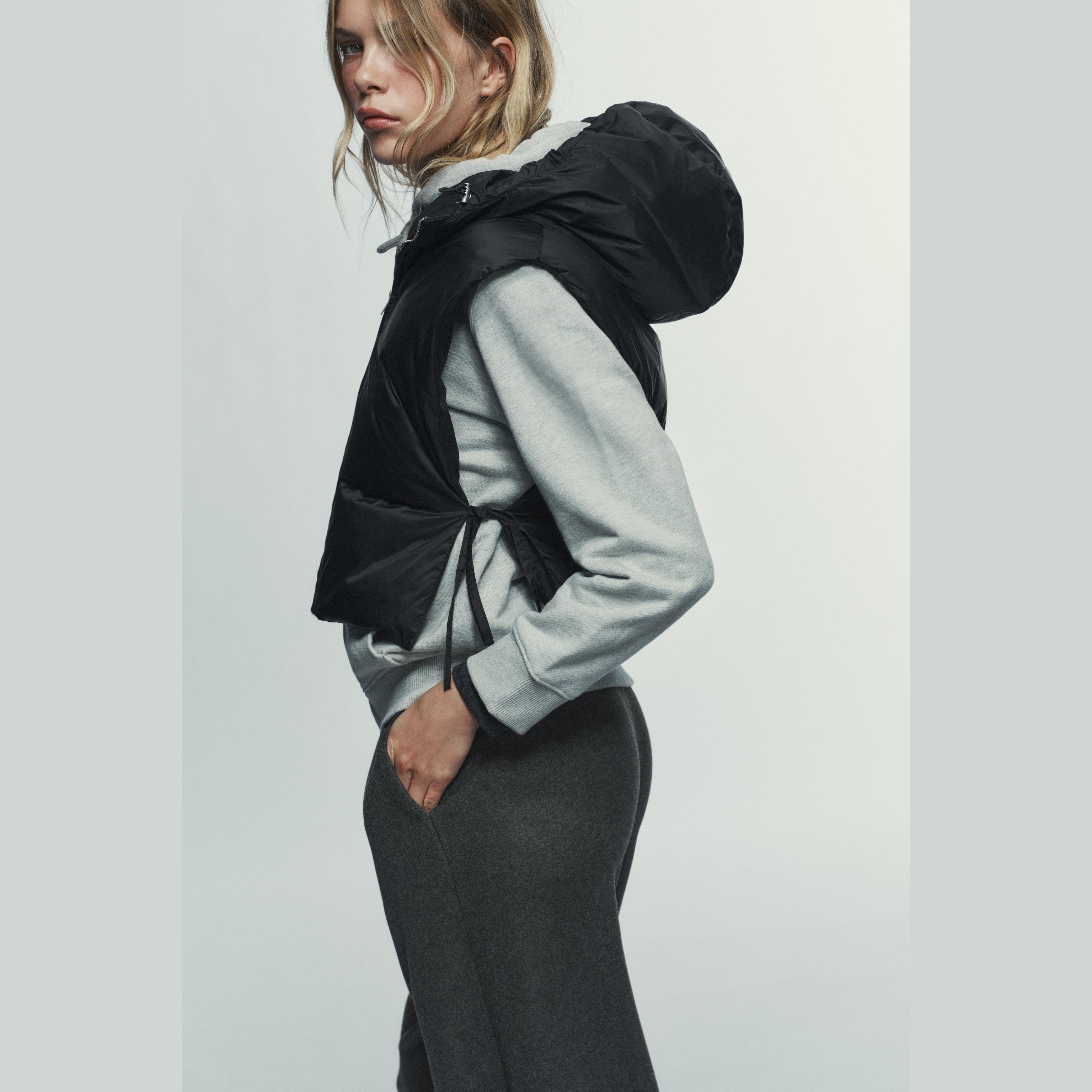 - التصميم: جيليه مبطن بريش مع أربطة جانبية (Down Puffer Gilet with Ties)