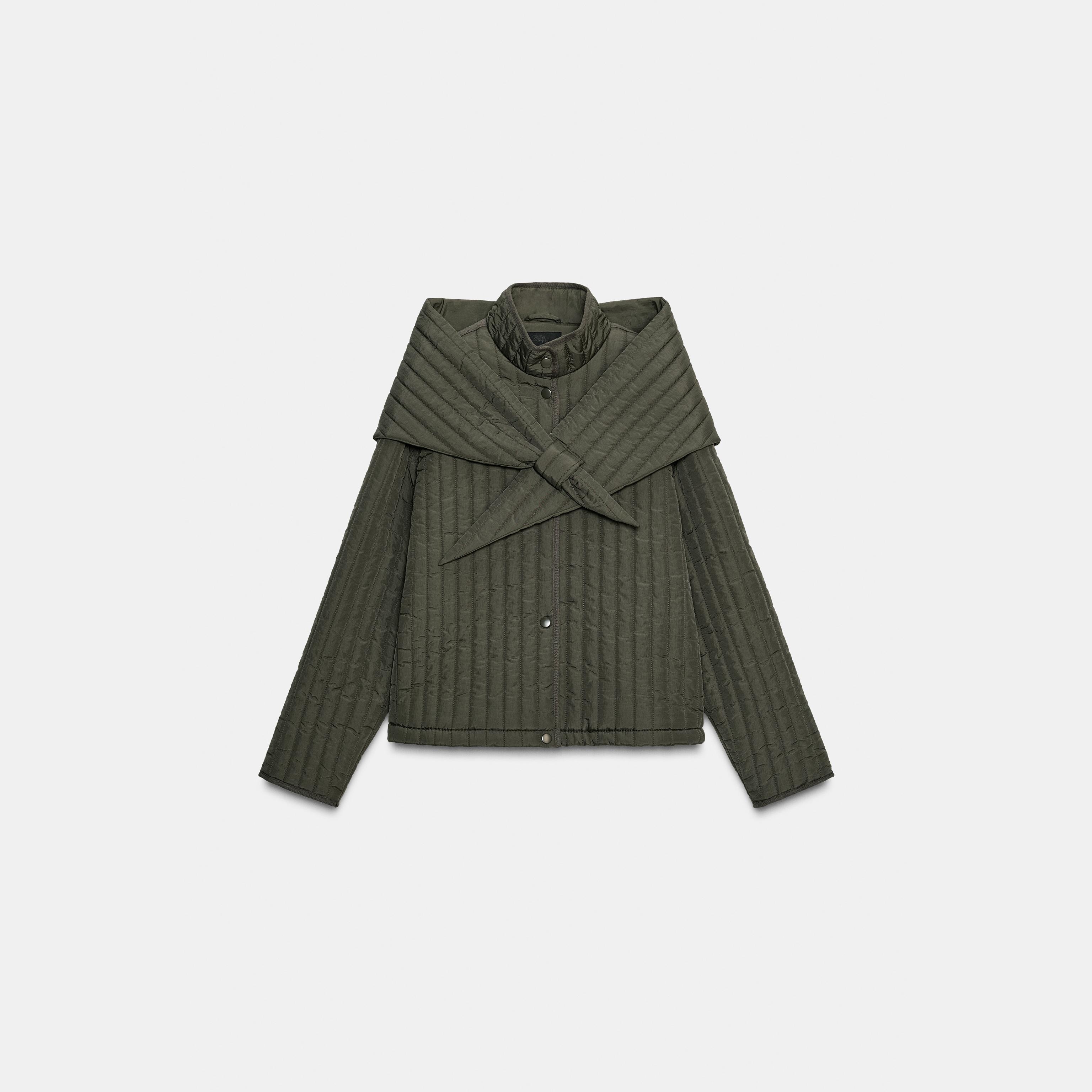 جاكيت نسائي مبطن – لون حيادي (كاكي داكن) – Dark Khaki، مع وشاح قابل للفصل (Quilted Jacket with Detachable Scarf)