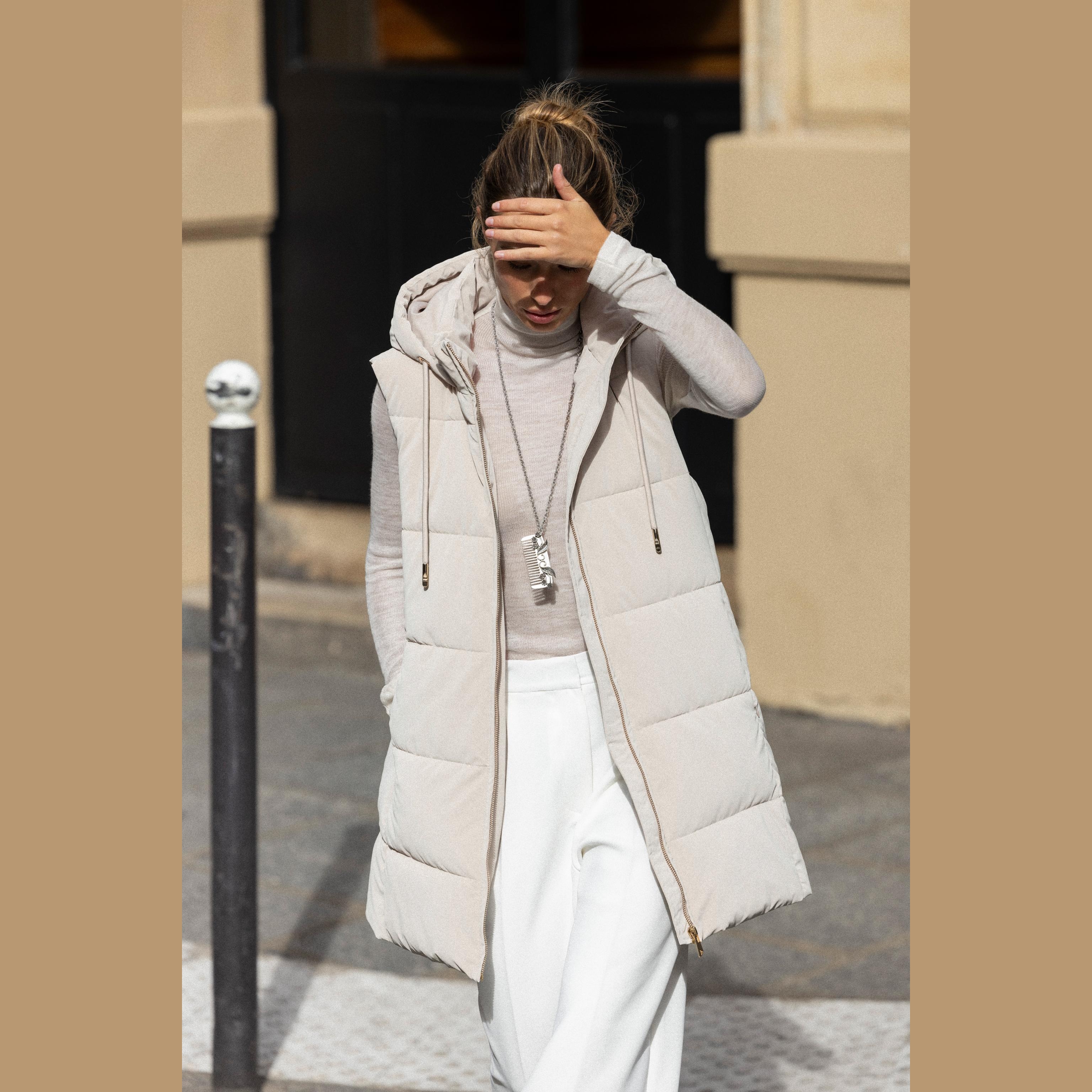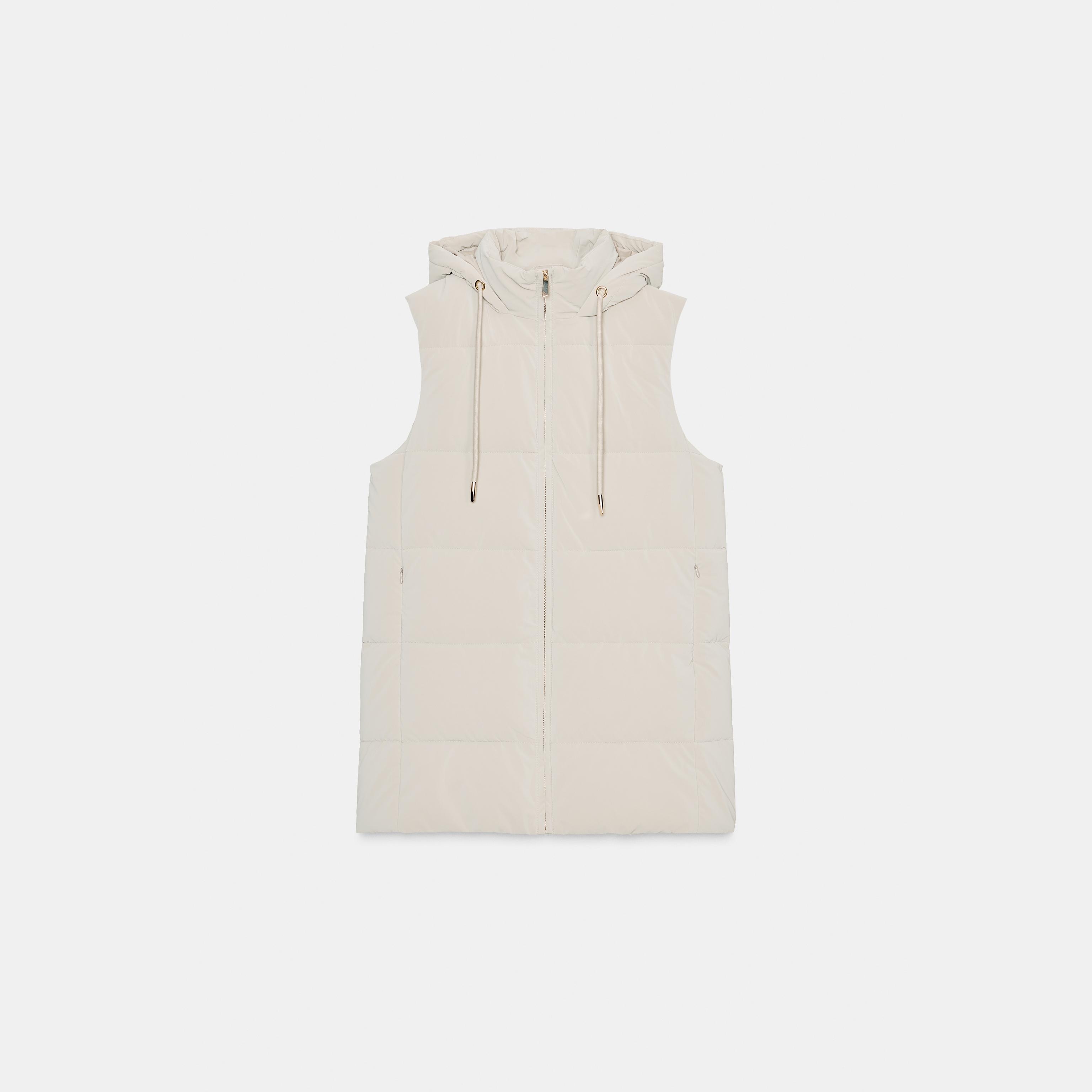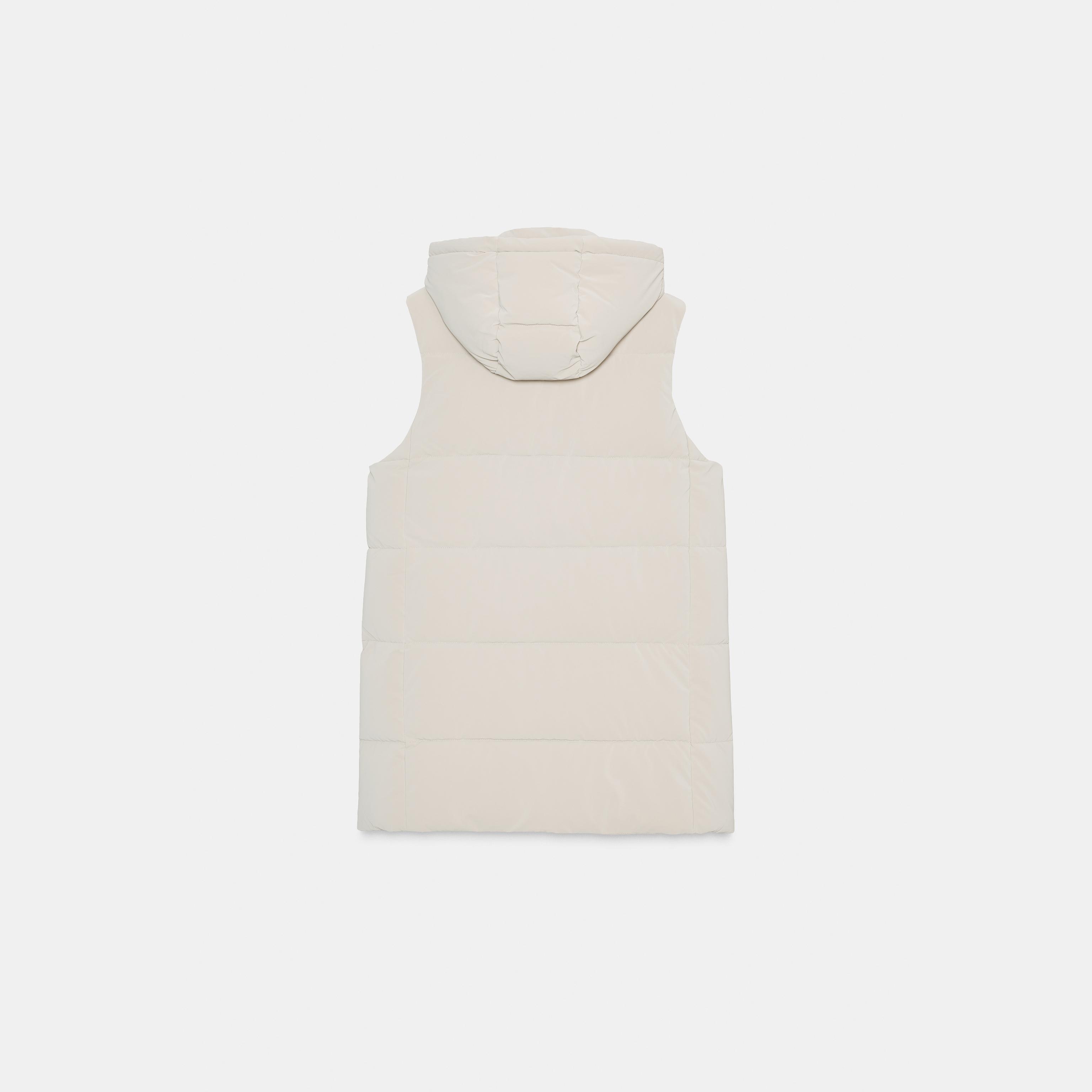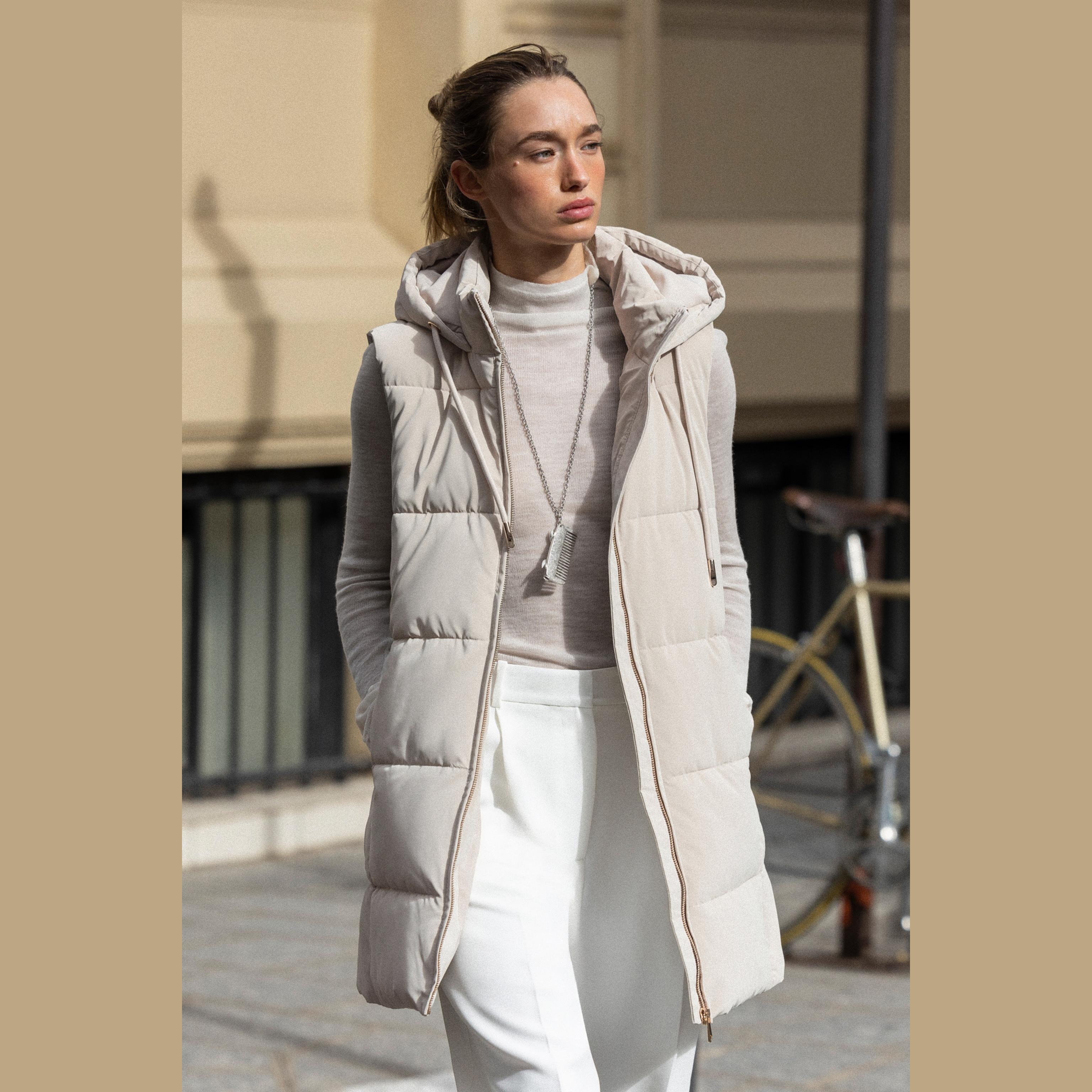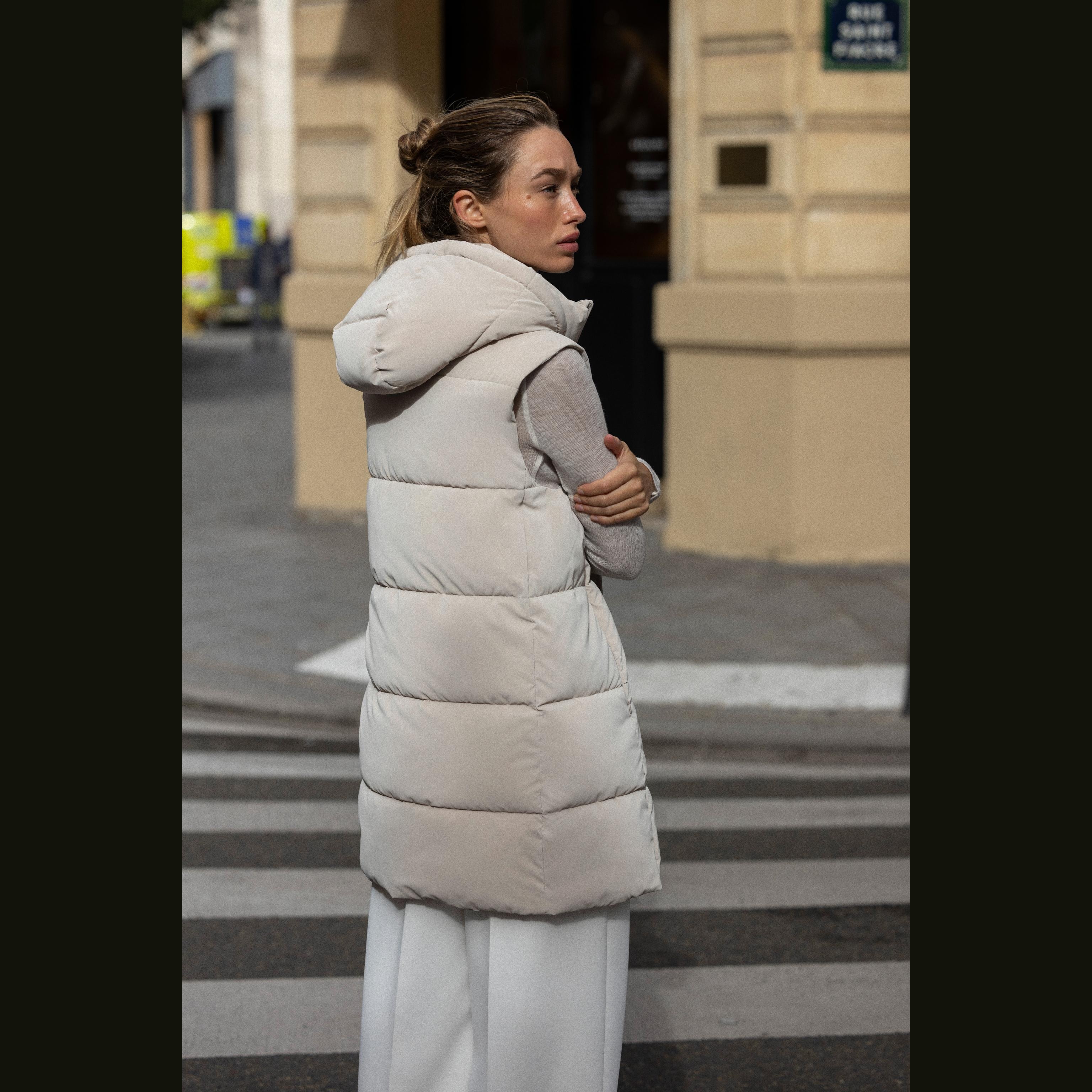 جيليه نسائي طويل مبطن – لون حيادي (إكروا) – Ecru، مع غطاء رأس (Long Quilted Gilet with Hood)