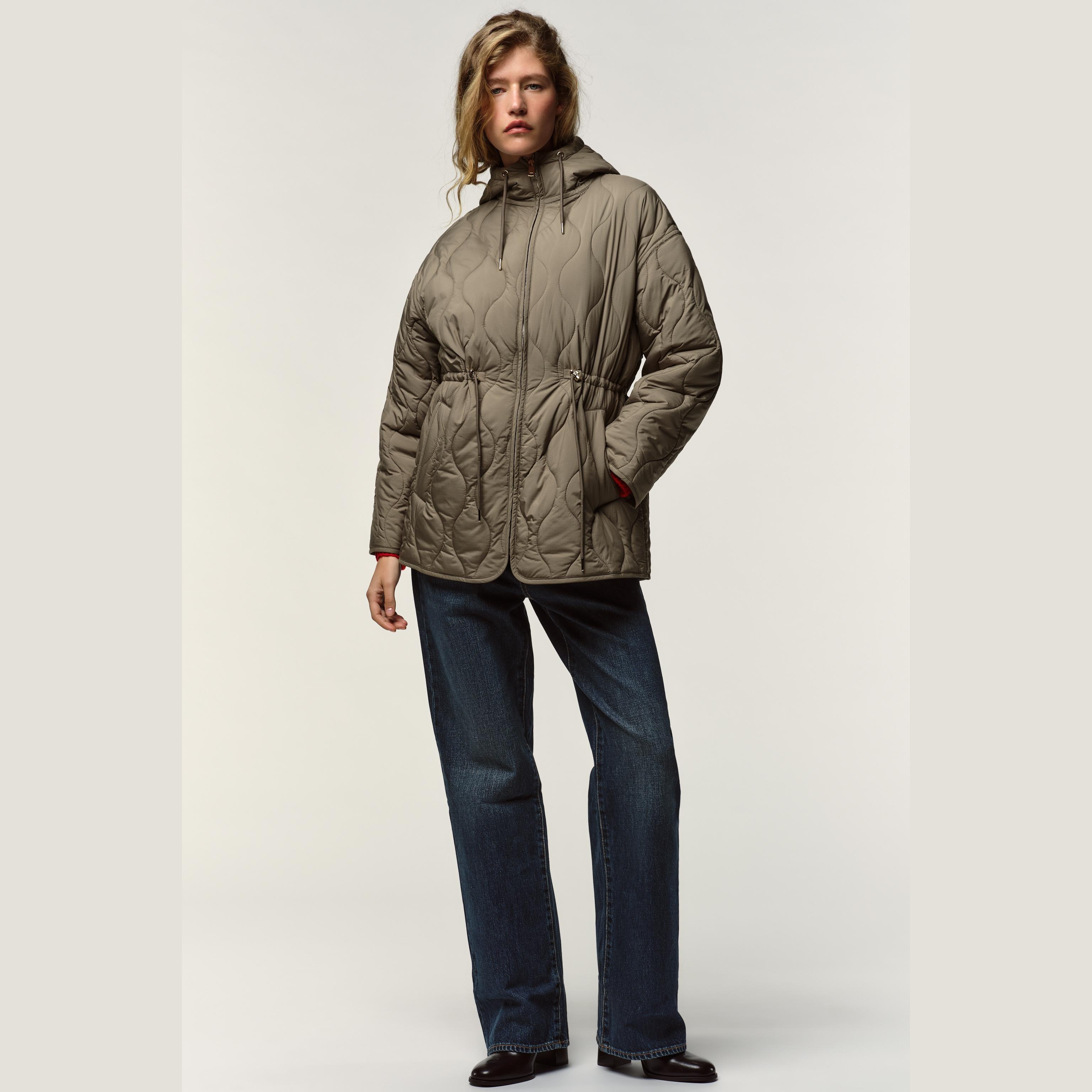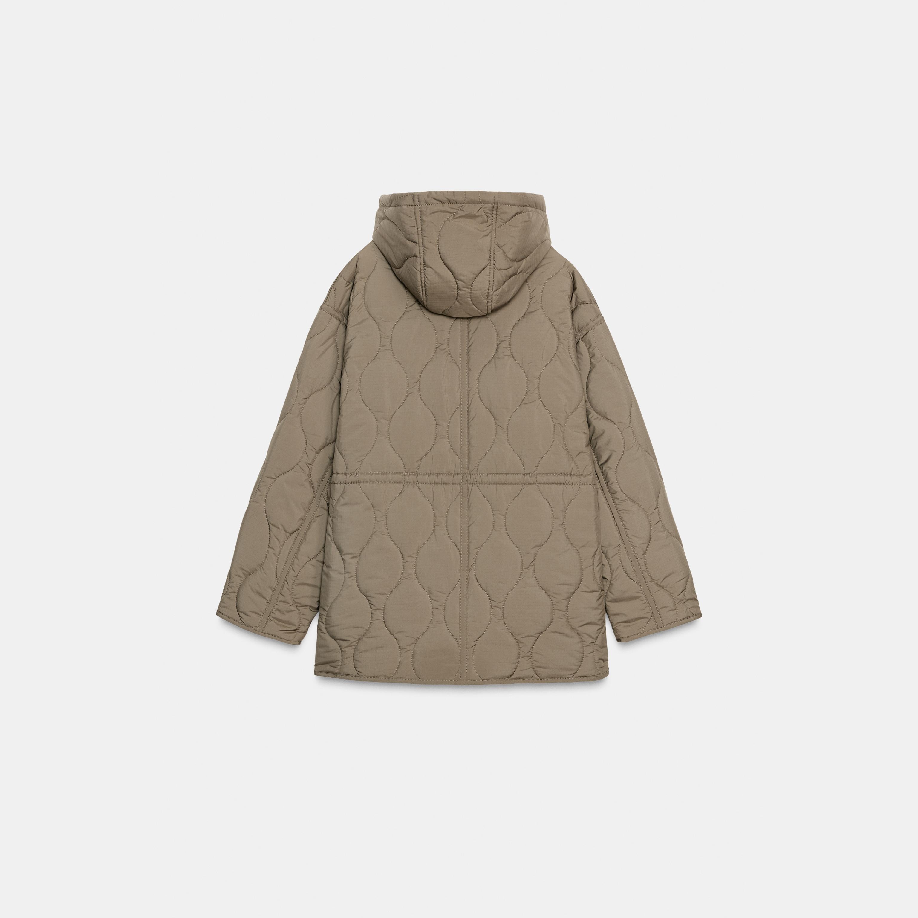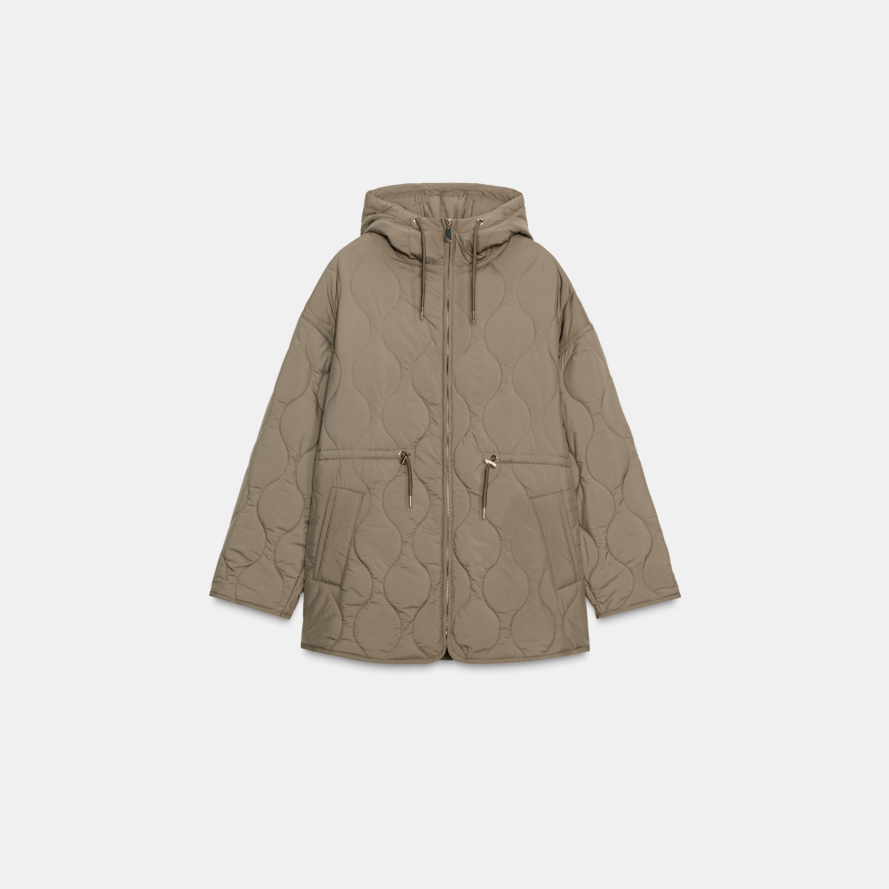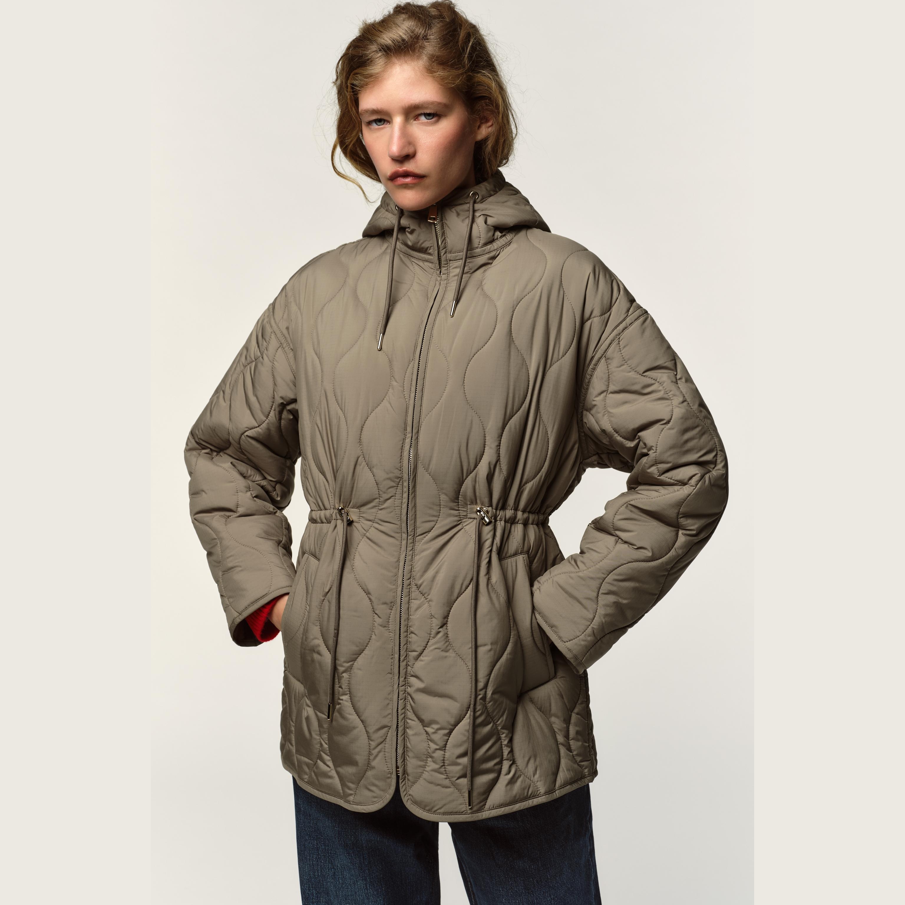جاكيت نسائي مبطن – لون حيادي (كاكي) – Khaki، مقاوم للماء مع غطاء رأس (Water-Repellent Quilted Jacket with Hoodie)