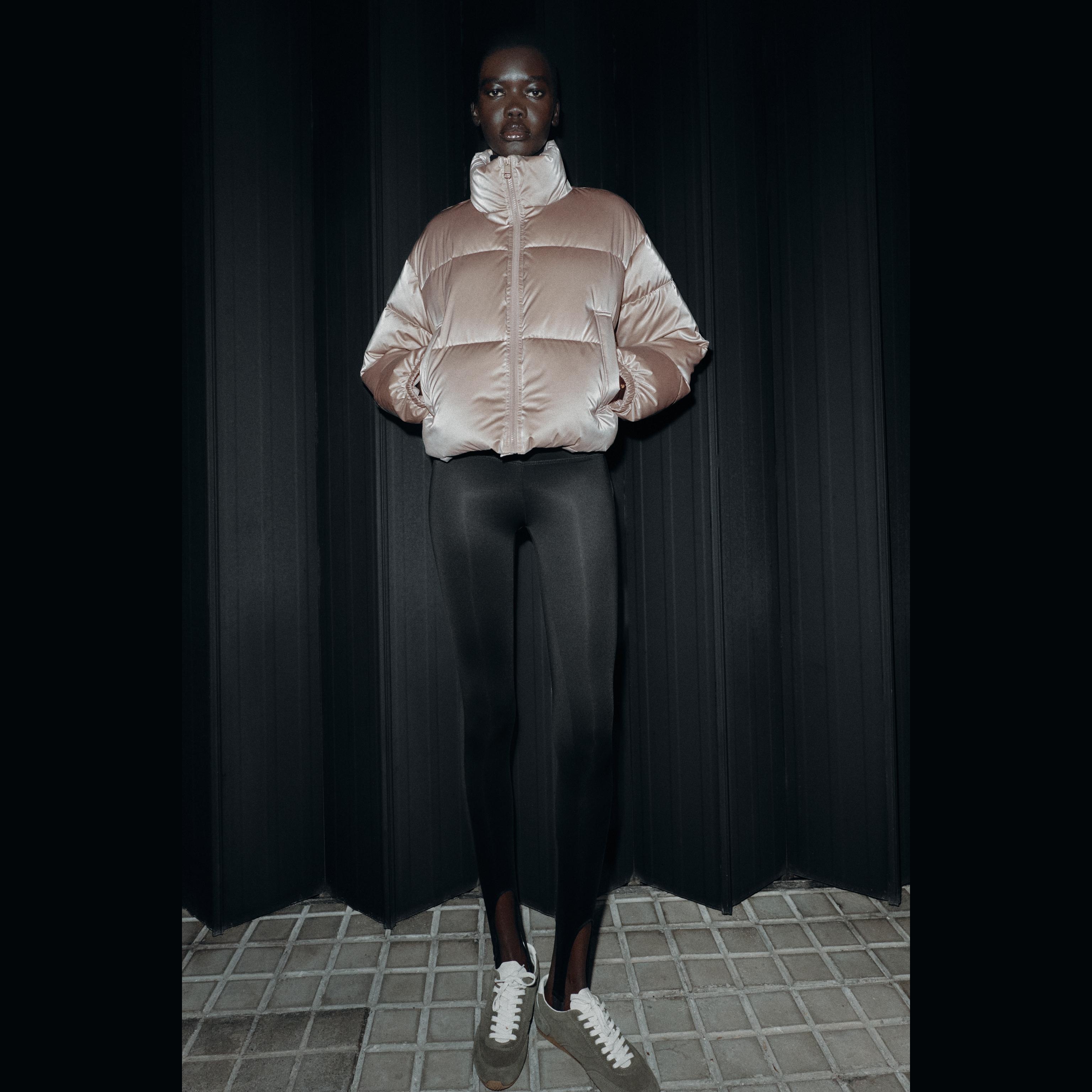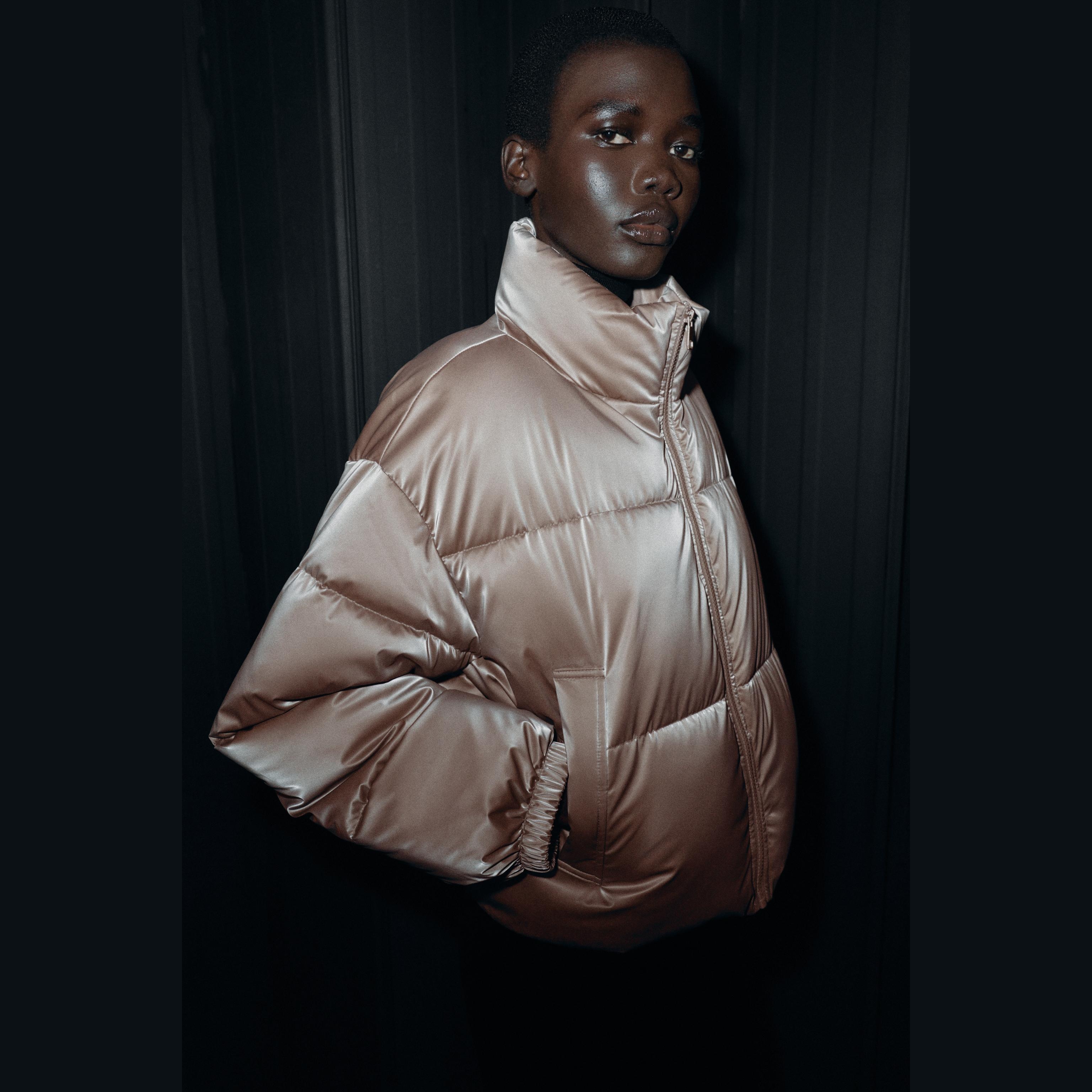 جاكيت أنوراك مبطن أنيق بلون إكروا حيادي بتأثير لامع، مصنوع من خامة بوليستر مع طبقة بولي يوريثان تمنح مظهرًا عصريًا وحماية إضافية ضد الماء والرياح. يتميز بياقة عالية وأكمام طويلة مع حواف مطاطية، مع جيوب أمامية مبطنة بملمس فليسي، وحاشية قابلة للتعديل بواسطة أربطة جانبية، وإغلاق أمامي بسحاب معدني. يوفر دفئًا وراحة في الطقس البارد، مع مقاومة للمطر الخفيف والرياح القوية.