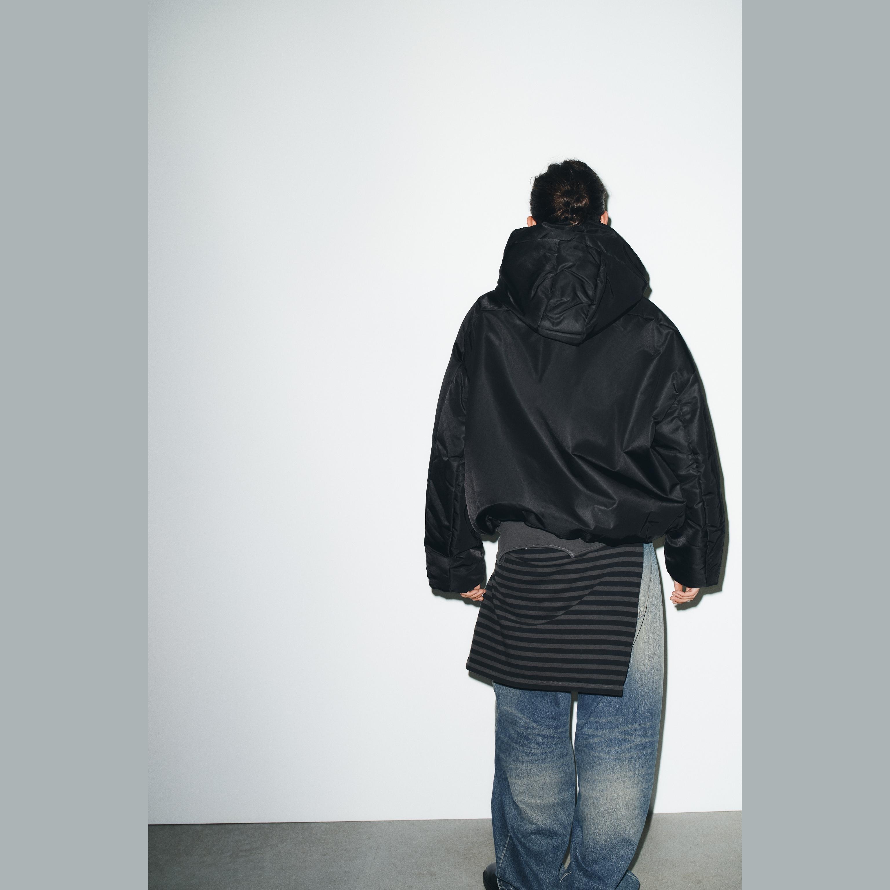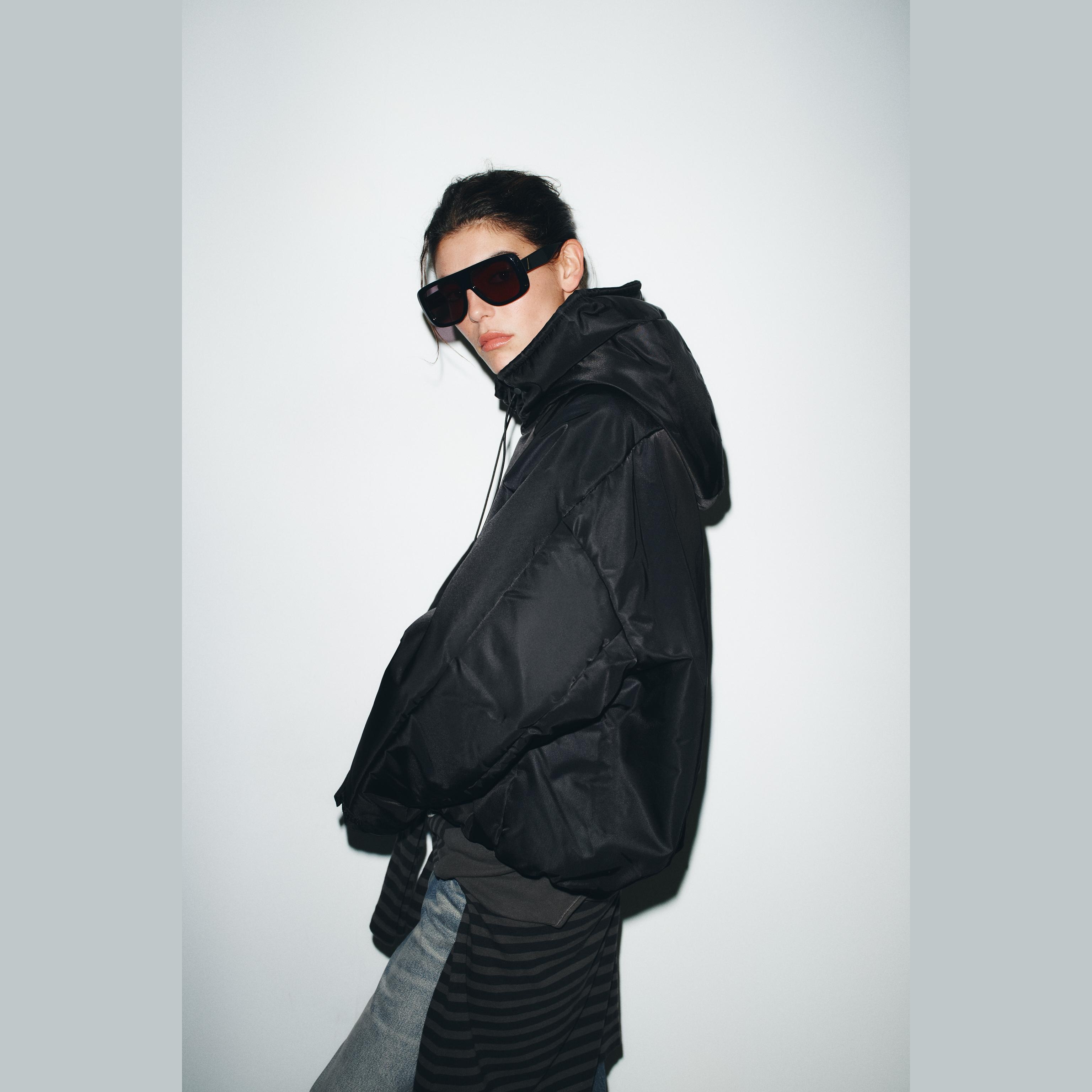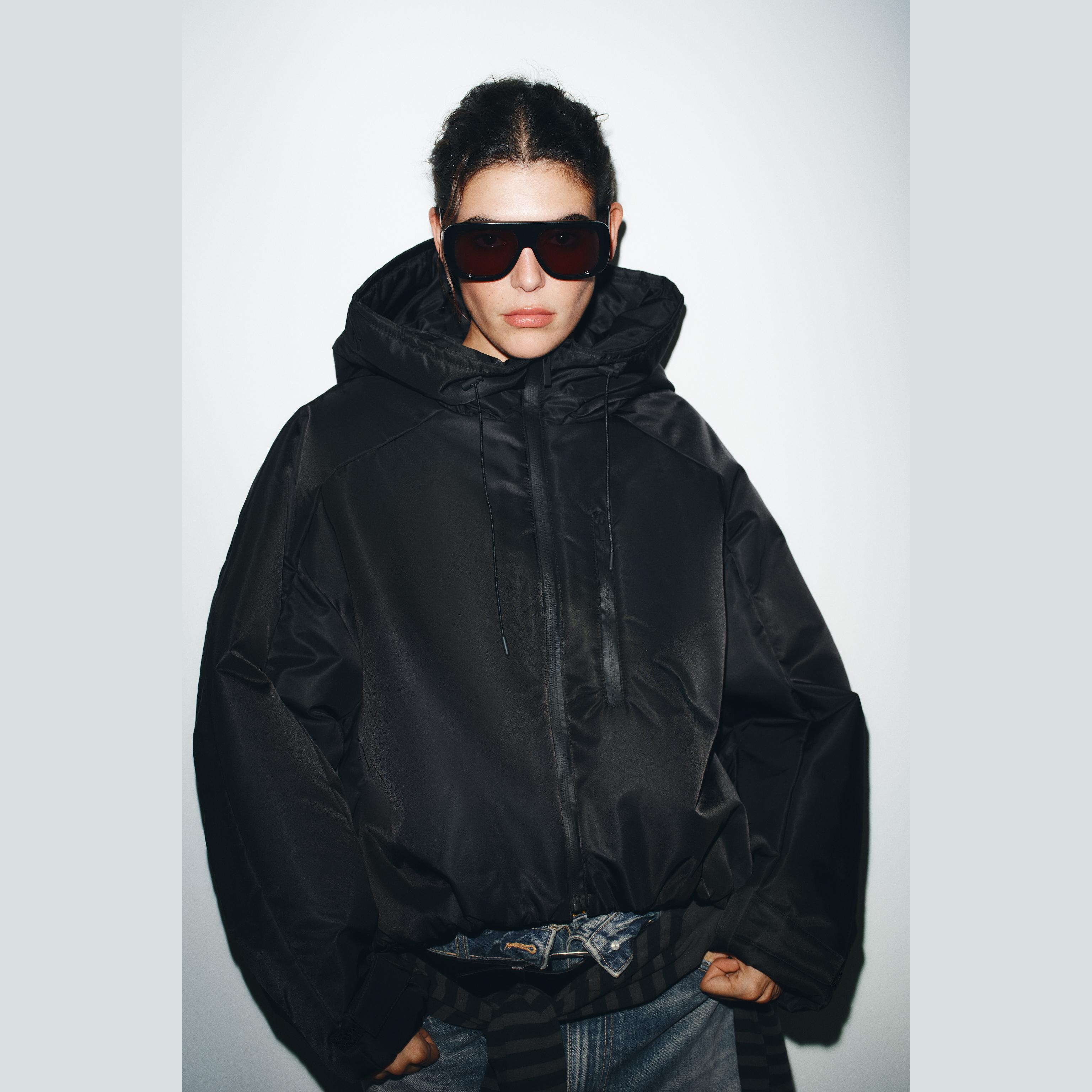 جاكيت مبطن قصير أنيق بلون أسود كلاسيكي، مصنوع من خامة بوليستر مقاومة للماء والرياح، مع بطانة مبطنة تمنح دفئًا وراحة في الارتداء. يتميز بياقة عالية مع غطاء رأس عملي، وأكمام طويلة مع حواف مطاطية، مع جيوب أمامية بسحاب، وحاشية مستقيمة قابلة للتعديل، وإغلاق أمامي بسحاب معدني. تصميم مثالي للإطلالات اليومية والأنشطة الخارجية في المواسم الباردة.