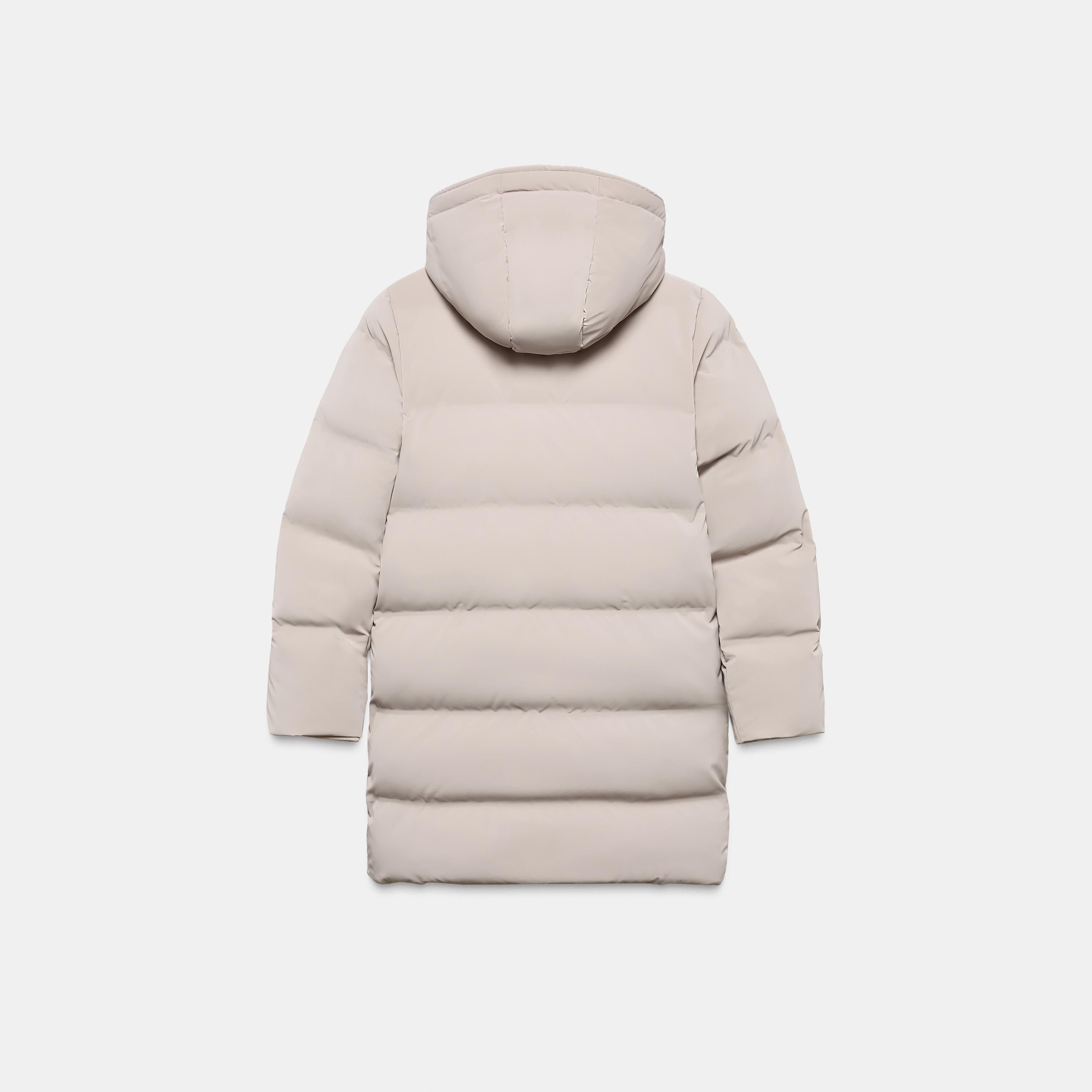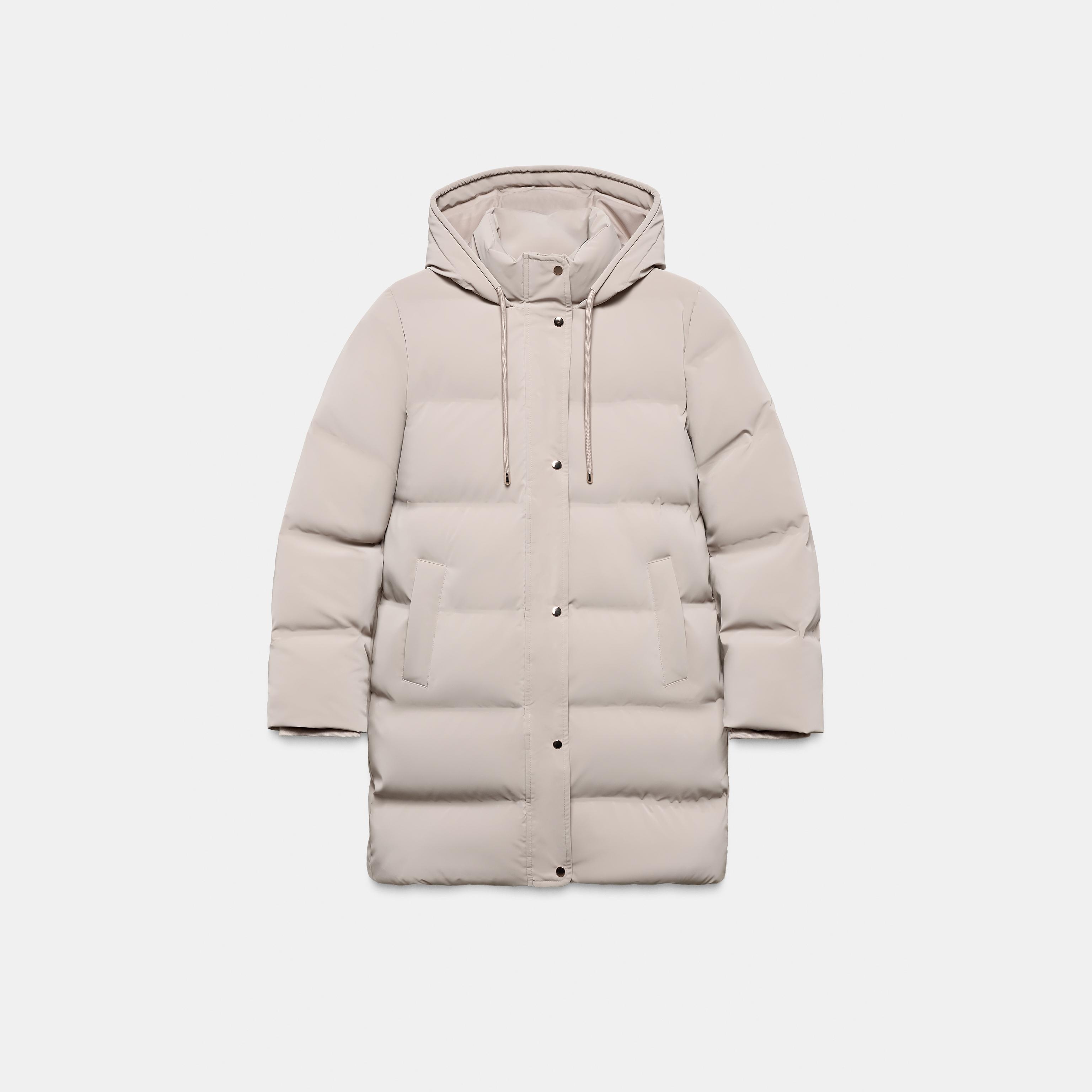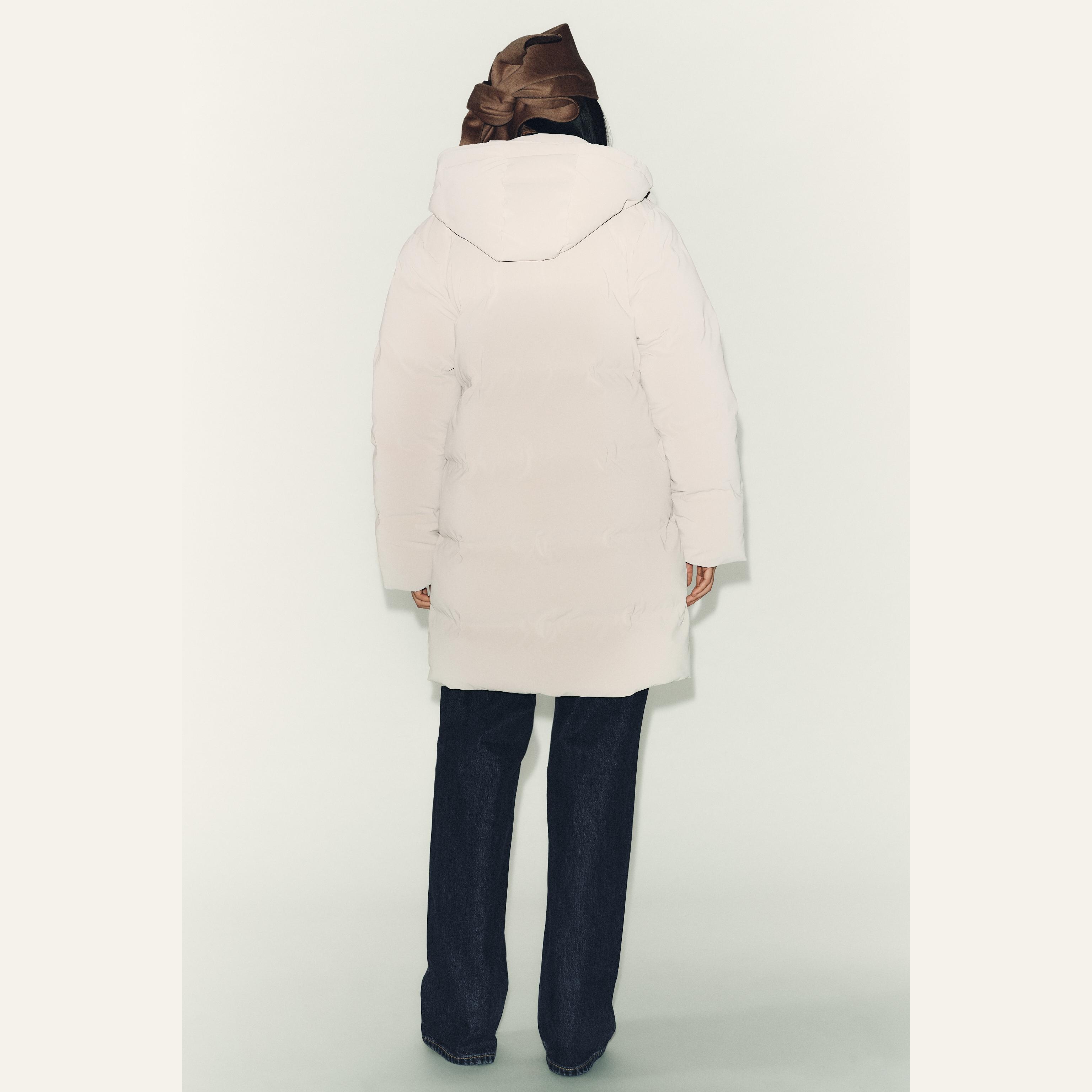 جاكيت أنوراك نصف طويل عملي بلون إكروا حيادي، مصنوع من خامة بوليستر مع طبقة مطاطية (Rubberised Coating) تمنح مظهرًا عصريًا وحماية إضافية ضد الرياح. يتميز بياقة عالية مع غطاء رأس قابل للتعديل، وأكمام طويلة مع بطانة داخلية عند المعصم، مع جيوب أمامية مبطنة بملمس فليسي، وحاشية مستقيمة قابلة للتعديل، وإغلاق أمامي بسحاب معدني وأزرار كبس مخفية. يوفر دفئًا وراحة في الطقس البارد، مع تصميم أنيق يناسب الإطلالات اليومية والأنشطة الخارجية.