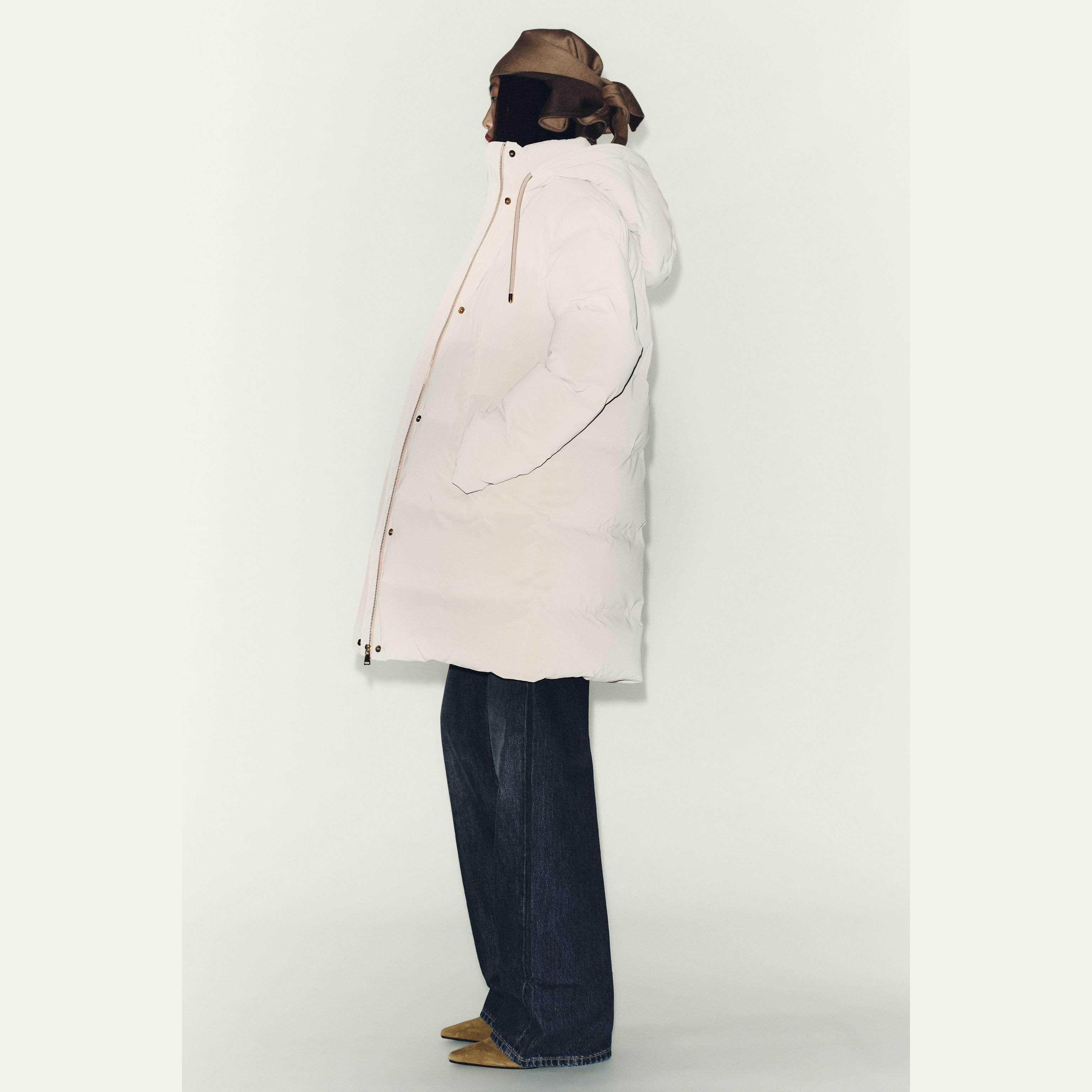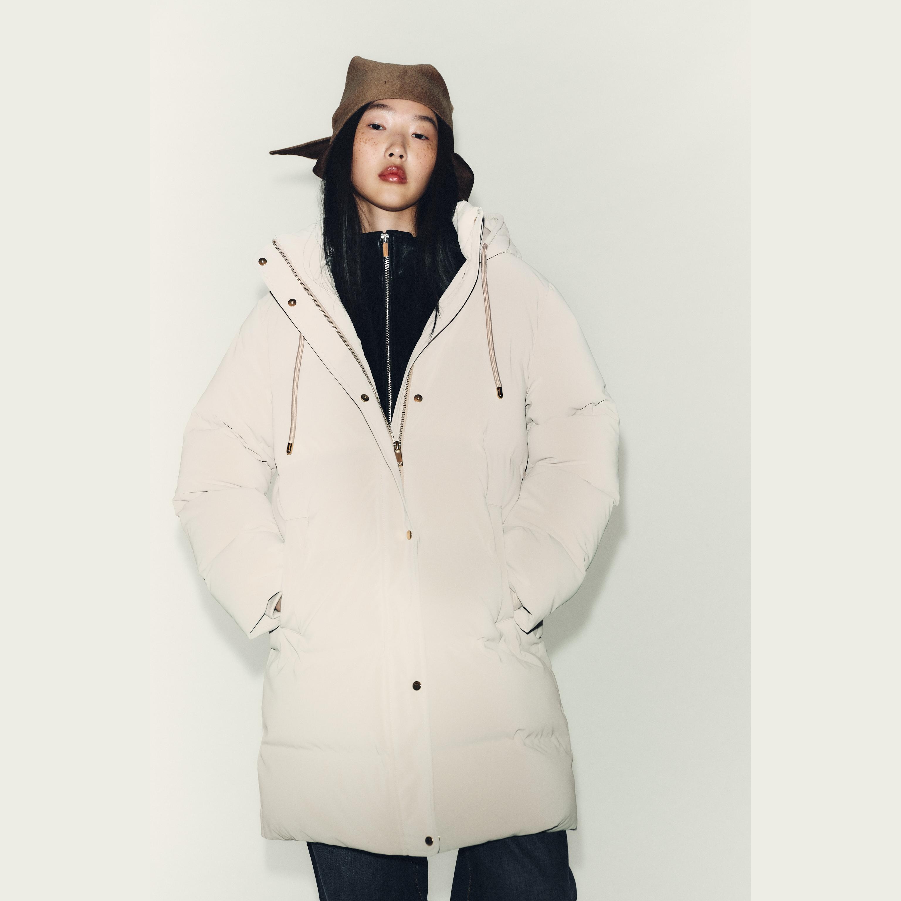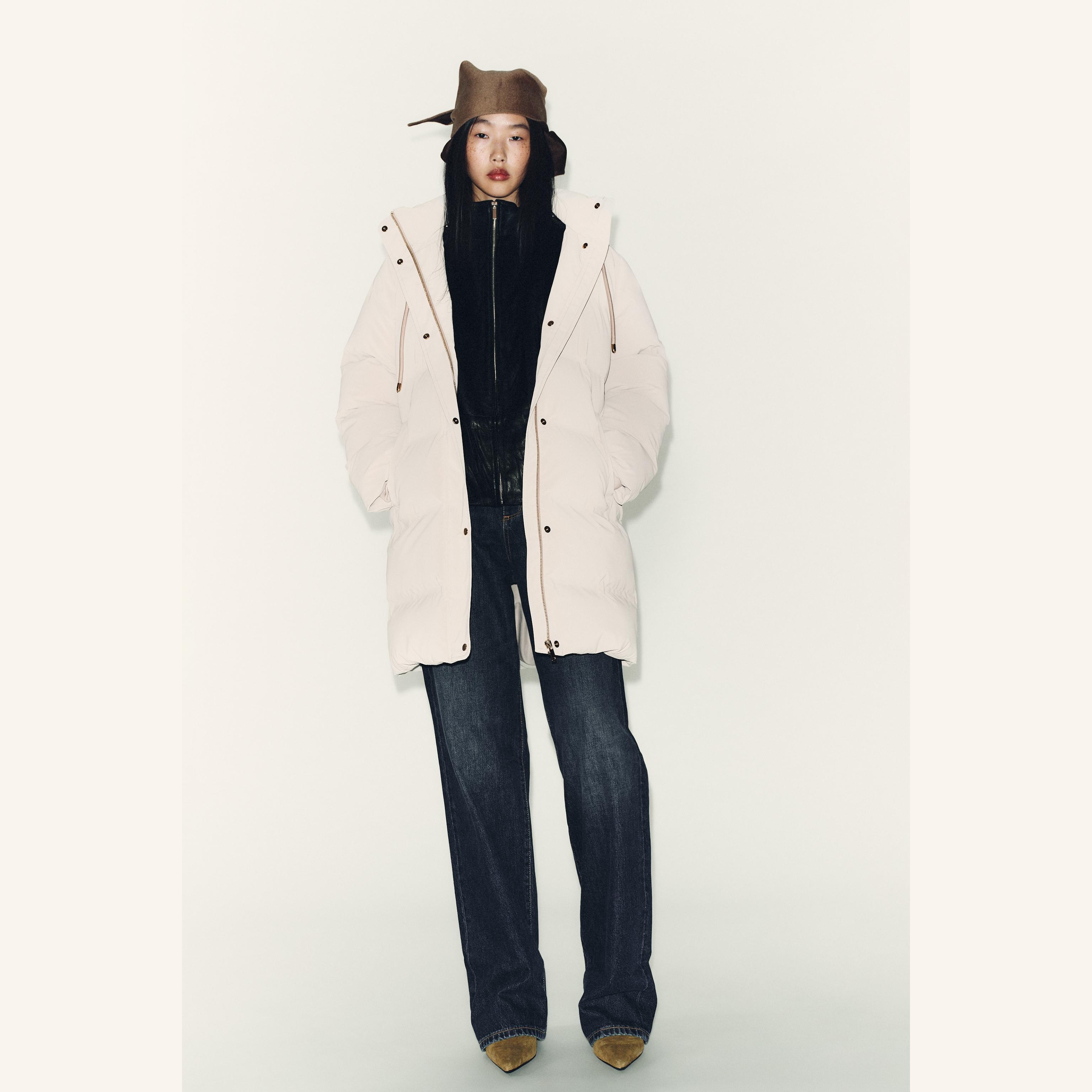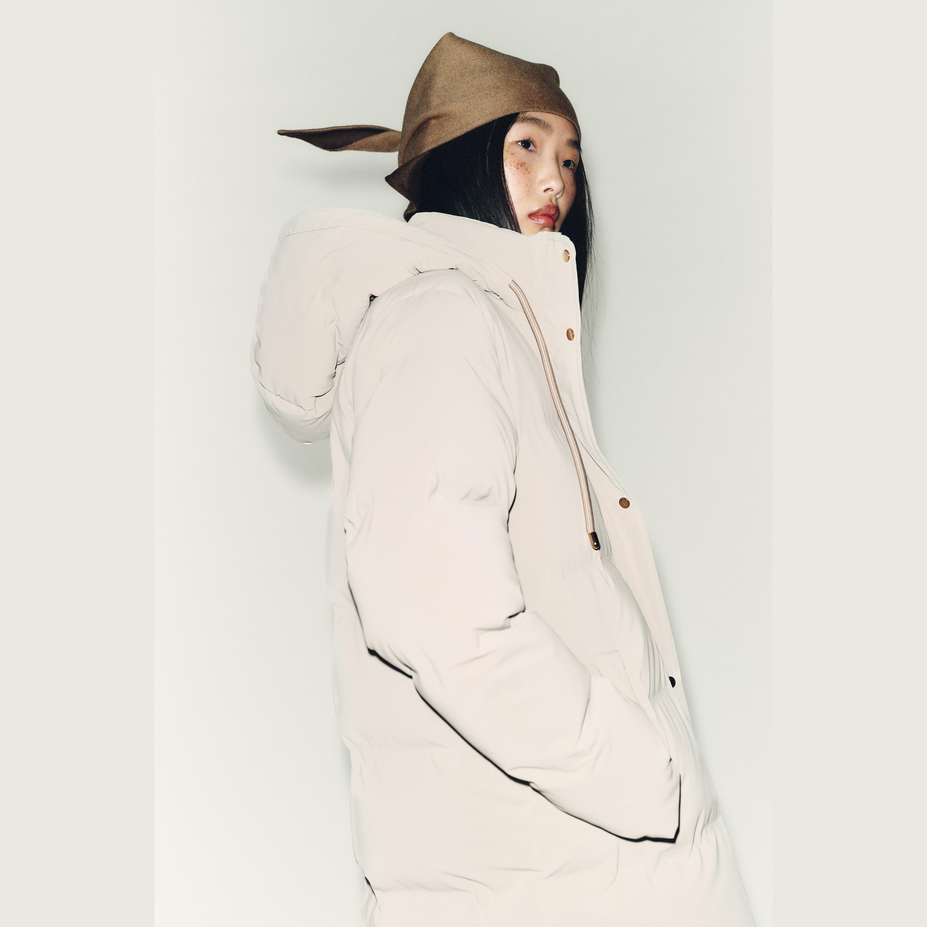 جاكيت أنوراك نصف طويل عملي بلون إكروا حيادي، مصنوع من خامة بوليستر مع طبقة مطاطية (Rubberised Coating) تمنح مظهرًا عصريًا وحماية إضافية ضد الرياح. يتميز بياقة عالية مع غطاء رأس قابل للتعديل، وأكمام طويلة مع بطانة داخلية عند المعصم، مع جيوب أمامية مبطنة بملمس فليسي، وحاشية مستقيمة قابلة للتعديل، وإغلاق أمامي بسحاب معدني وأزرار كبس مخفية. يوفر دفئًا وراحة في الطقس البارد، مع تصميم أنيق يناسب الإطلالات اليومية والأنشطة الخارجية.