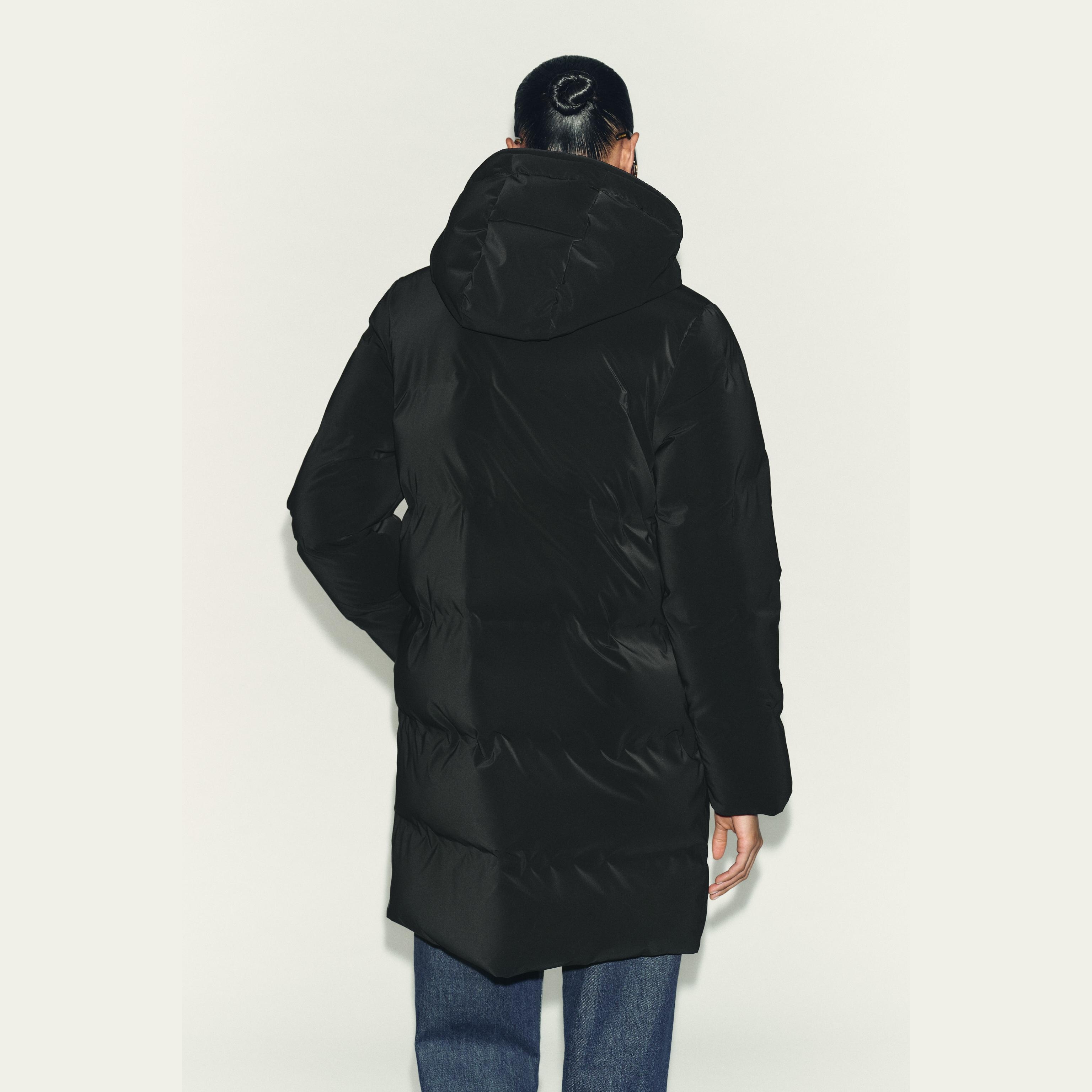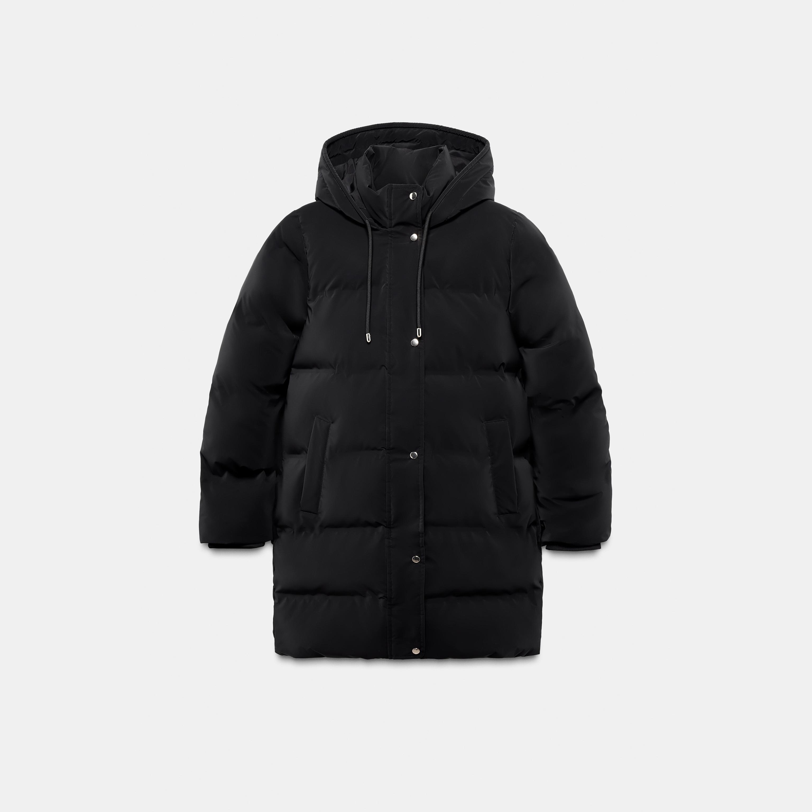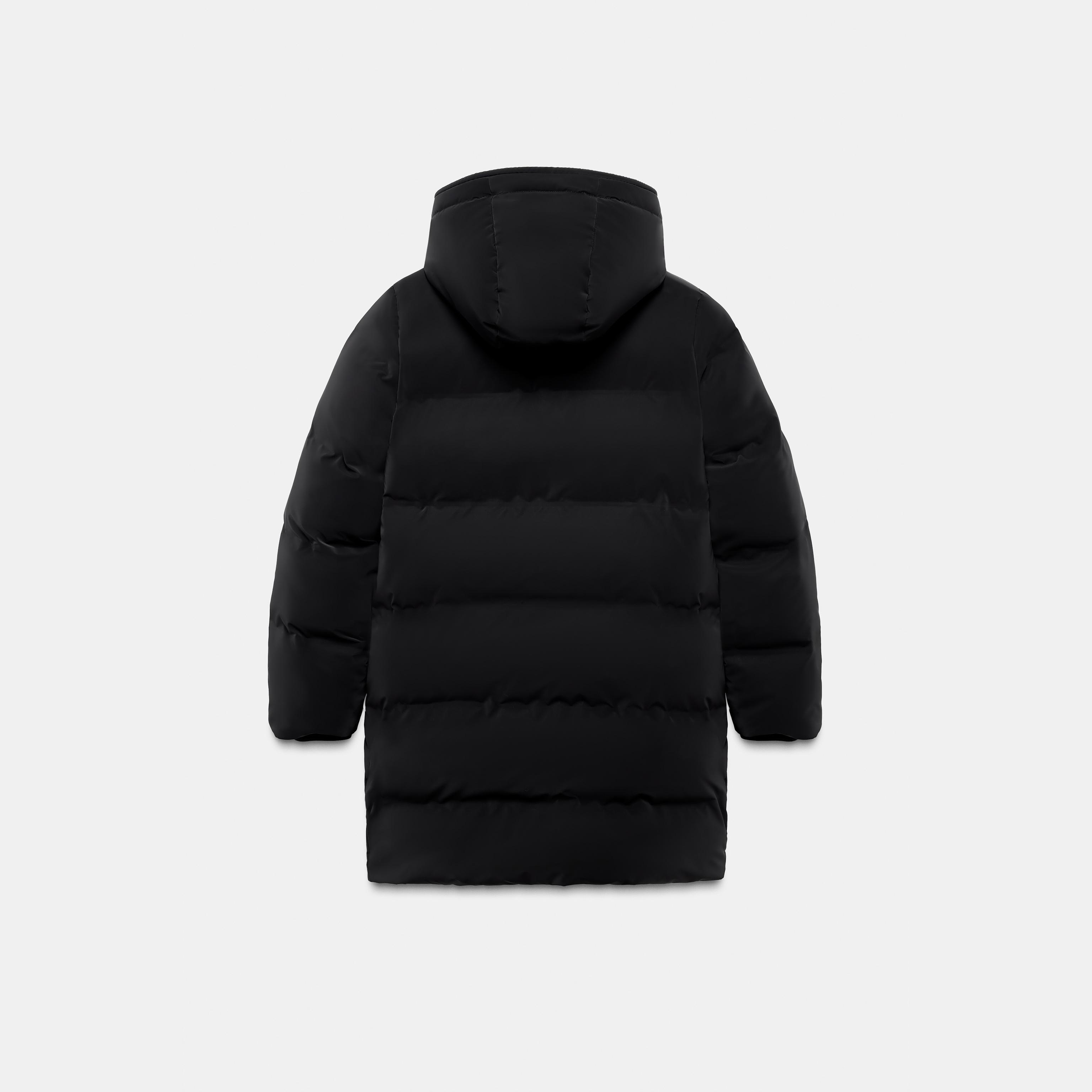 جاكيت أنوراك نصف طويل عملي بلون أسود كلاسيكي، مصنوع من خامة بوليستر مع طبقة مطاطية (Rubberised Coating) تمنح مظهرًا عصريًا وحماية إضافية ضد الرياح. يتميز بياقة عالية مع غطاء رأس قابل للتعديل، وأكمام طويلة مع بطانة داخلية عند المعصم، مع جيوب أمامية مبطنة بملمس فليسي، وحاشية مستقيمة قابلة للتعديل، وإغلاق أمامي بسحاب معدني وأزرار كبس مخفية. يوفر دفئًا وراحة في الطقس البارد، مع تصميم أنيق يناسب الإطلالات اليومية والأنشطة الخارجية.