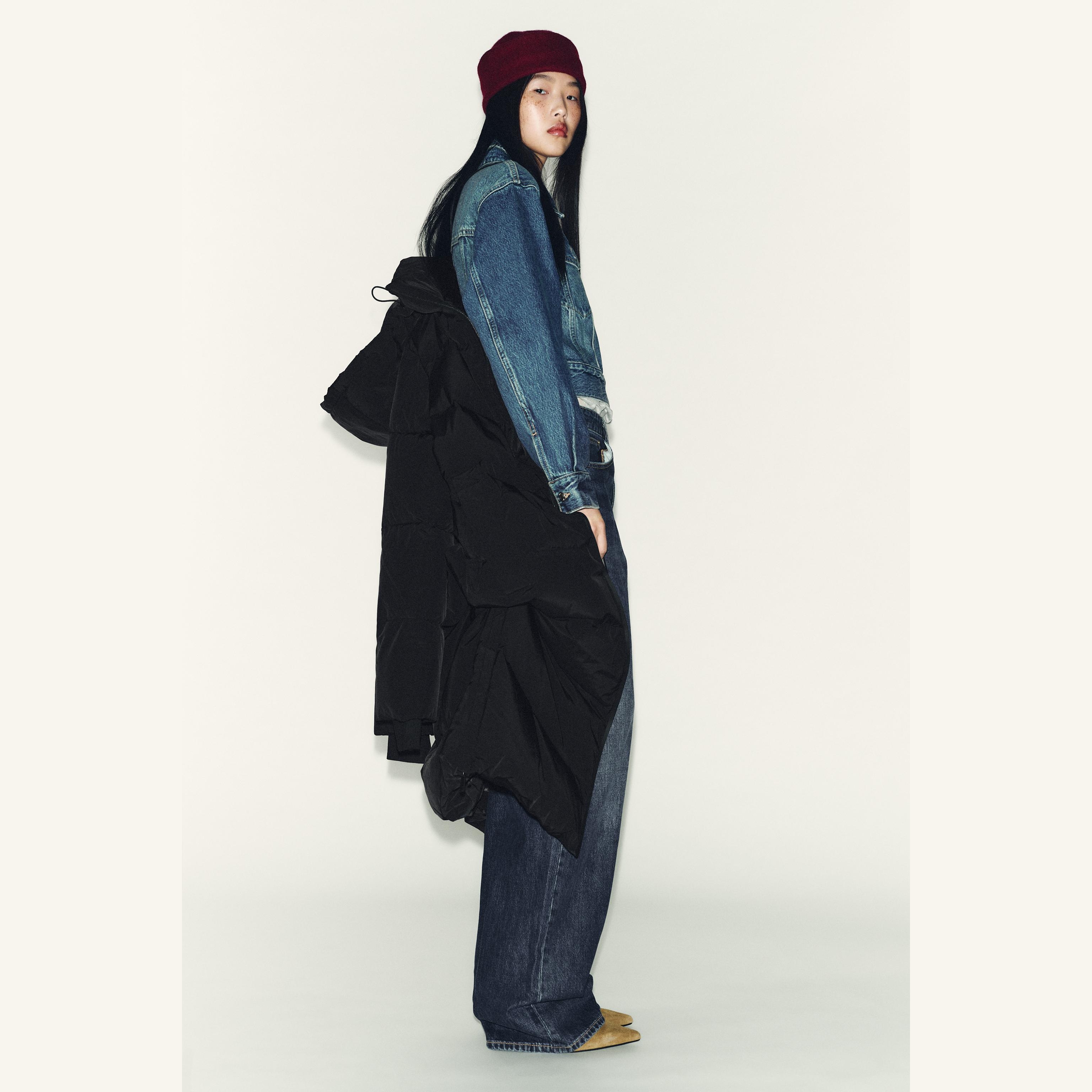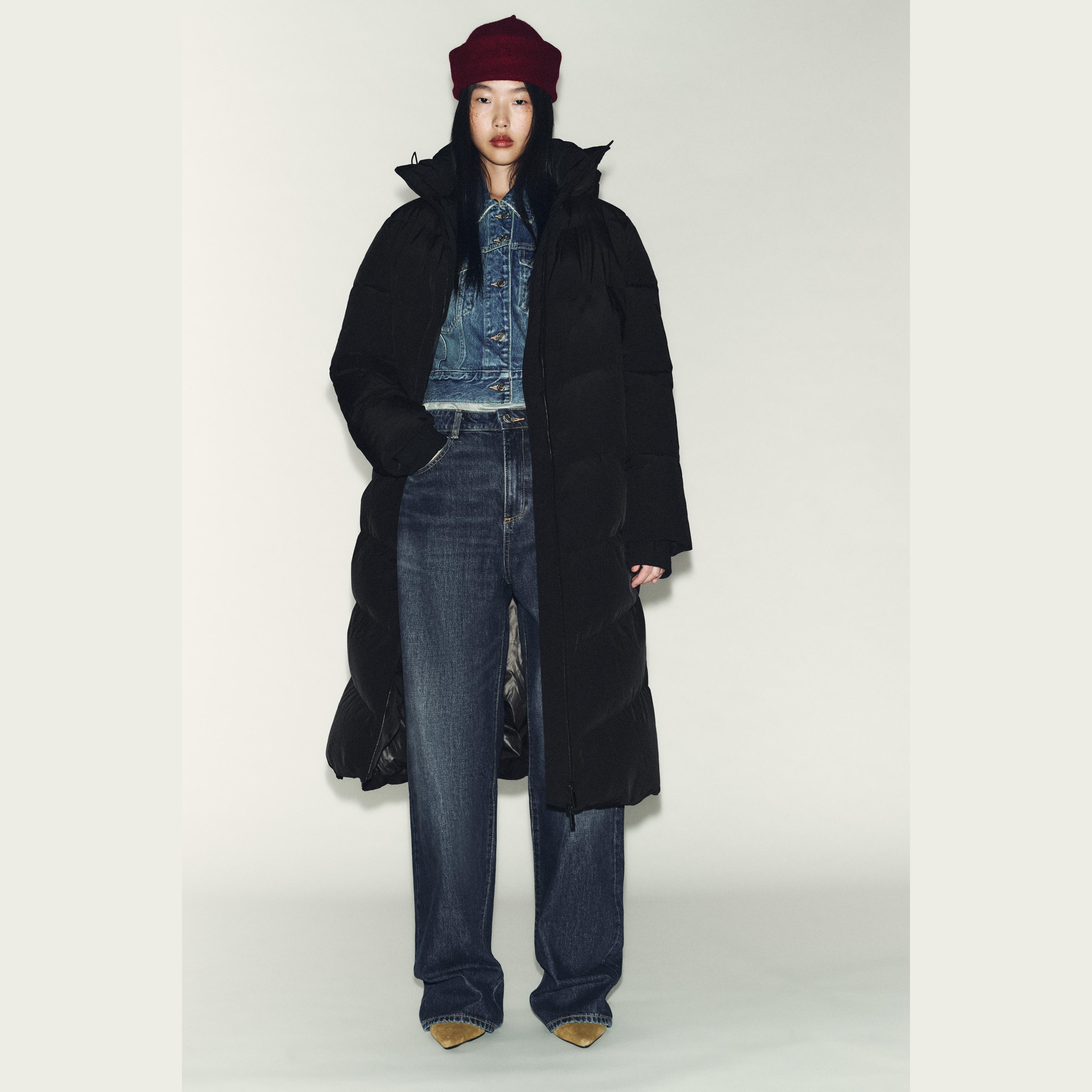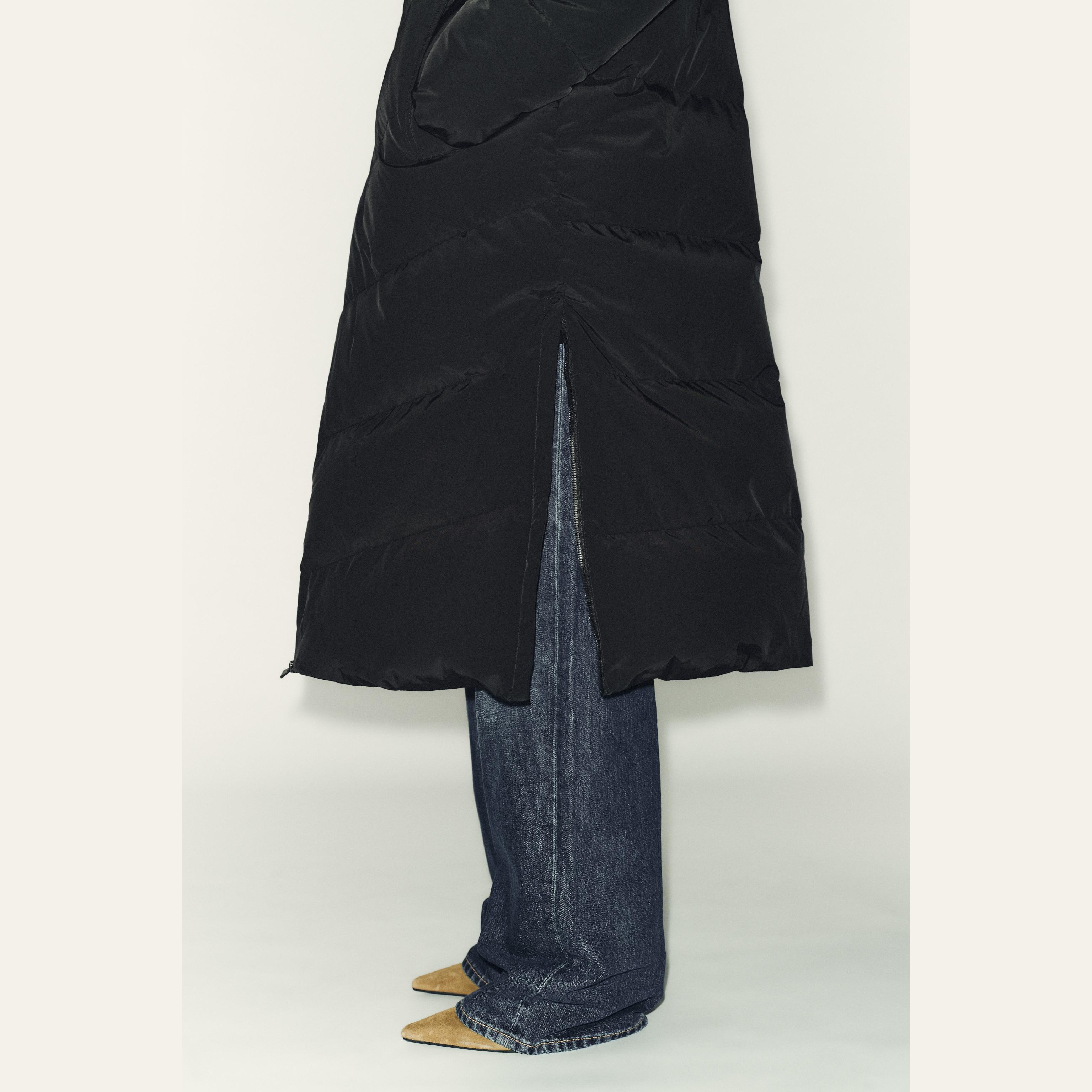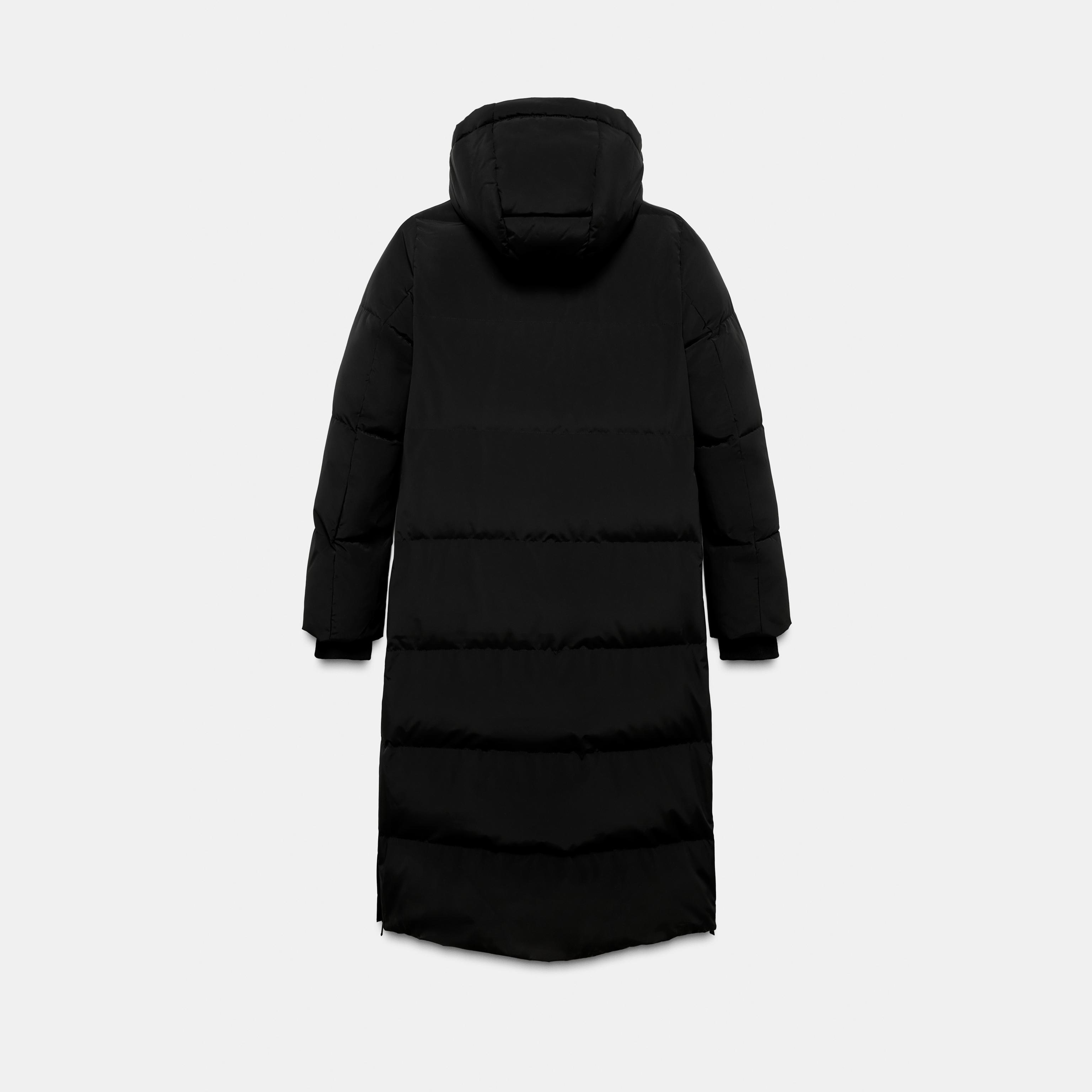 جاكيت مبطن طويل أنيق بلون أسود كلاسيكي، مصنوع من خامة بوليستر مقاومة للماء والرياح، مع حشوة من ريش البط الرمادي والريش الطبيعي تمنح دفئًا وراحة في الطقس البارد. يتميز بياقة عالية مع غطاء رأس عملي قابل للتعديل، وأكمام طويلة مع بطانة داخلية عند المعصم، مع جيوب أمامية مبطنة بملمس فليسي، وحاشية مستقيمة مع سحابات جانبية، وإغلاق أمامي بسحاب معدني. تصميم مثالي للإطلالات اليومية والأنشطة الخارجية في المواسم الباردة.