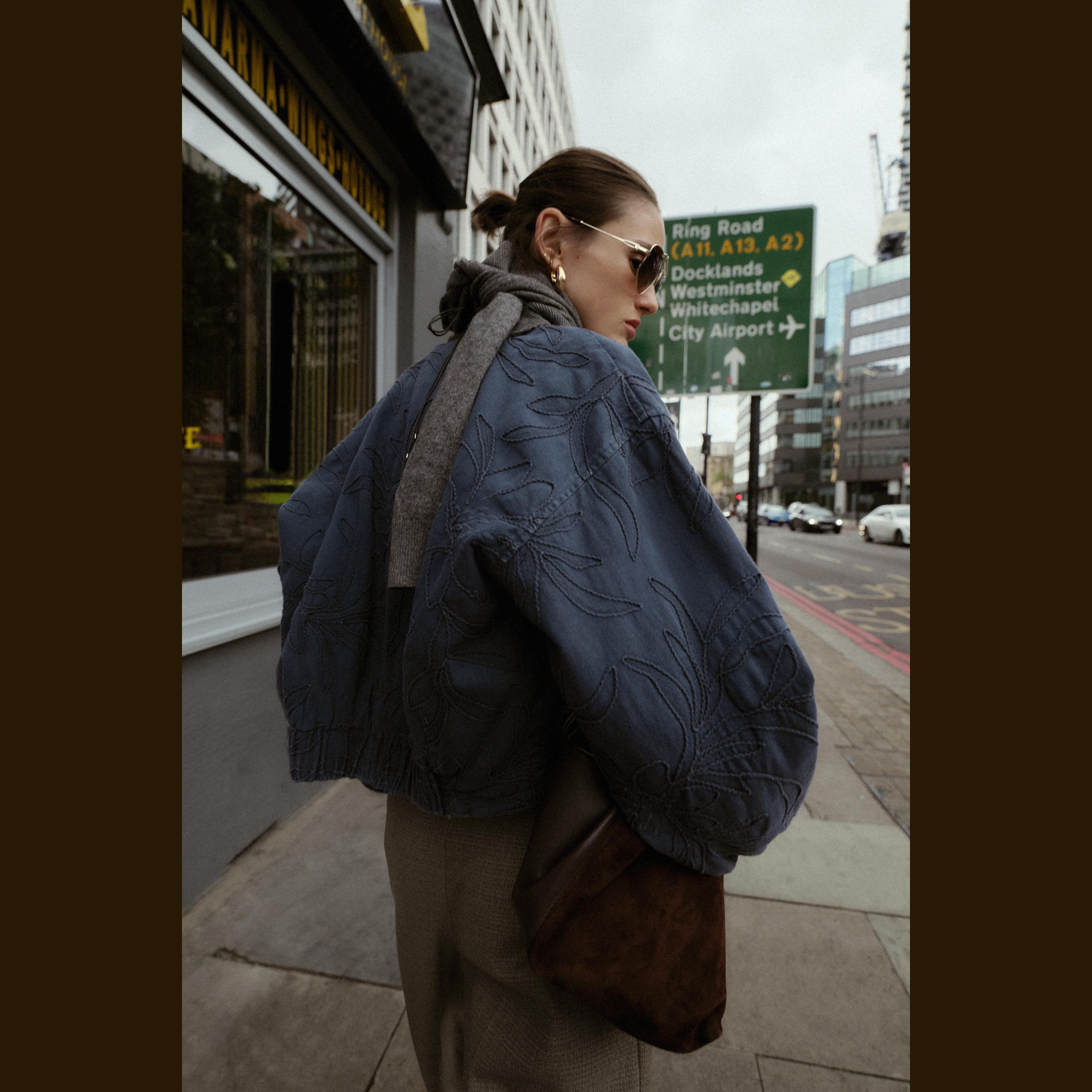 - التصميم: جاكيت بومبر مطرز من الجلد الصناعي (Embroidered Faux Suede Bomber Jacket)