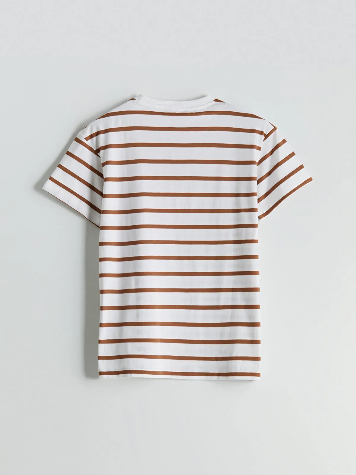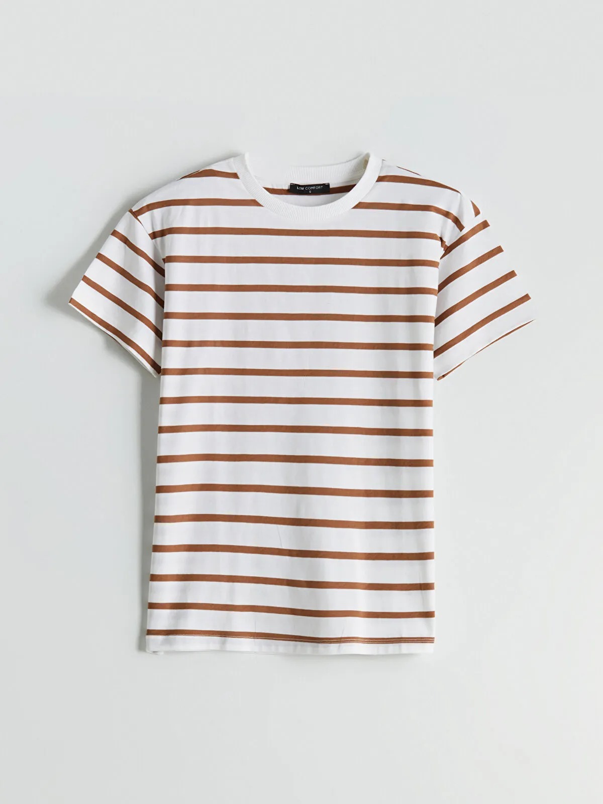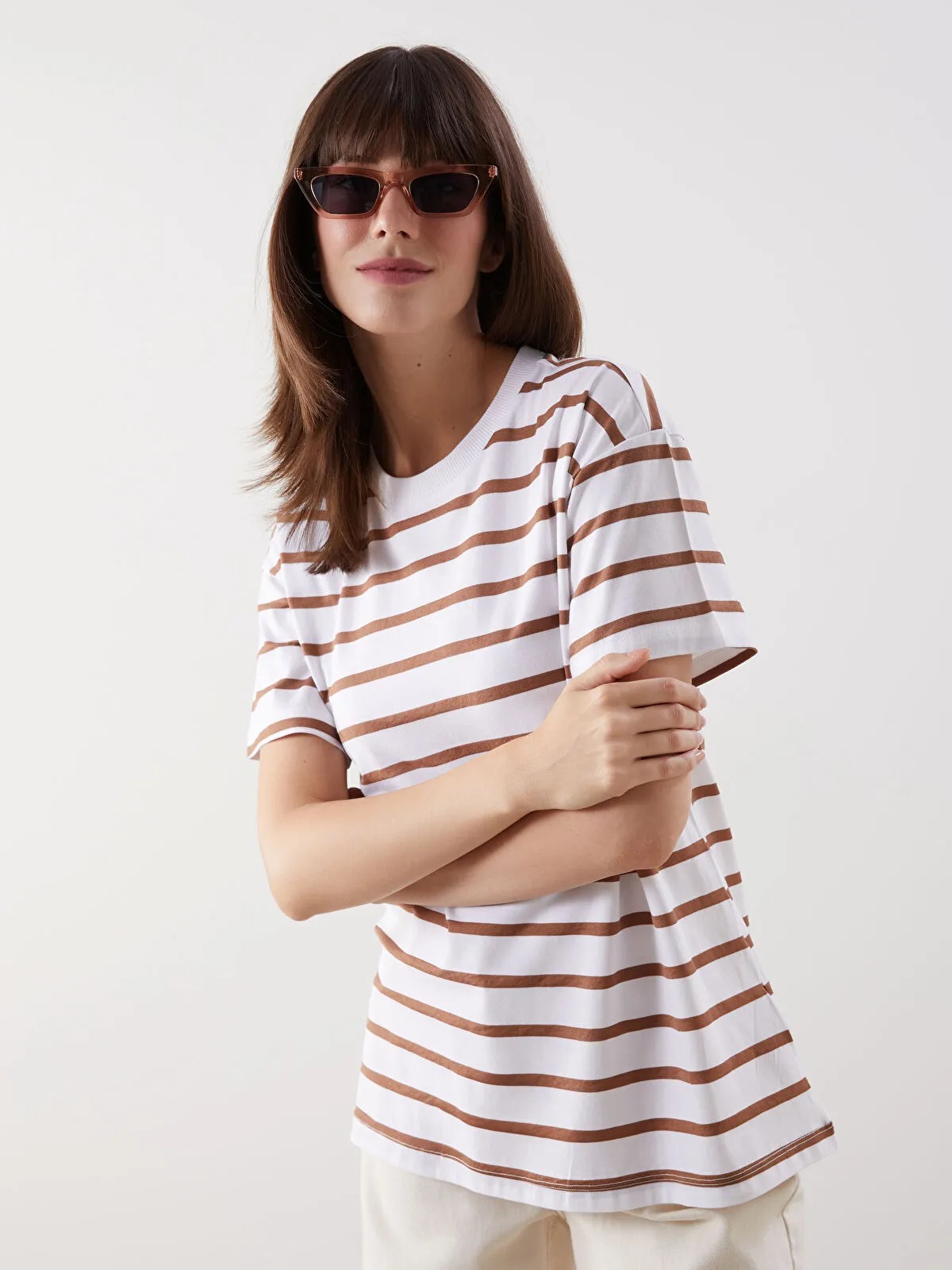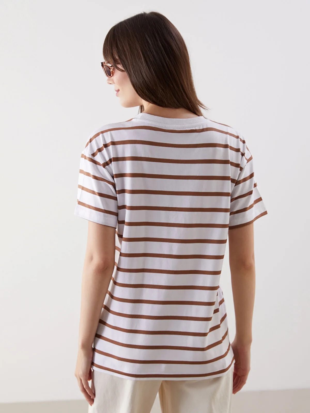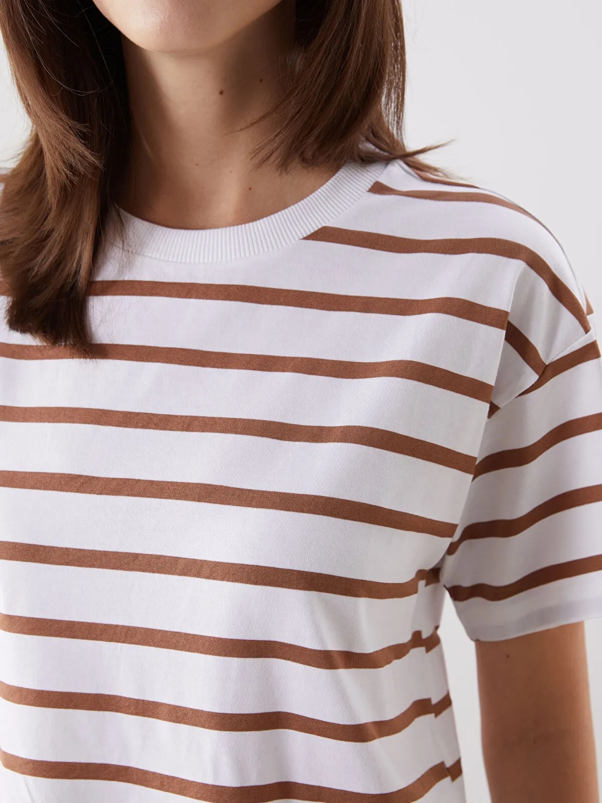تيشيرت نسائي بياقة دائرية قصيرة وأكمام قصيرة، يتميز بنقش خطوط كلاسيكي يمنح مظهرًا أنيقًا وهادئًا مناسبًا للإطلالة الكاجوال. تصميم Loose & Bol يمنح حرية حركة وراحة طوال اليوم، مثالي للارتداء اليومي المريح والعصري.