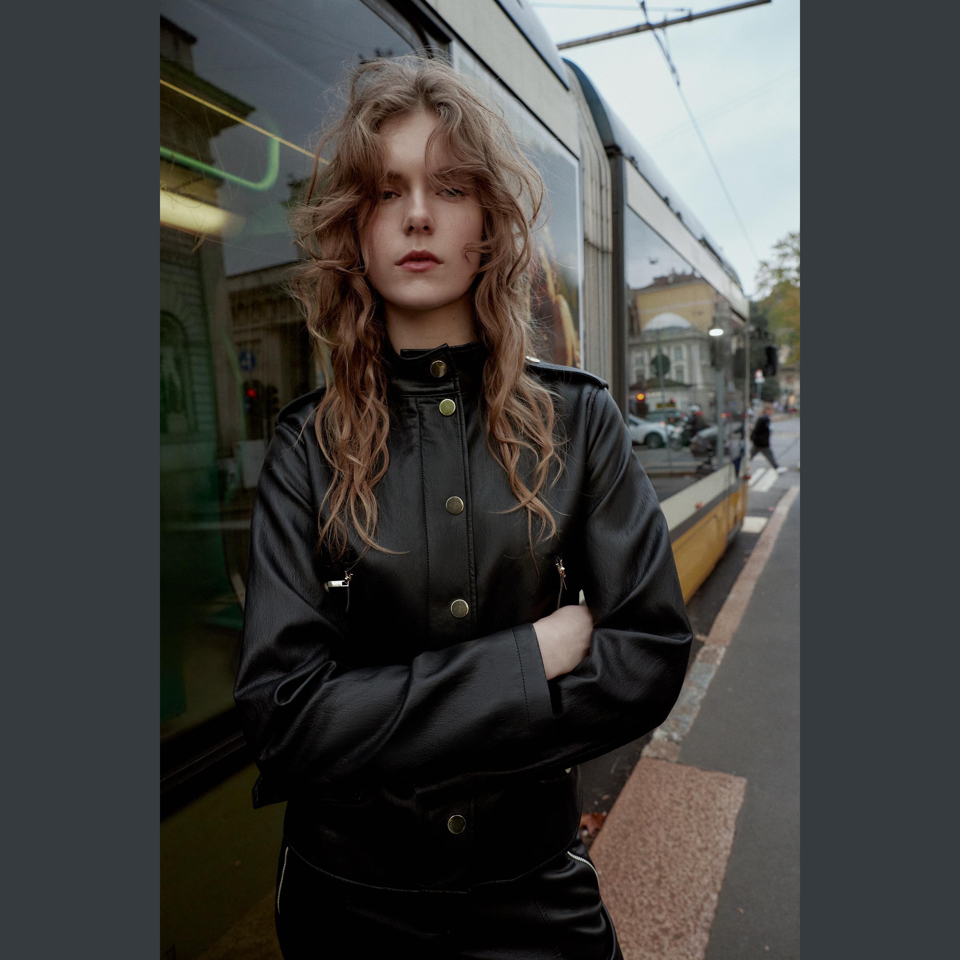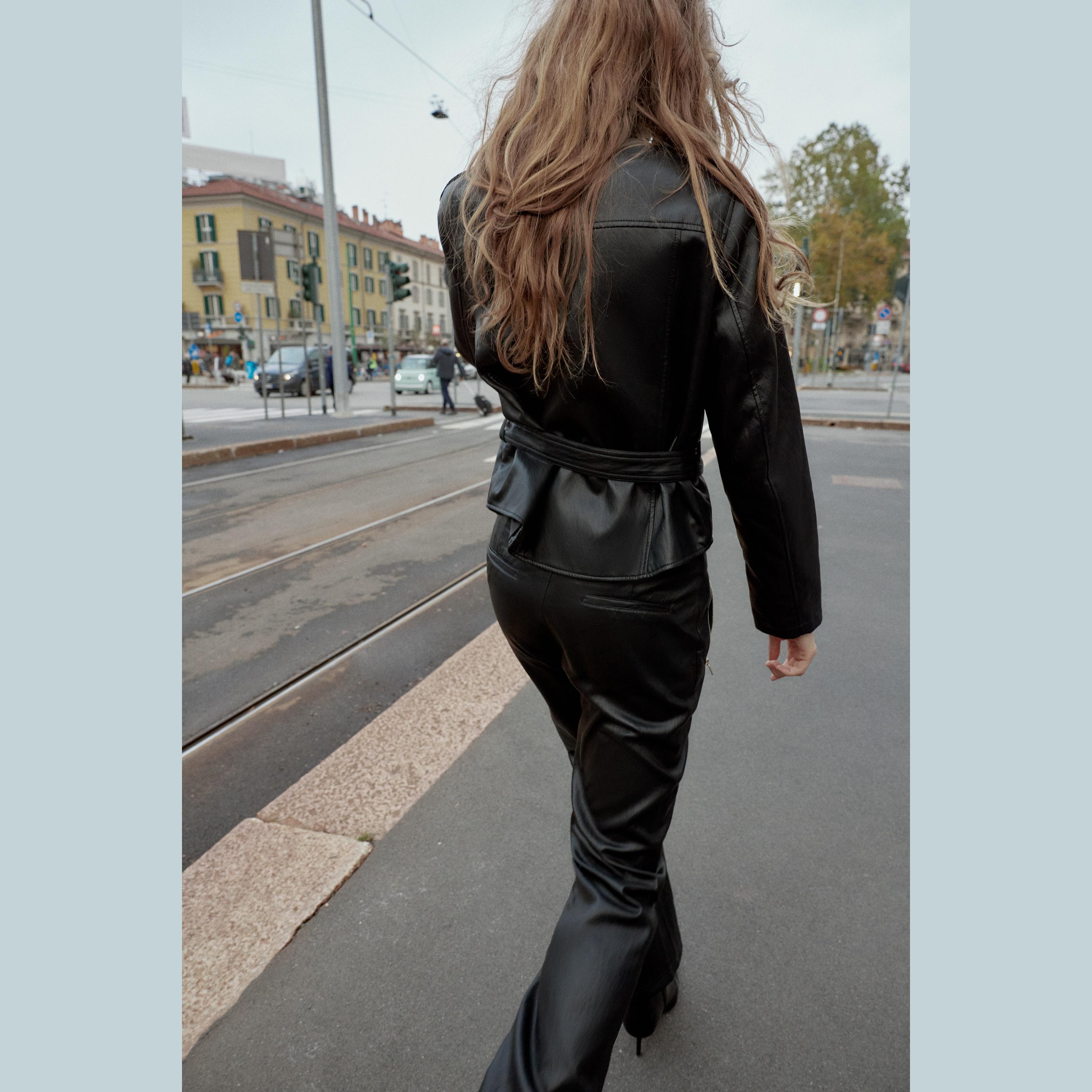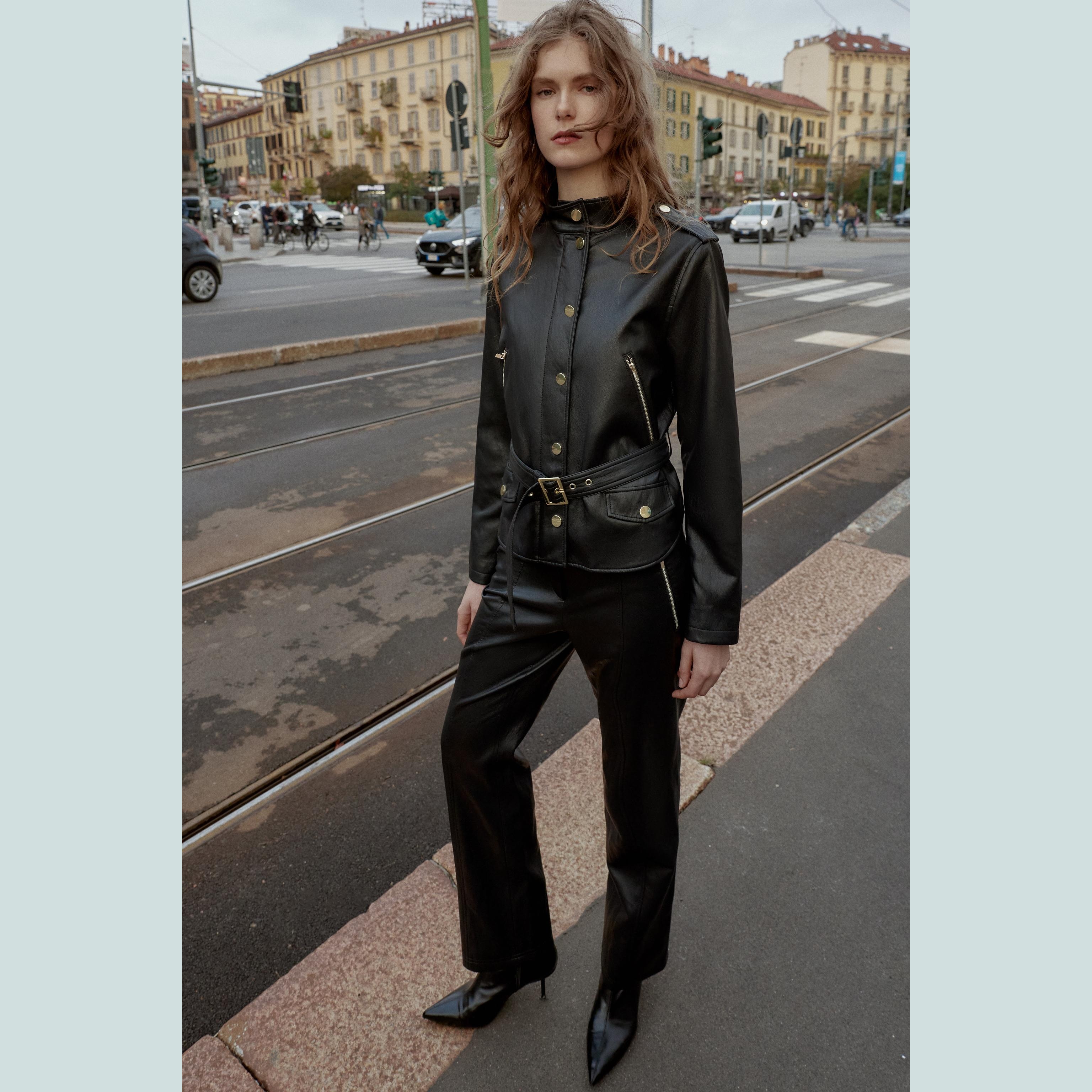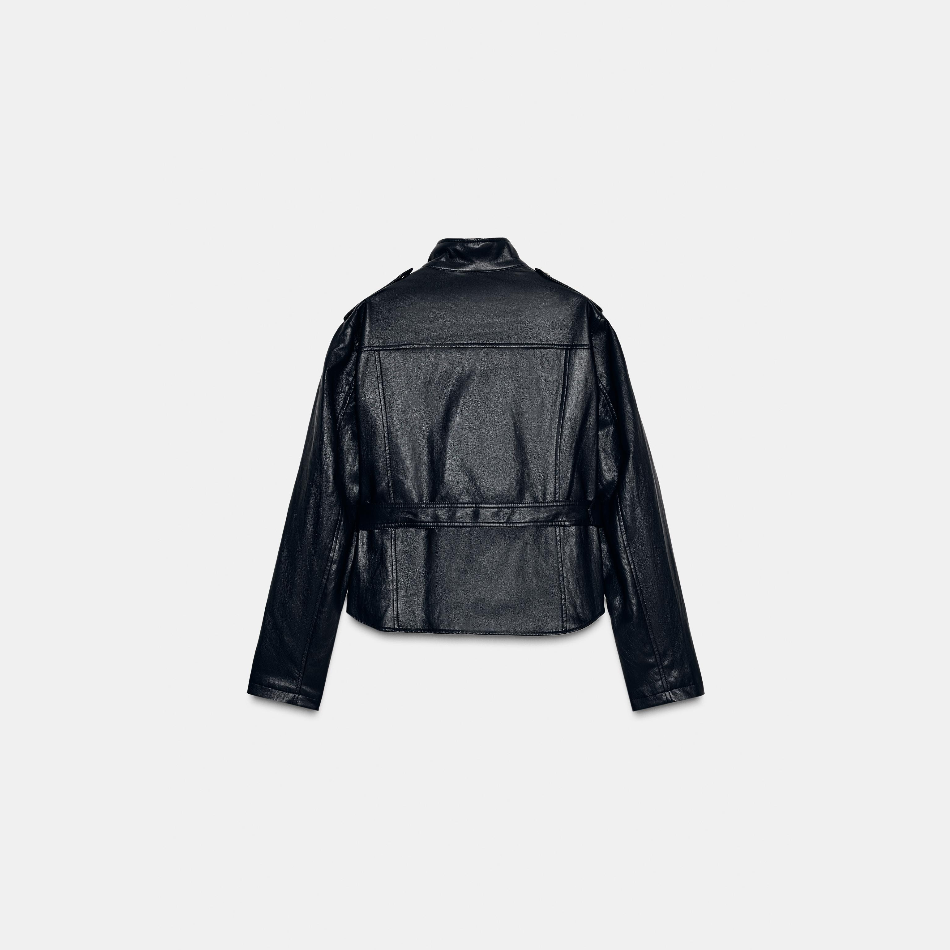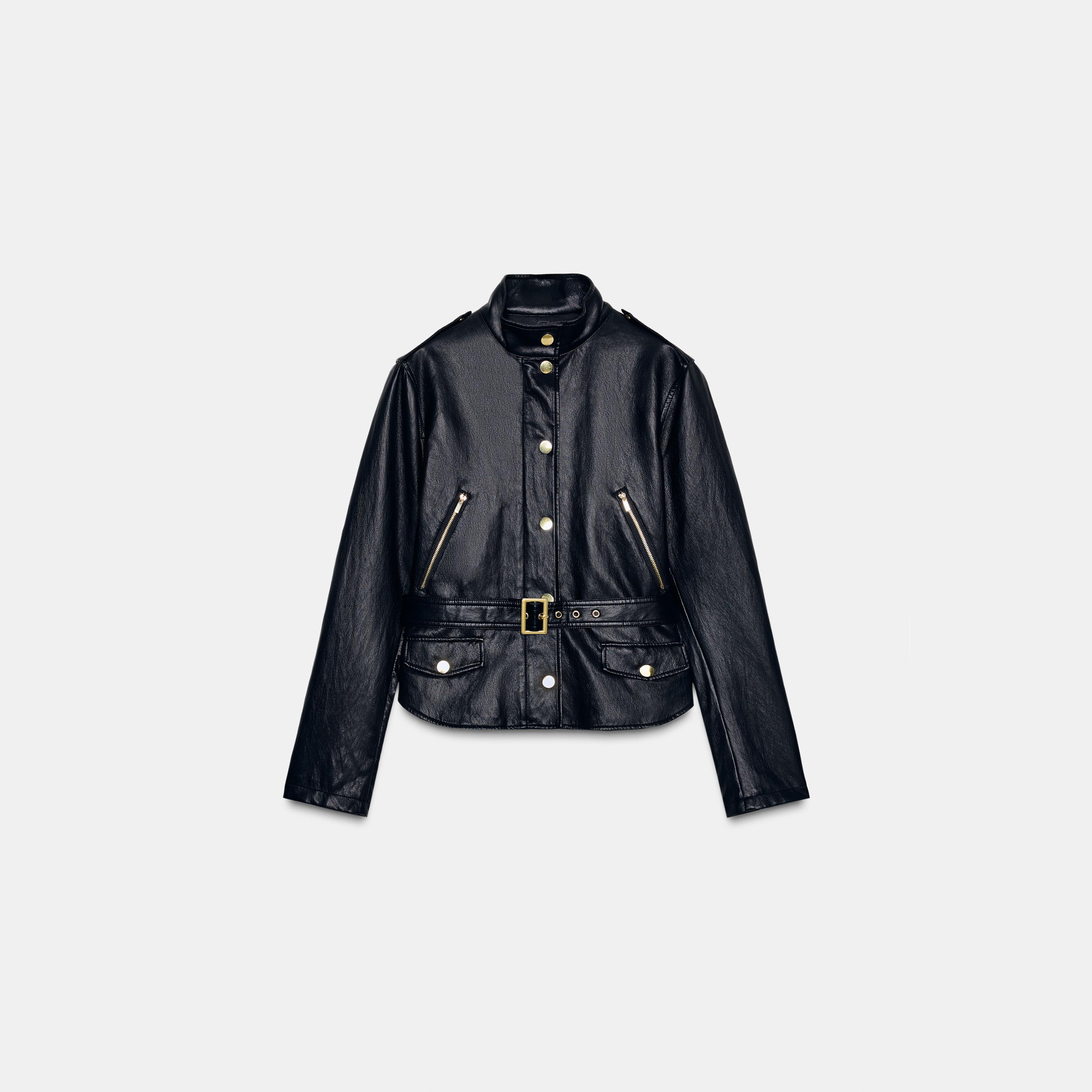 - التصميم: جاكيت جلد صناعي مع حزام (Faux Leather Jacket with Belt)
