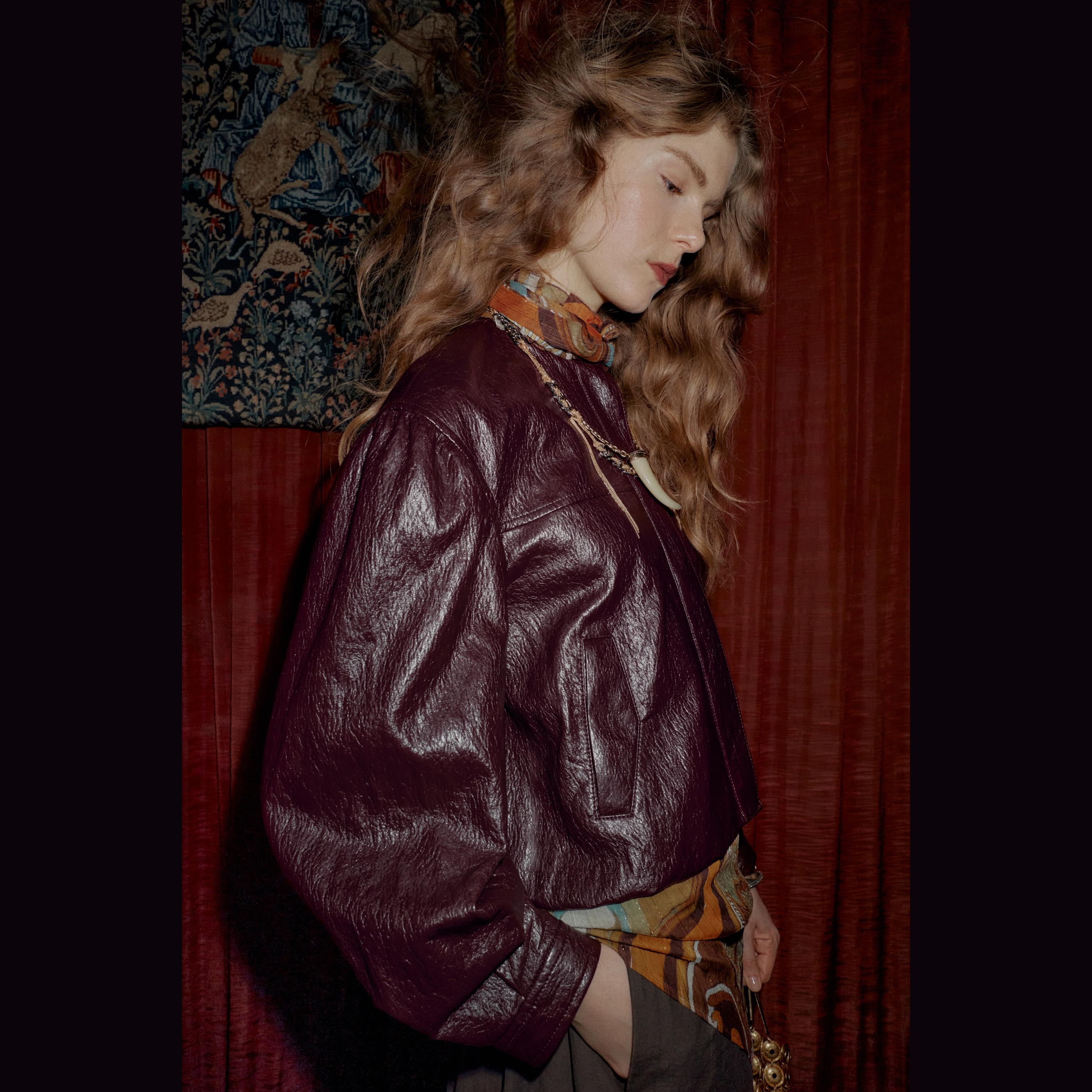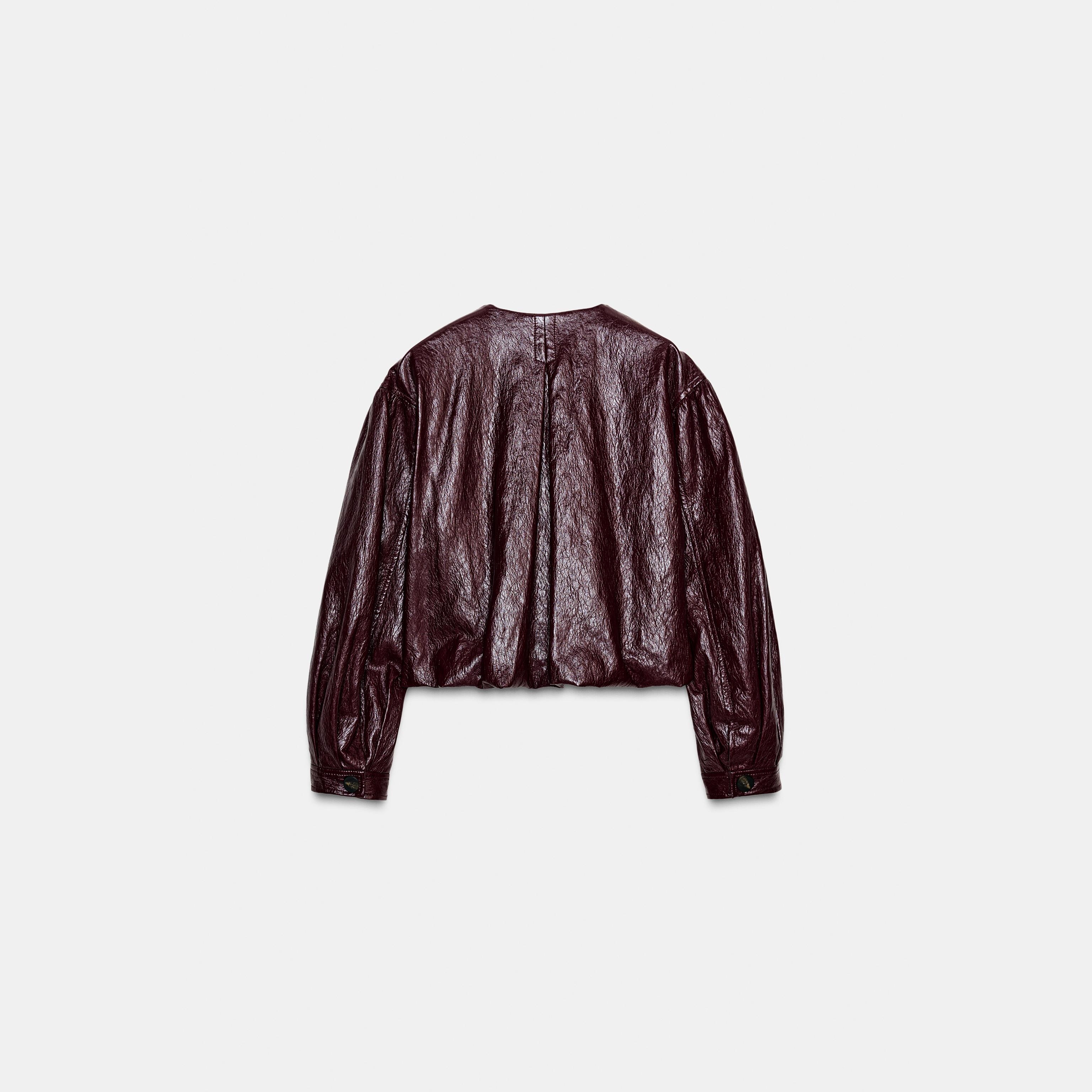 جاكيت بومبر منتفخ من الجلد الصناعي – لون طبيعي (برغندي) – Burgundy (Faux Leather Puffy Bomber Jacket)