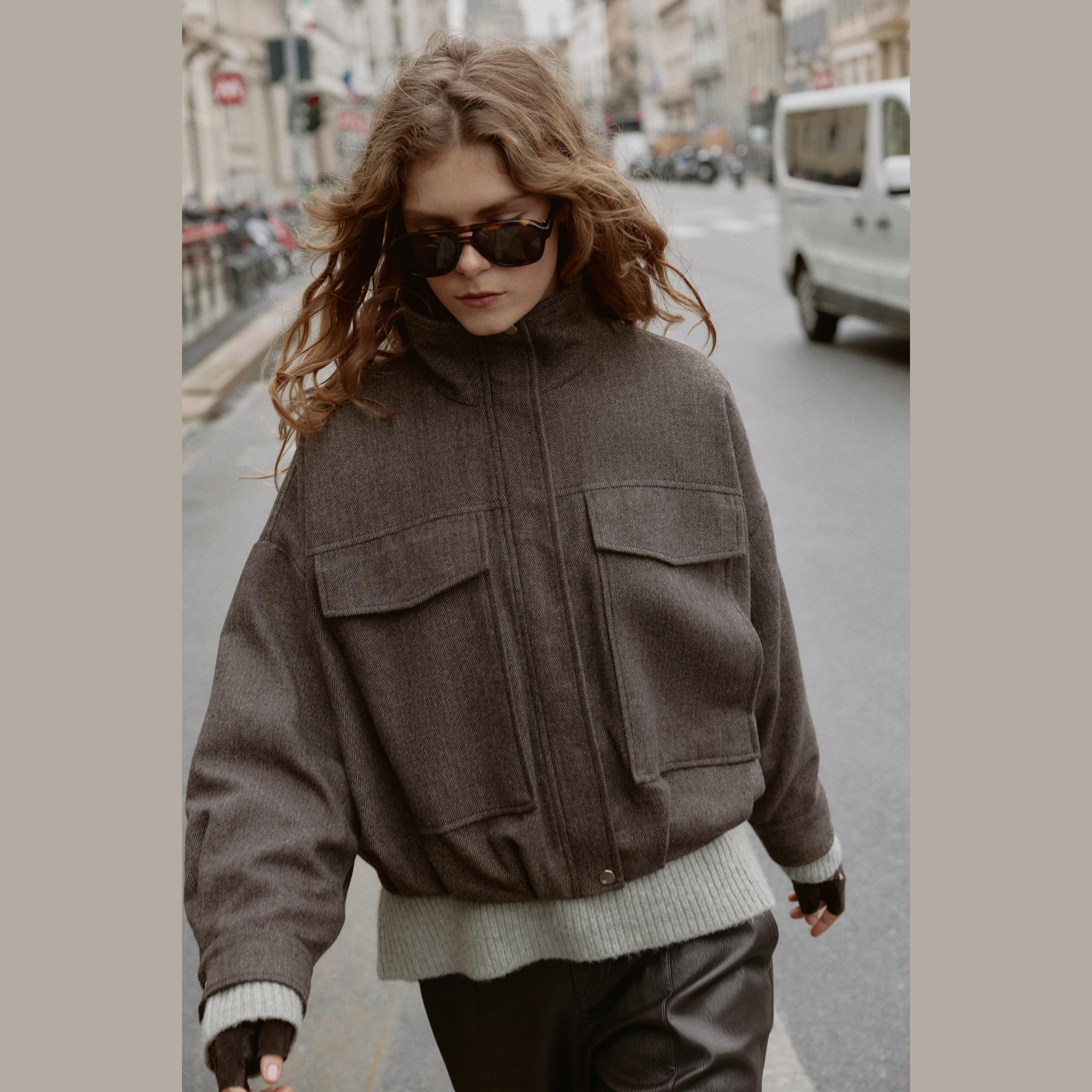 جاكيت بومبر أنيق بلون بني طبيعي مع نقشة هيرينغبون كلاسيكية، مصنوع من خامة بوليستر عالية الجودة، مع بطانة داخلية تمنح راحة في الارتداء. يتميز بياقة عالية وأكمام طويلة، مع جيوب أمامية كبيرة، وحاشية سفلية منتفخة مع طيات، وإغلاق أمامي بسحاب معدني مخفي تحت شريط كبس. تصميم عصري يجمع بين الطابع الكلاسيكي للبومبر واللمسة الحديثة بالقصّة المنتفخة، مثالي للإطلالات اليومية والموسمية.